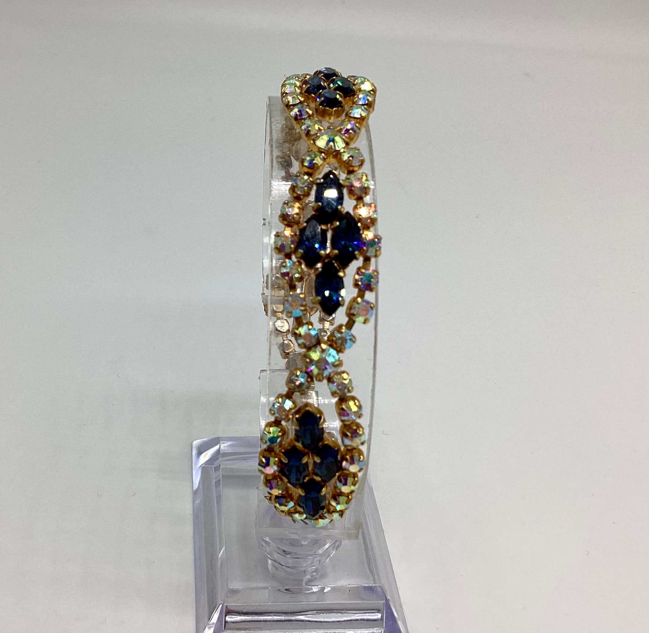 Add some glamour to your jewellery collection with this 1950s bracelet featuring sapphire blue and aurora crystals. The 7-inch beaded tennis-style bracelet showcases a slide and click closure, making it perfect for any occasion including Christmas, anniversary and birthday celebrations. The vintage original piece also includes secondary sapphire crystals adding to its unique style. Made of high-quality crystal material, this bracelet is a must-have for any woman who loves costume jewellery. The piece reflects the glamour of the 1950s and 1960s era and is perfect for those who love all things vintage. Don't miss out on the chance to own this one-of-a-kind beaded bracelet.