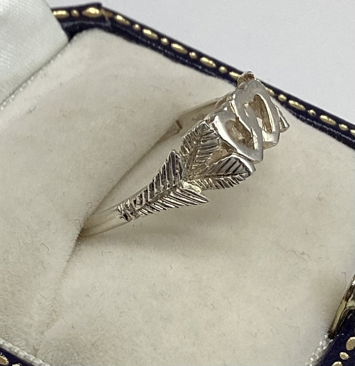 This beautiful Hallmarked Silver Linked Hearts Ring is the perfect gift for your loved one on Valentine's Day, Birthday or Anniversary. Crafted in 1979, this vintage ring showcases an exquisite design with a heart-shaped pattern that symbolizes your eternal love. The ring comes in a size P and is made of 925 sterling silver, which adds a touch of elegance to any outfit. This silver band has a timeless style that makes it suitable for all occasions. The hearts are held by embellished shoulder of pretty and delicate ferns. It is fully hallmarked and signed PDL for the maker. The ring is perfect for collectors of fine jewellery and is sure to become a treasured possession.