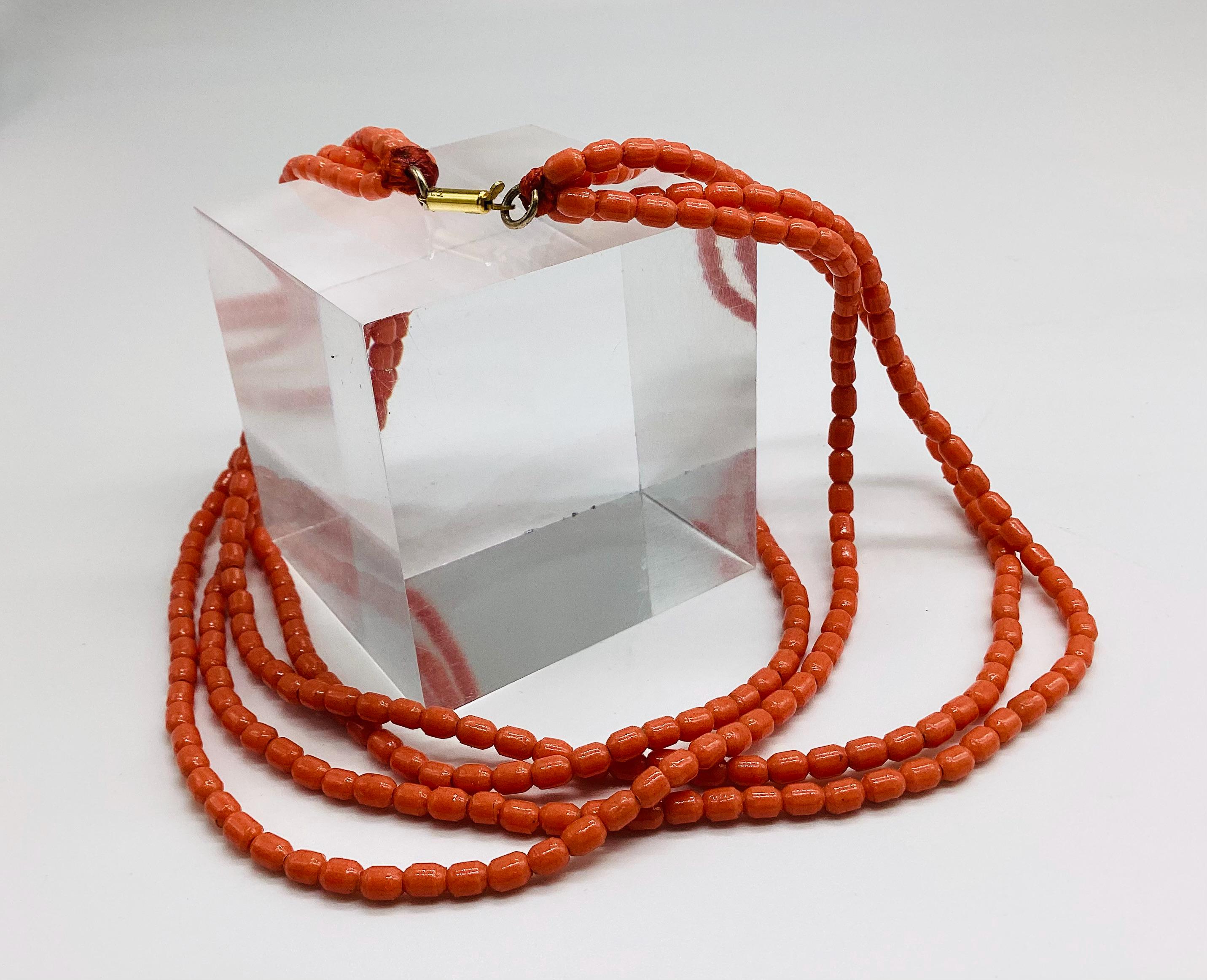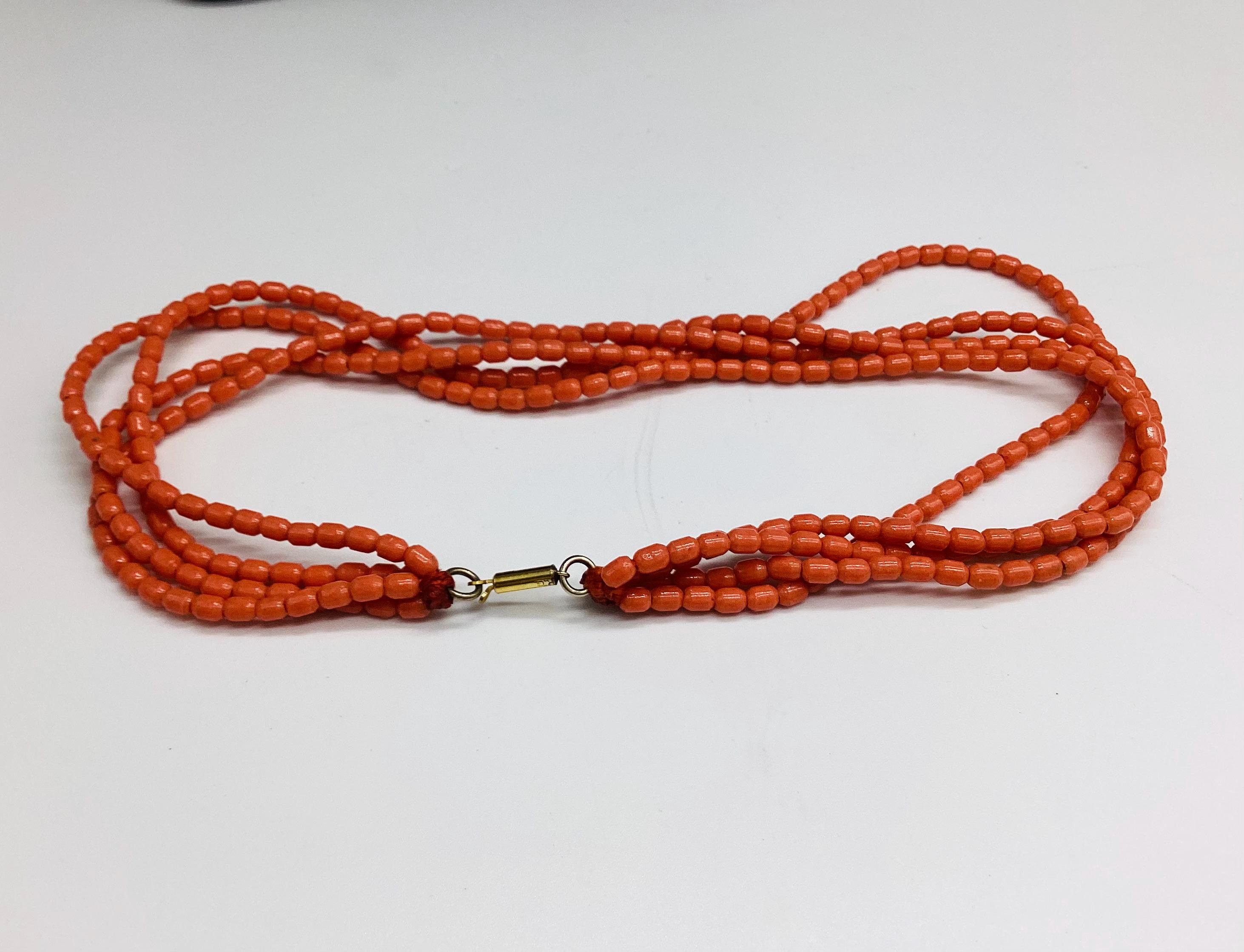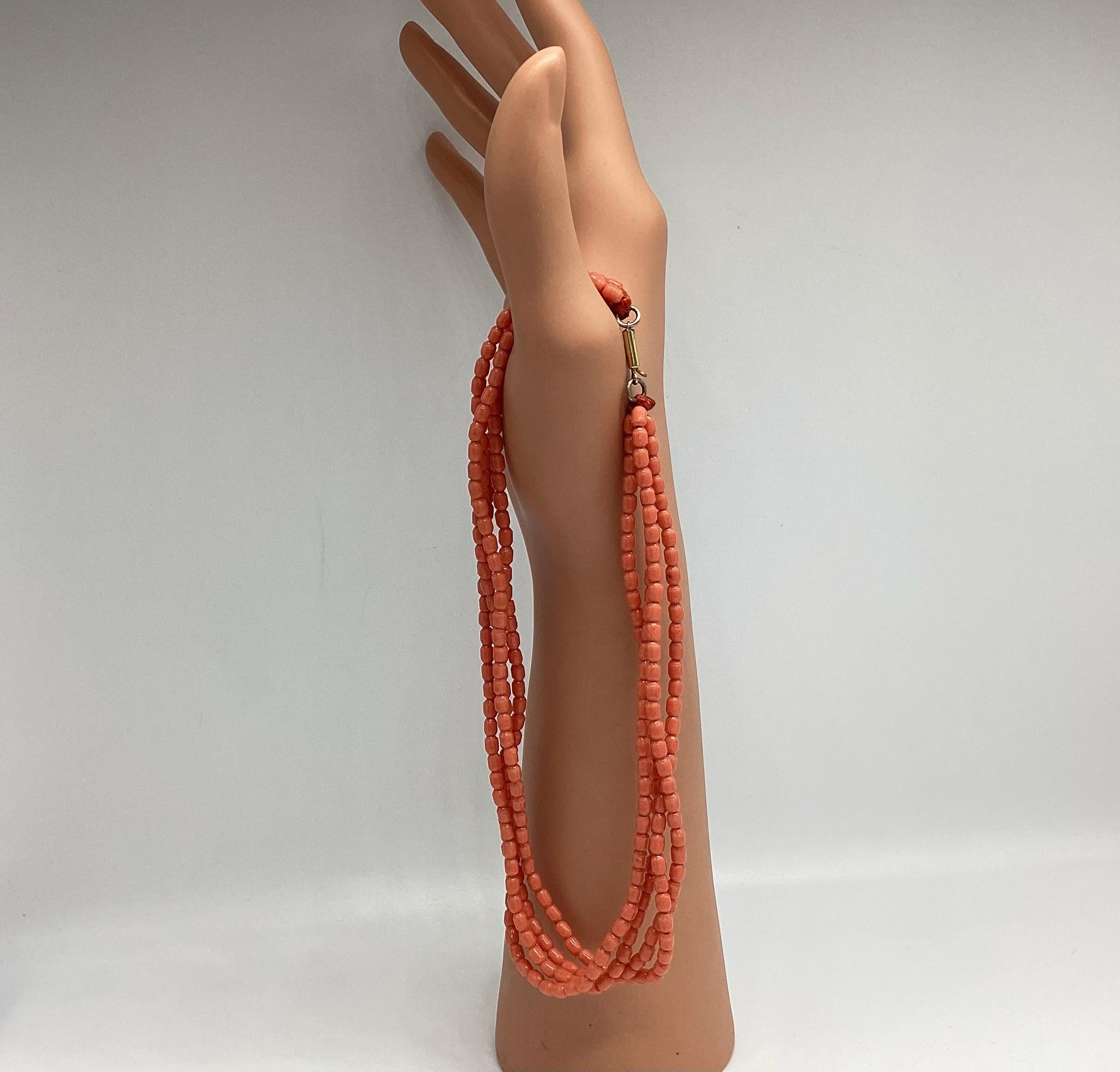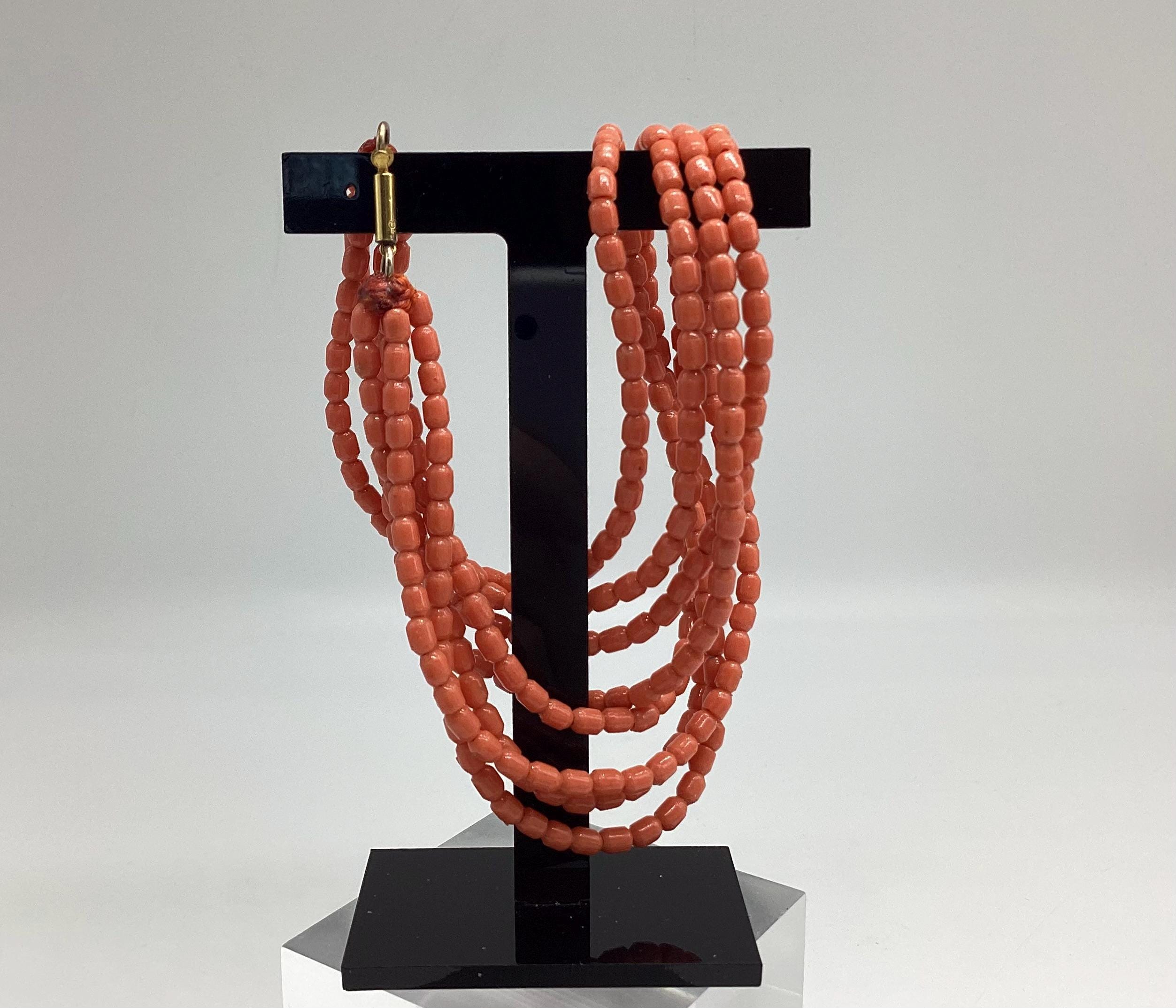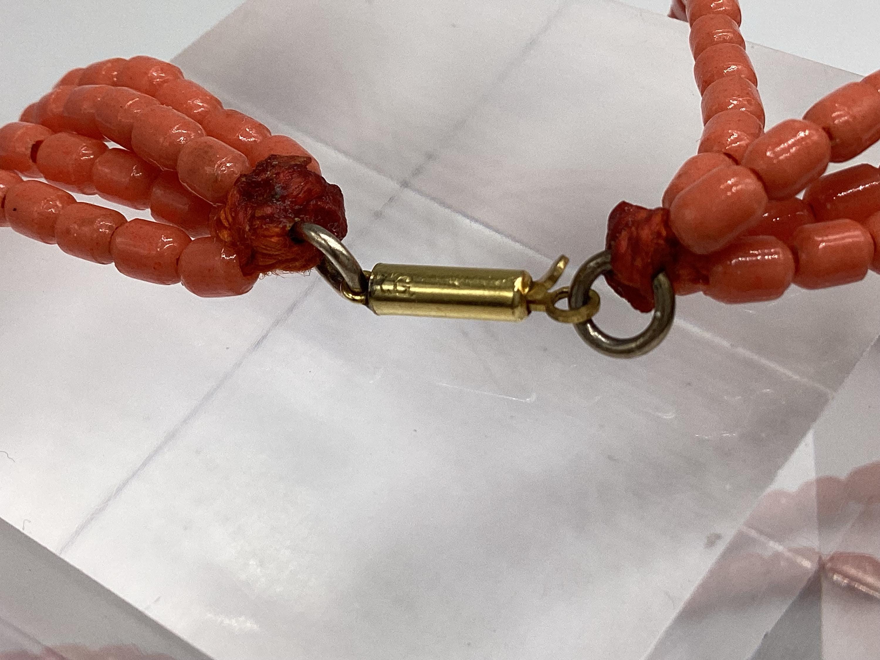 A stunning and rare piece of Victorian jewellery. True salmon pink coral beads with a classic Victorian clasp in rolled gold, stamped RG.