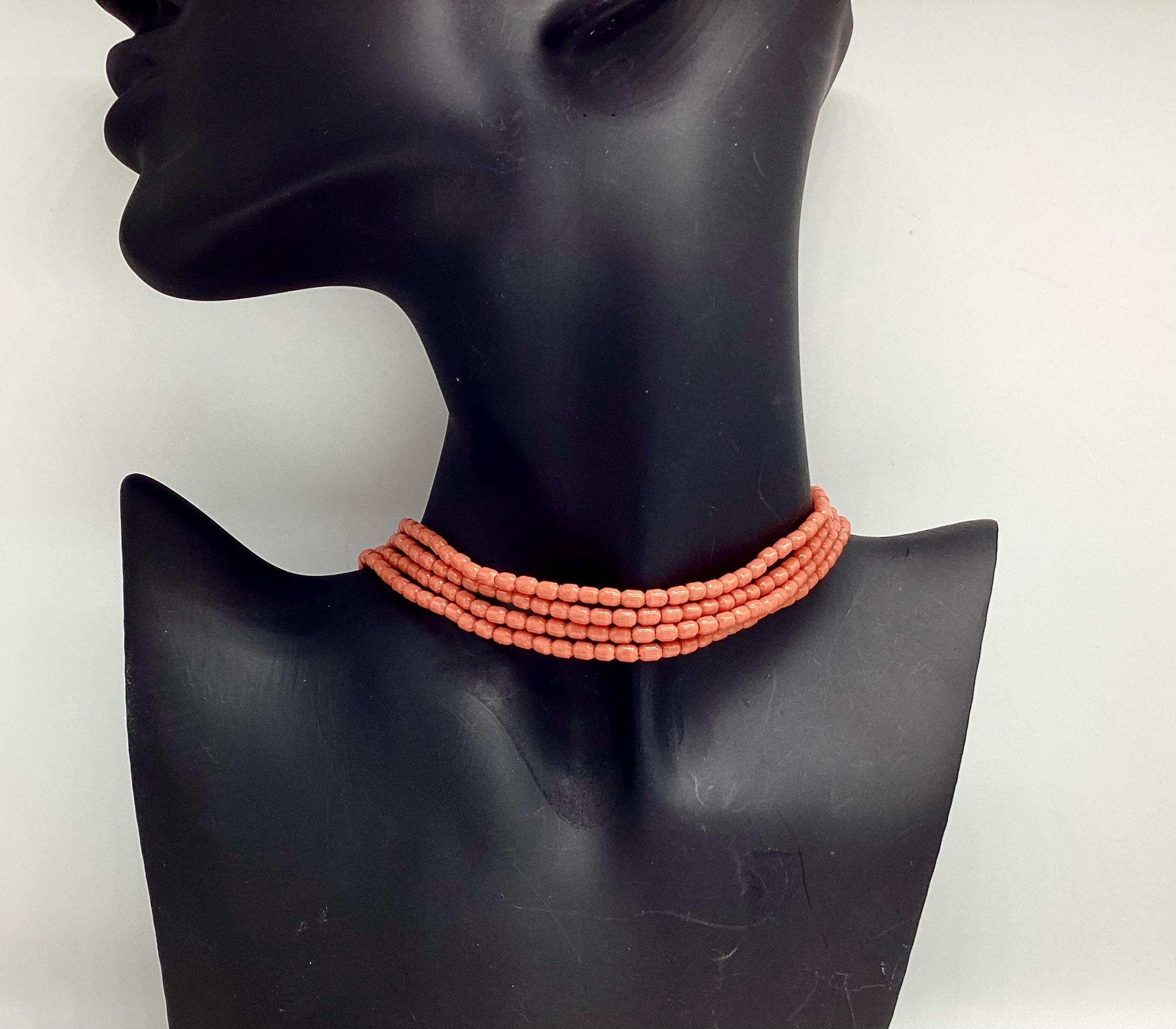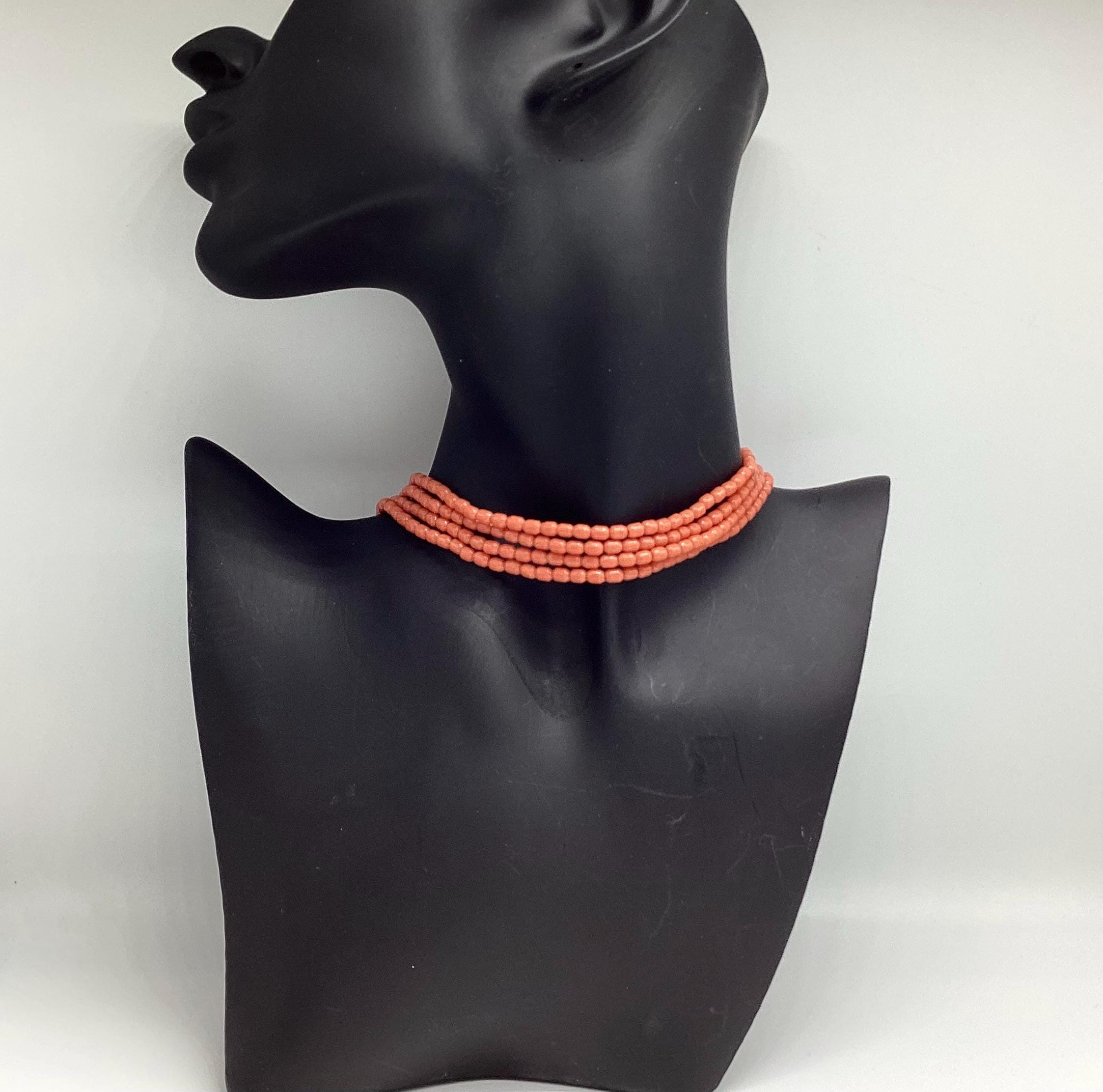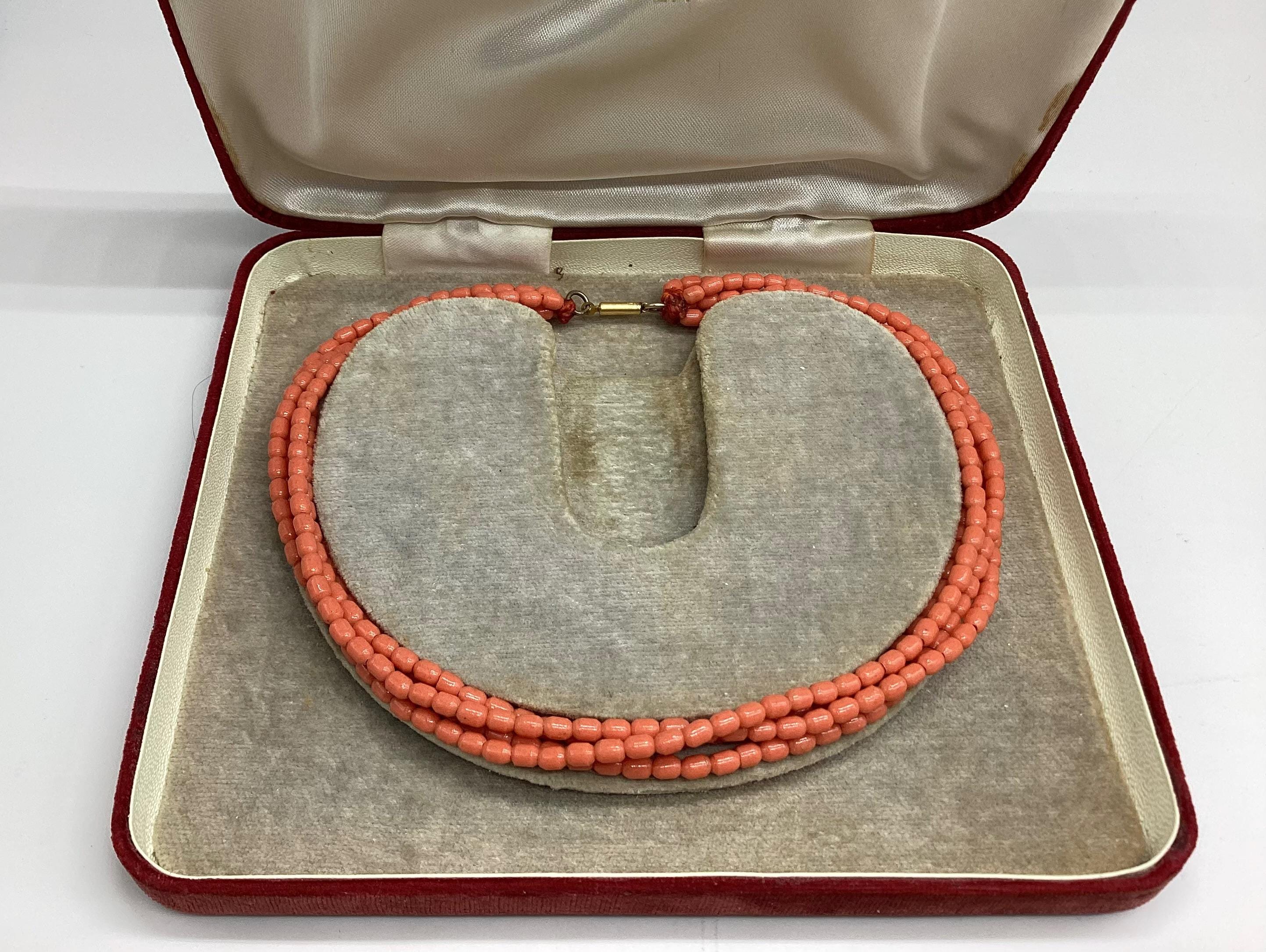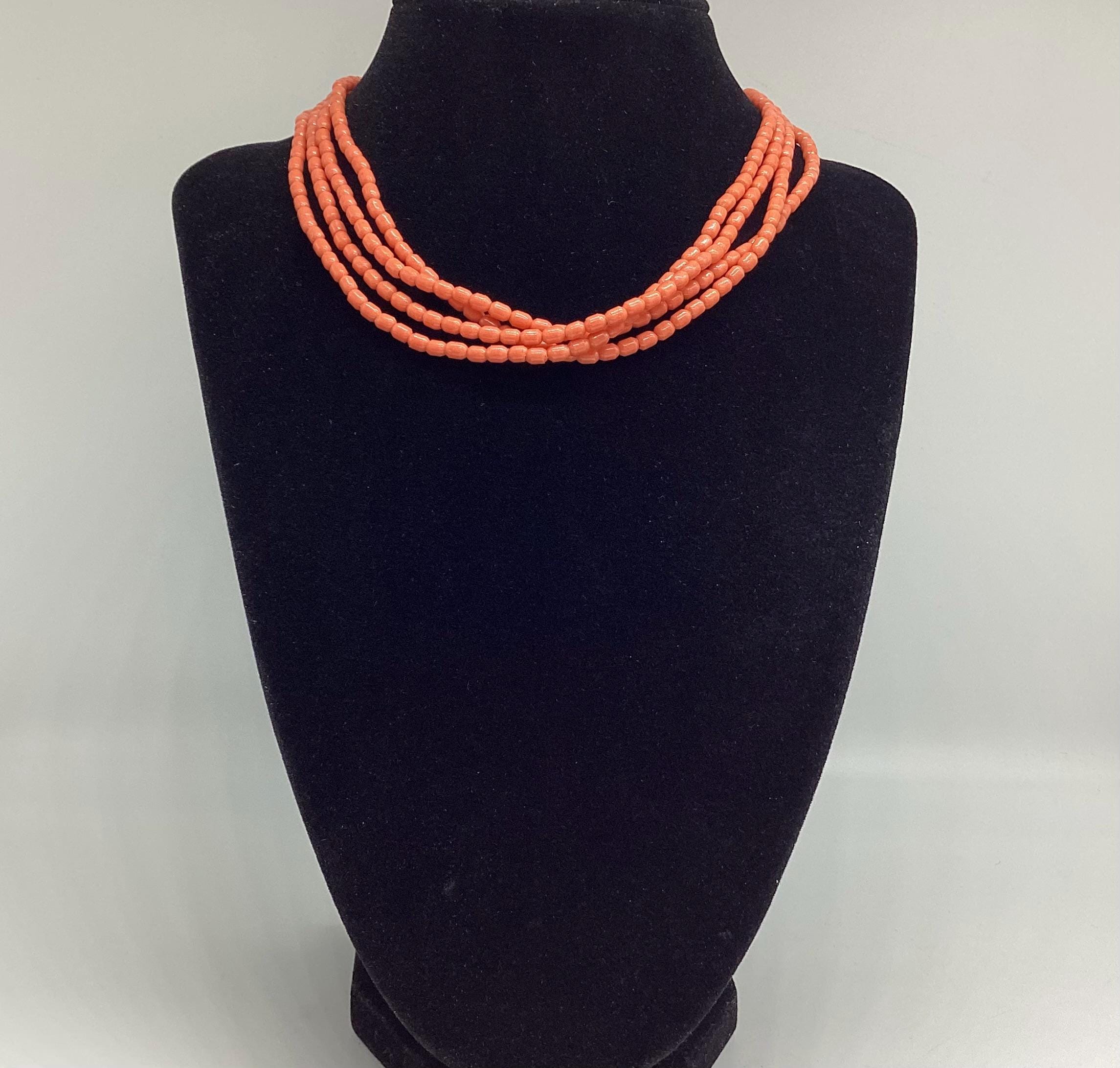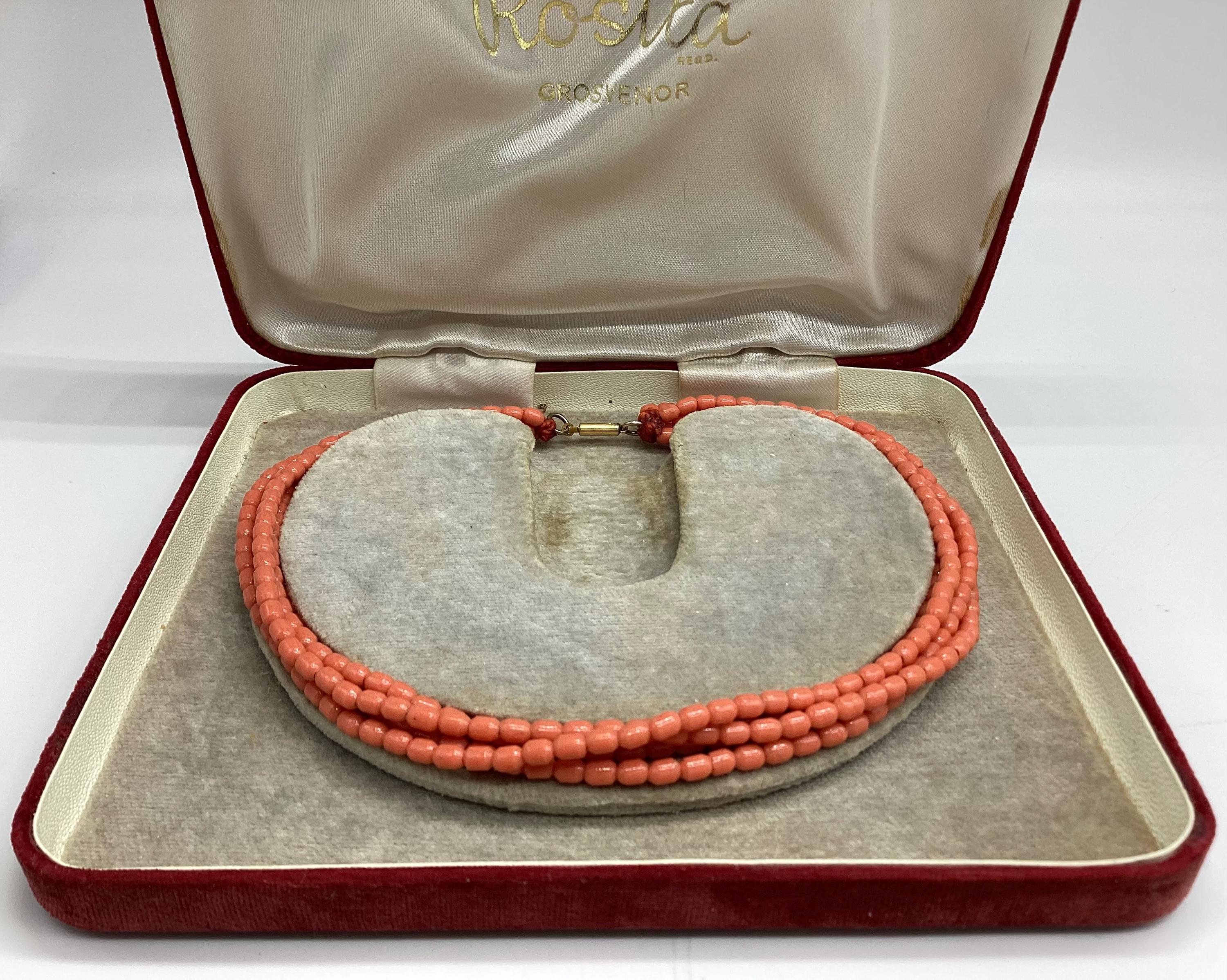 A stunning and rare piece of Victorian jewellery. True salmon pink coral beads with a classic Victorian clasp in rolled gold, stamped RG.