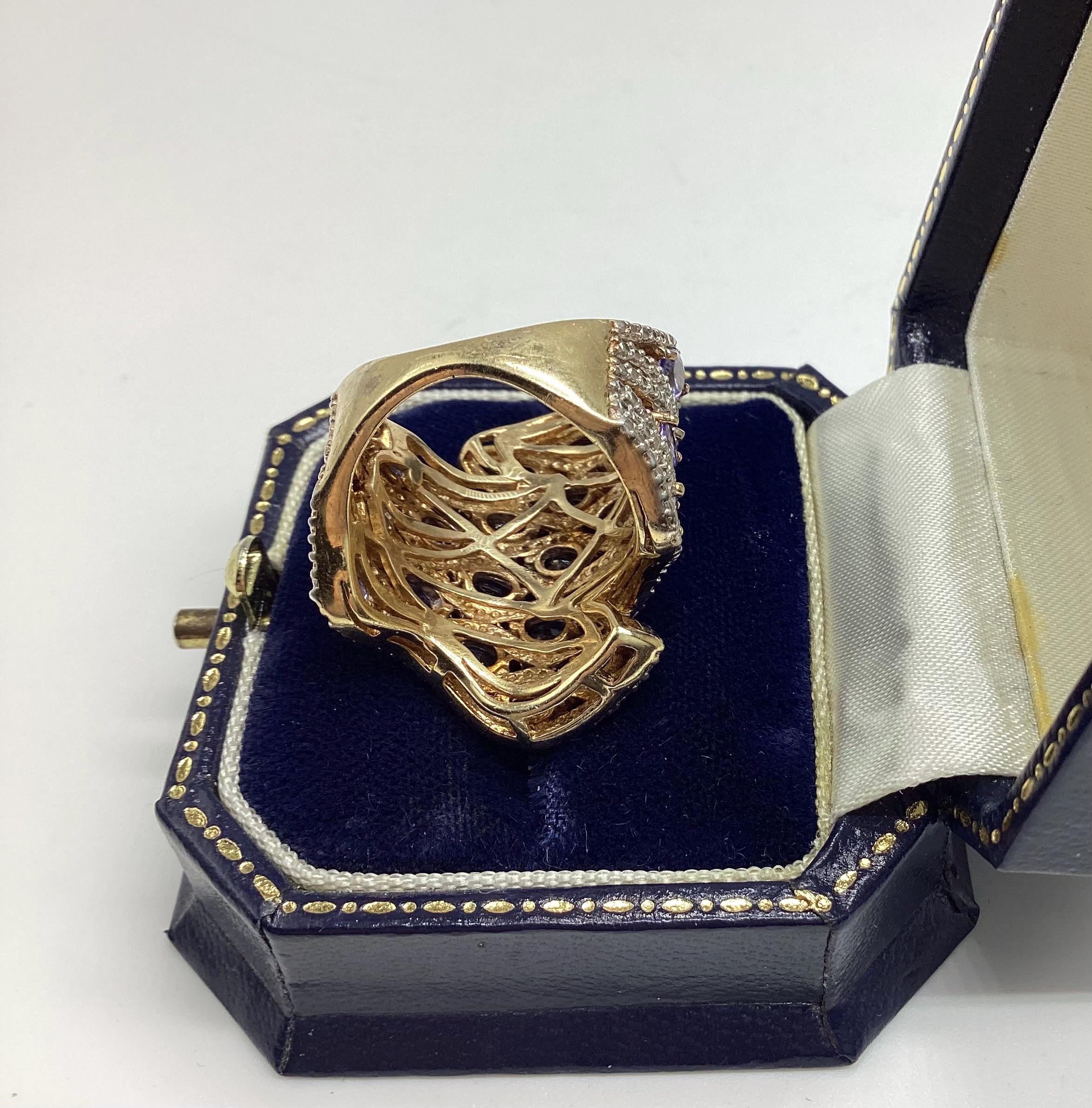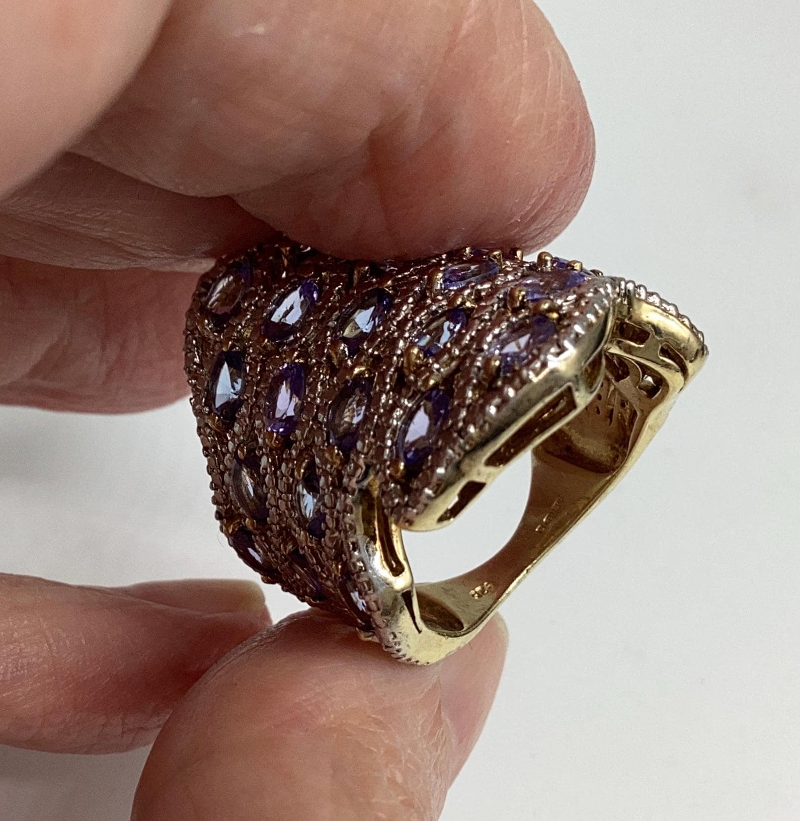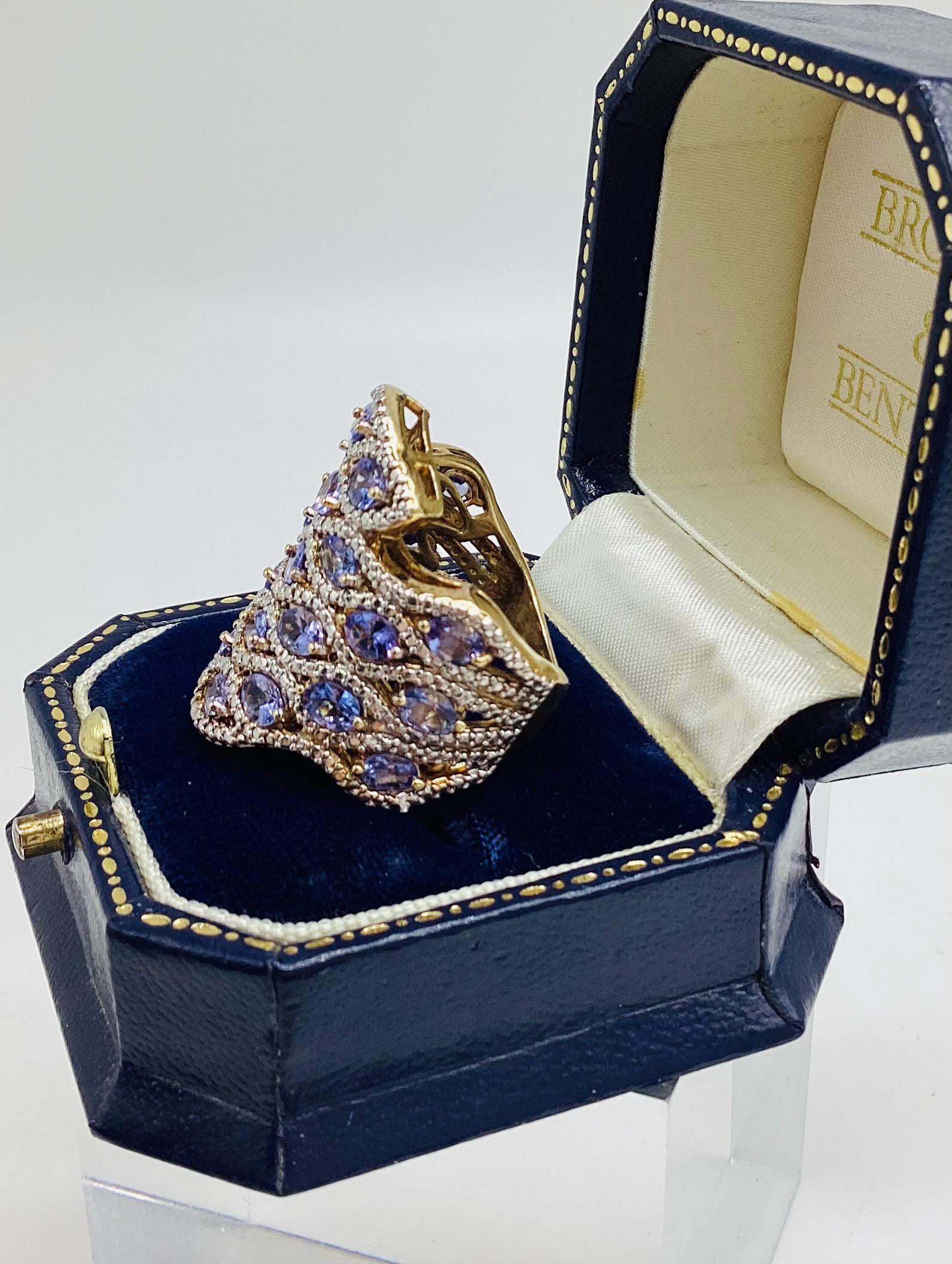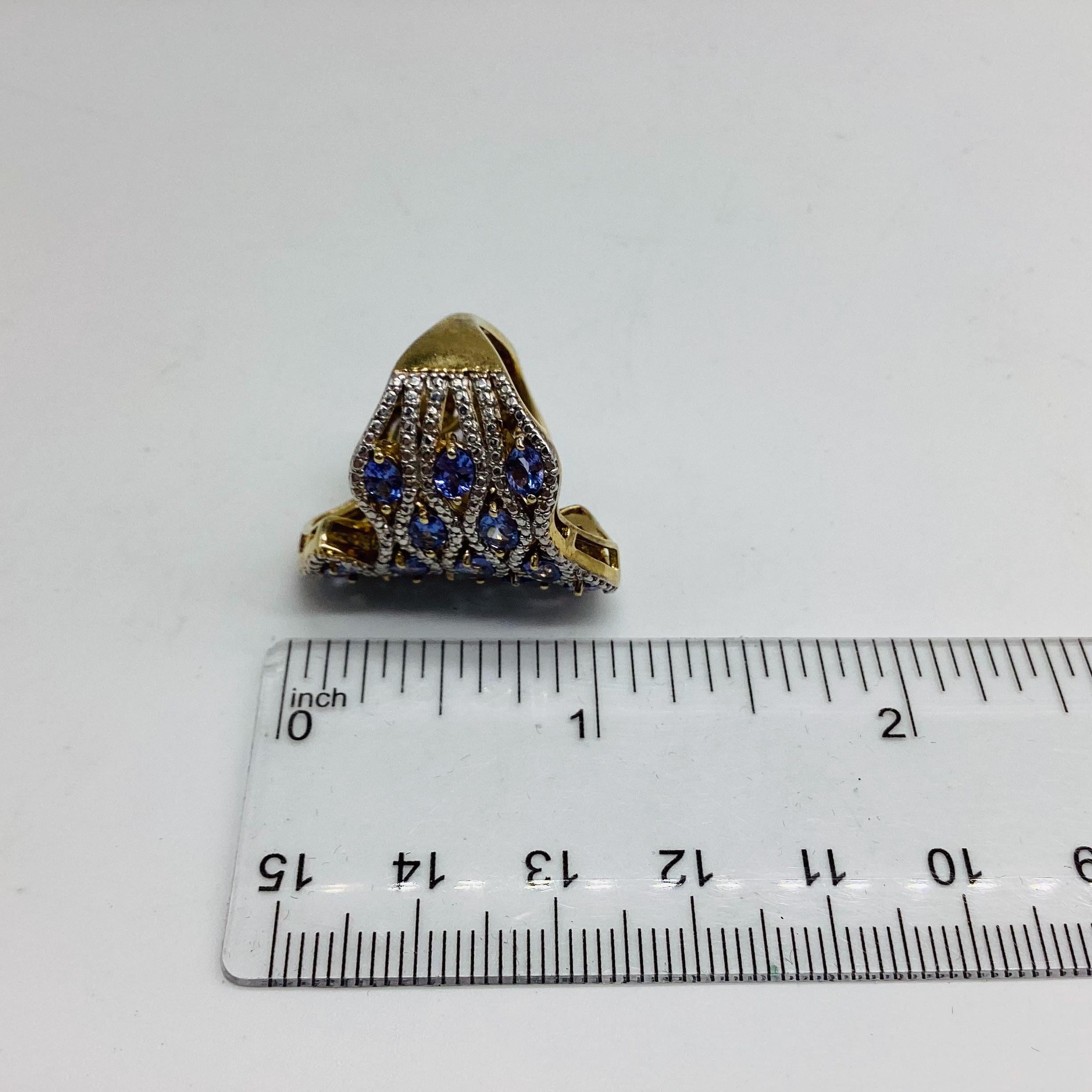A spectacular ring in vermeil and set with very pretty marquise cut blue topaz. Sits beautifully on the finger and is an extremely eye-catching piece of vintage jewellery dating from the 1990's. In very good condition. Widest front of ring measures a full