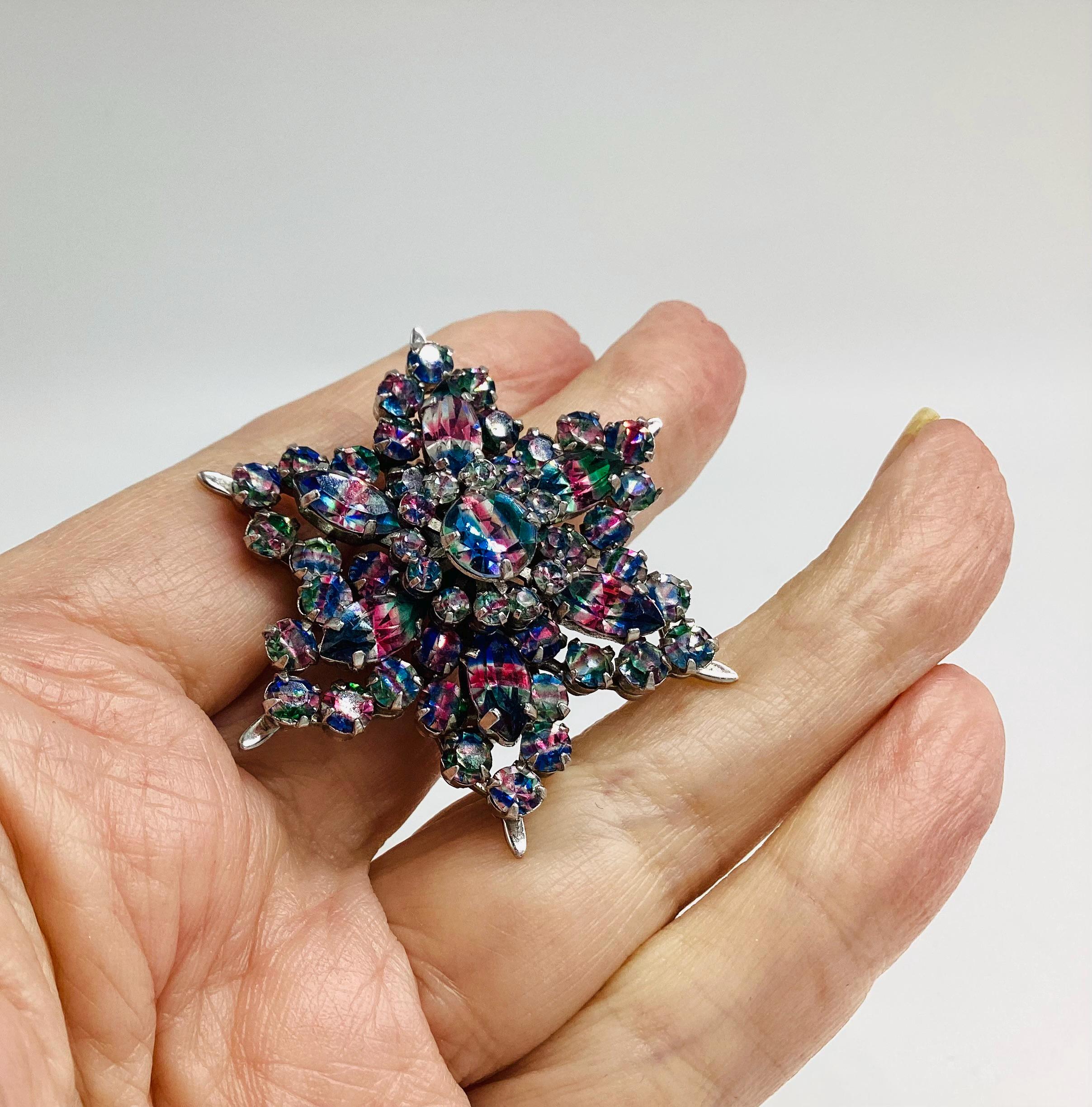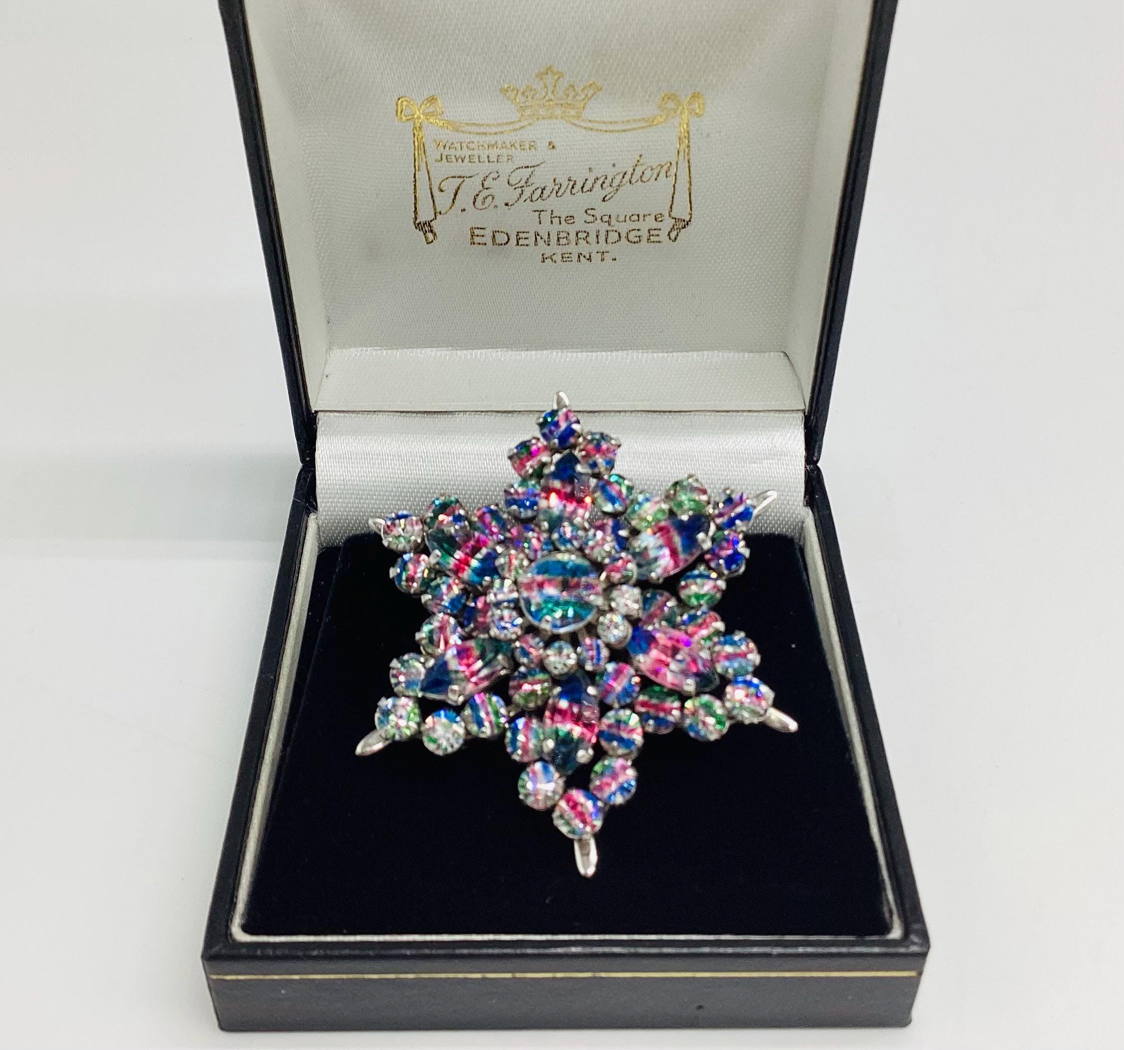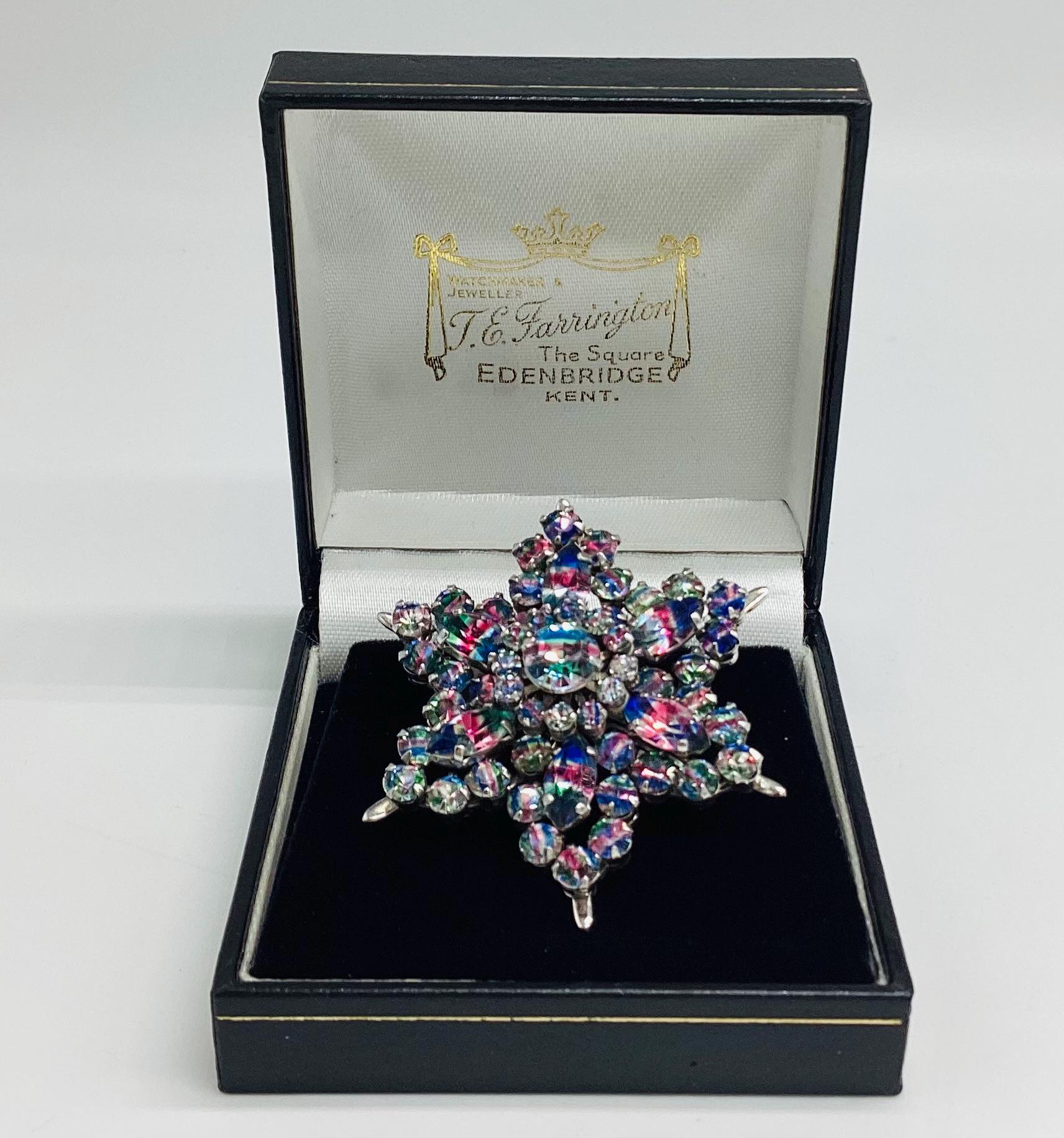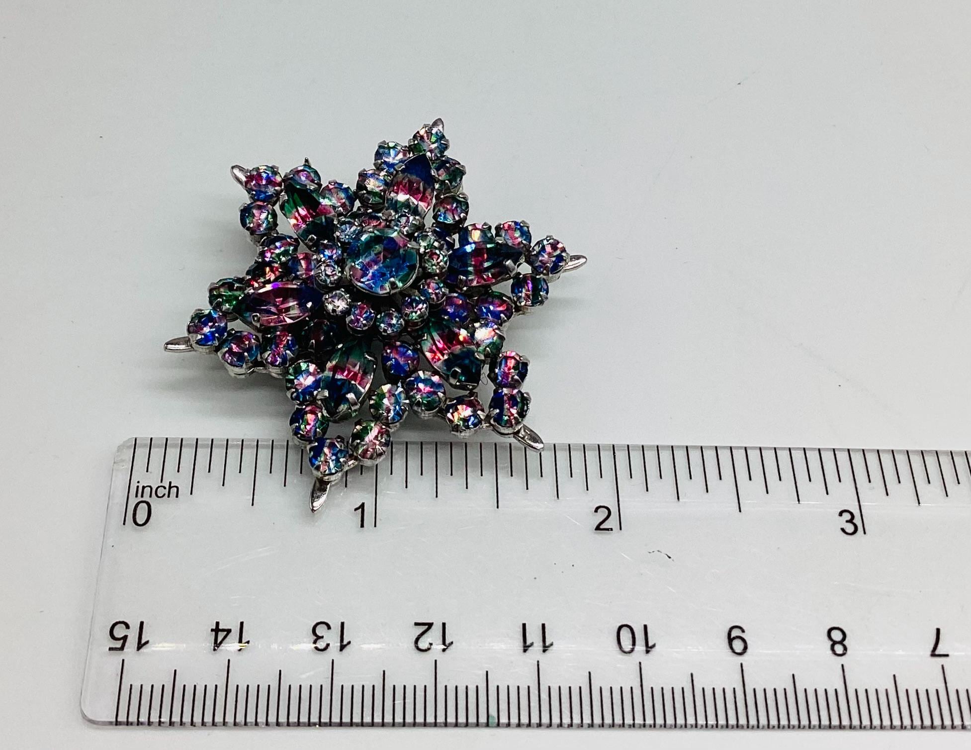 A lovely example of Art Deco iris glass set into this fabulous star shaped large oval cluster brooch. Shades of blue and pink in the faceted rhinestone crystals look fabulous against black or most colours.