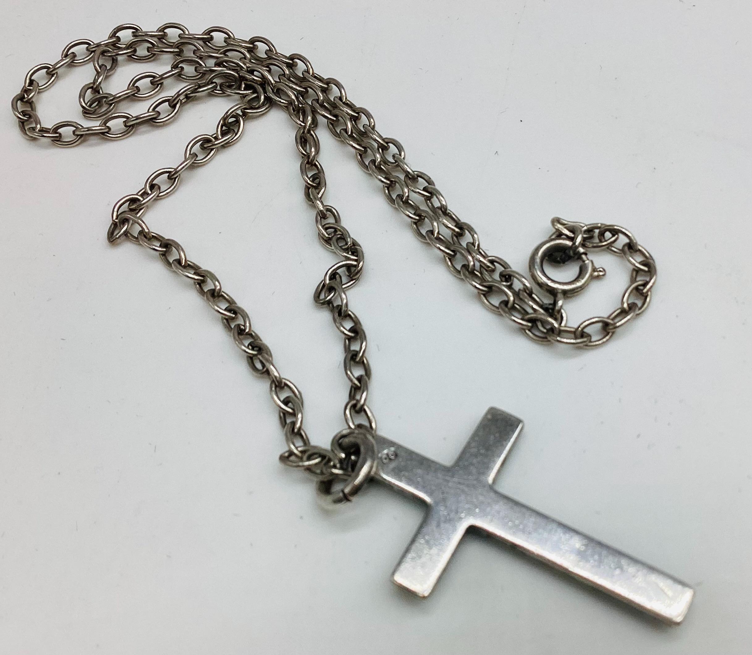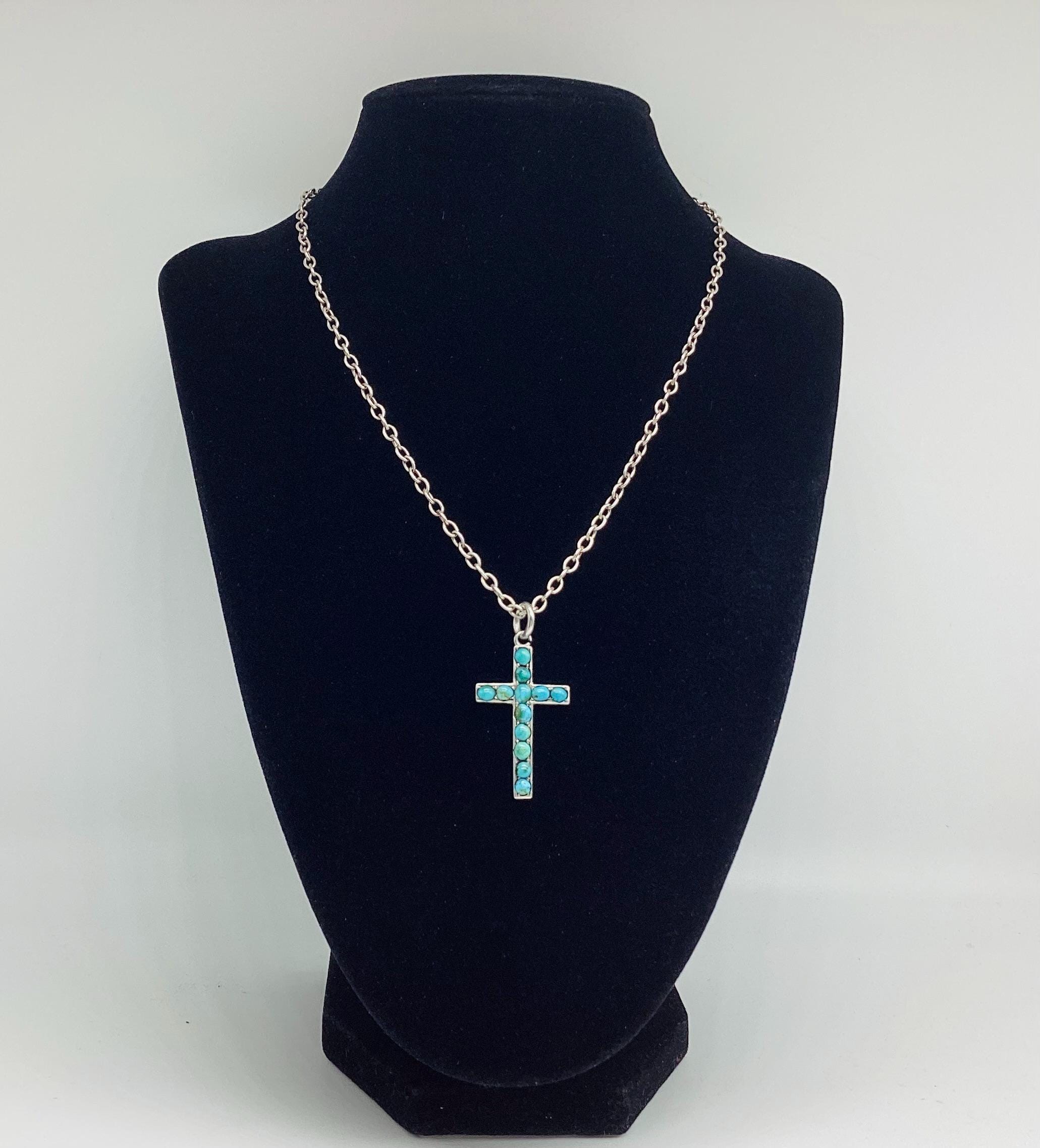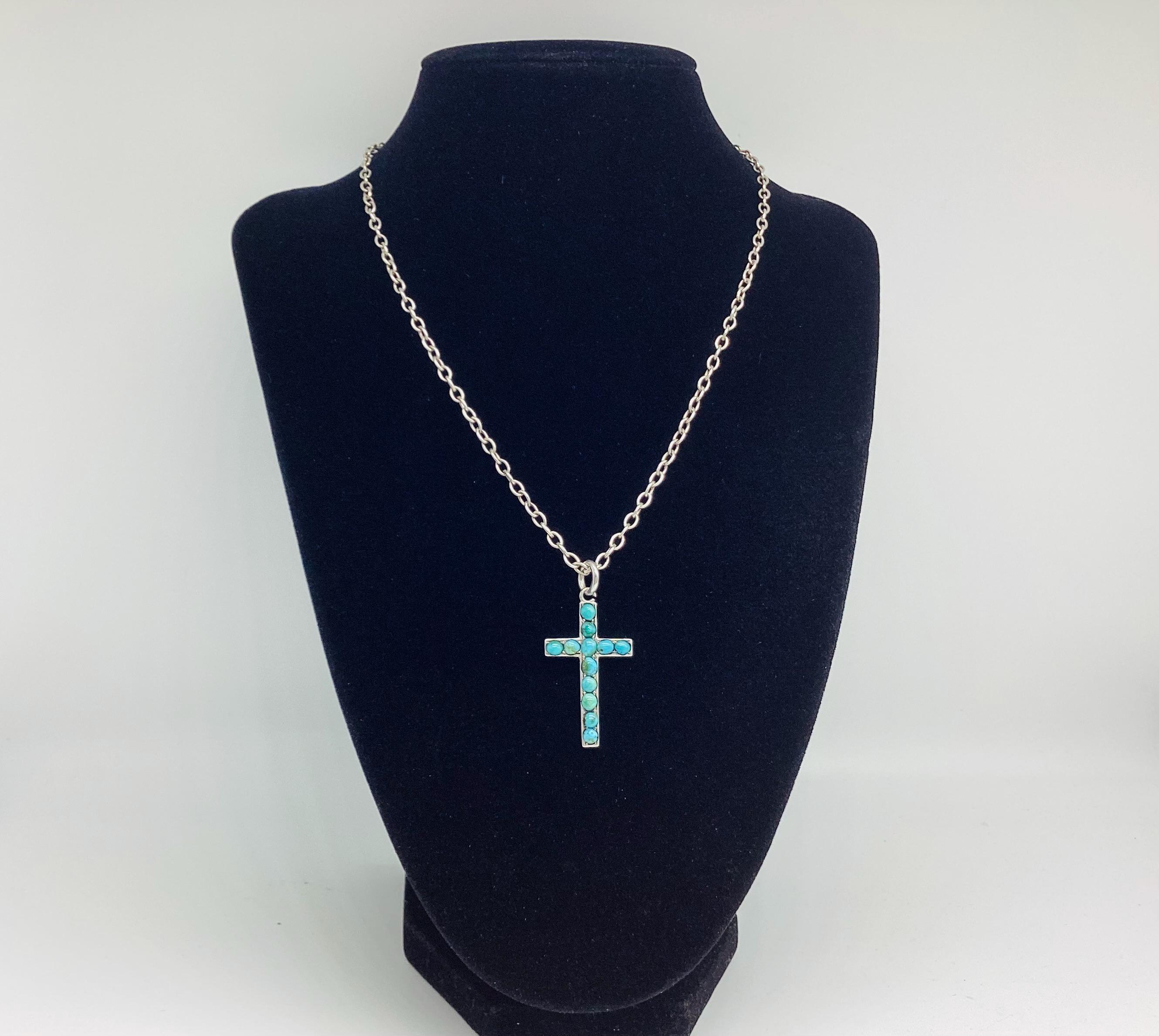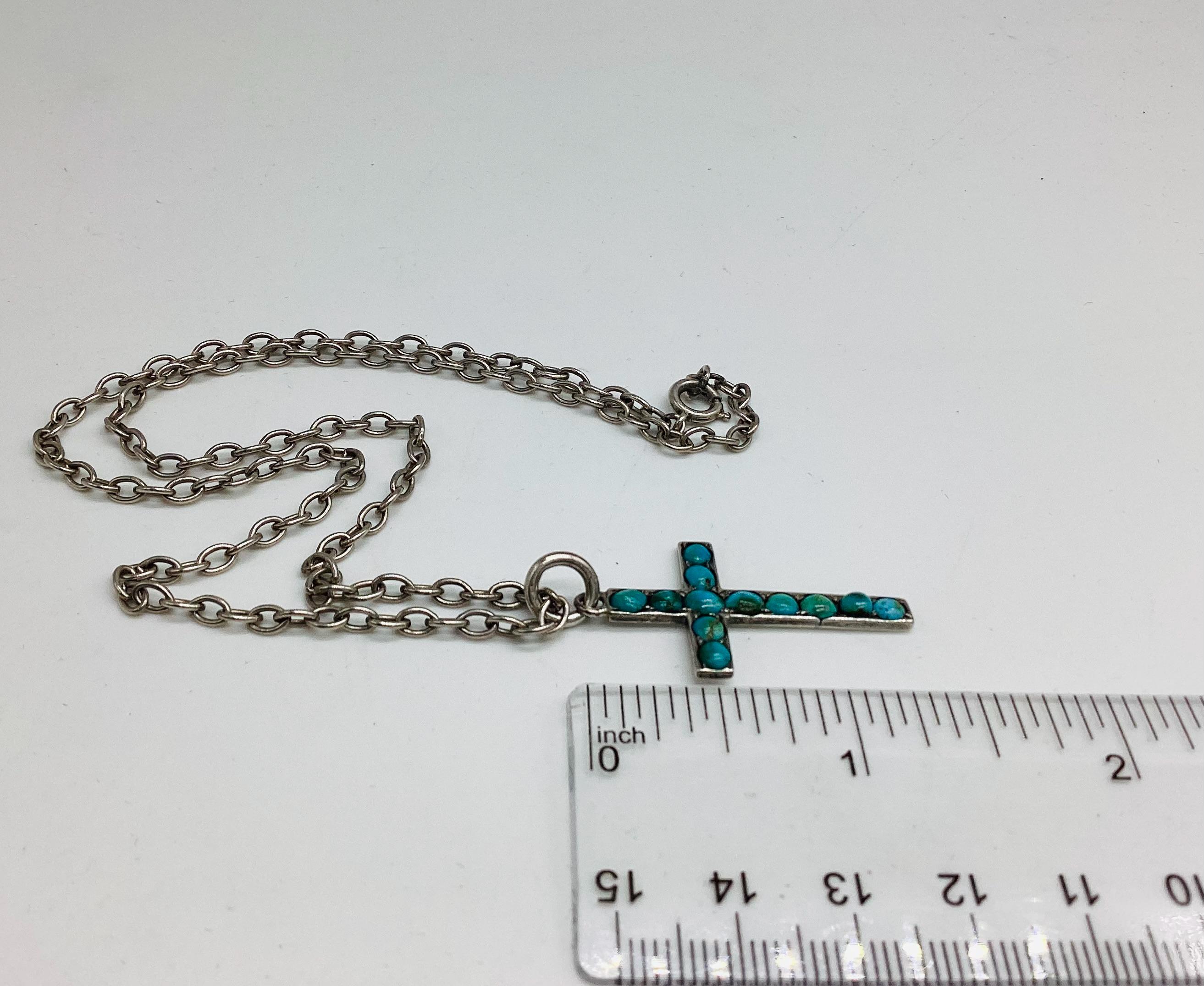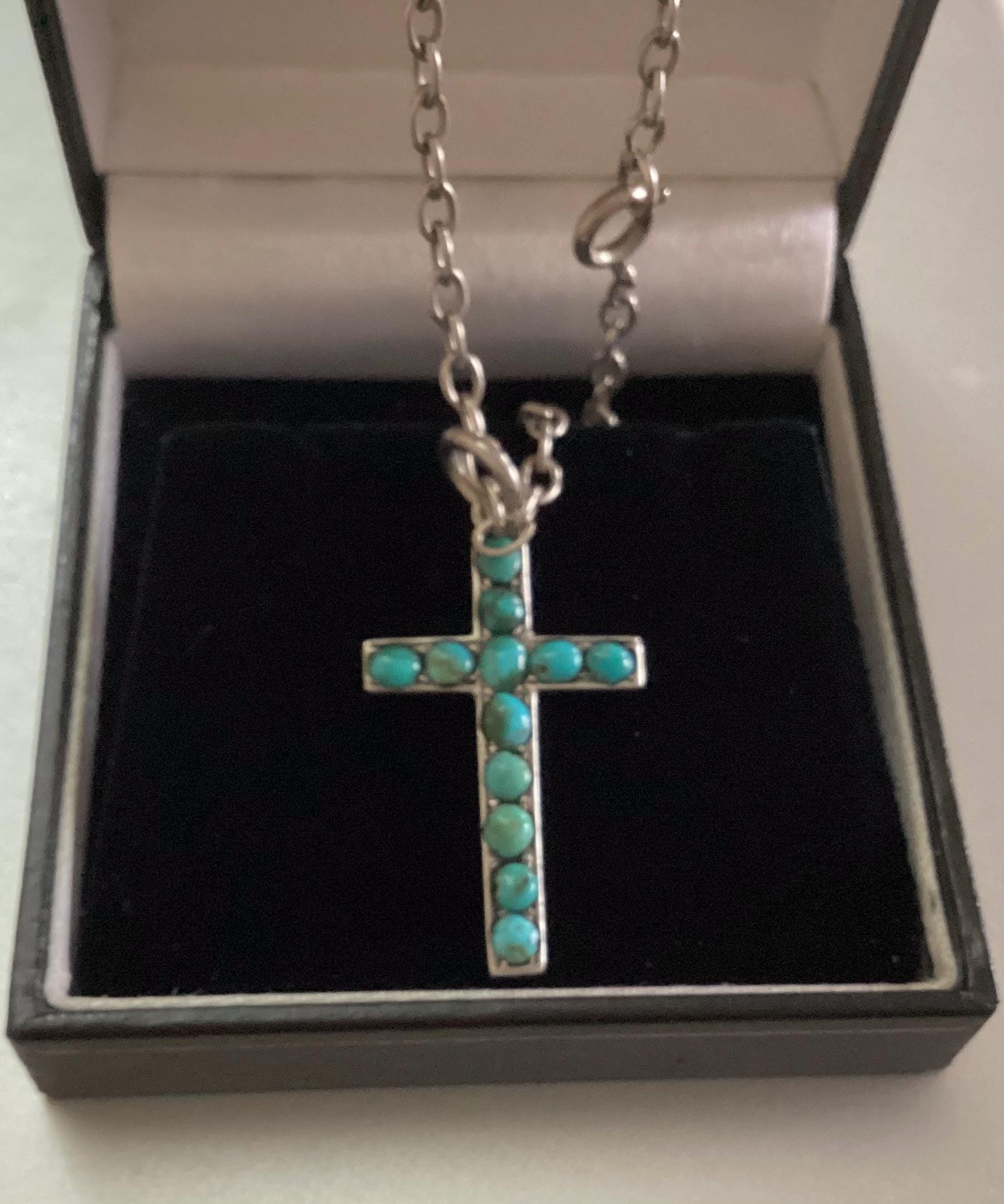 A beautiful vintage crucifix and chain; a stunning piece of jewellery. The prettiest blue turquoise gemstones. The cross is solid 900 silver and the chain solid 925 Sterling silver.