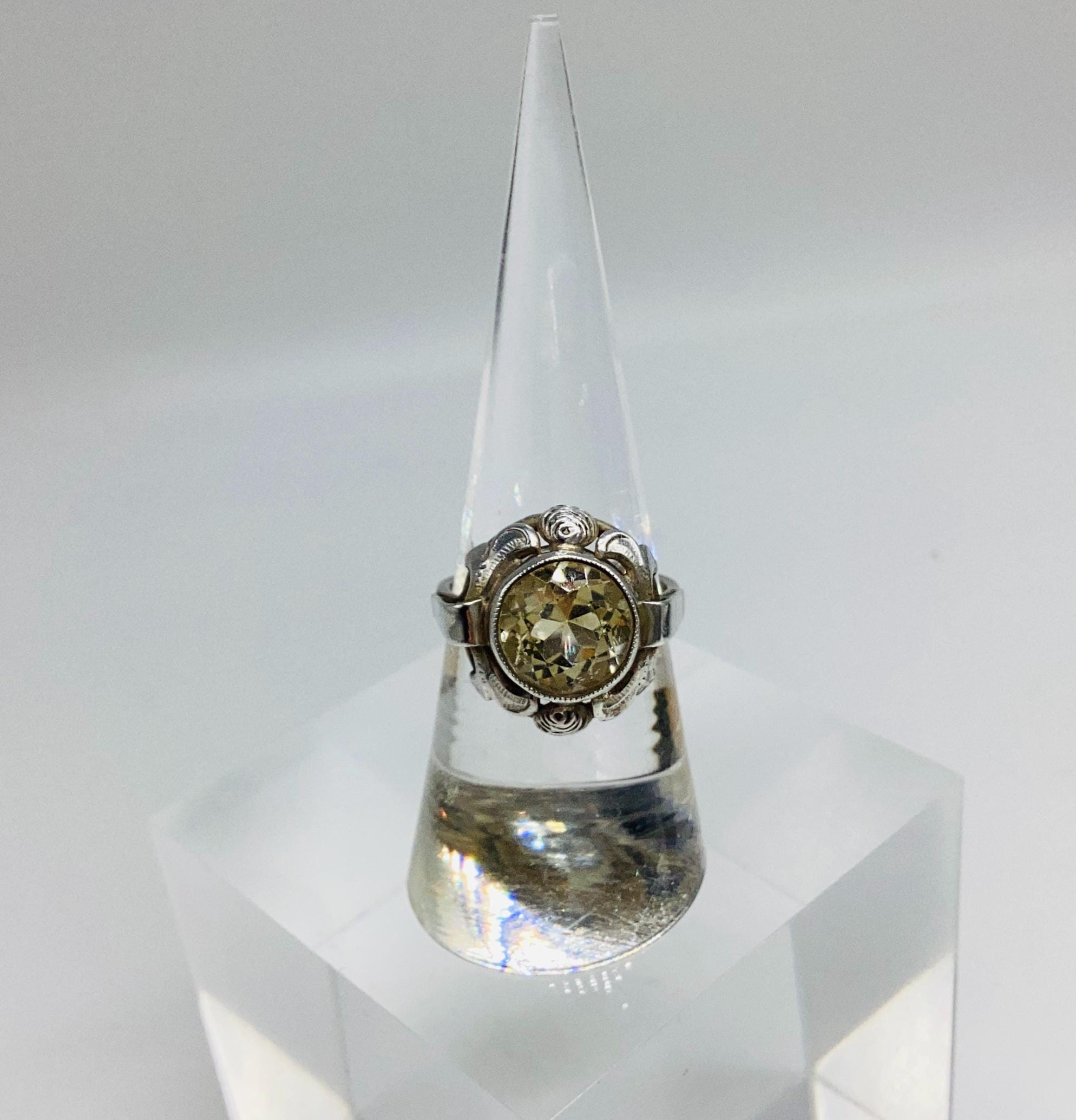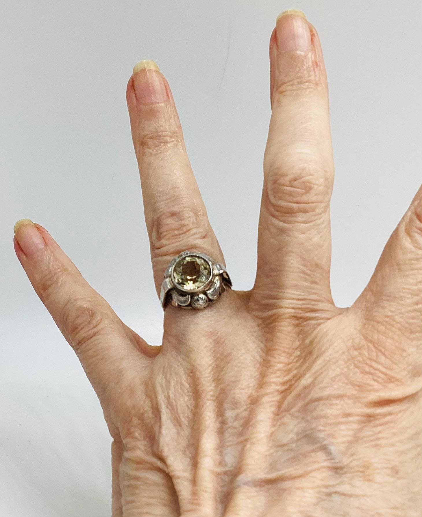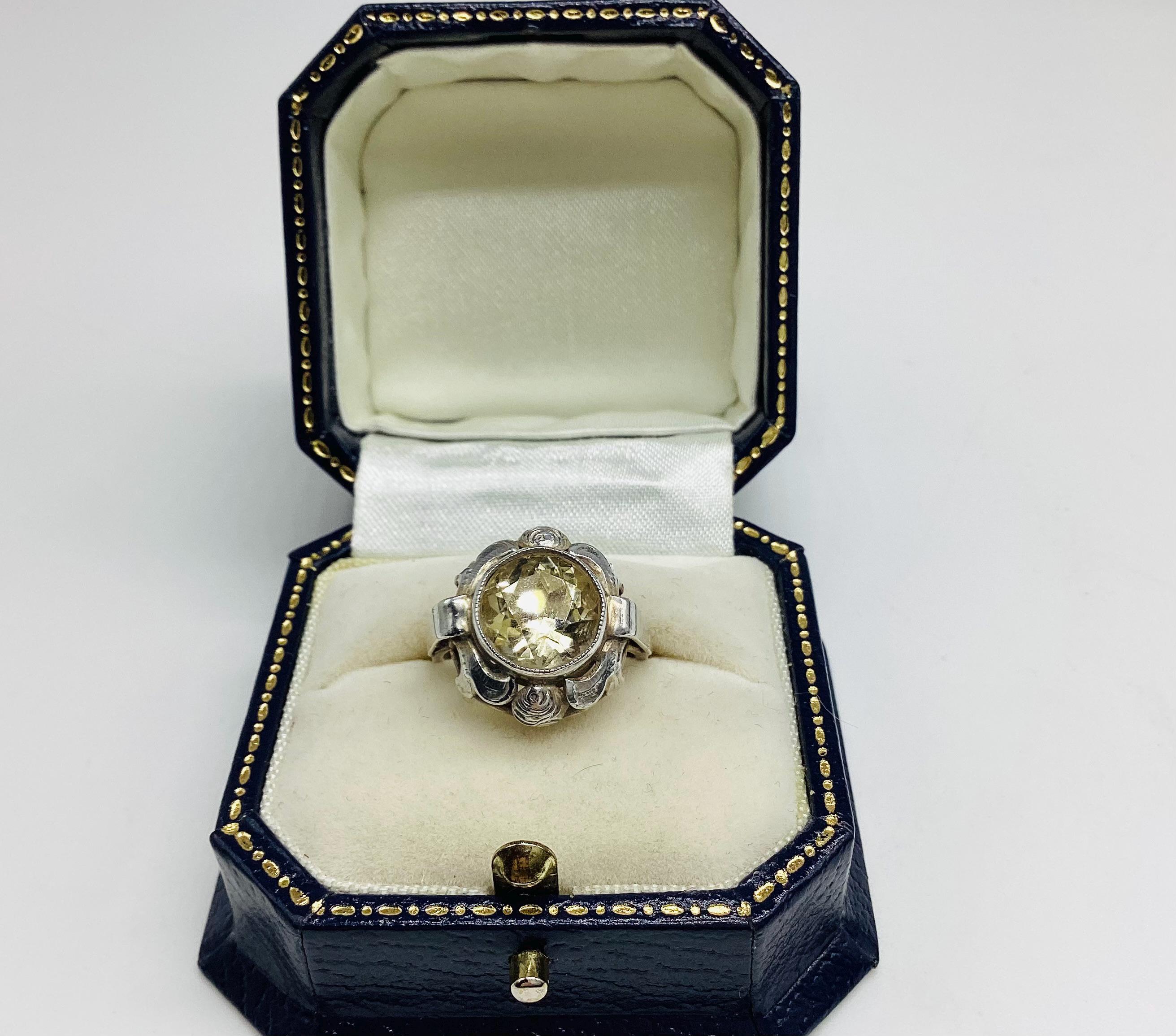 A stunning statement ring. Large pretty brilliant cut citrine in a solid silver flower and leaf setting with raised shoulders. Wonderful sparkle.