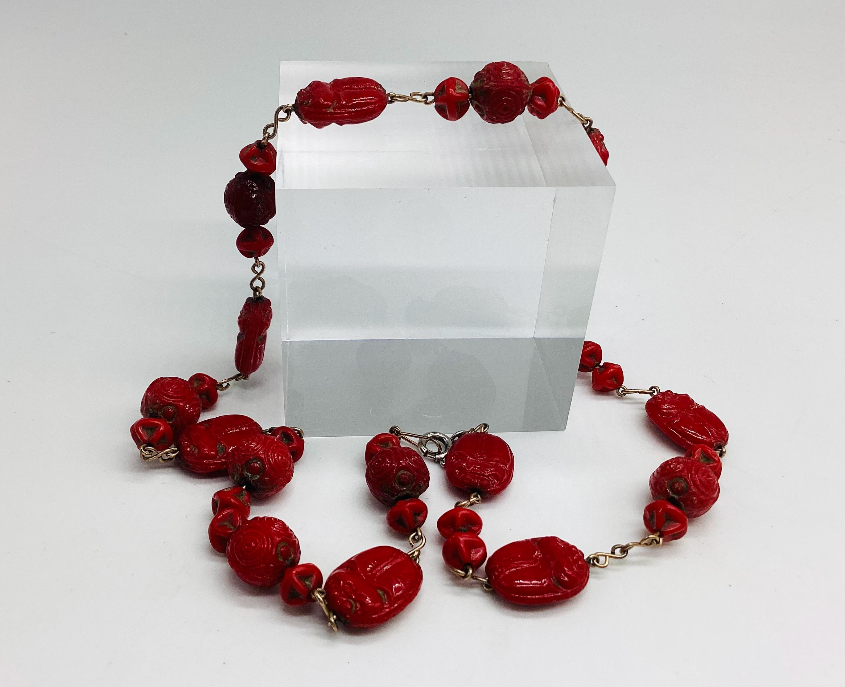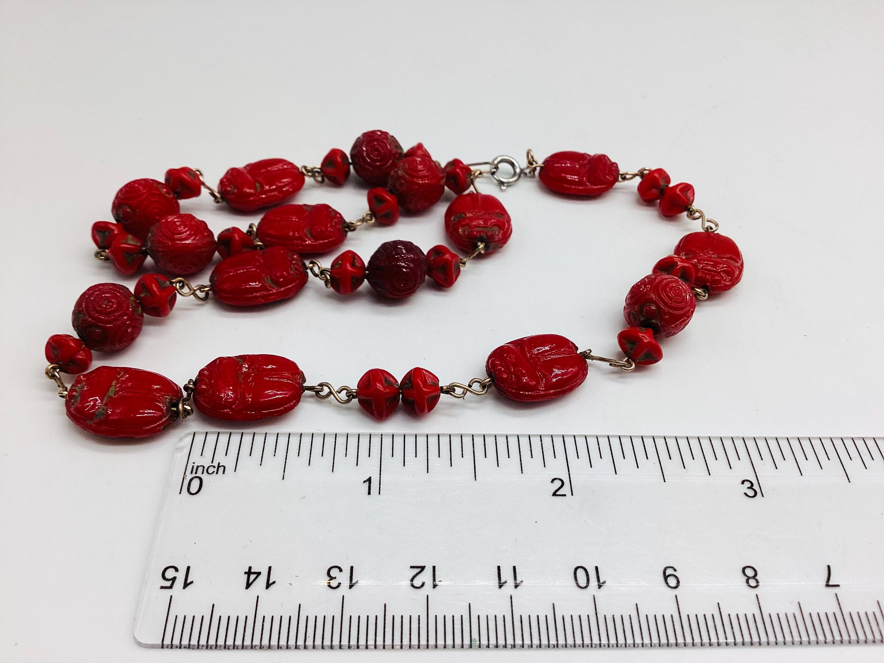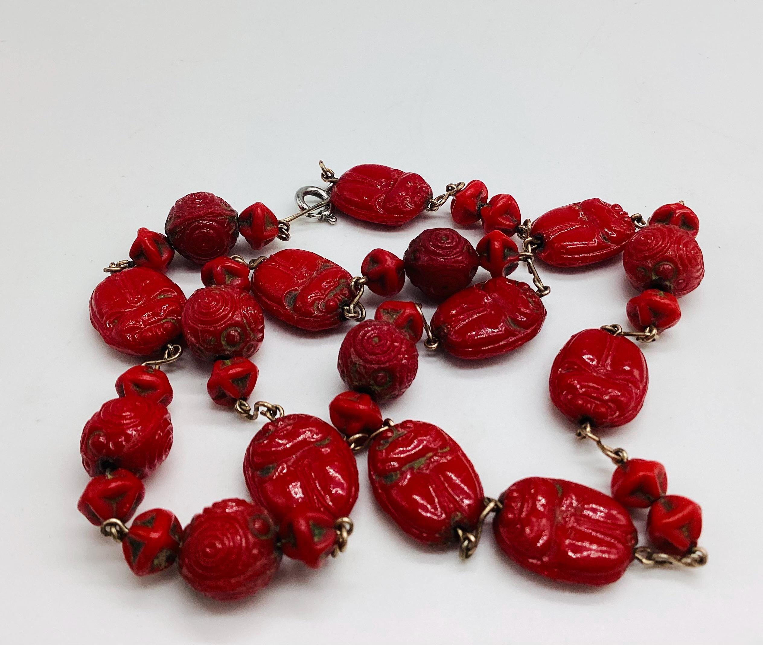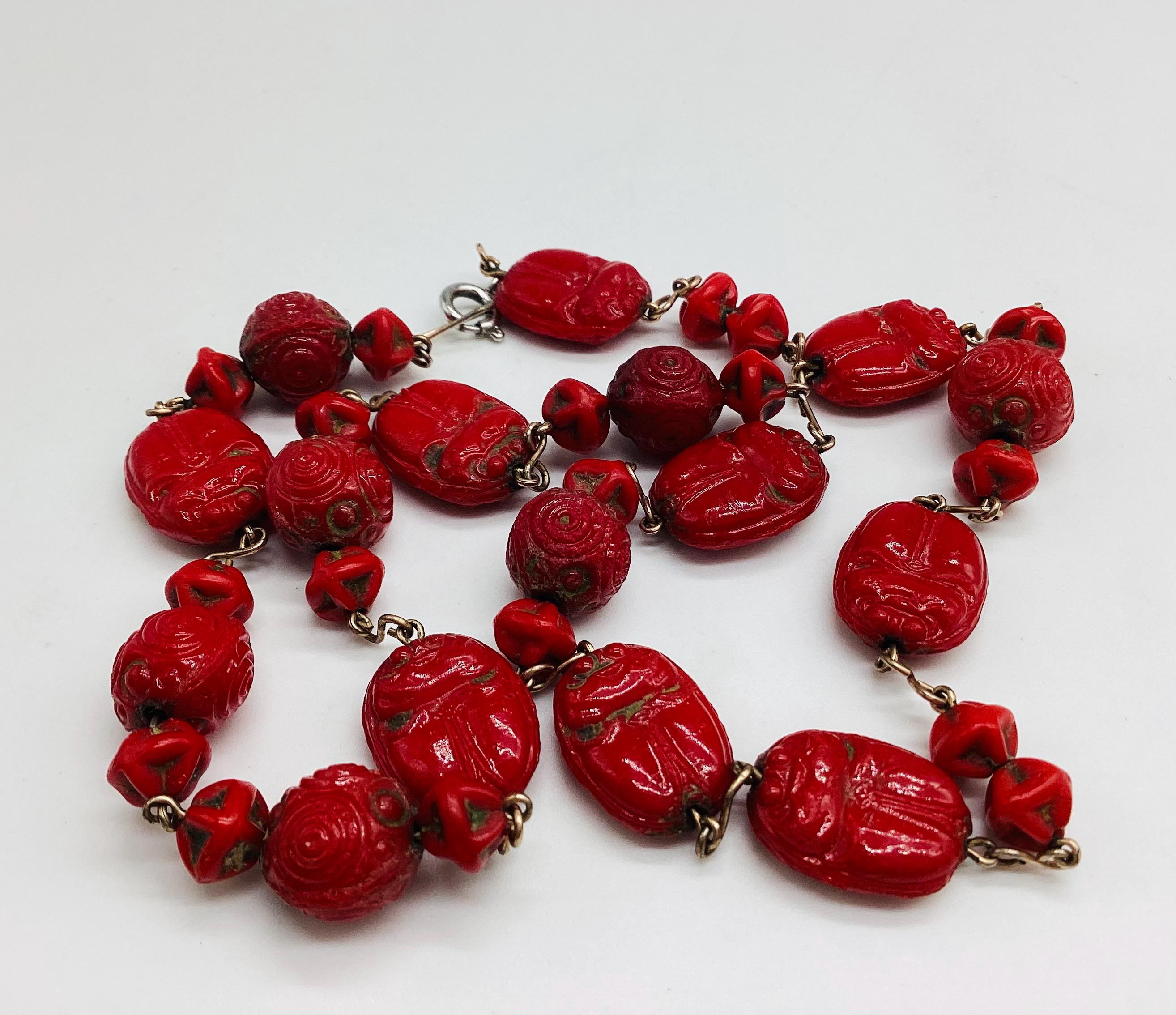Quite a rare piece of Czech glass jewellery. The most wonderful deep lipstick red glass adds to this Egyptian Revival style with each glass bead etched as a scarab and individually strung. The well known Nieger brother were creating at this time, they rarely signed their pieces, this is typical of their work. I have not attempted to clean this necklace and the darker beads would just need a light wash to come up the good red colour