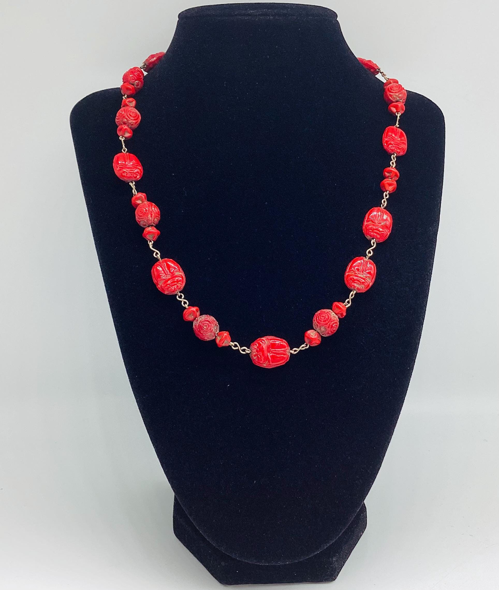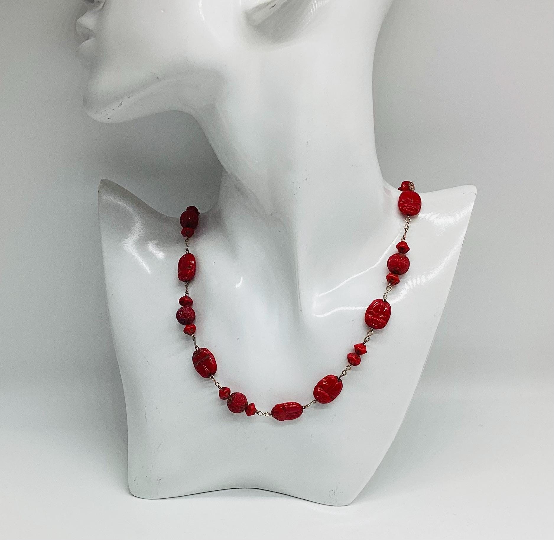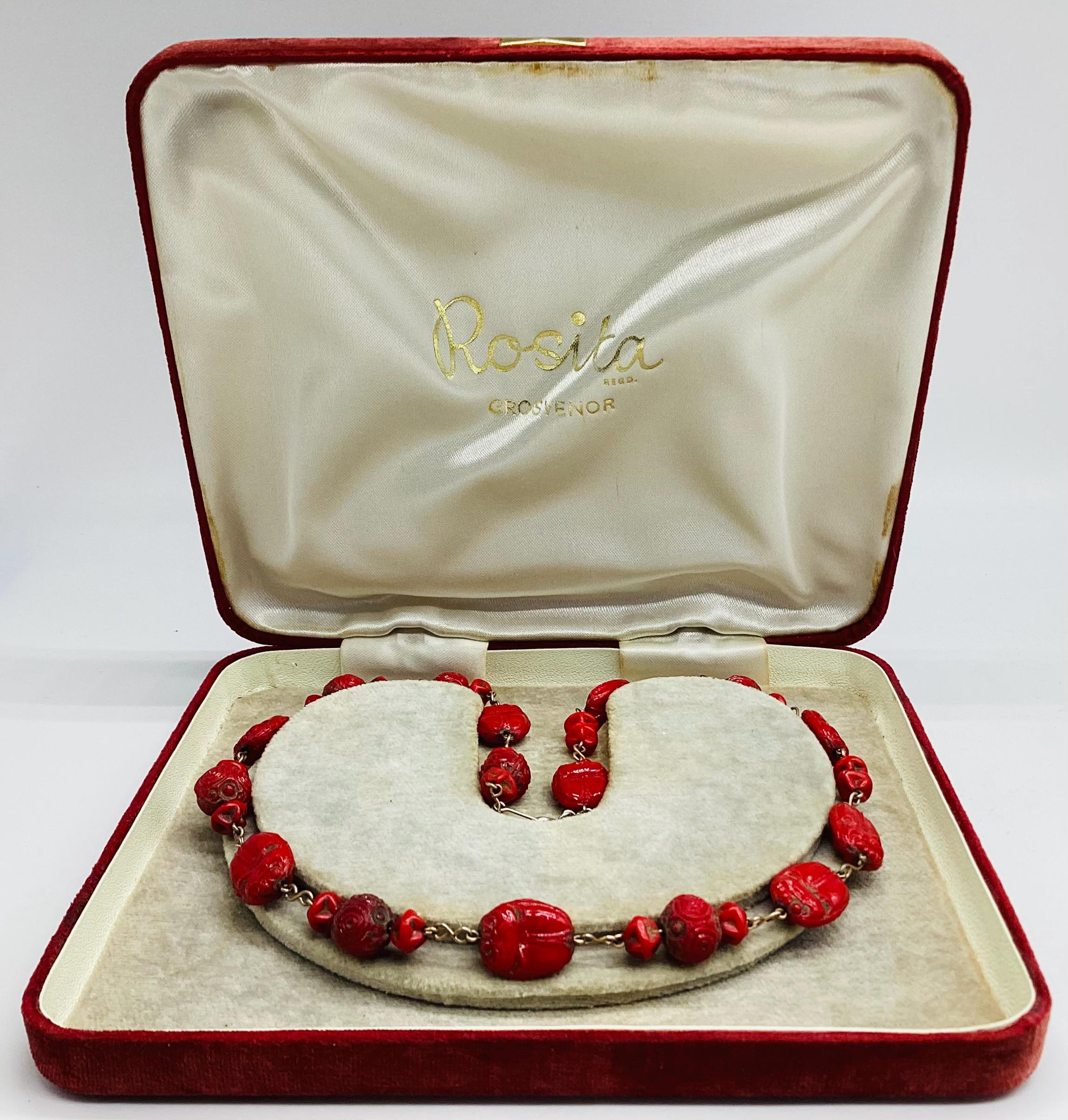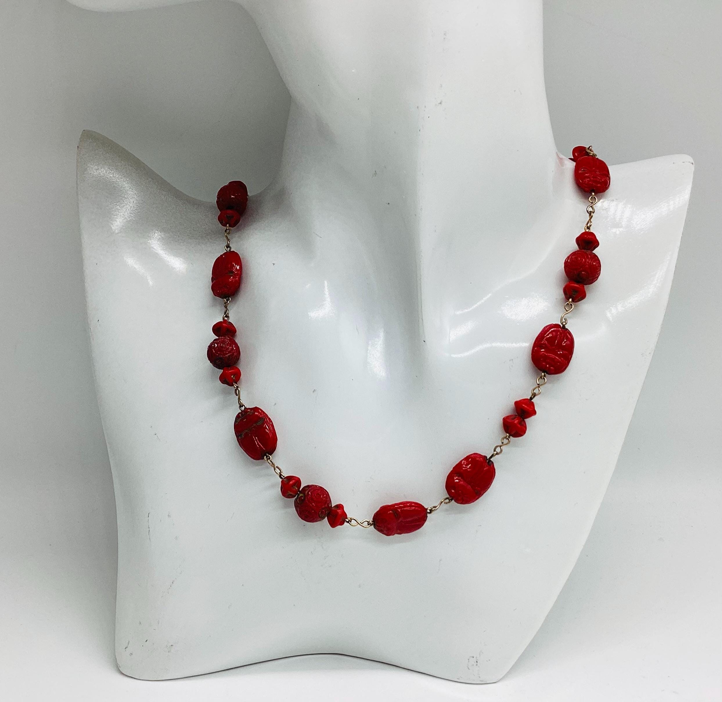 Quite a rare piece of Czech glass jewellery. The most wonderful deep lipstick red glass adds to this Egyptian Revival style with each glass bead etched as a scarab and individually strung. The well known Nieger brother were creating at this time, they rarely signed their pieces, this is typical of their work. I have not attempted to clean this necklace and the darker beads would just need a light wash to come up the good red colour