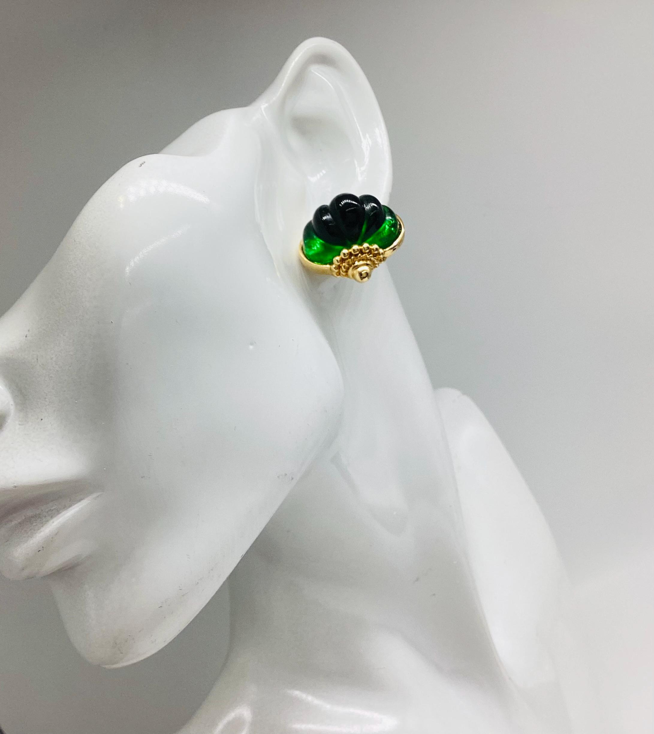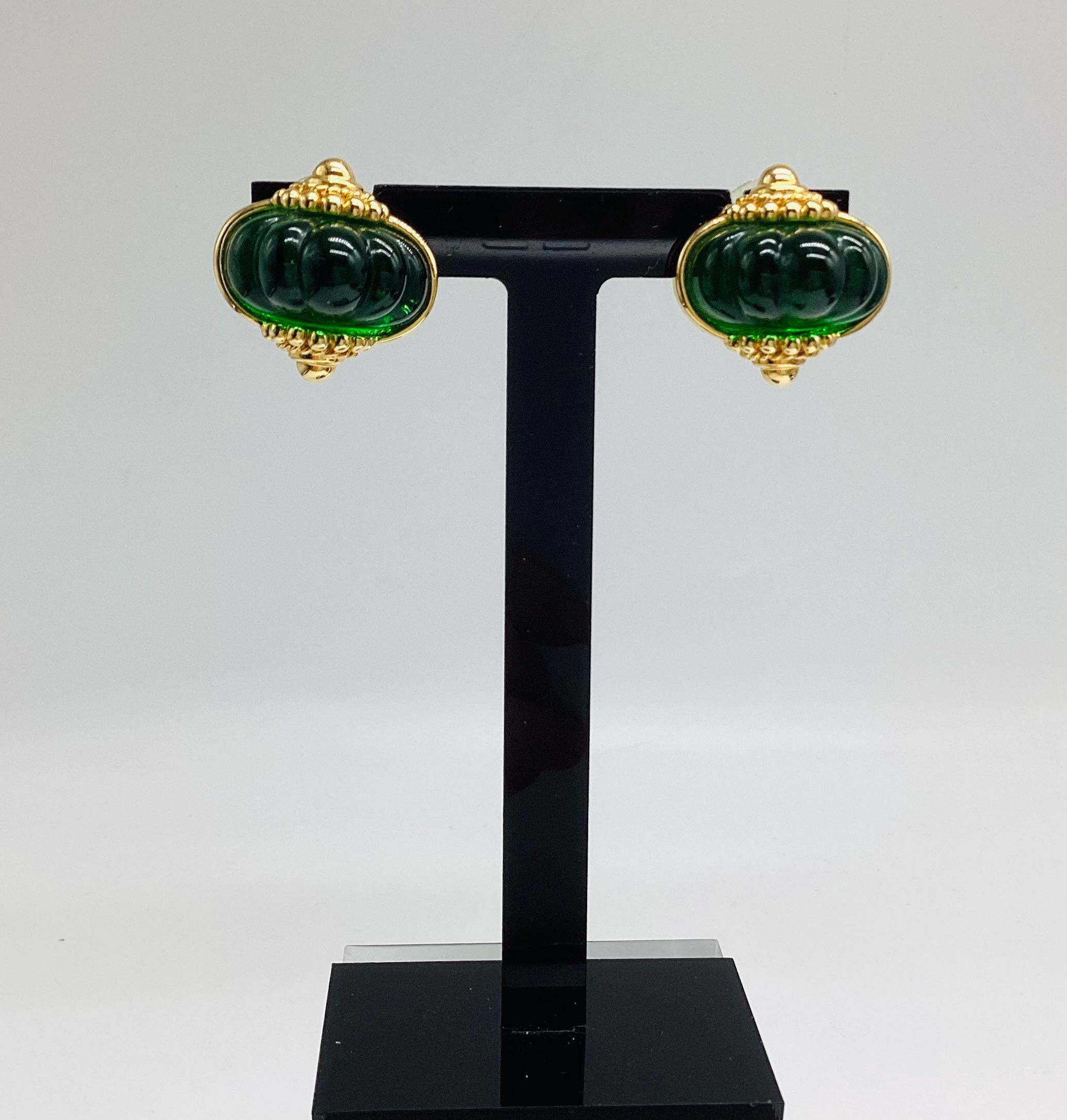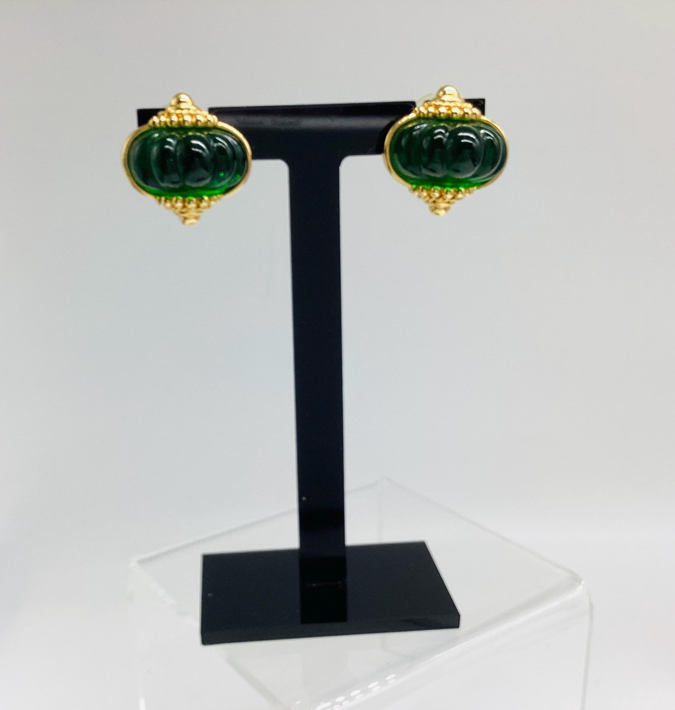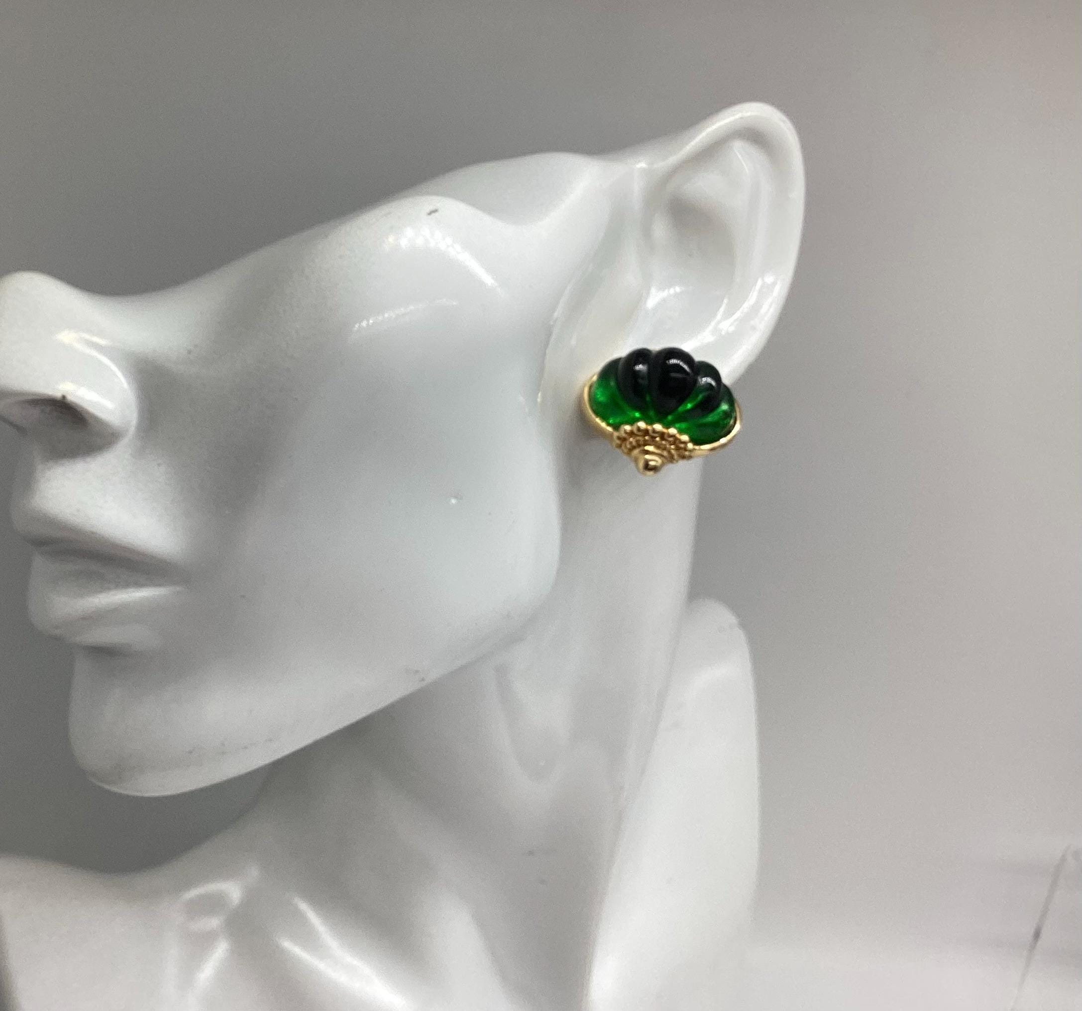 Rare Swarovski earrings featuring a shell shape design with emerald green glass crystals. The earrings are signed by the renowned brand Swarovski and are vintage pieces manufactured between 1990-1999.