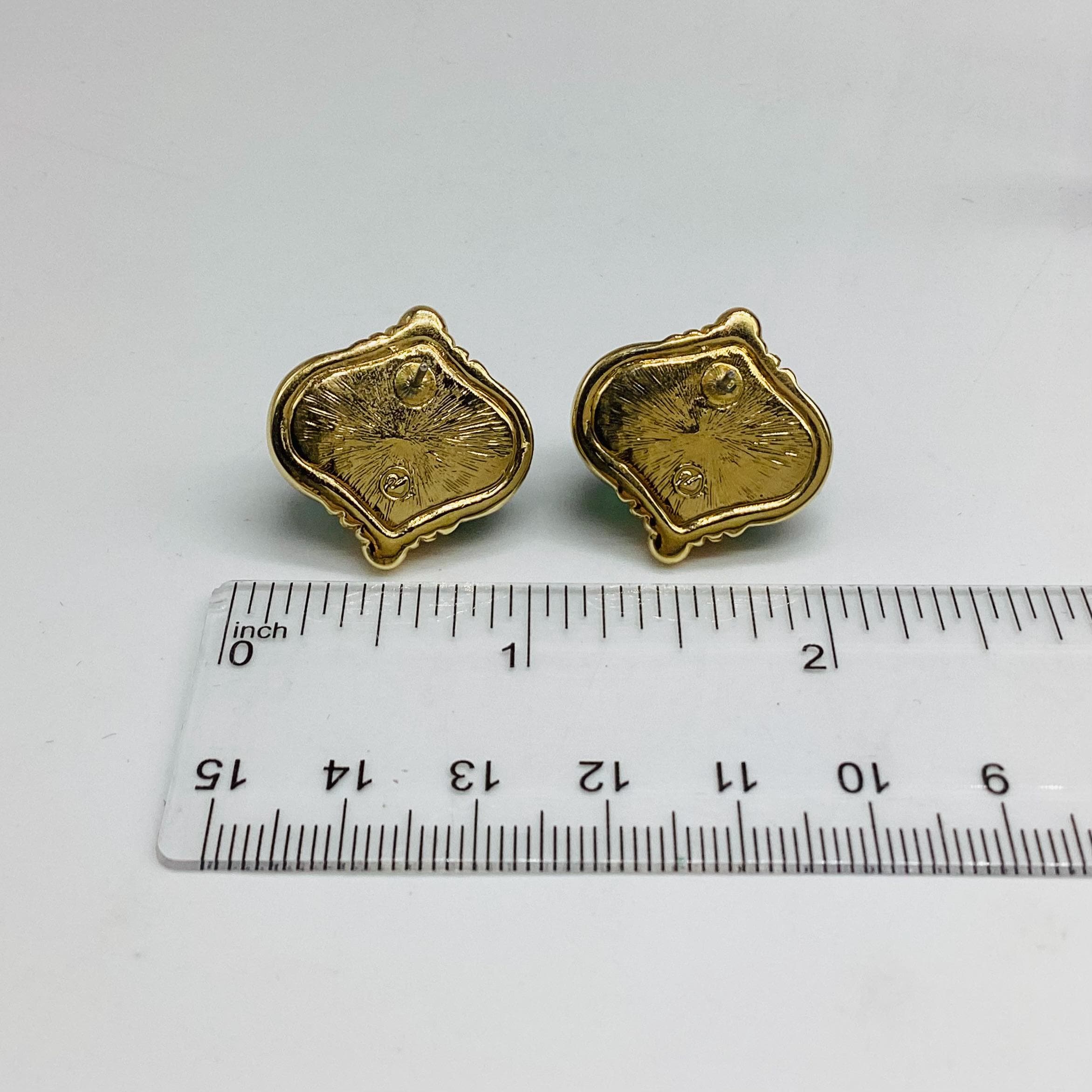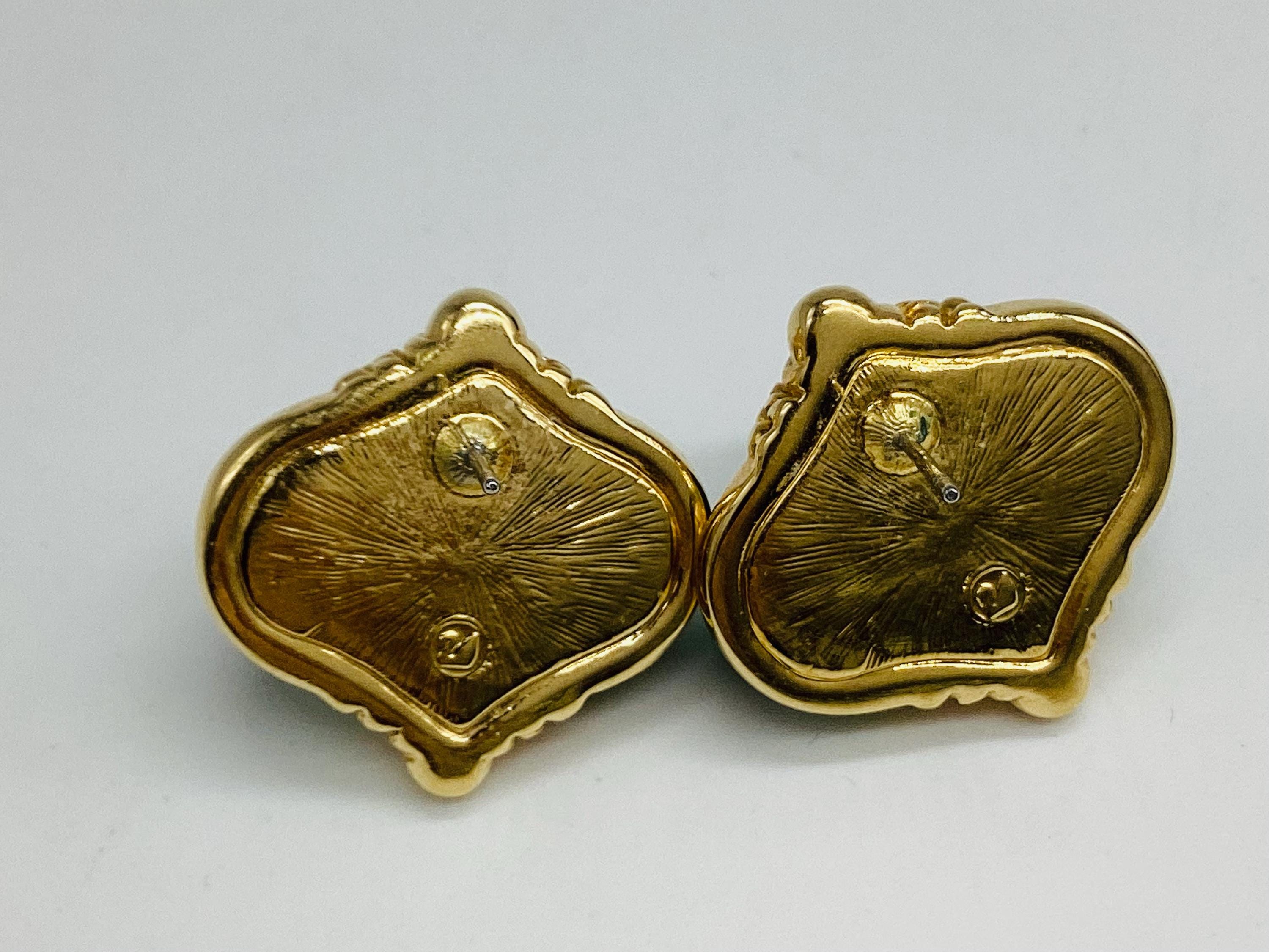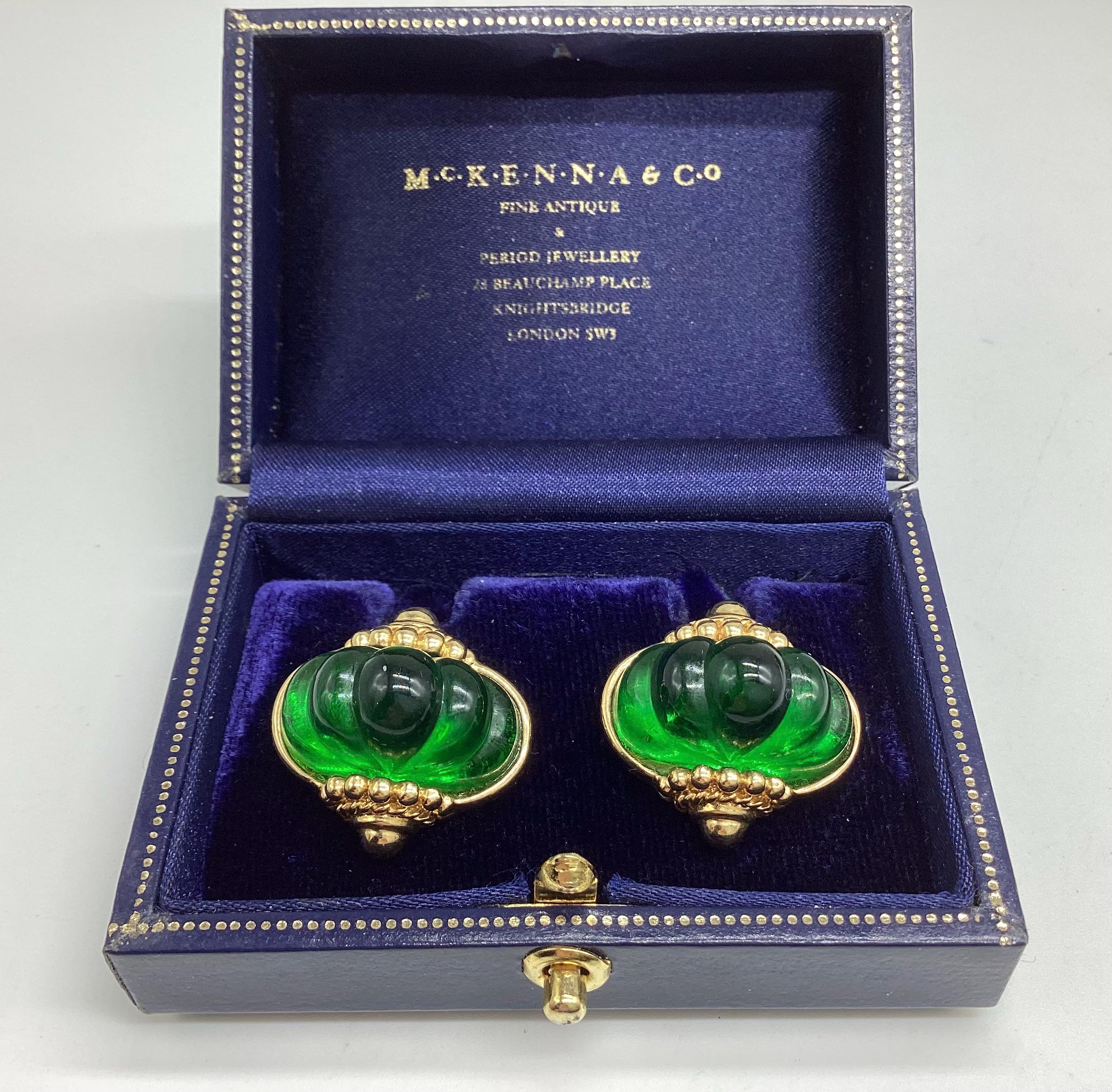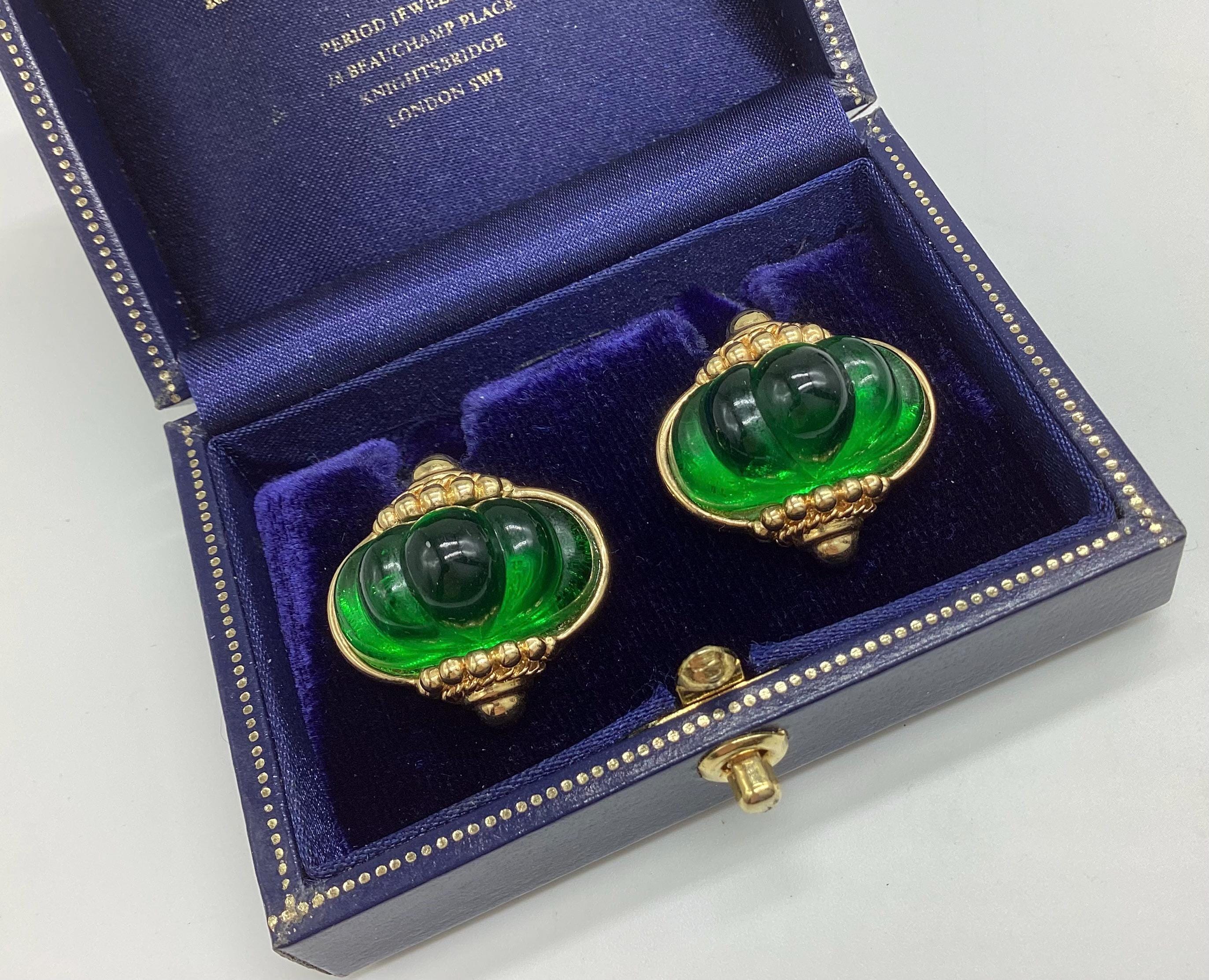 Rare Swarovski earrings featuring a shell shape design with emerald green glass crystals. The earrings are signed by the renowned brand Swarovski and are vintage pieces manufactured between 1990-1999.