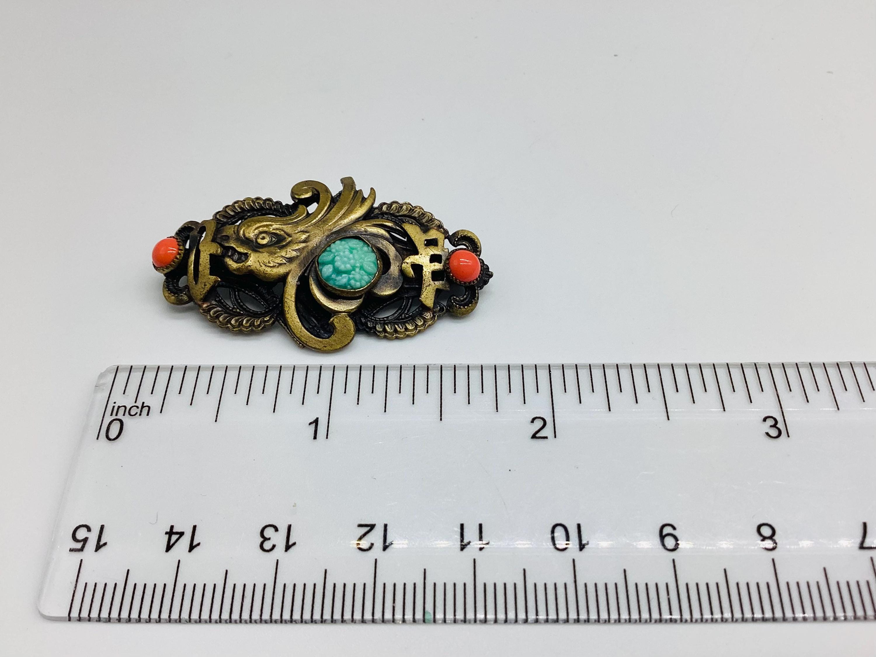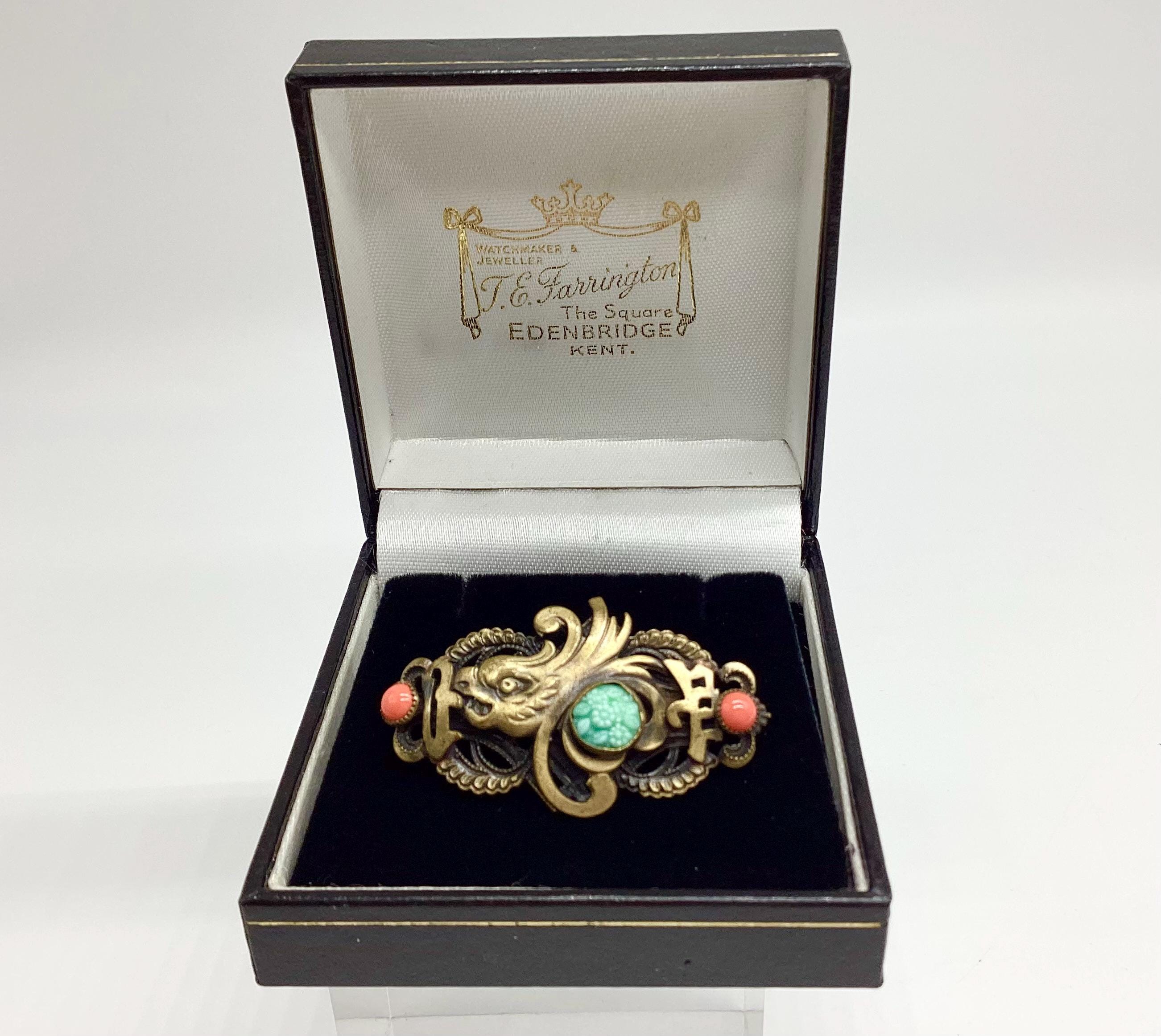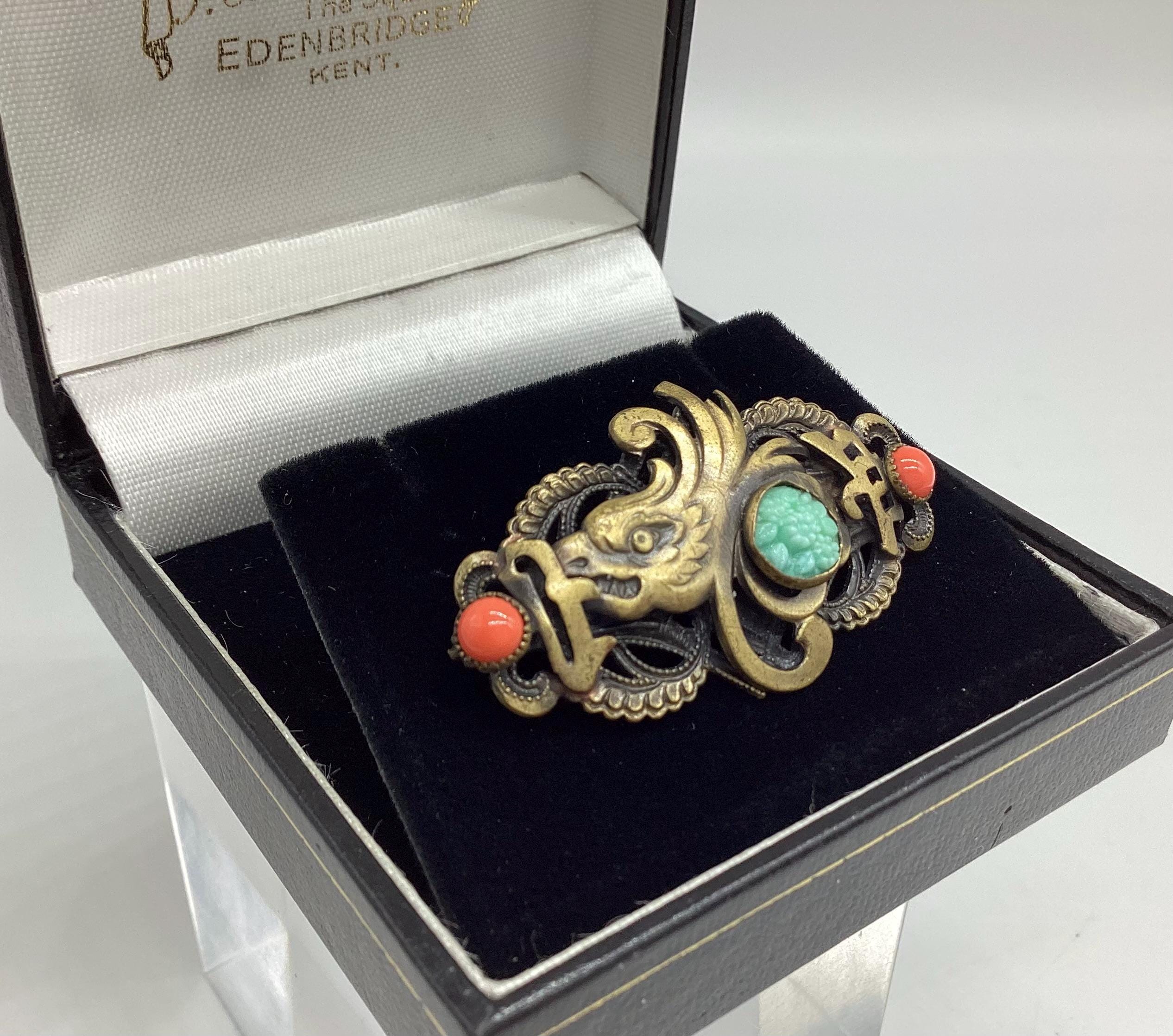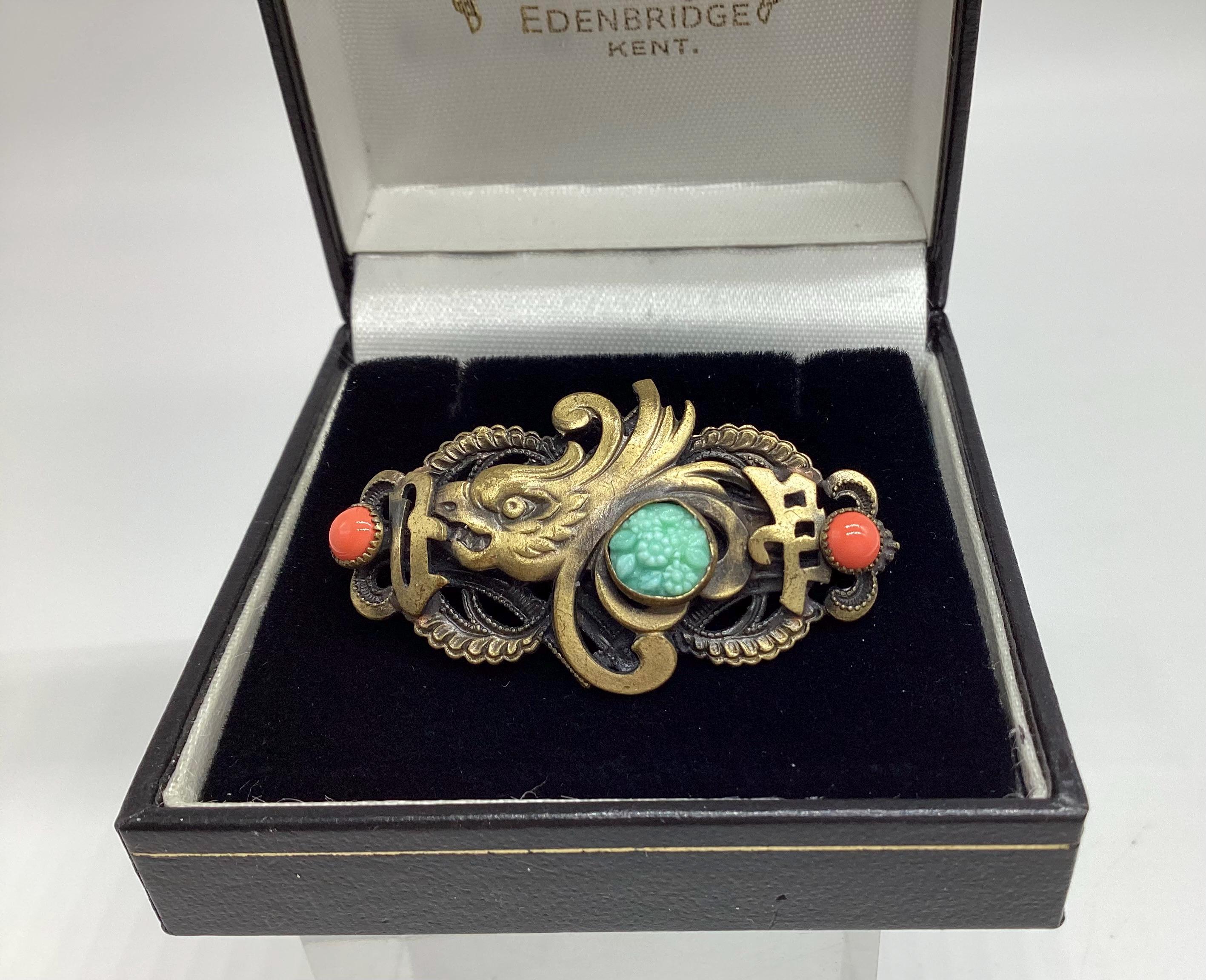 A superb rare brooch dating from the 1930's and the classic Art Deco period of Neiger Brothers Chinese revival jewellery. This features a beautiful glass carved jade chrysanthemum set in the tail of a dragon fish set in brass filigree with two coral beads either side. A fabulous piece of rare and collectable jewellery.