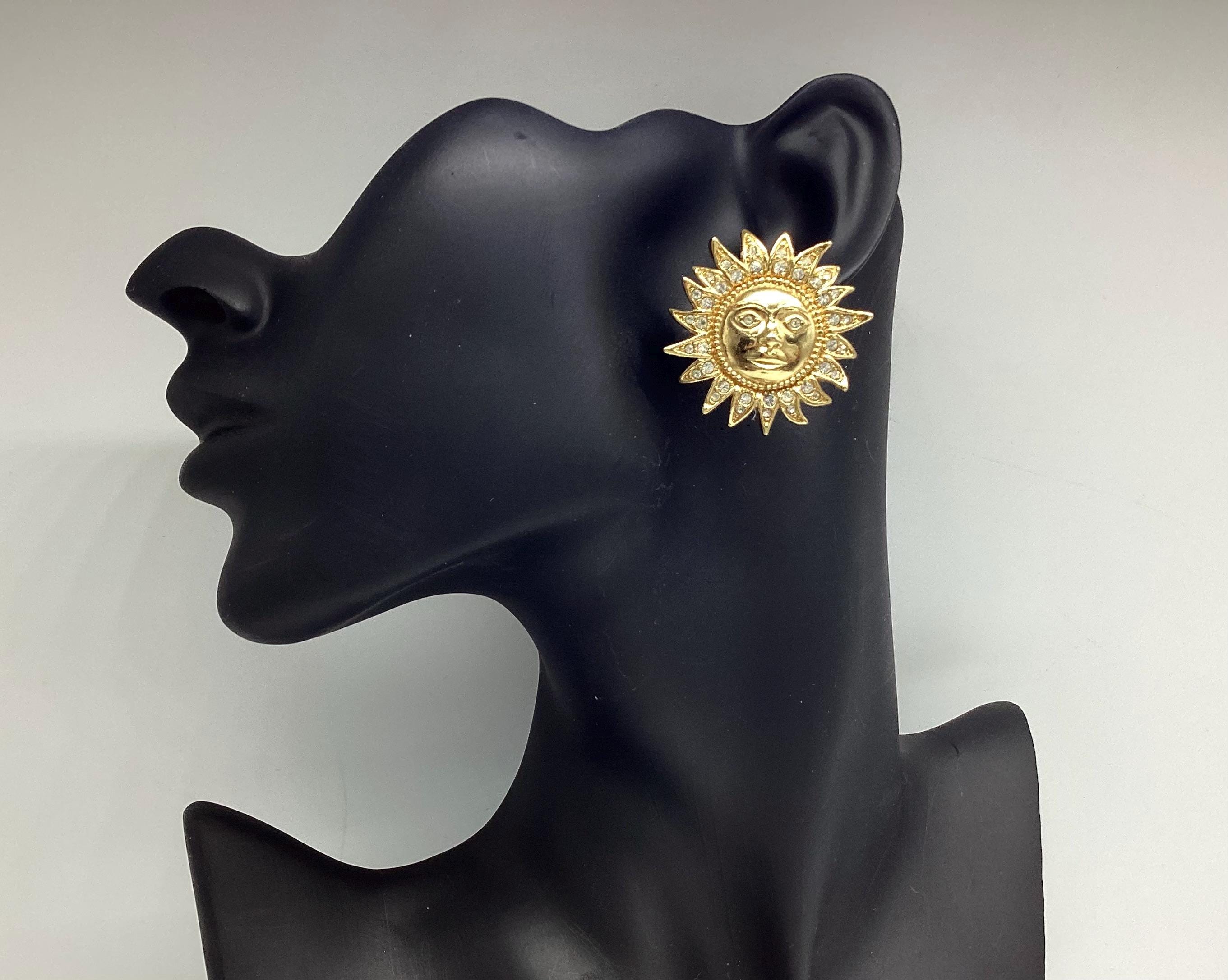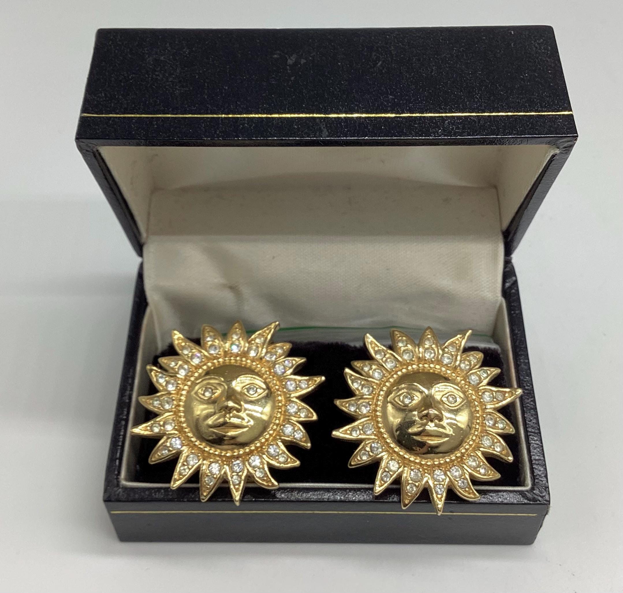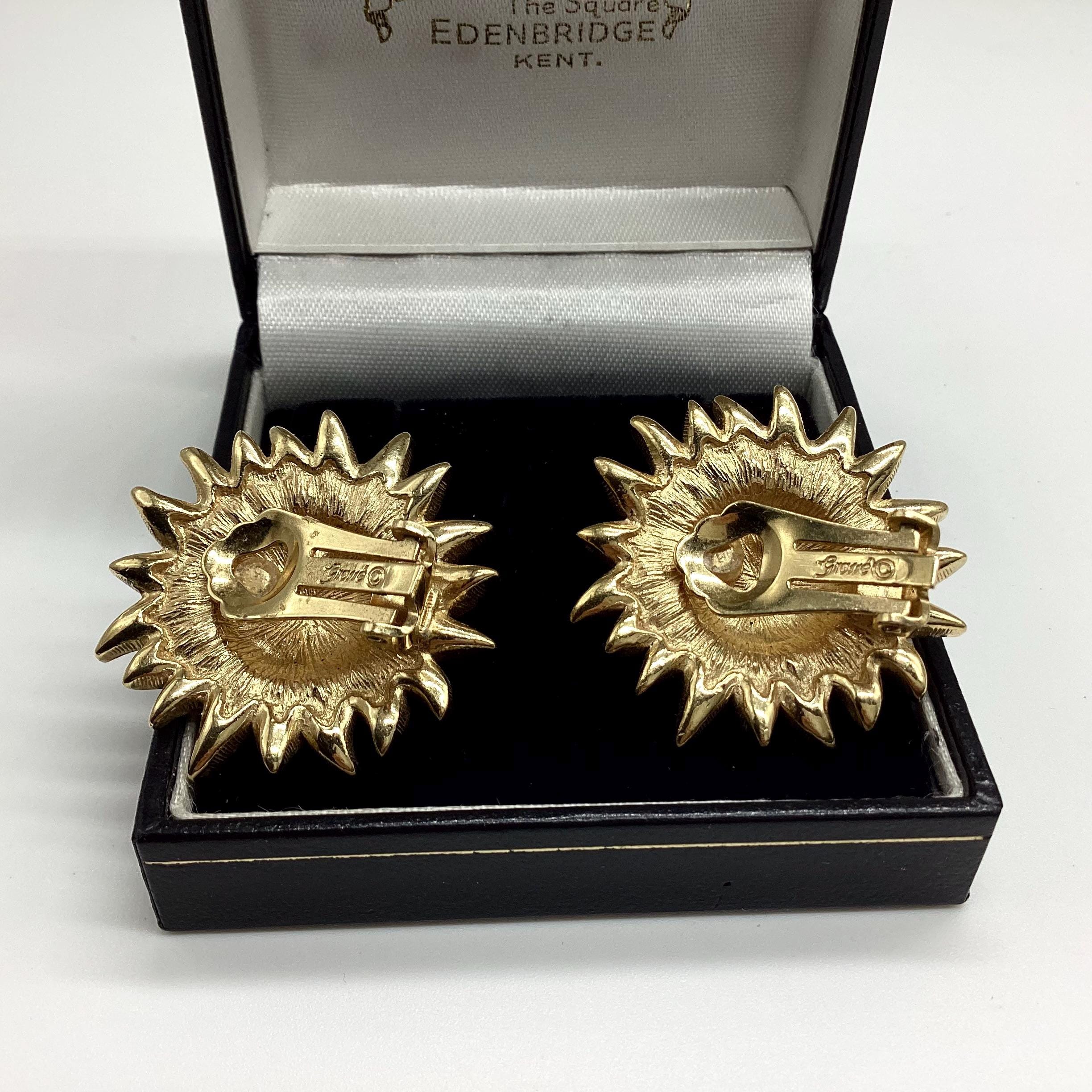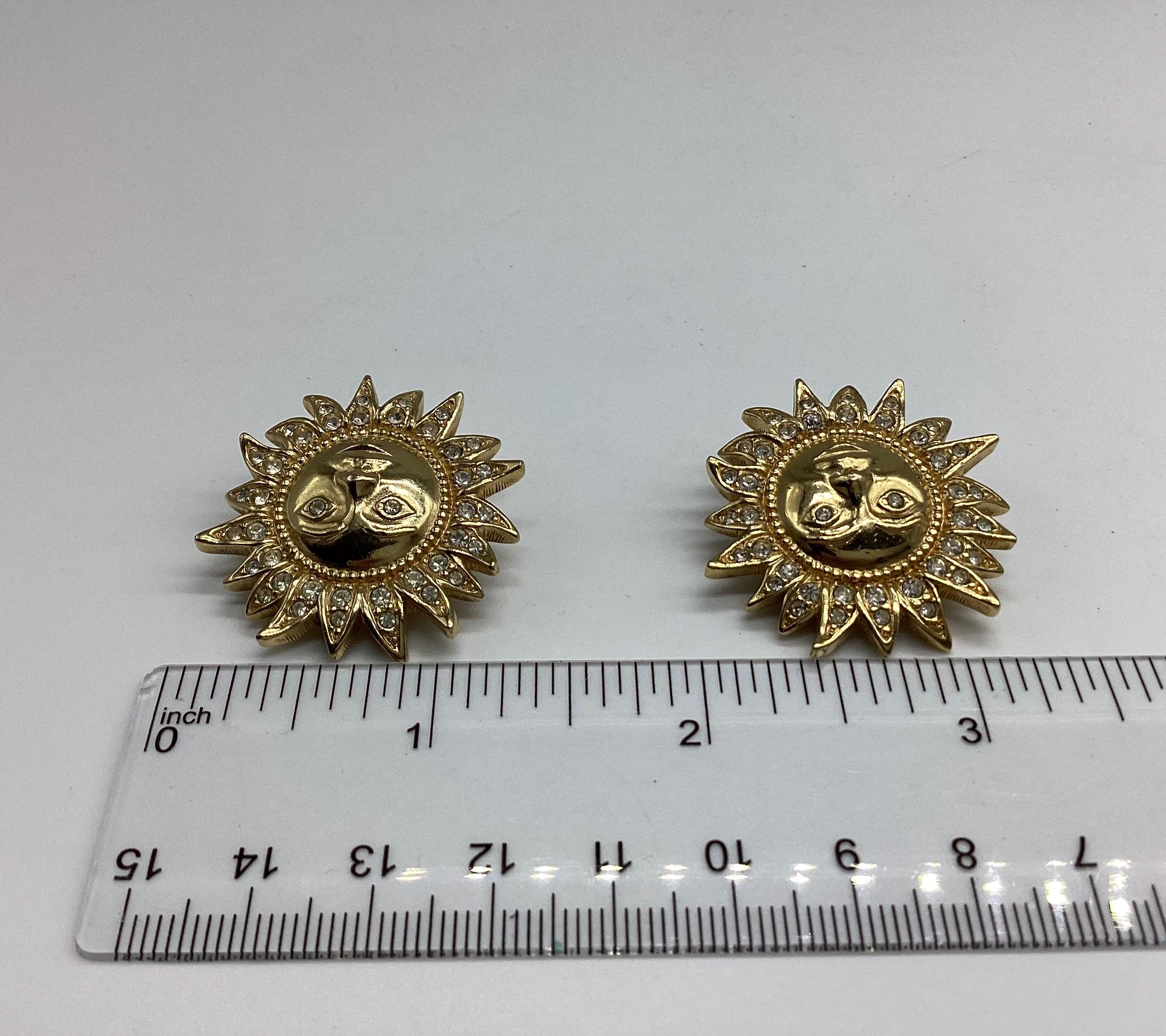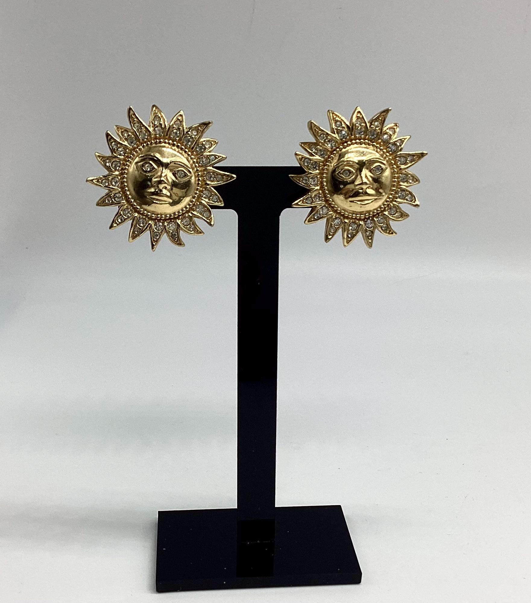 A fantastic pair of signed Grosse earrings. Popular subject and rare sun burst faces set with crystal. Lovely condition and quality. The history of Henkel and Grosse began in 1907, in the the city of Pforzheim, where Heinrich Henkel and his brother-in-law Florentin Grosse opened their own company. The firm grew, and in the mid-1920s, the designers established the first business contacts with the United States. Ten years later, they worked with such fashion houses as Lanvin and Schiaparelli in Paris, as well as Harrods in London and Saks in New York. In 1937, Henkel & Grosse was awarded the Medal of Honour at the World Exhibition in Paris for the innovative design of jewellery, as well as for the creation of new technologies in their production.