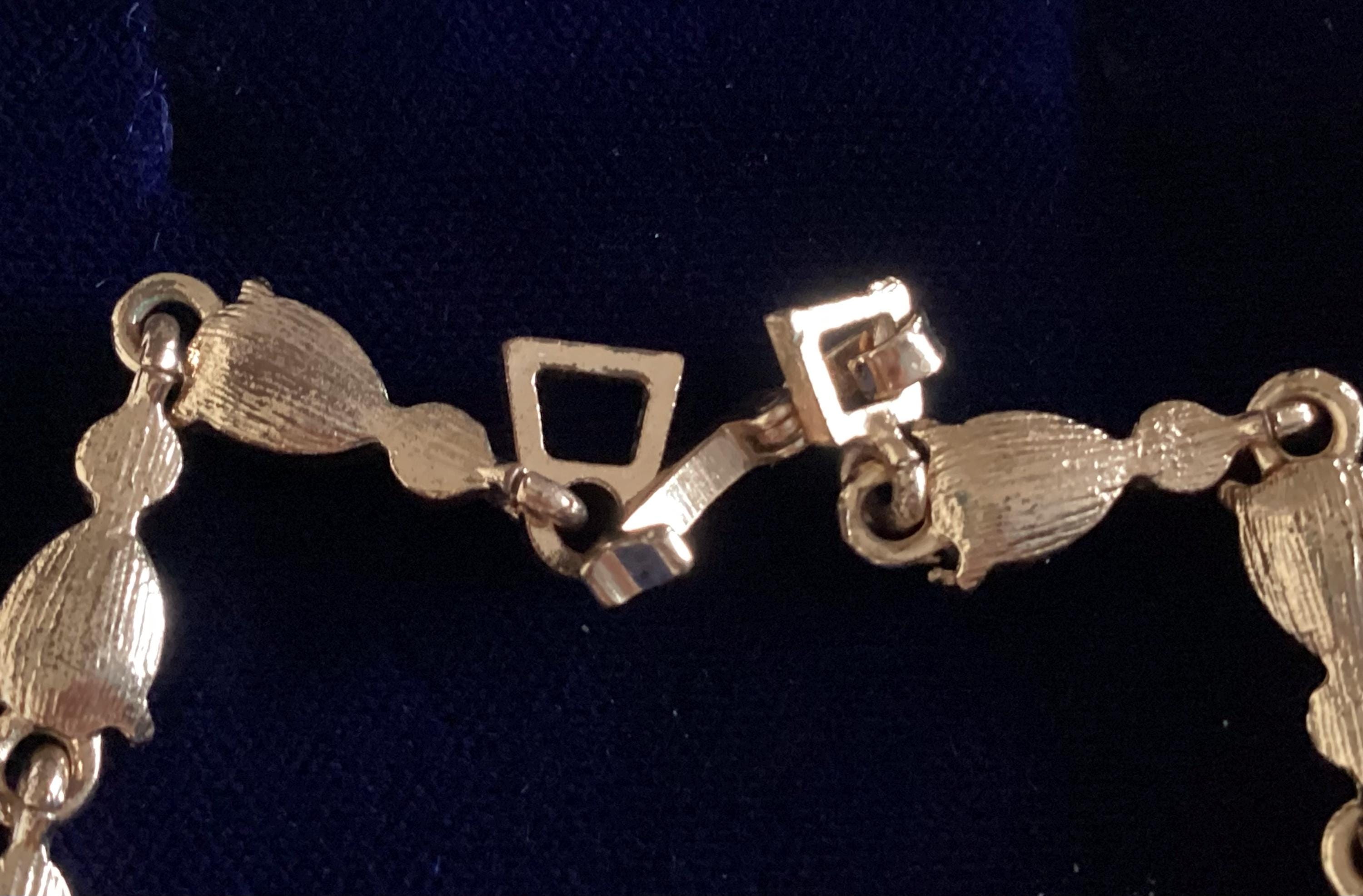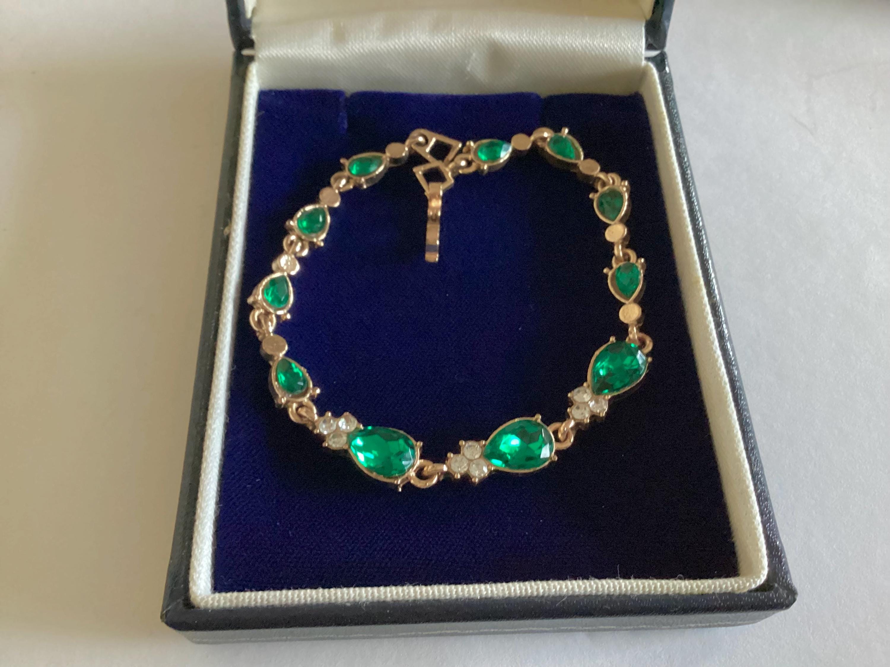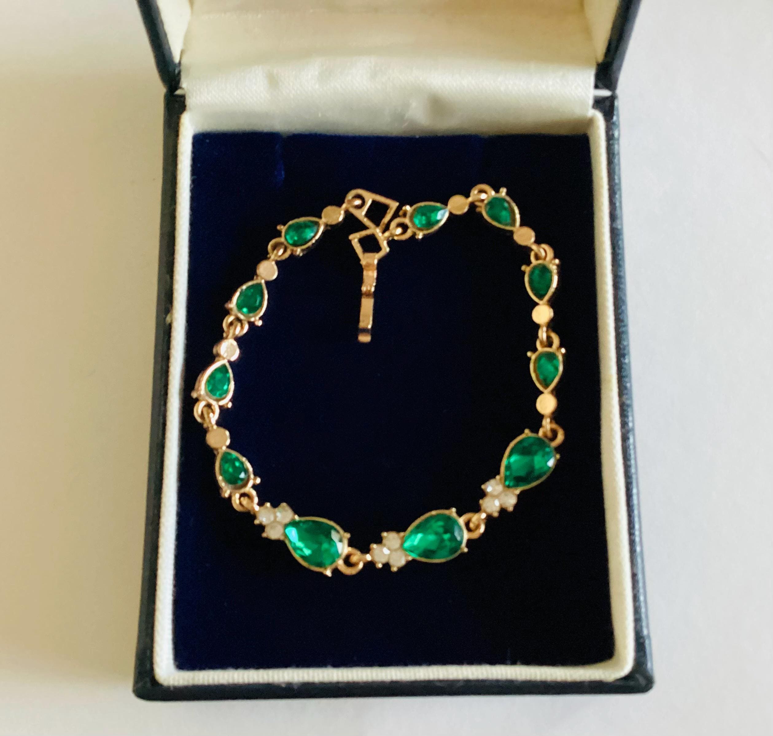 Vintage fancy tennis style bracelet. Lovely emerald green crystals and clear crystals set in gold plated chain. Great worn alone or make a statement by teaming up with a variety of other bracelets and bangles. May birthday/birthstone.