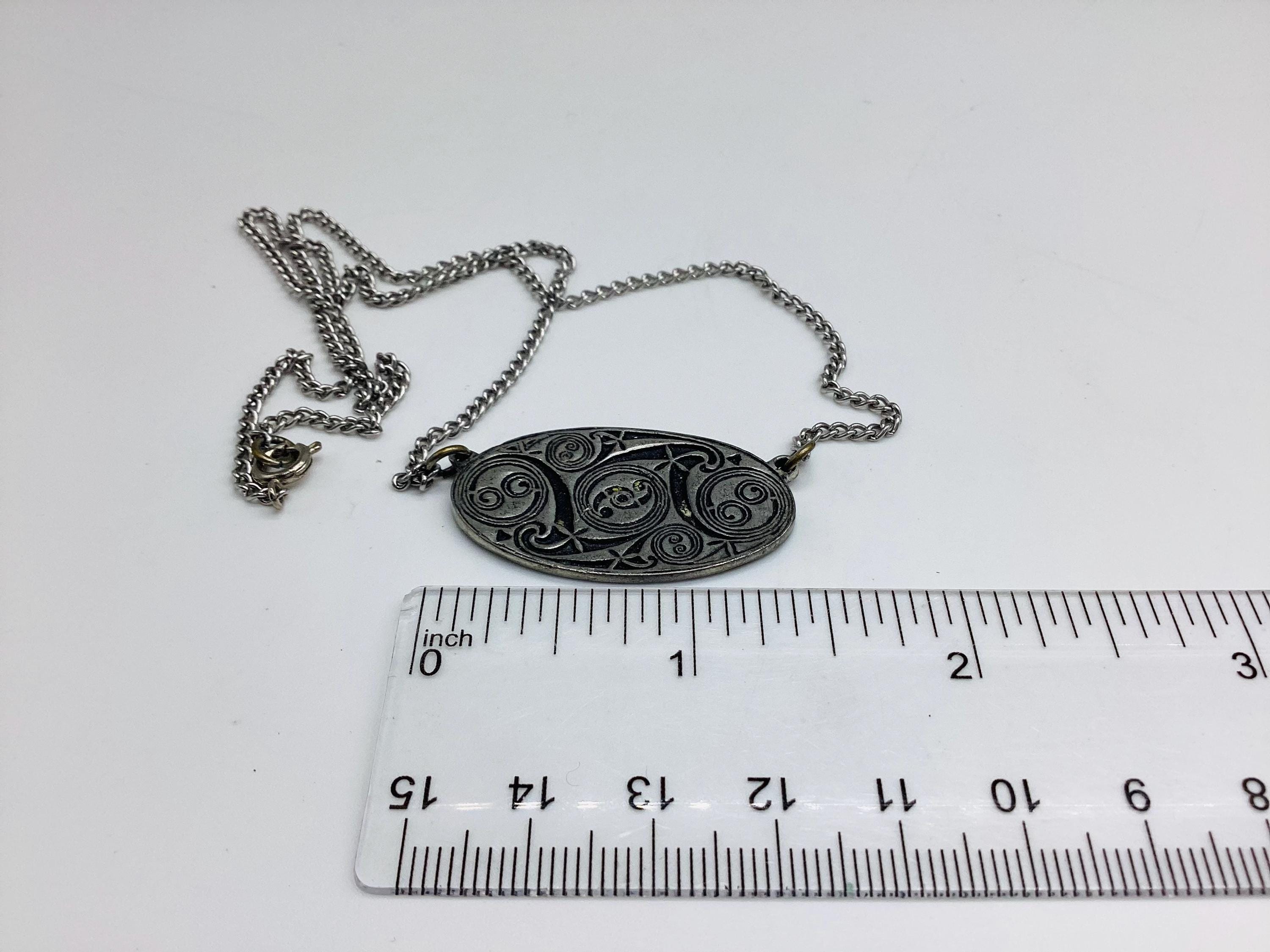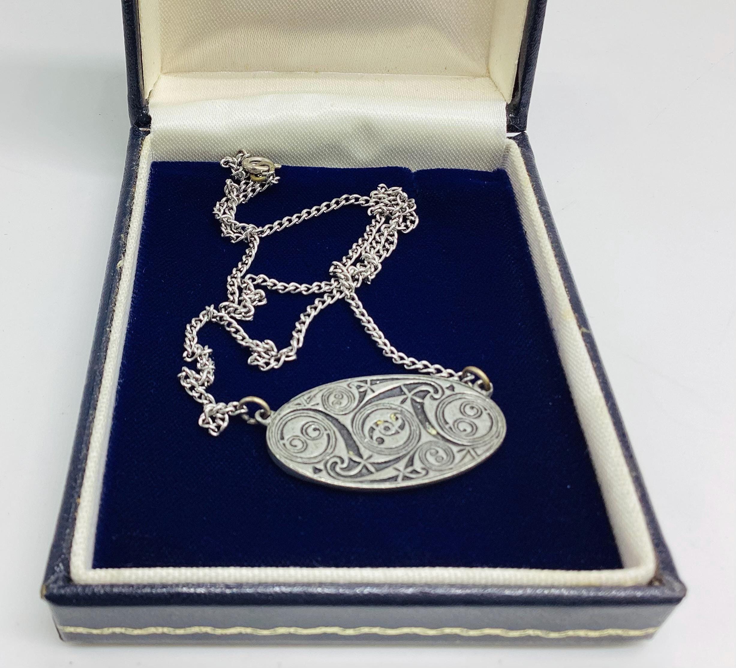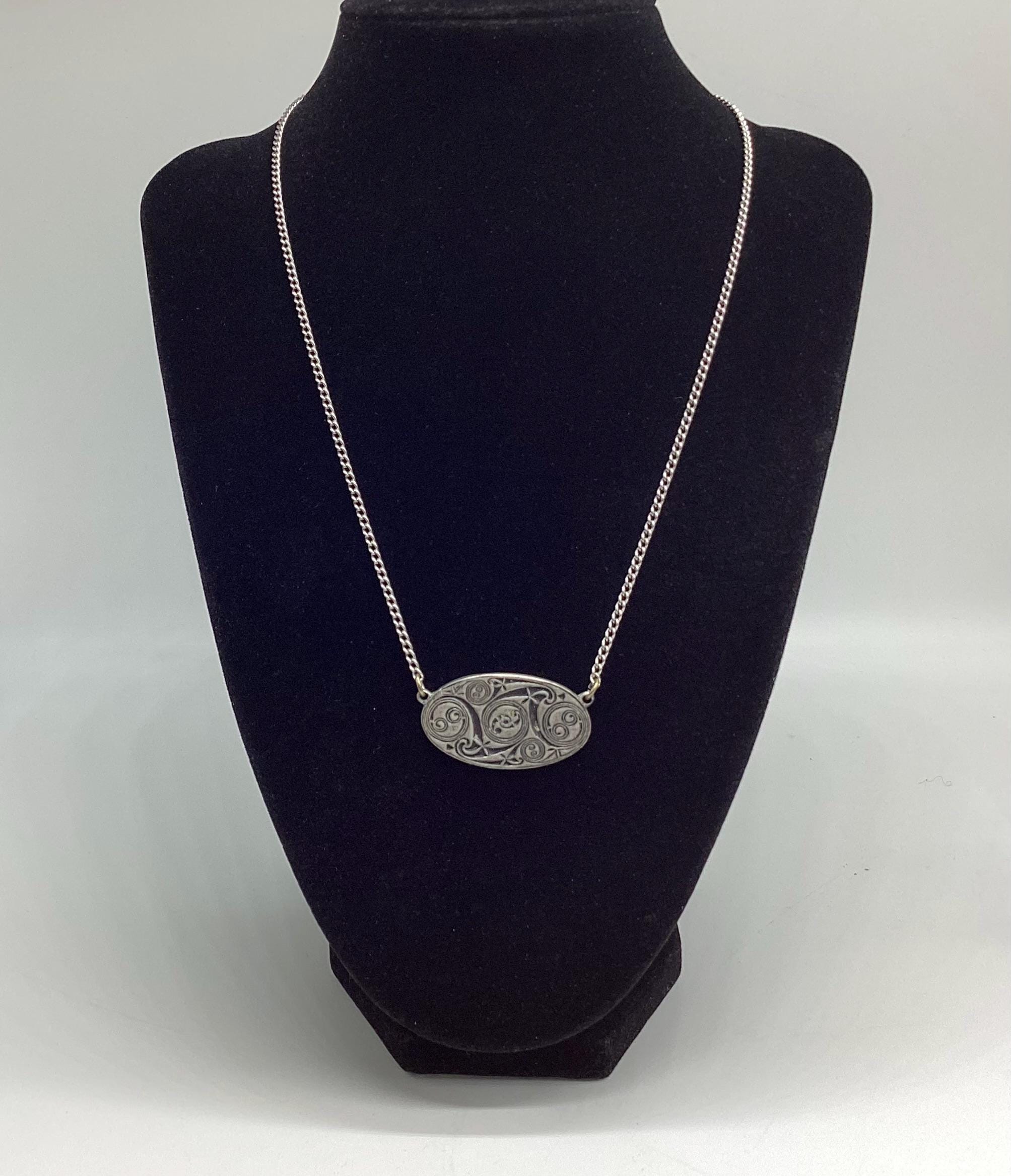 An unusual vintage Lavalier style necklace. Made in pewter by St Justin’s well known for beautiful ethnic jewellery. The plaque is decorated with Celtic style designs of cosmic swirls and signed on the reverse. A super piece of vintage jewellery