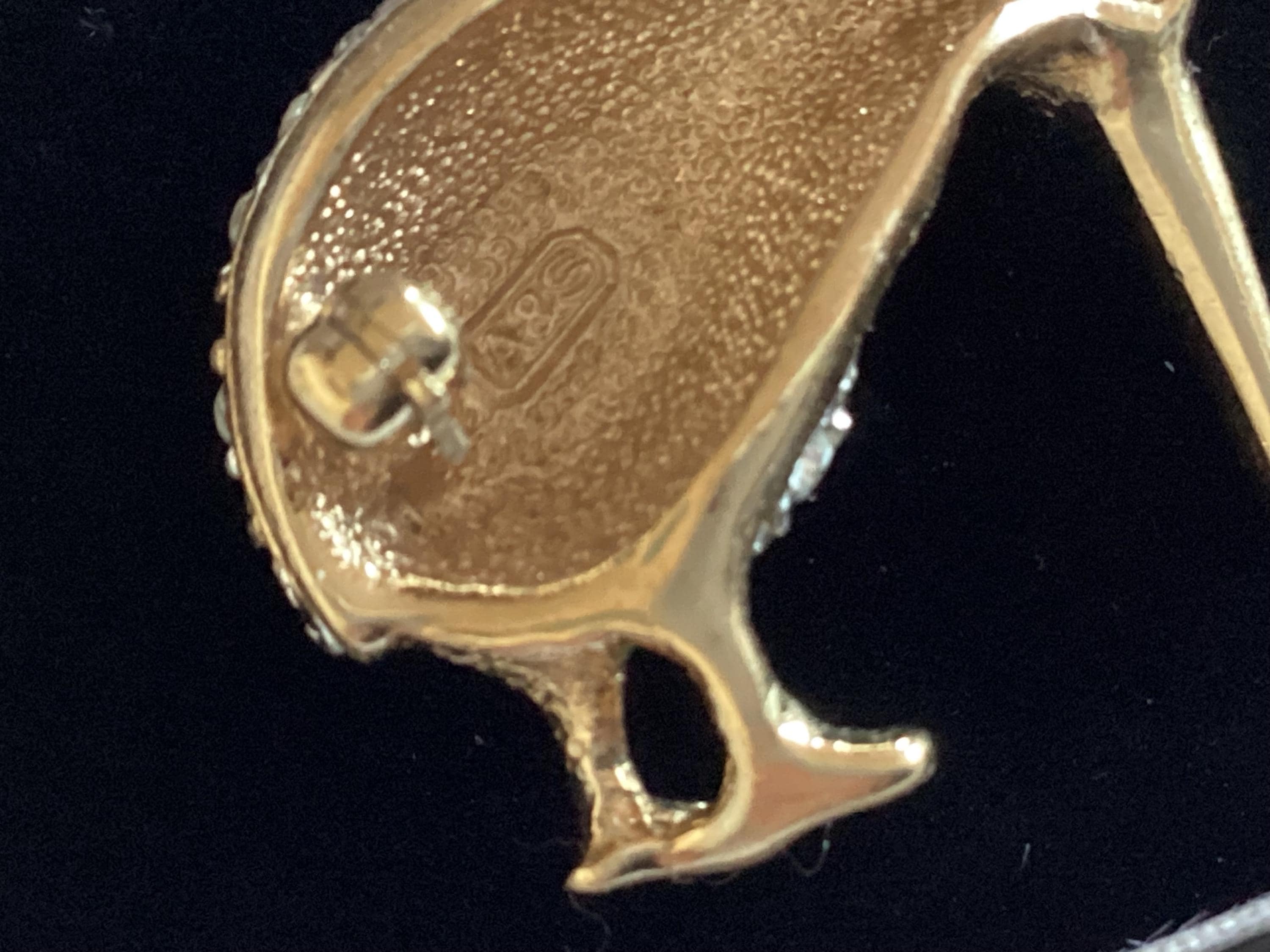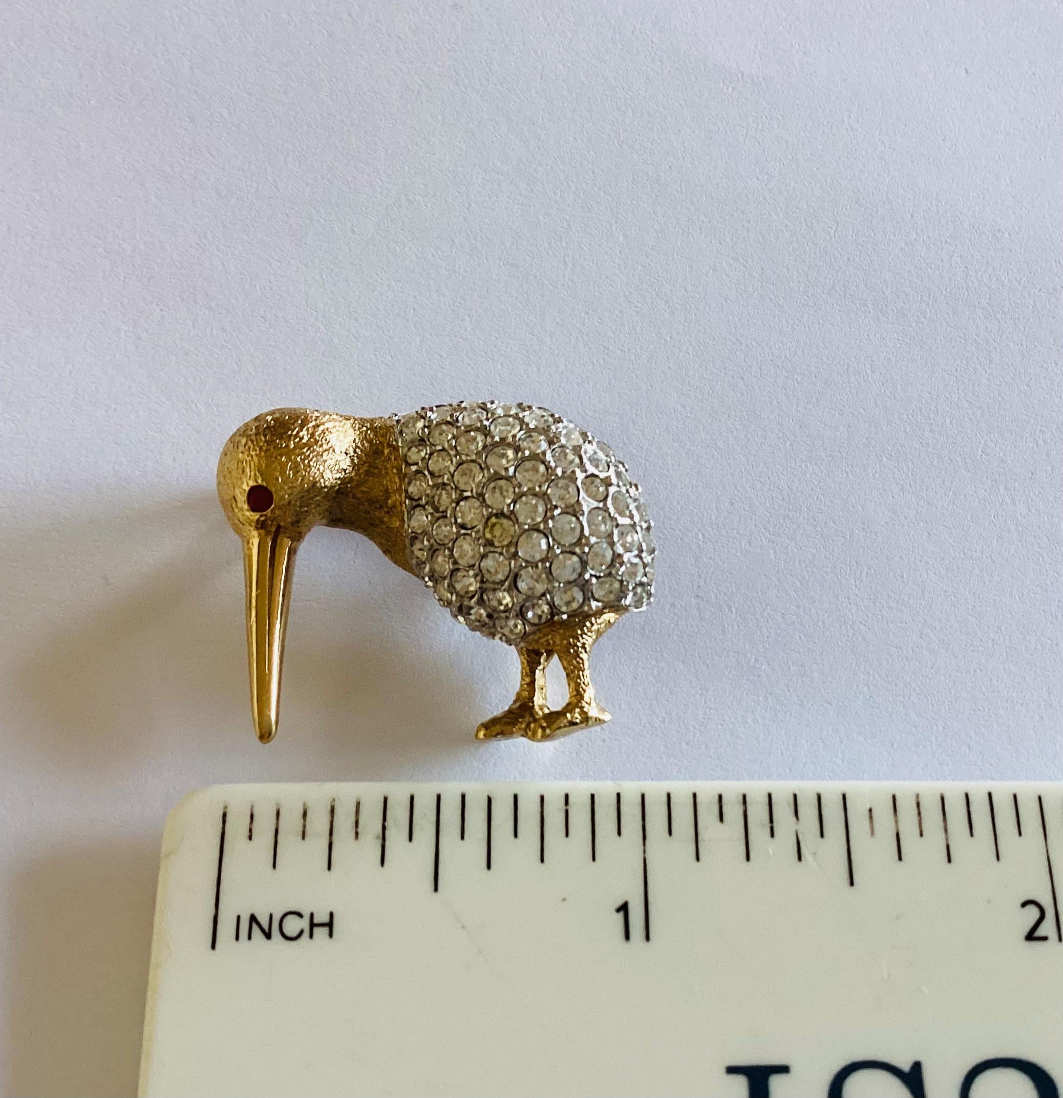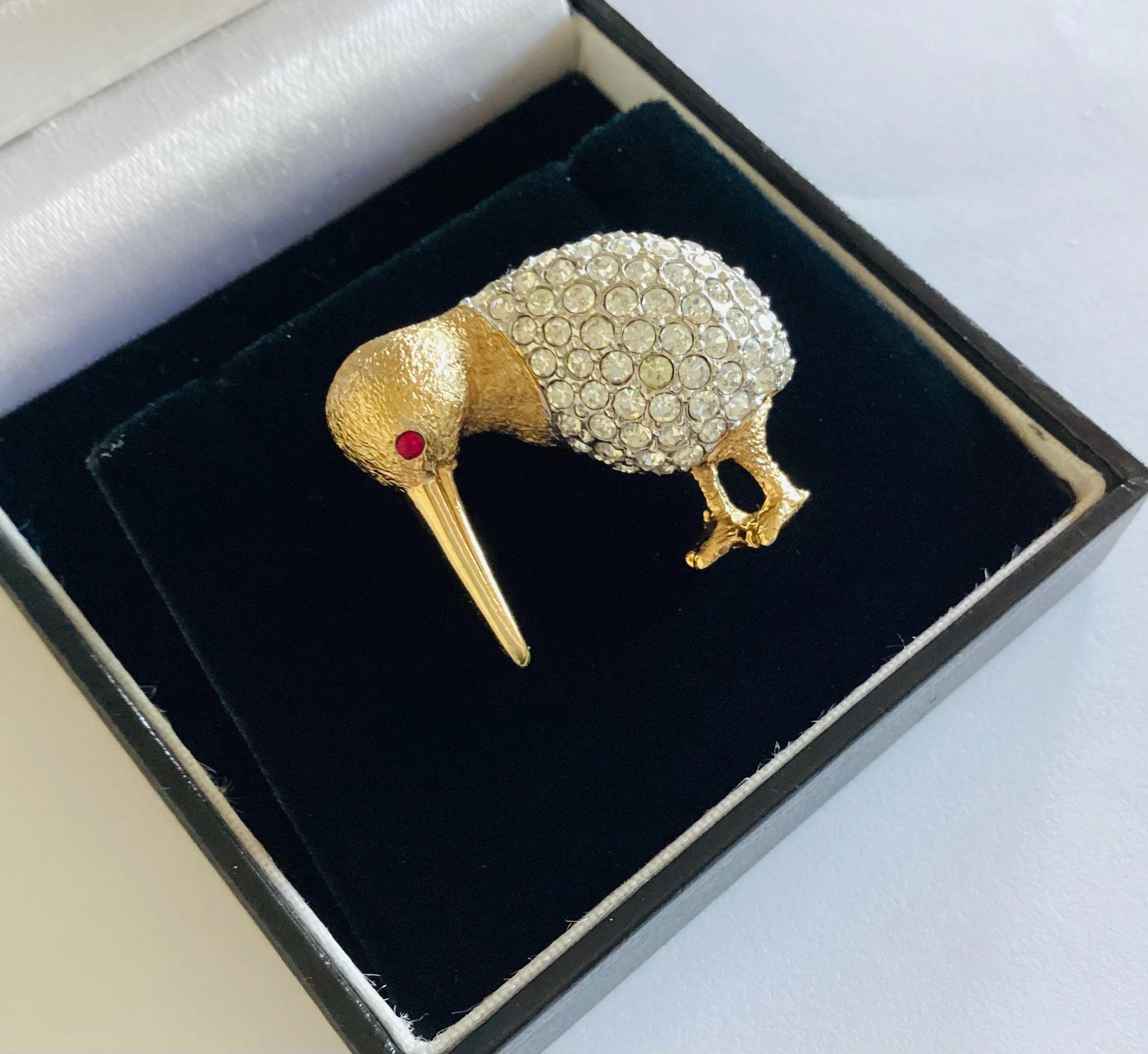 A delightful and dainty signed Attwood and Sawyer brooch. Rare kiwi, beautifully made. Signed A&S for Attwood and Sawyer. Founded in Wales in 1956 by Horace Atwood, Atwood and Sawyer produced copies of precious ornaments from the 18th to 19th centuries. Many pieces were made for the television series “Dallas” and “Dynasty”, as well as exclusive compositions for the beauty contest “Miss World”. The firm produced high-end imitation jewellery and sold their decorations at prestigious retail outlets across the UK, Europe and other countries around the world, as well as on cruise ships and Airliners.
