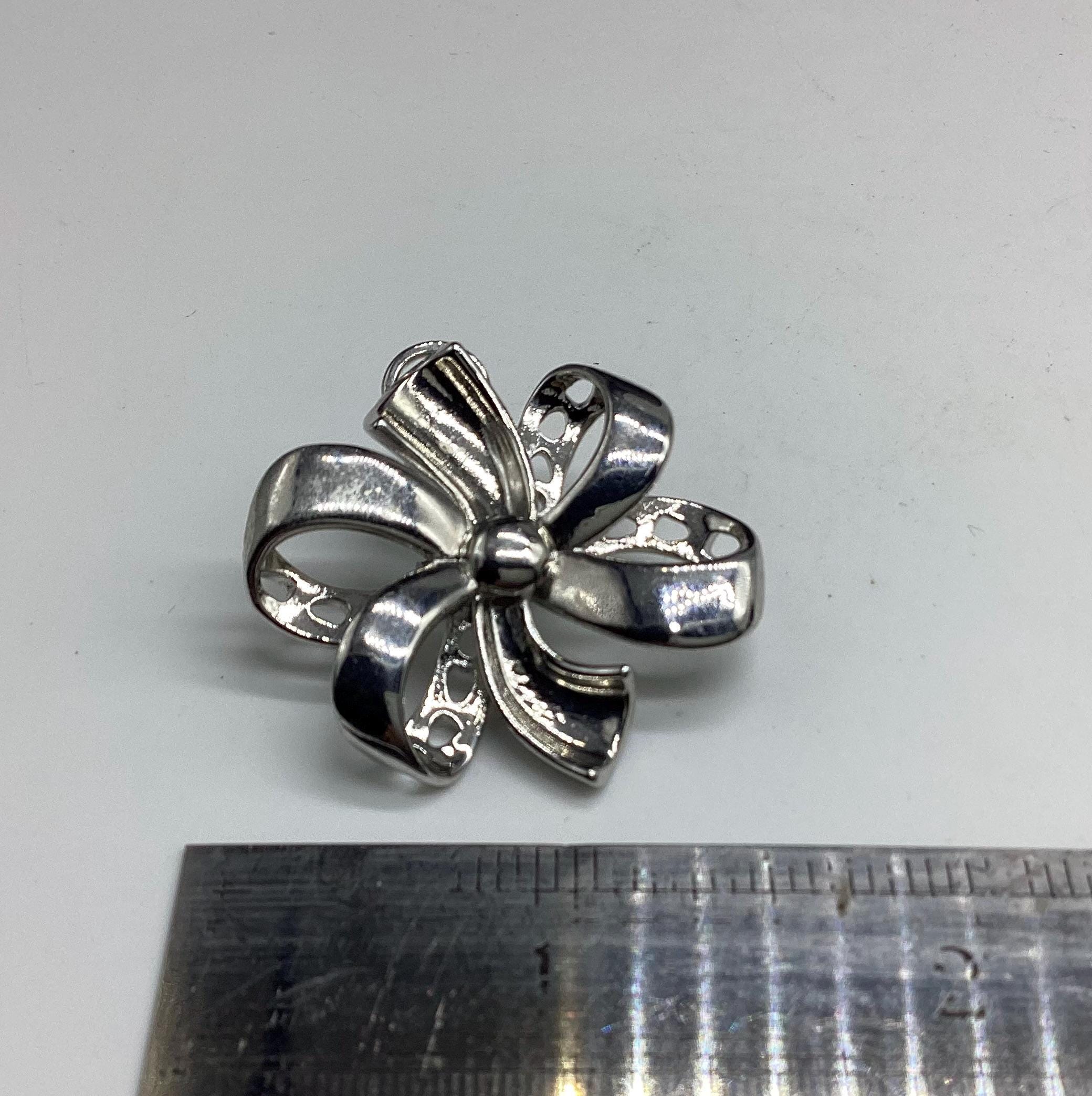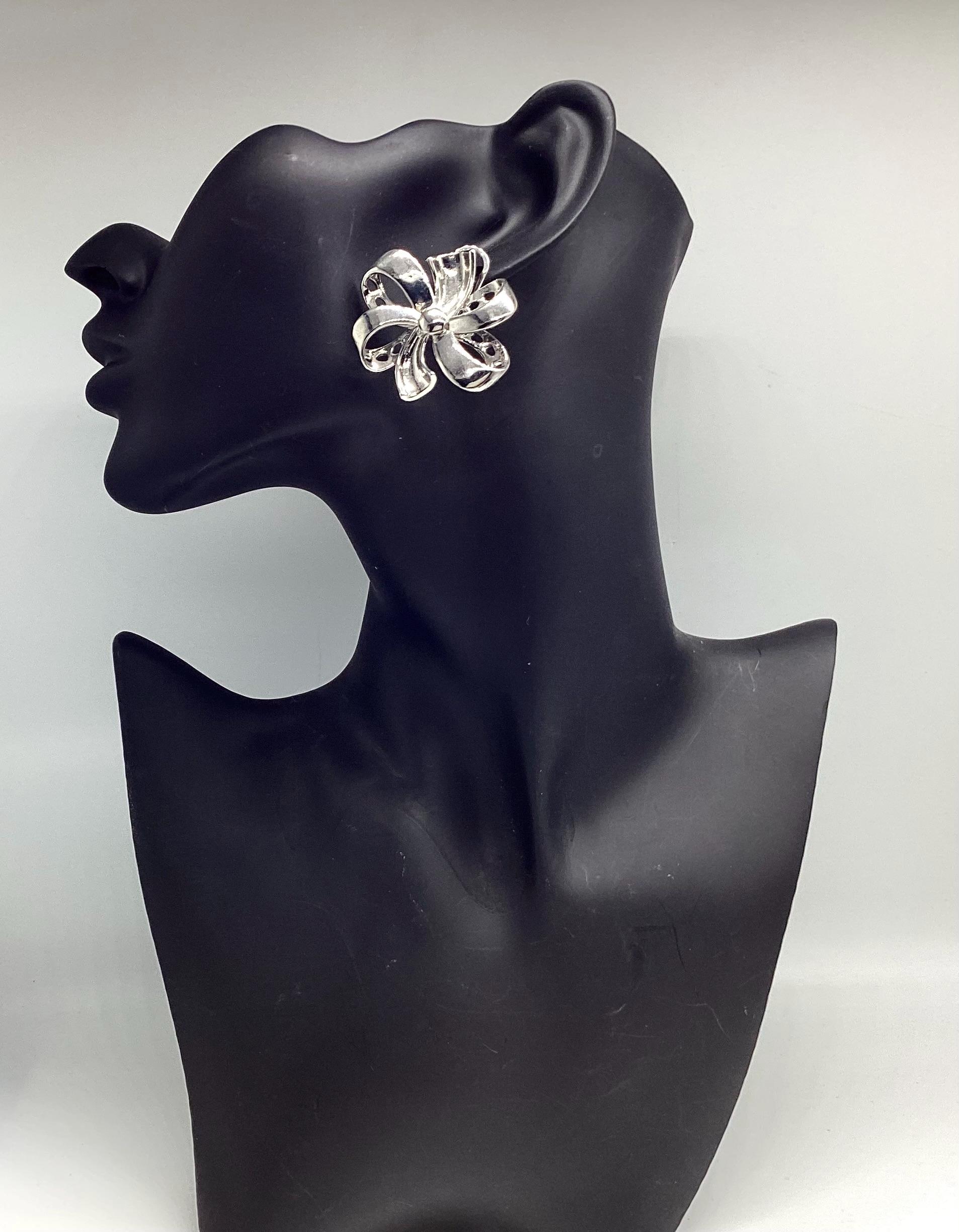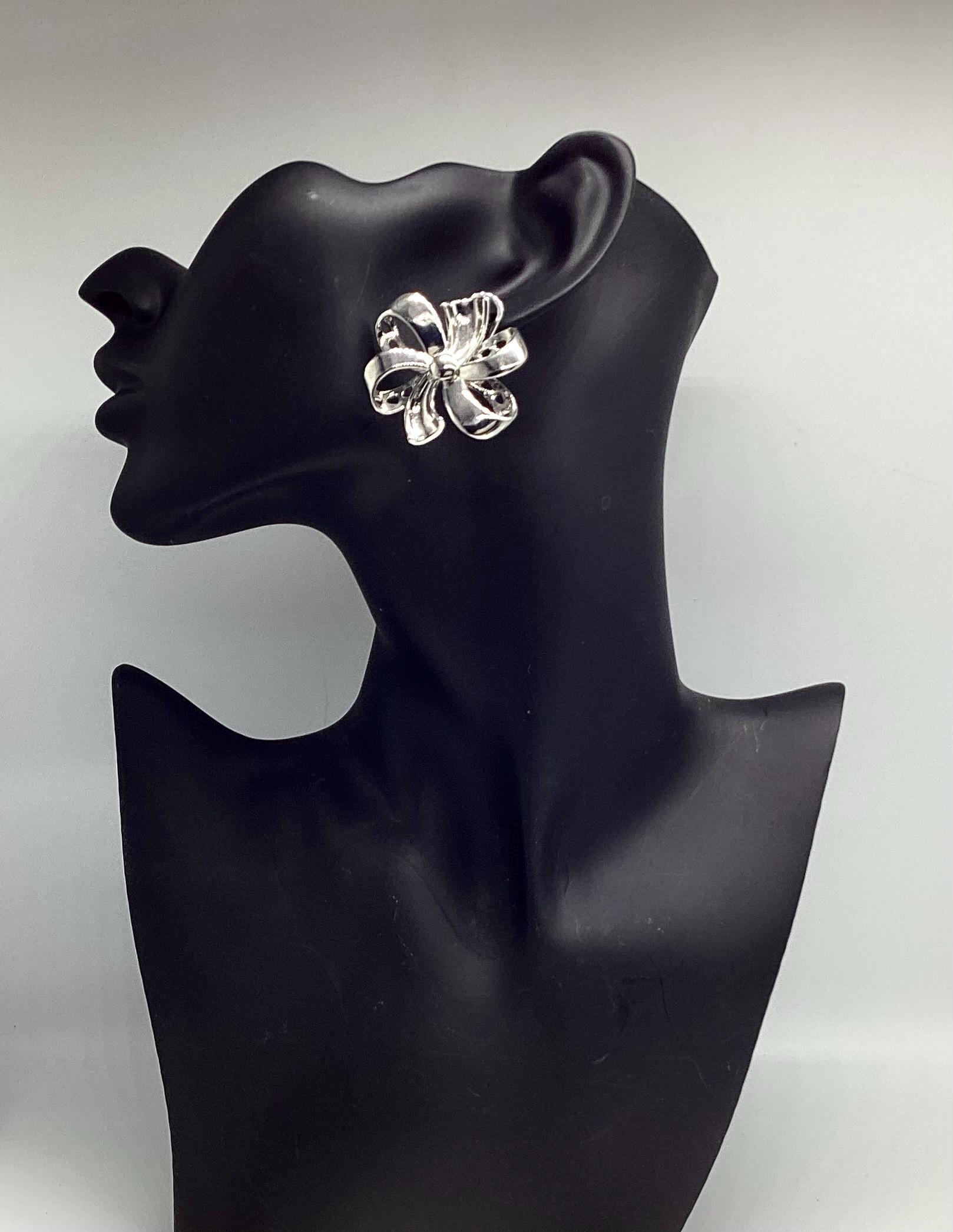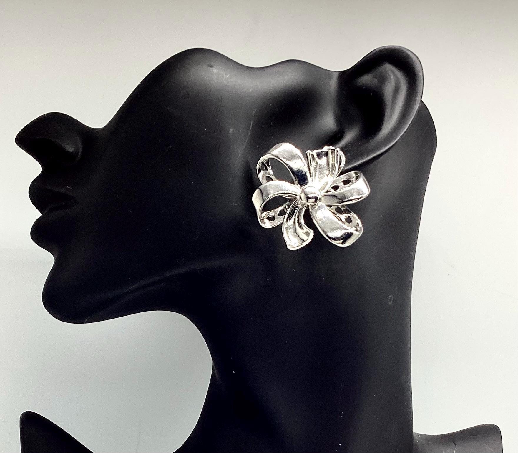 These Glamorous Huge Flower Bow Earrings by Sunnice are a retro vintage piece. The earrings feature a secure lock back closure and are rhodium plated. The intricate flower design in silver tones adds a touch of sophistication and elegance