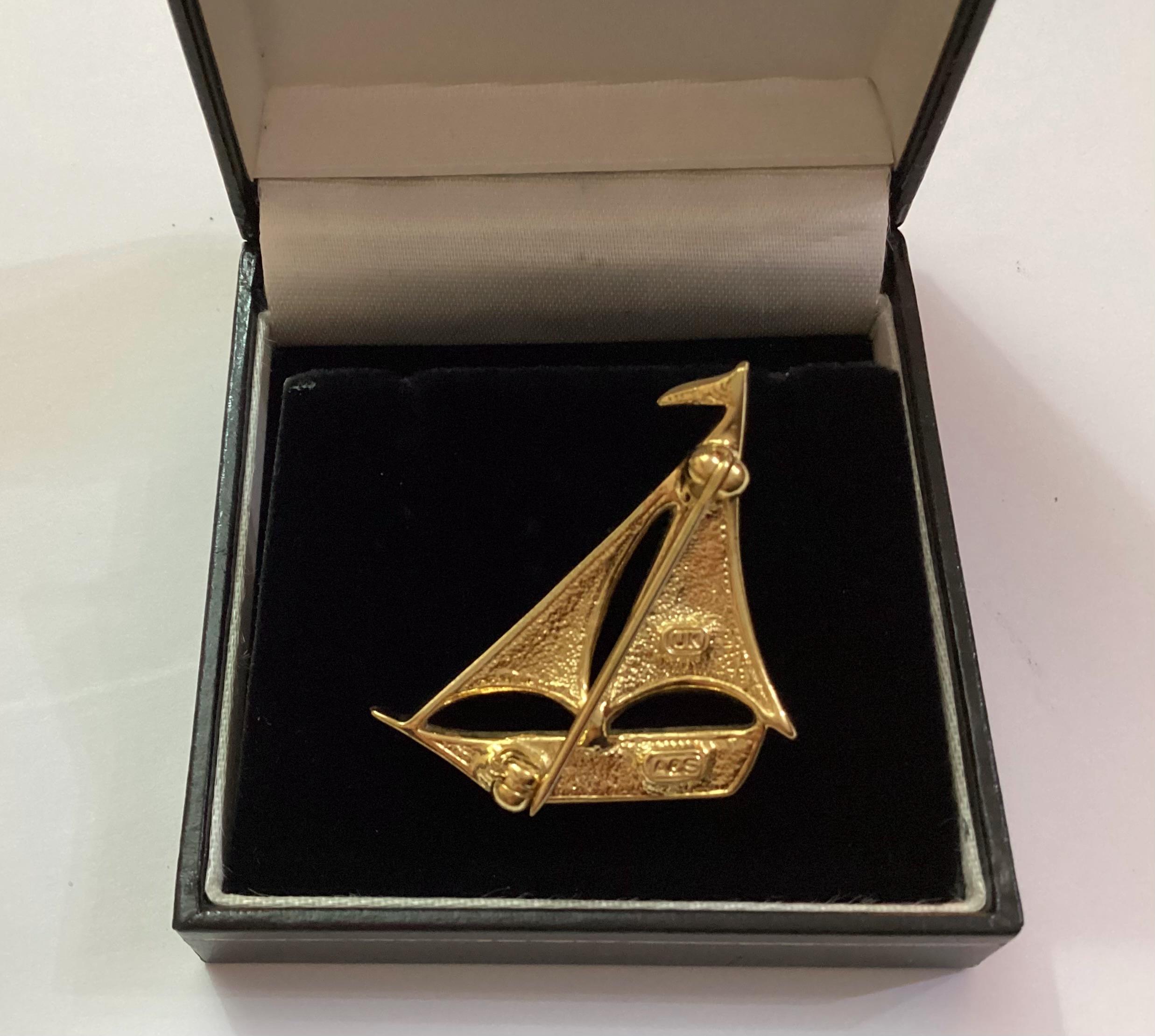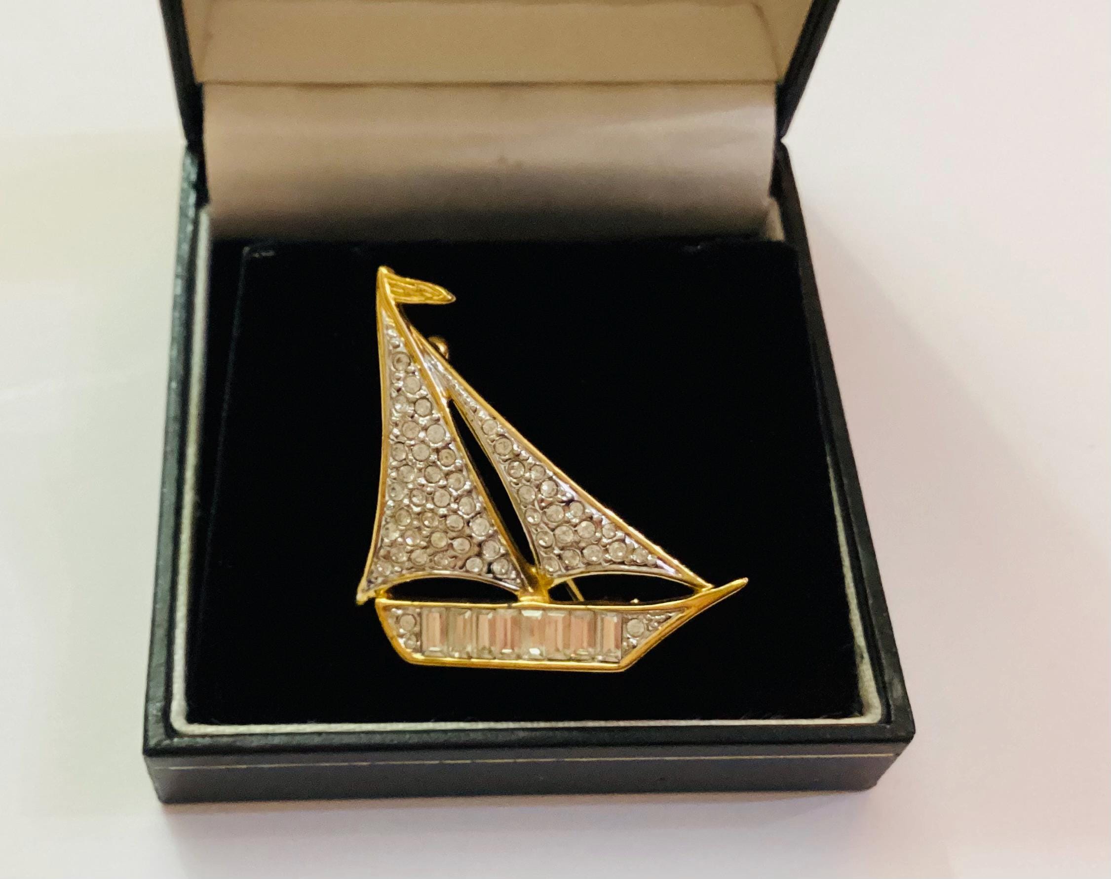 Sail away with this delightful signed Attwood and Sawyer brooch. In excellent condition with all stones in place and of superb quality. I have a particular love for this maker, well known for the superb quality and attention to detail. Founded in Wales in 1956 by Horace Atwood, Atwood and Sawyer produced copies of precious ornaments from the 18th to 19th centuries. Many pieces were made for the television series “Dallas” and “Dynasty”, as well as exclusive compositions for the beauty contest “Miss World”. The firm produced high-end imitation jewellery and sold their decorations at prestigious retail outlets across the UK, Europe and other countries around the world, as well as on cruise ships and Airliners. A special recognition was given to their historical collection of exact copies of the jewellery of the Duchess of Windsor.