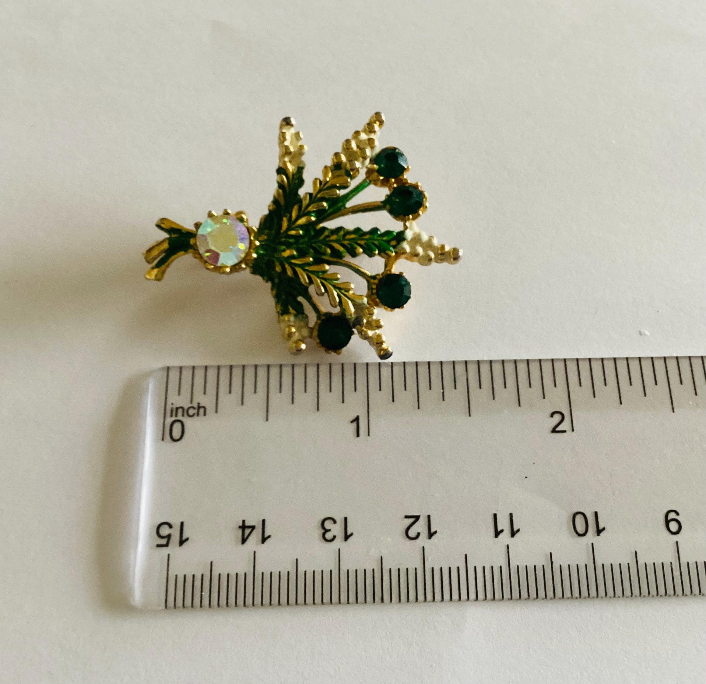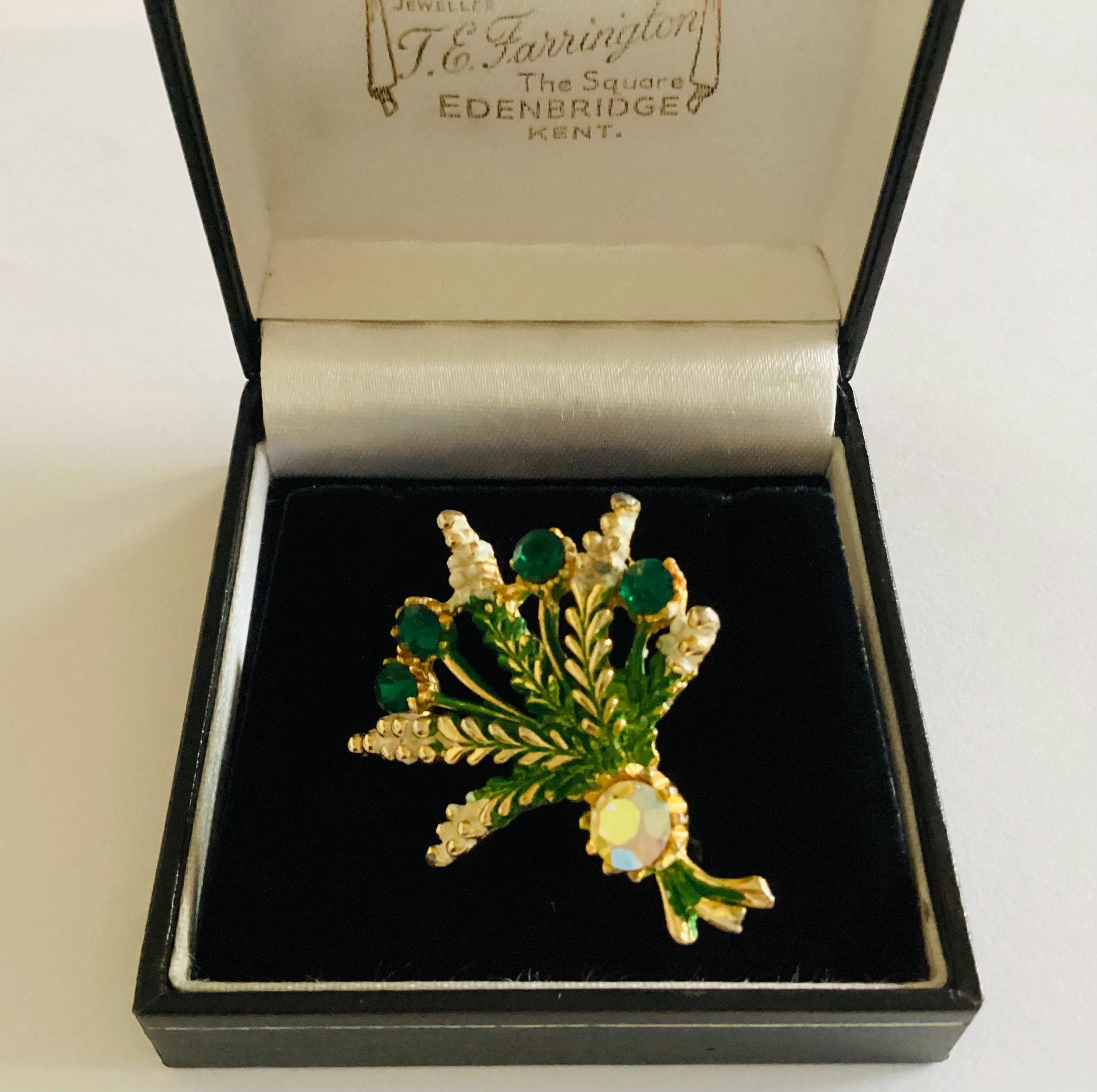 A very pretty and colourful brooch. Gold plated and set with faux emeralds. I have several of these vintage pieces on sale at the moment. They are beautiful when worn and make delightful gifts as they are becoming more and more collectable.