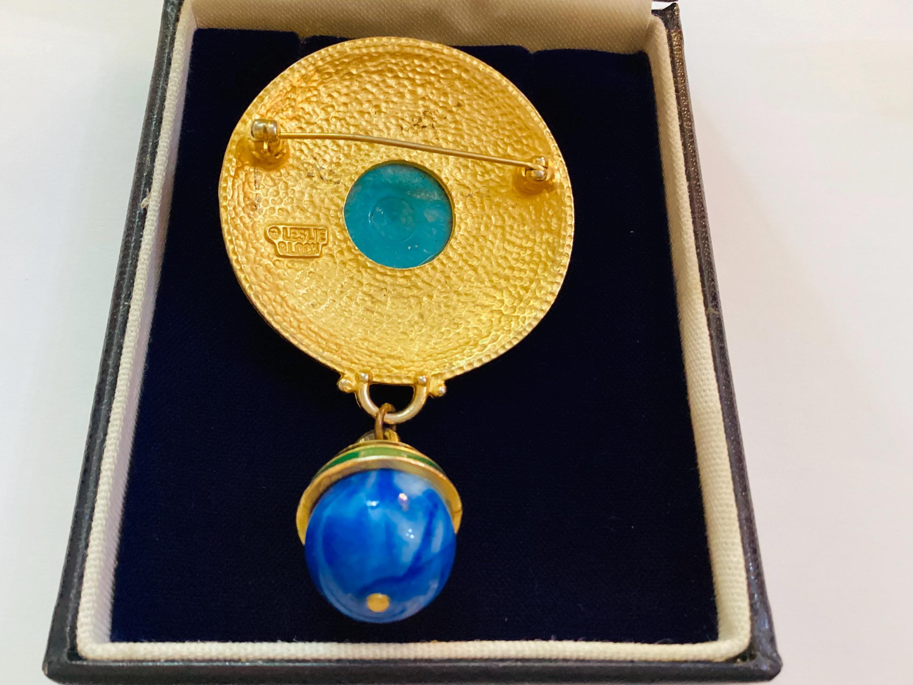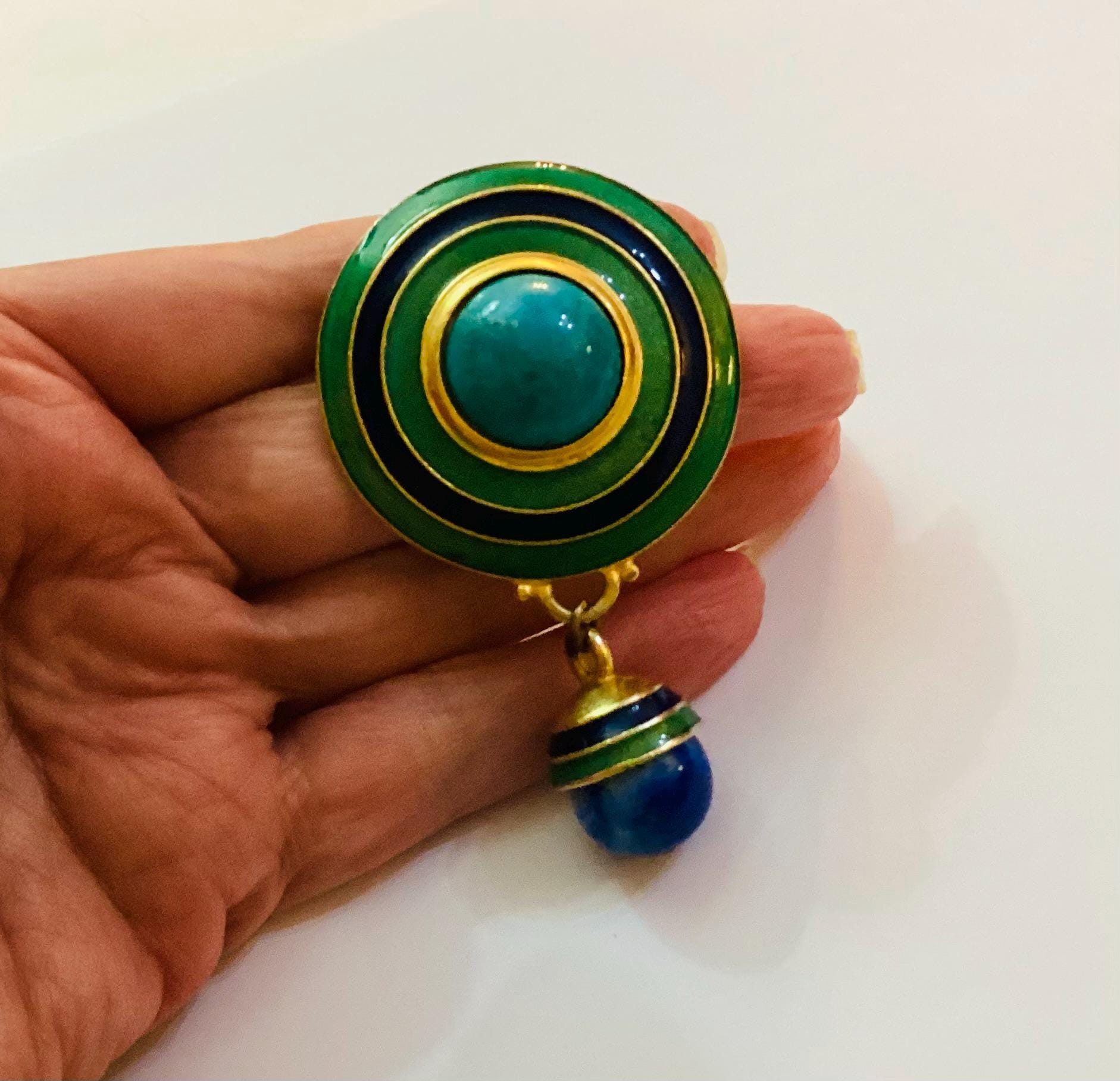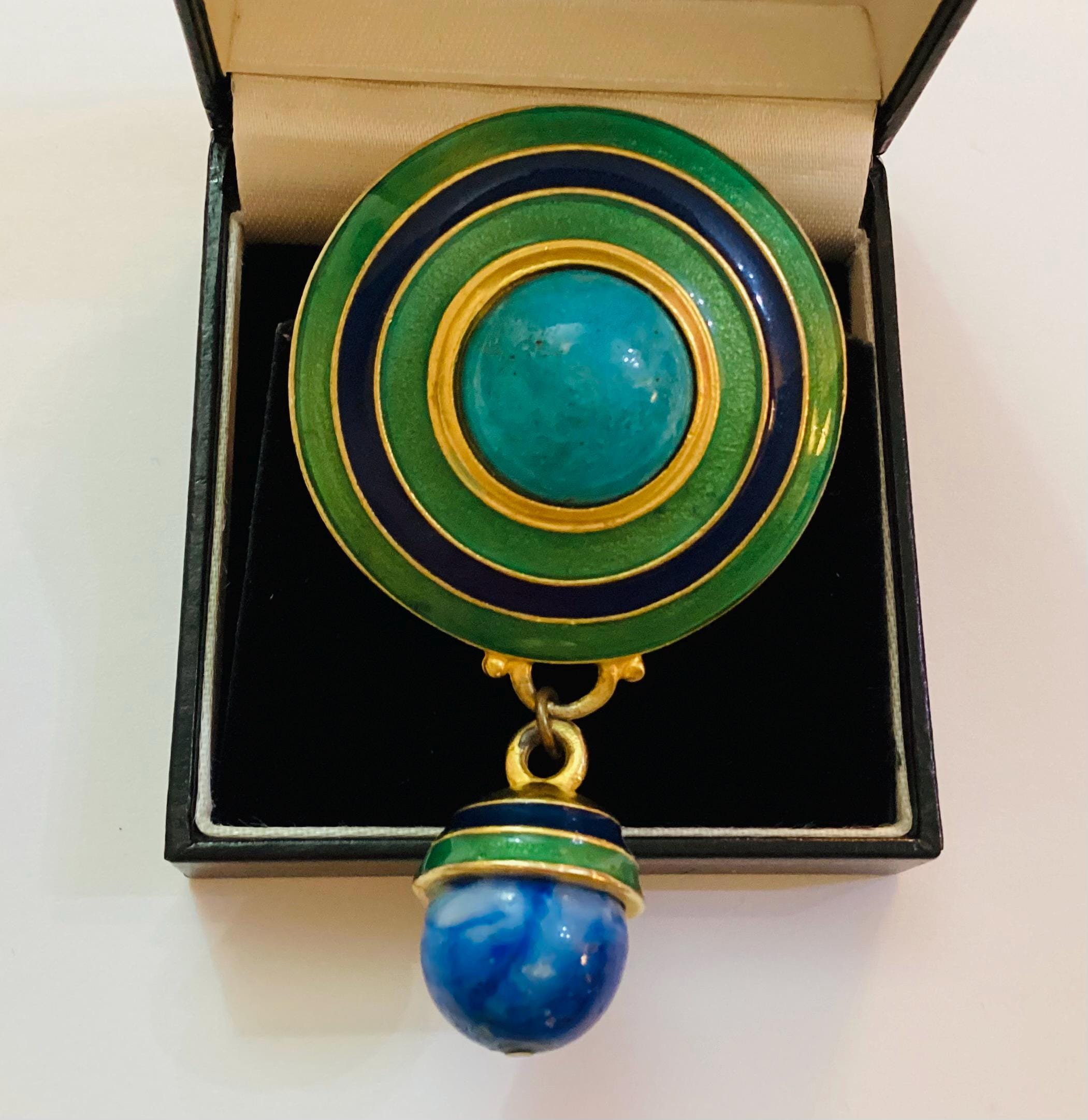 Striking vintage statement brooch by designer Leslie Block, a bold circular gold-tone disc decorated with concentric rings of rich green and deep blue enamel. The centre is set with a turquoise-coloured cabochon, complemented by a dramatic articulated drop finished with a marbled blue ceramic or glass bead and enamel-banded cap. This sculptural, architectural design is characteristic of Leslie Block’s work and reflects the bold aesthetic of late-20th-century designer costume jewellery. Perfect for lovers of bold vintage costume jewellery, art jewellery collectors, or anyone drawn to 1980s-inspired statement accessories. Works beautifully on a coat lapel, scarf, or dress.