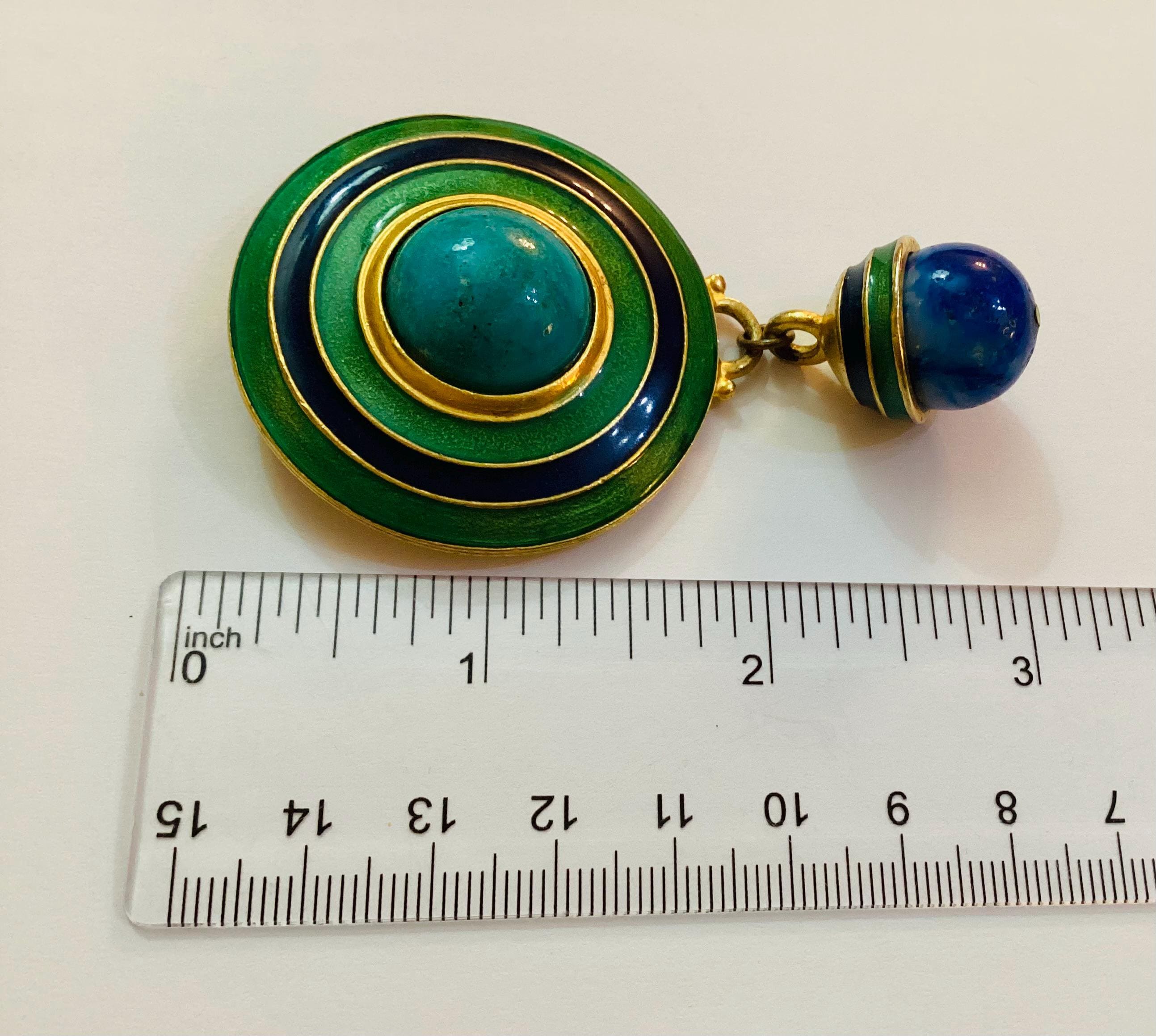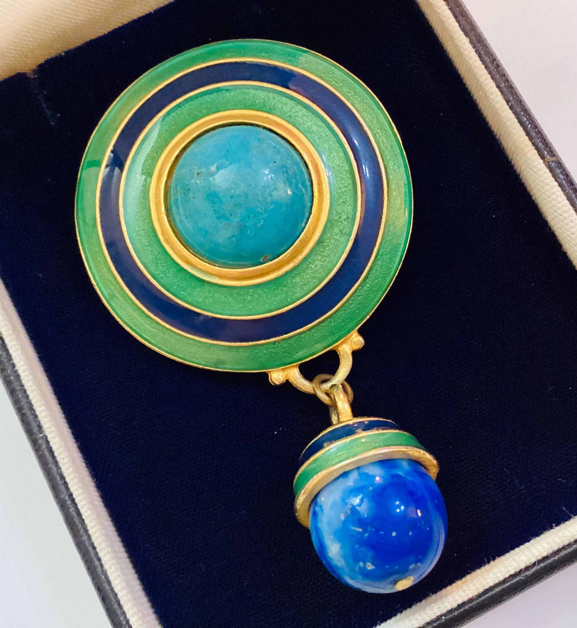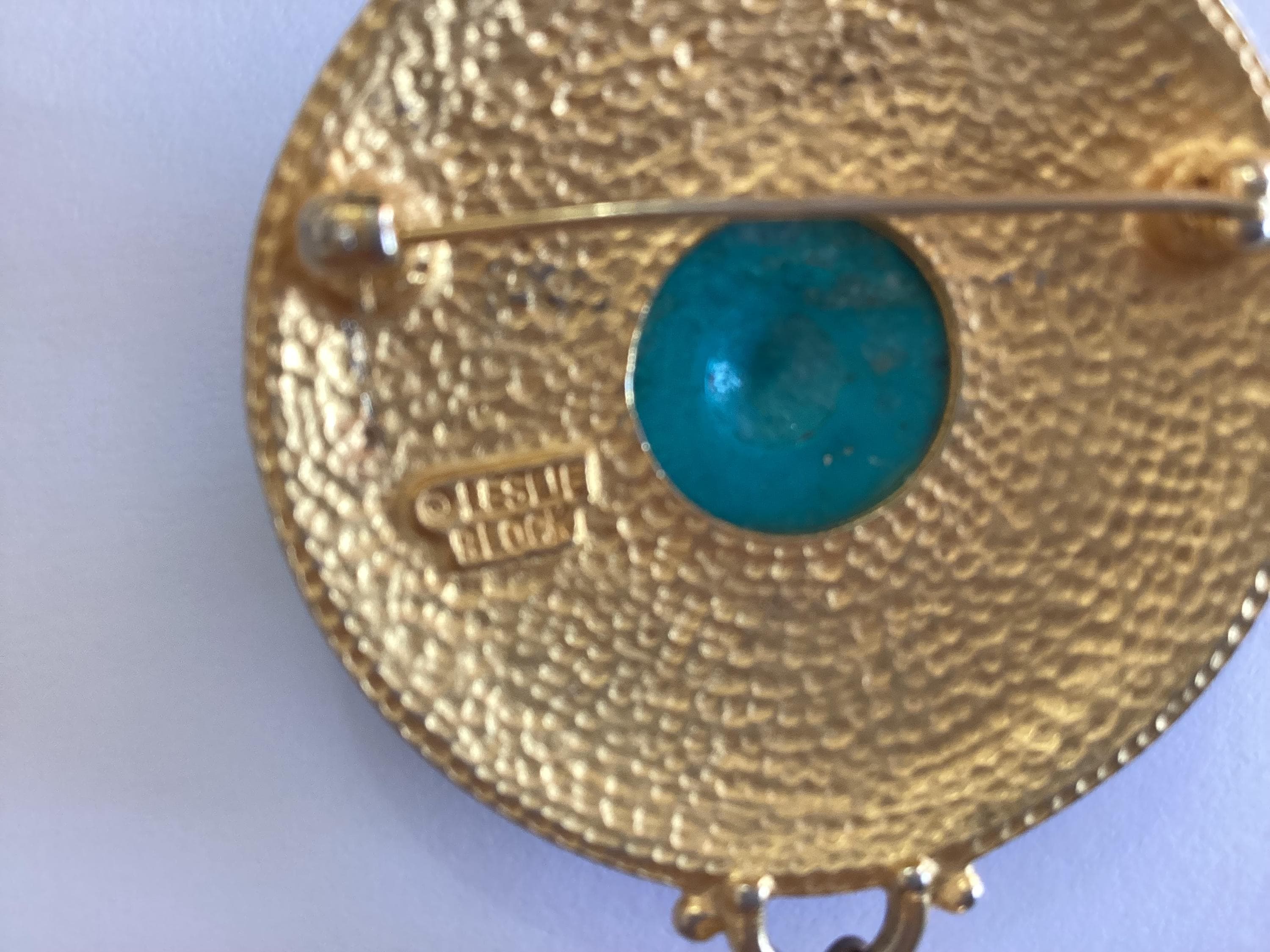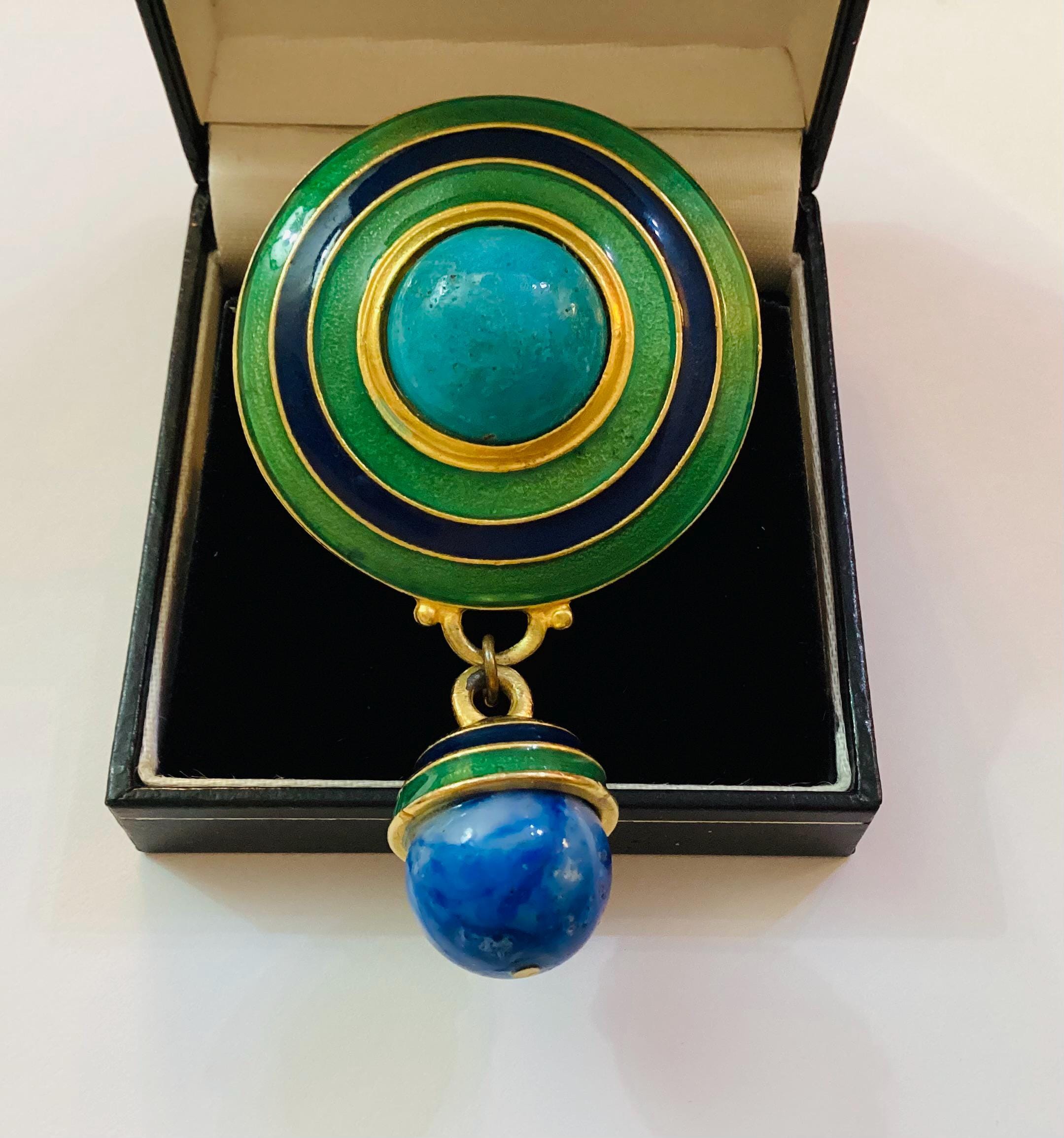 Striking vintage statement brooch by designer Leslie Block, a bold circular gold-tone disc decorated with concentric rings of rich green and deep blue enamel. The centre is set with a turquoise-coloured cabochon, complemented by a dramatic articulated drop finished with a marbled blue ceramic or glass bead and enamel-banded cap. This sculptural, architectural design is characteristic of Leslie Block’s work and reflects the bold aesthetic of late-20th-century designer costume jewellery. Perfect for lovers of bold vintage costume jewellery, art jewellery collectors, or anyone drawn to 1980s-inspired statement accessories. Works beautifully on a coat lapel, scarf, or dress.