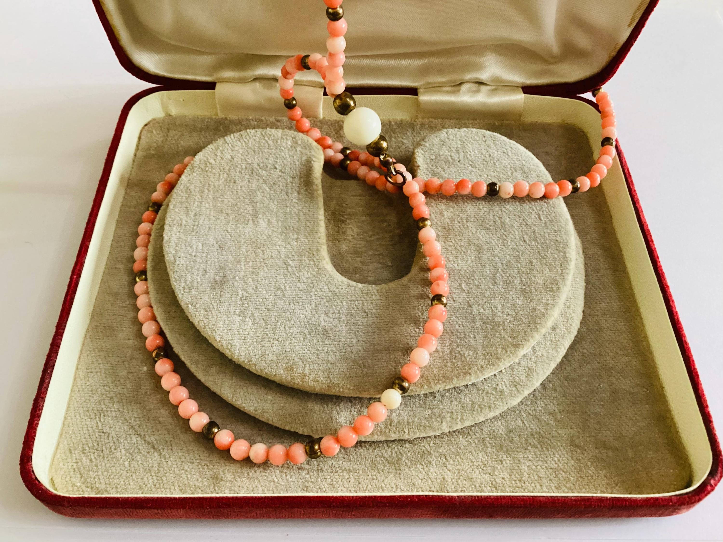 Stunning coral rope necklace interspersed with bronze beads and a white coral ball pendant. Unusual opera length 32 inches, a rare piece of fabulous vintage jewellery. Super worn alone or with a variety of beads and chains.