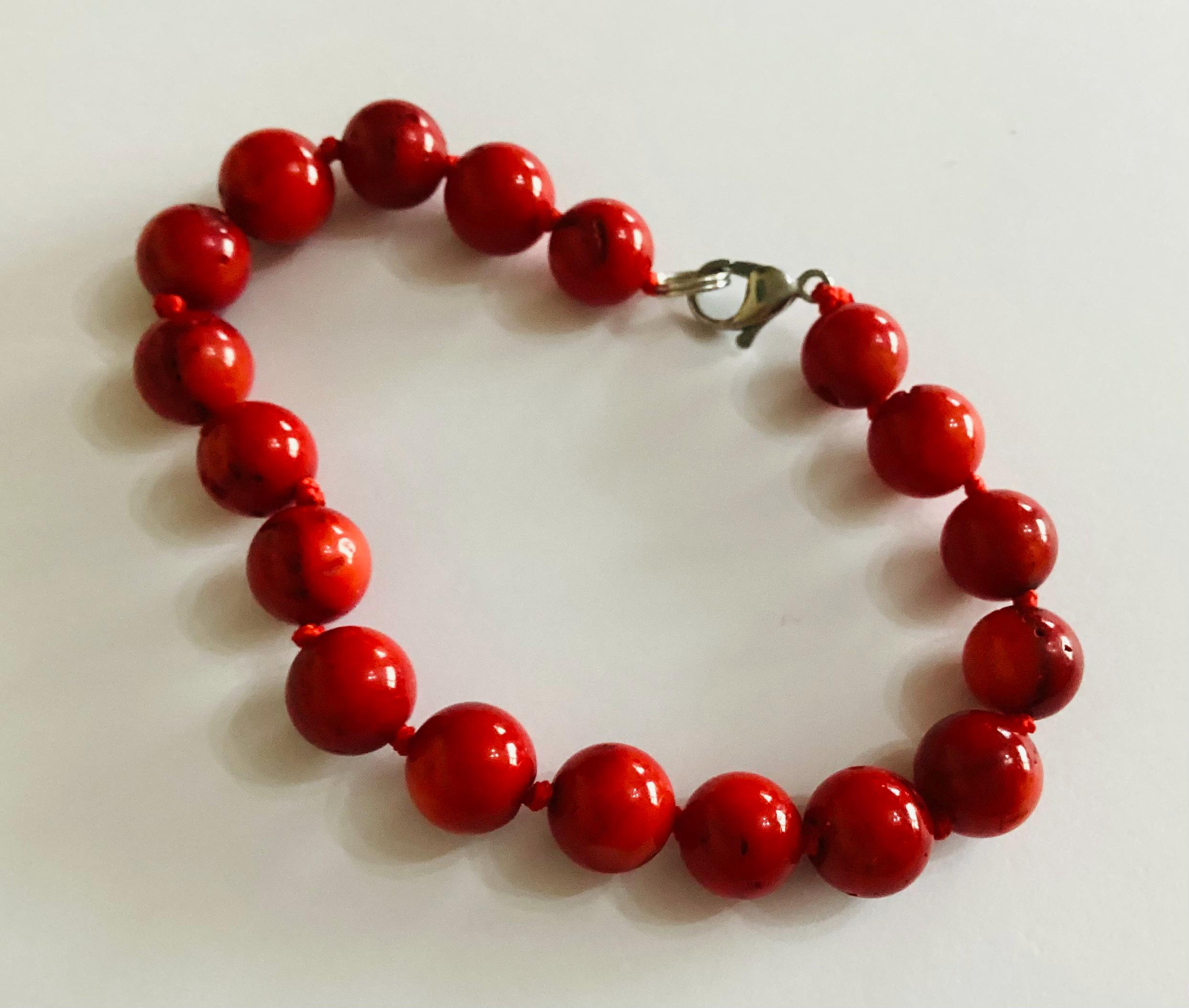A super lipstick red natural coral bracelet. Nice quality strung on hand knotted silk. Fabulous worn alone or with other chains and bracelets, looks good with any outfit.