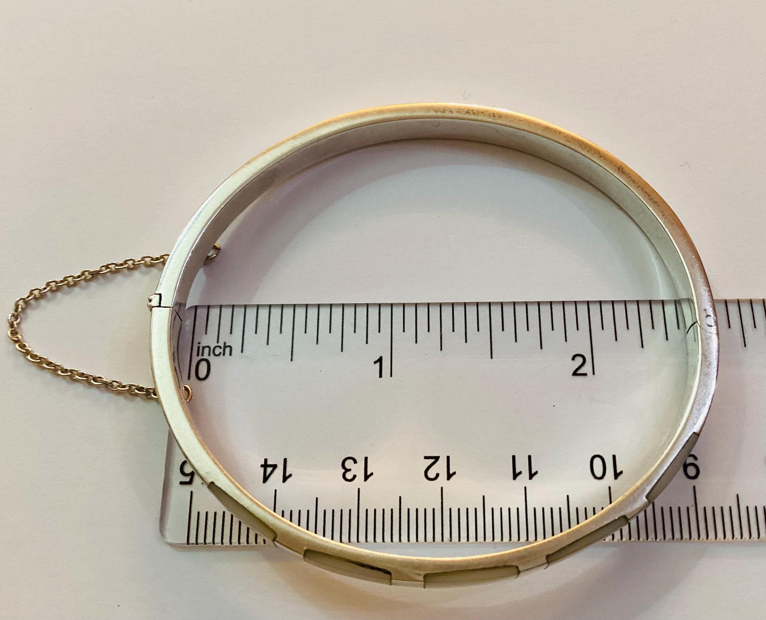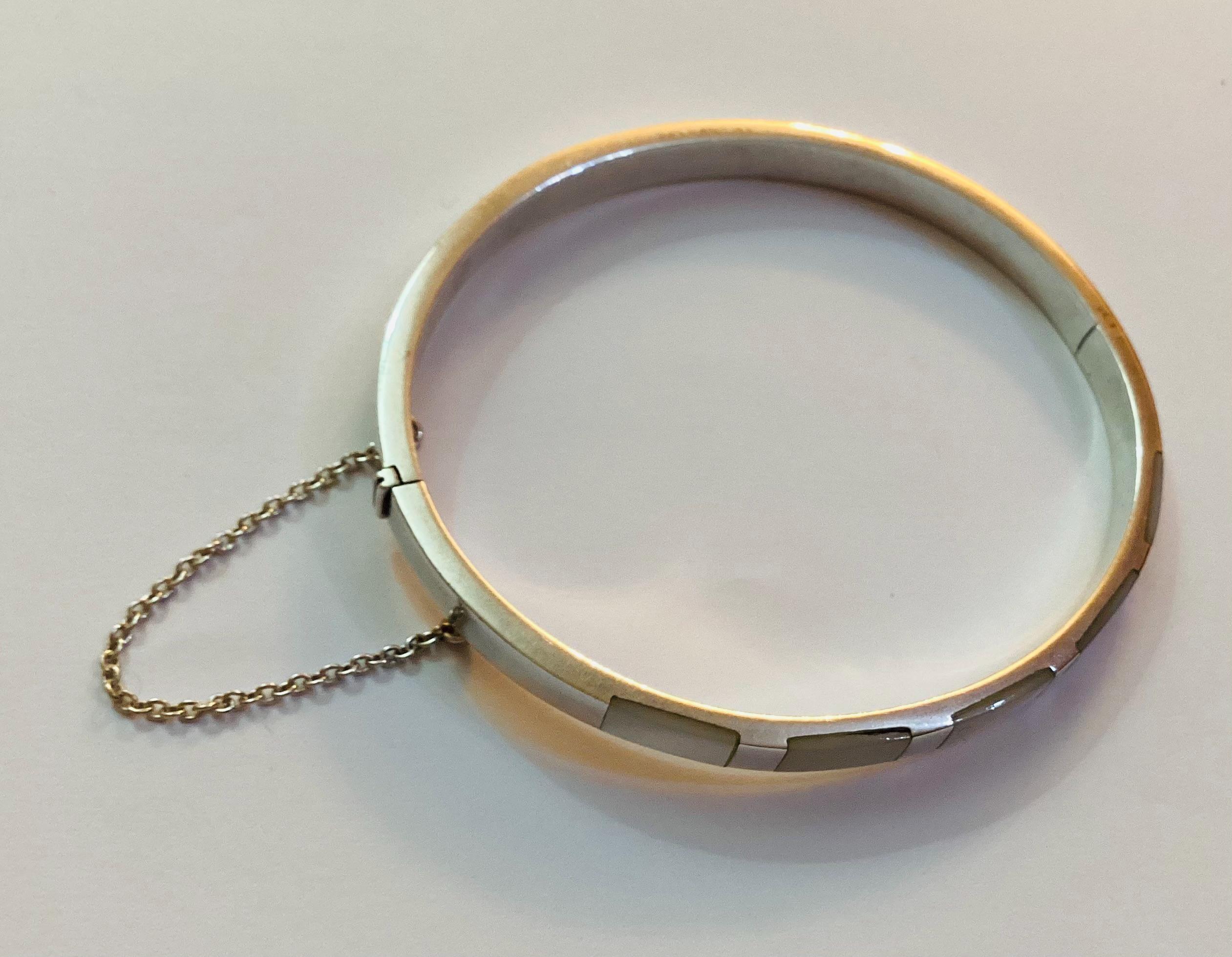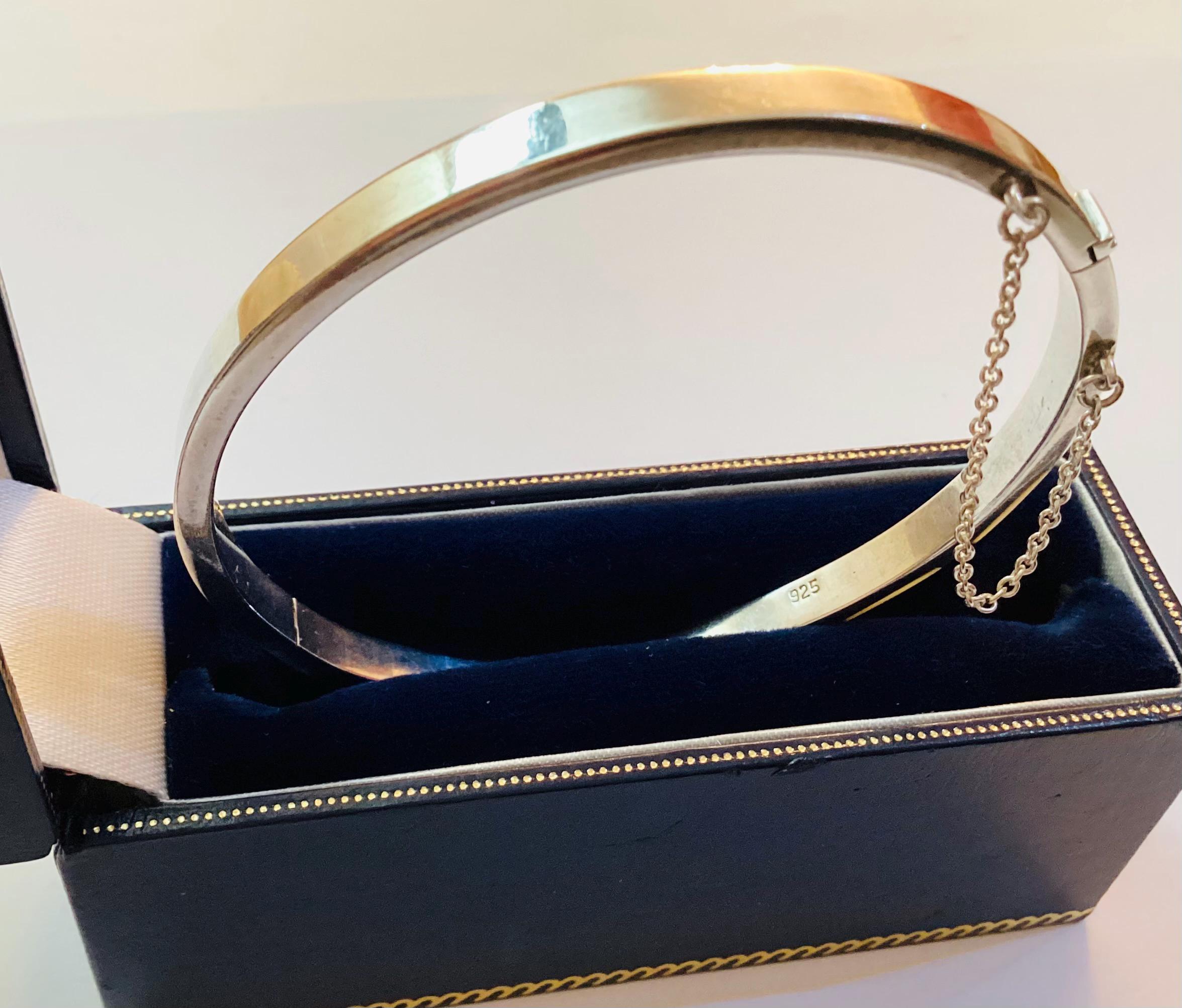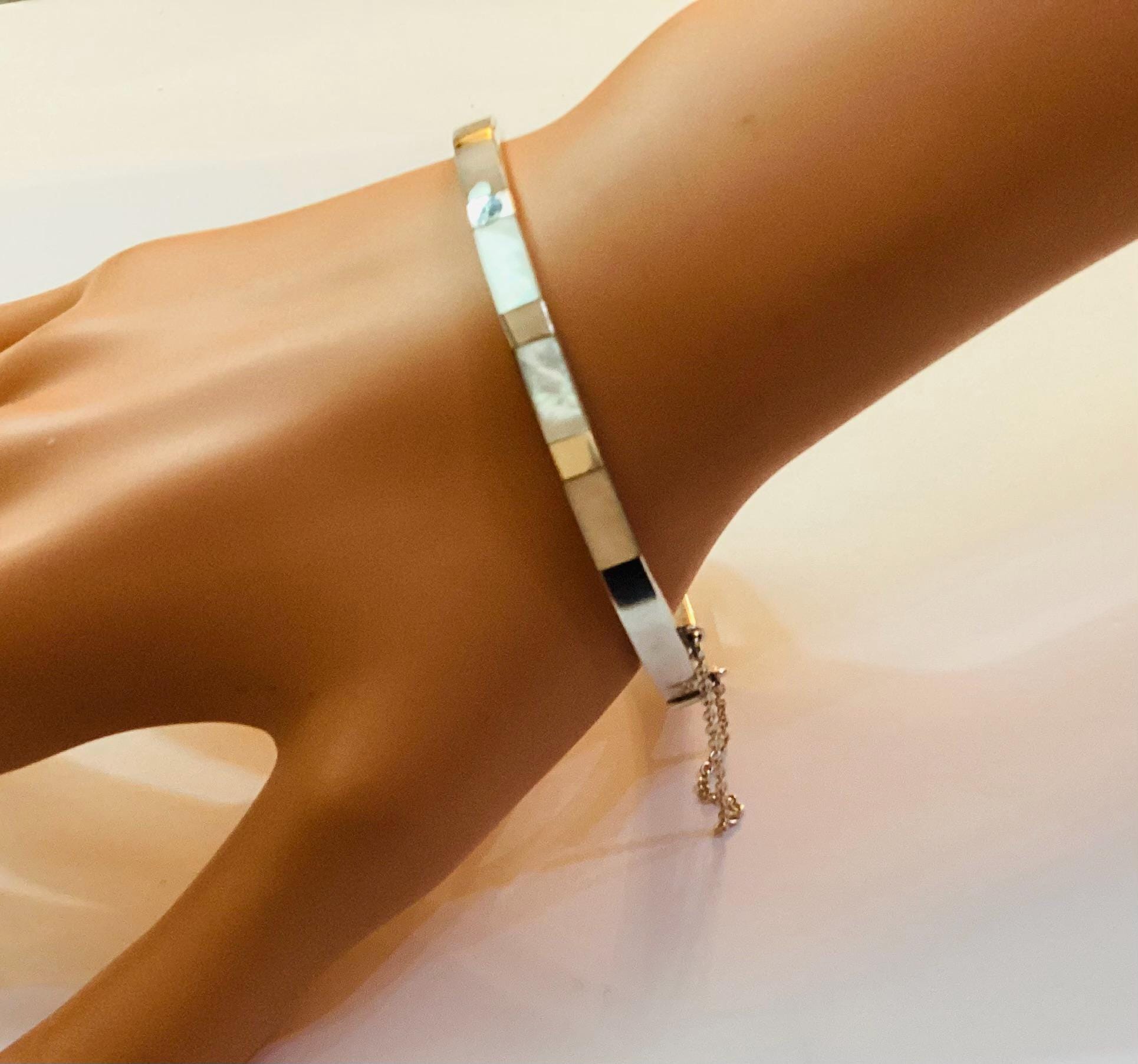 A super sophisticated heavy quality silver hinged bangle. The bangle is set with five highly polished mother of pearl insets adding a lovely sparkle. Great condition, no dints or bashes.