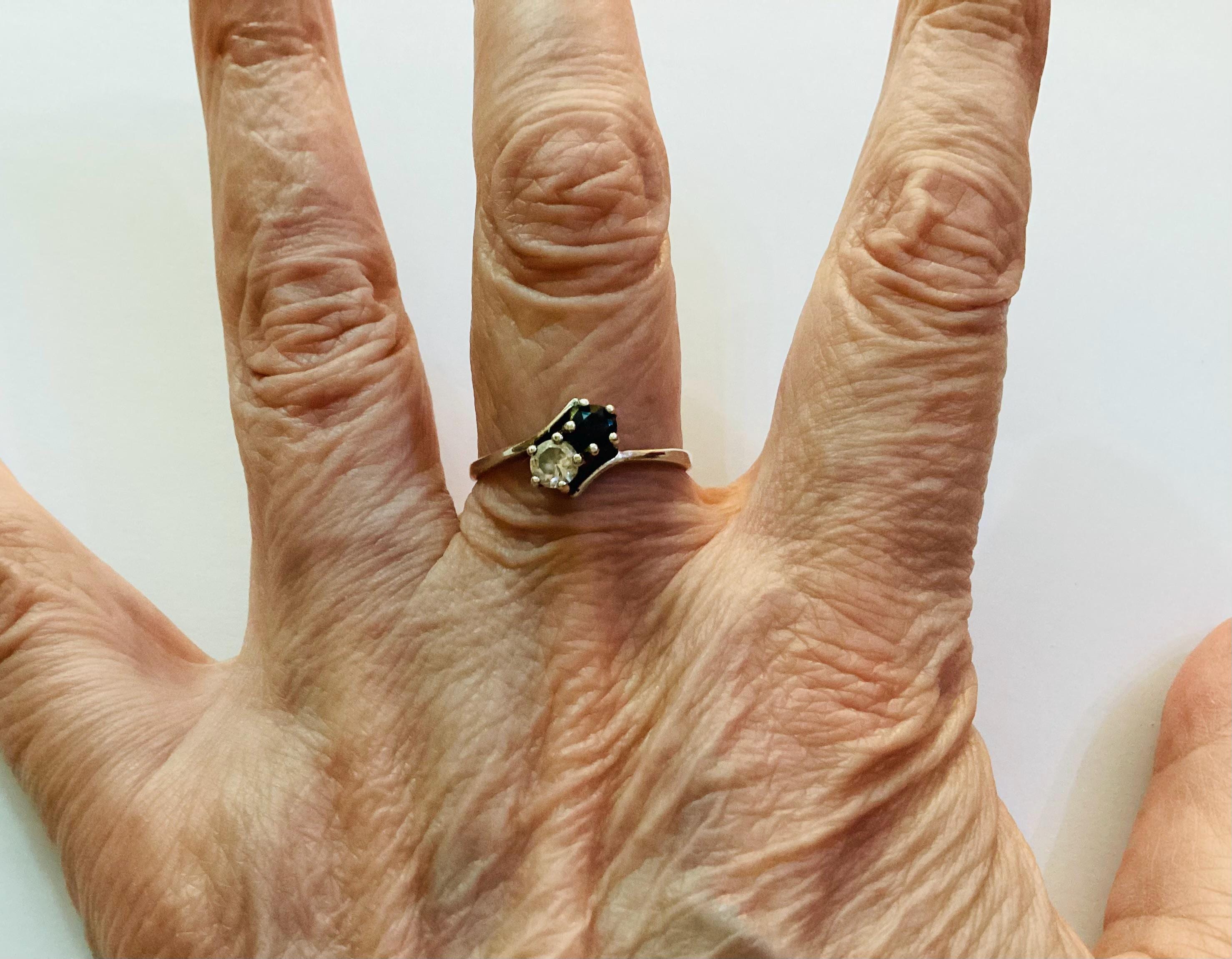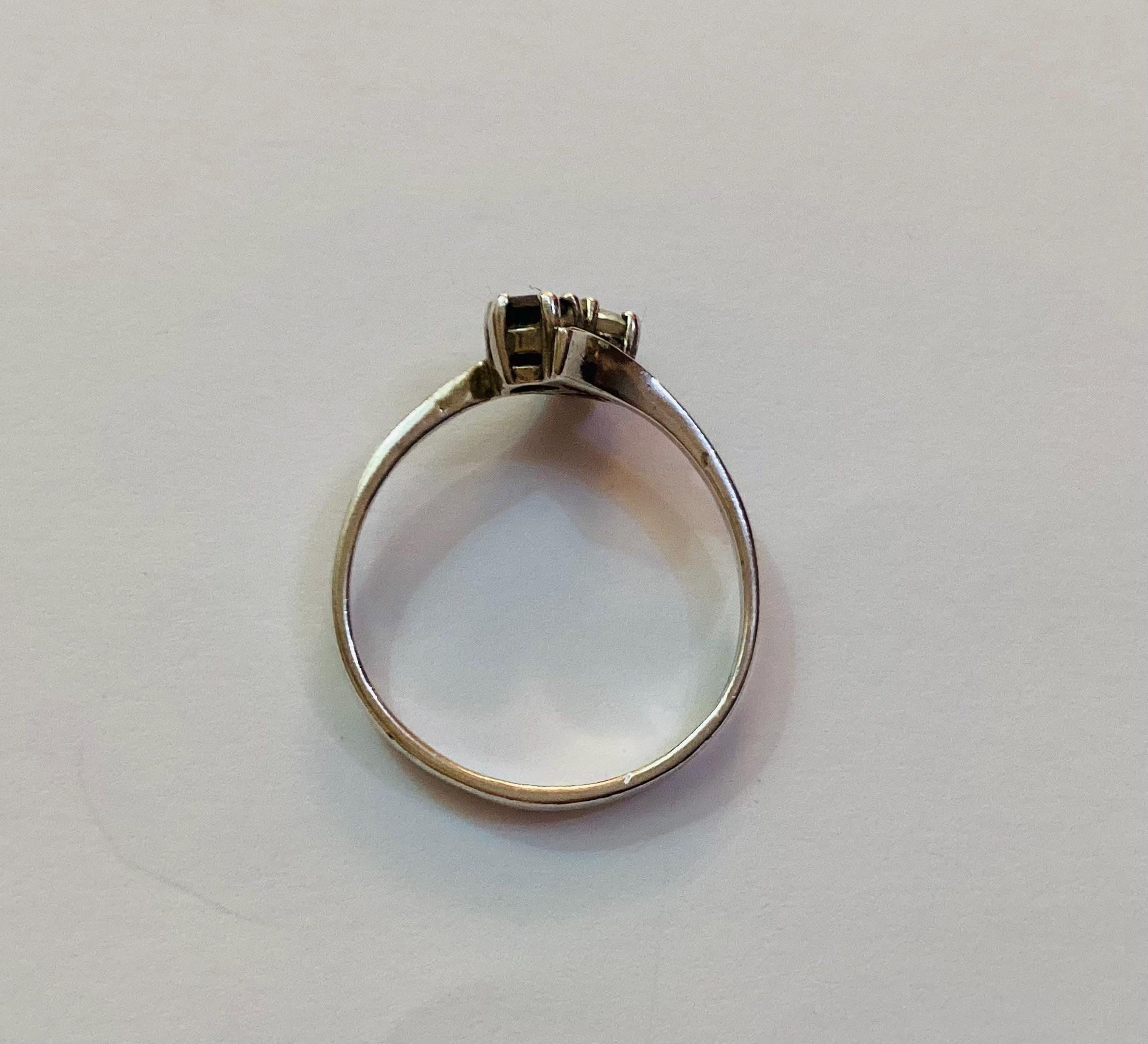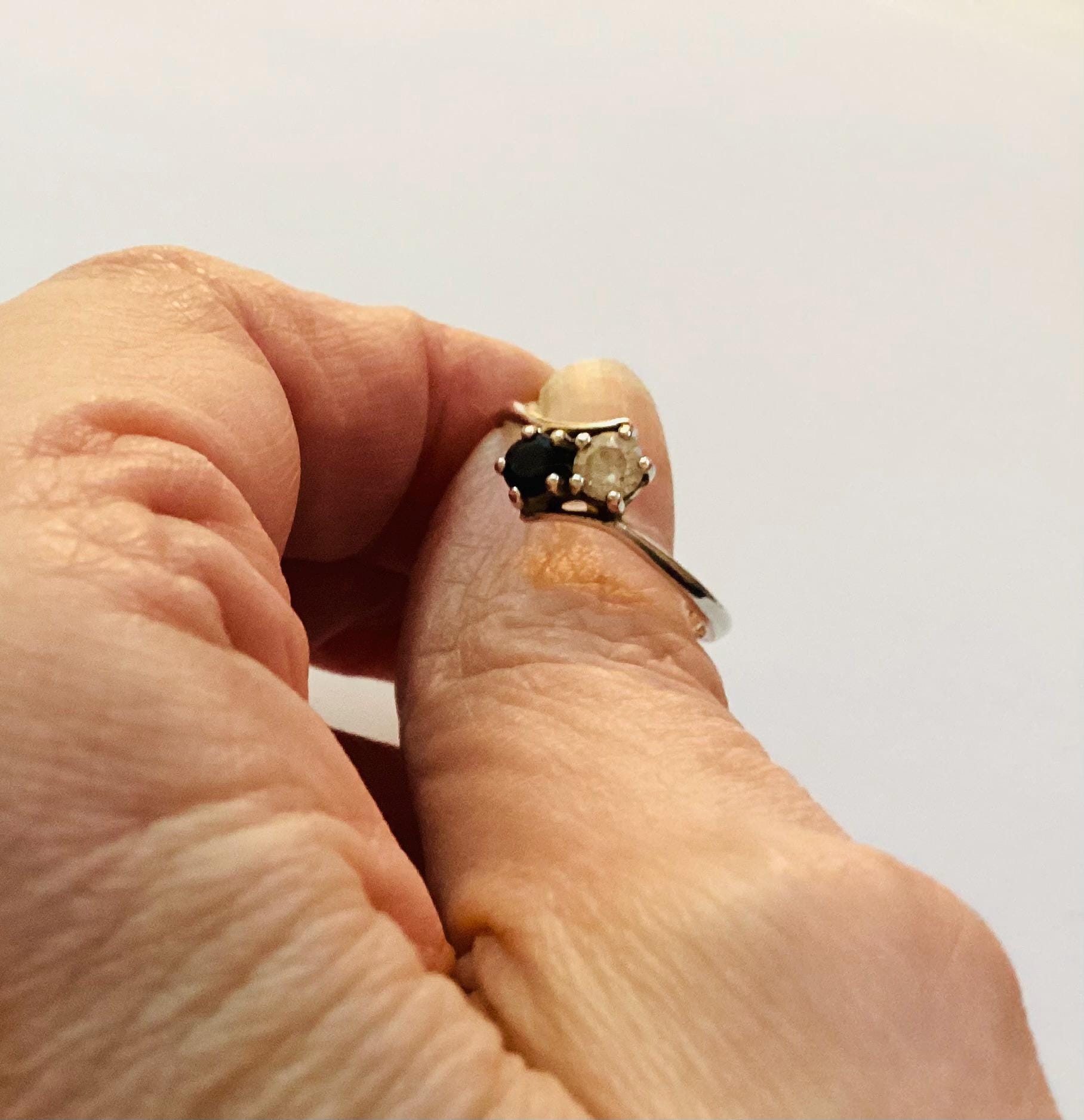 A delightfully dainty crossover ring. Set with two pretty gemstones of black onyx and CZ. Would stack very nicely but is also super worn alone.