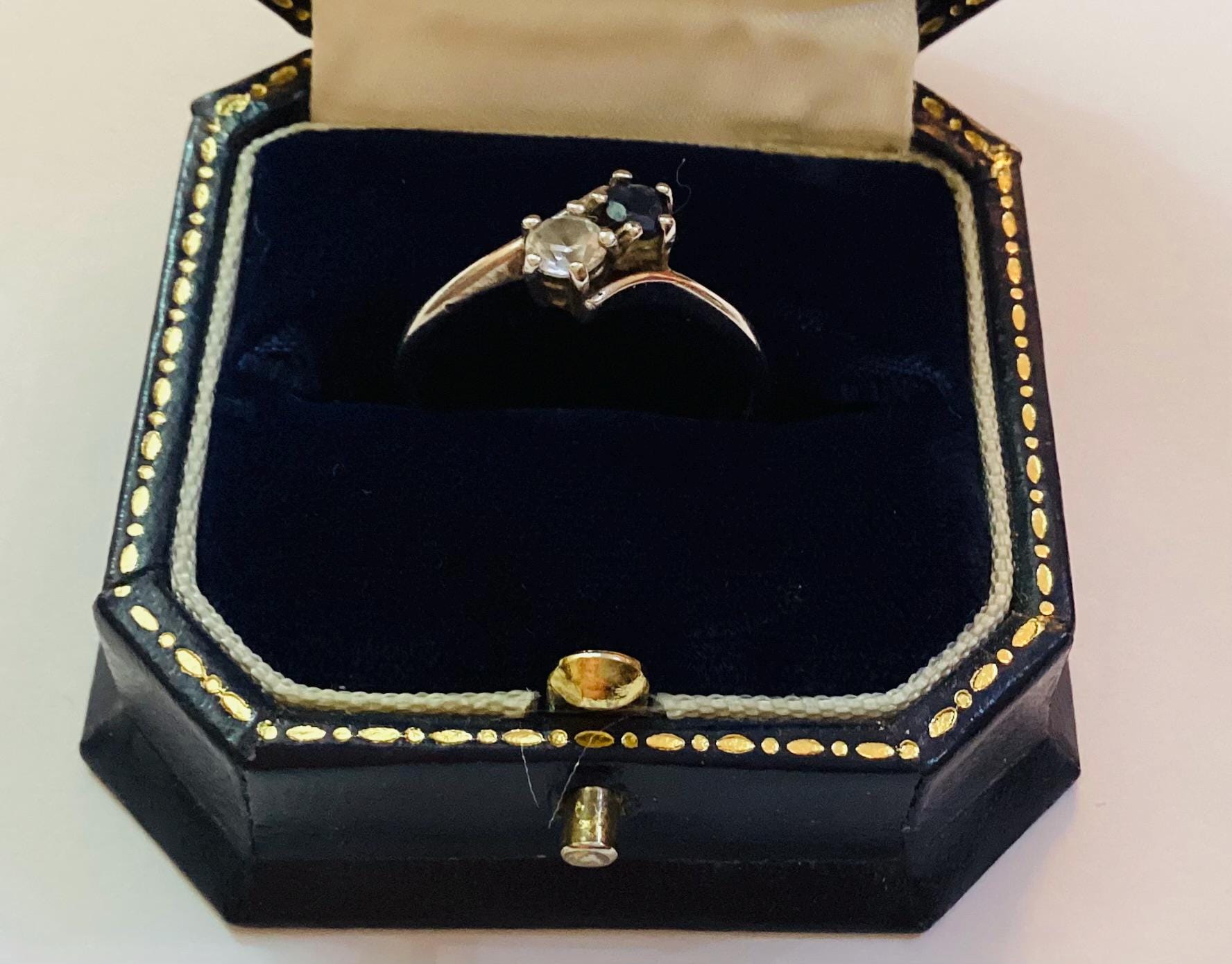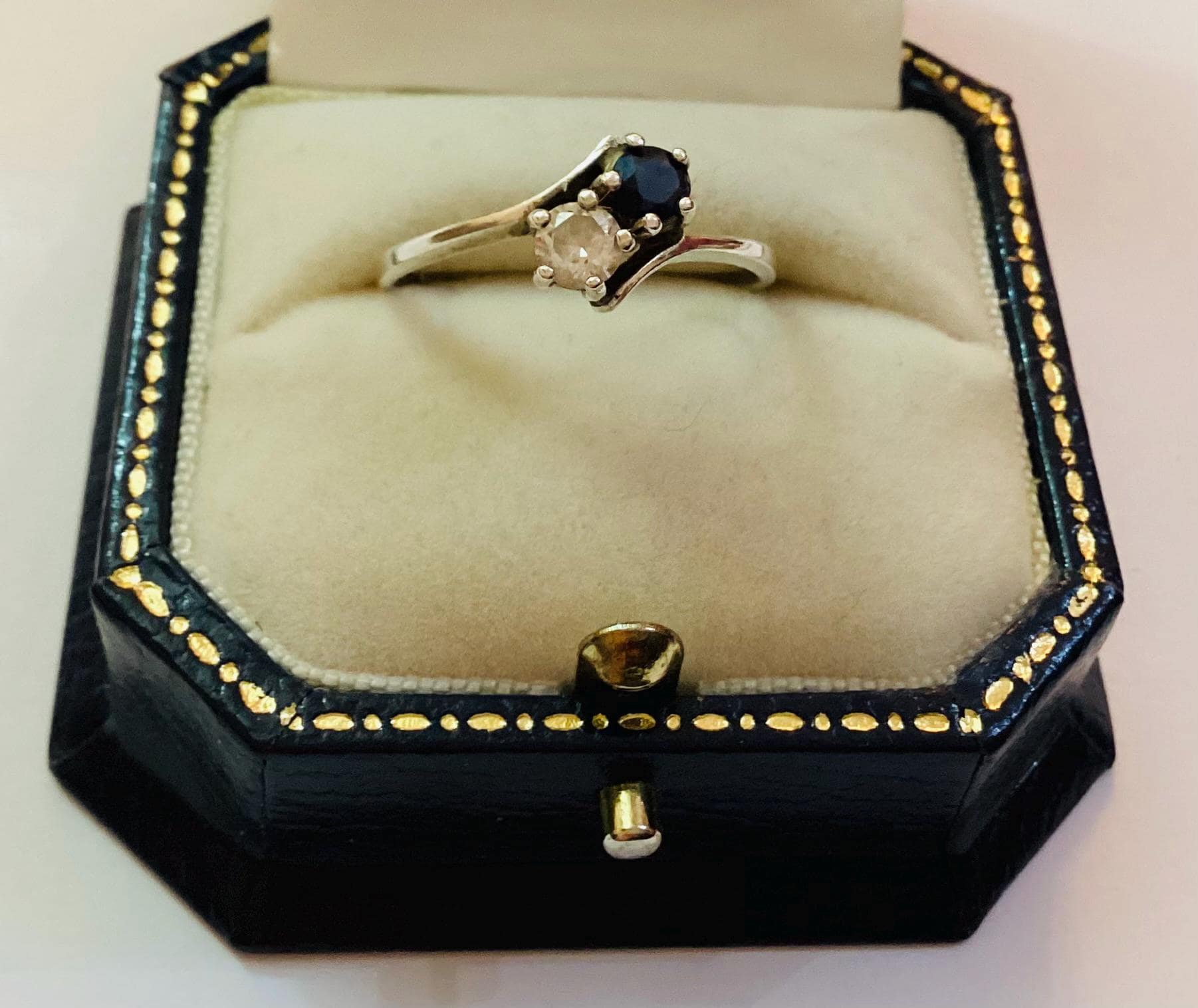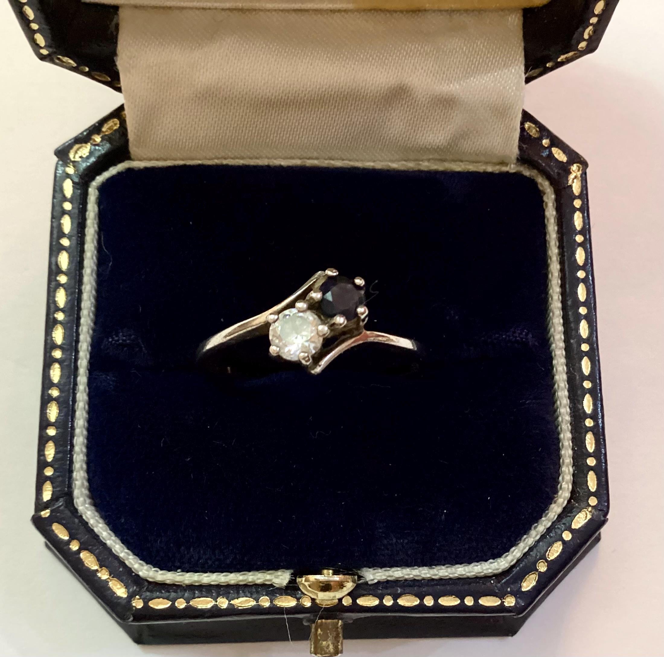 A delightfully dainty crossover ring. Set with two pretty gemstones of black onyx and CZ. Would stack very nicely but is also super worn alone.