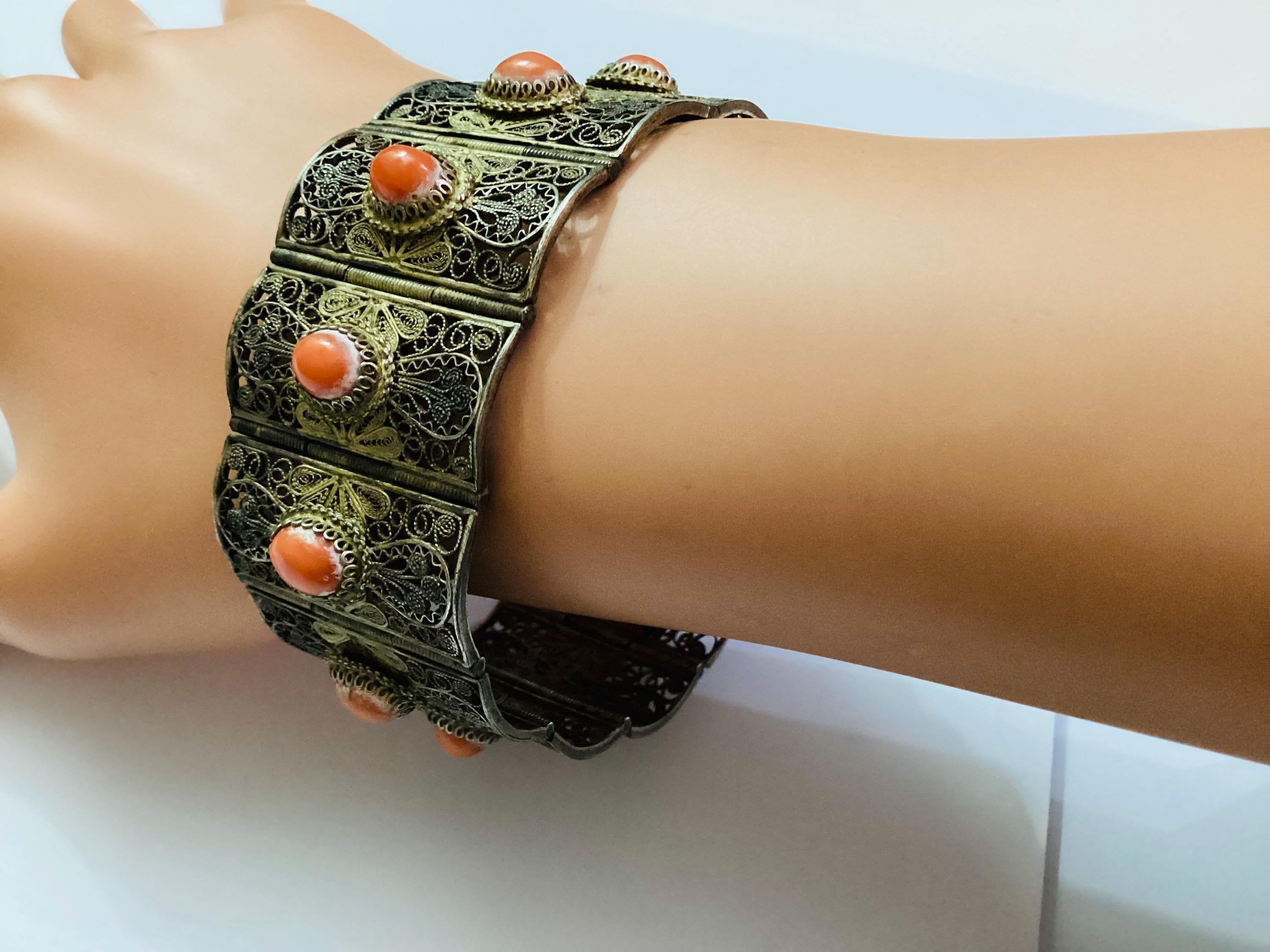 A beautiful antique silver gilt filigree and coral panel bracelet. The silver is stamped 834 and is pre 1st World War and of Austro Hungarian origin. It is in lovely condition with nice clean coral, no chips or cracks and undamaged filigree. No attempt has been made to clean this piece.