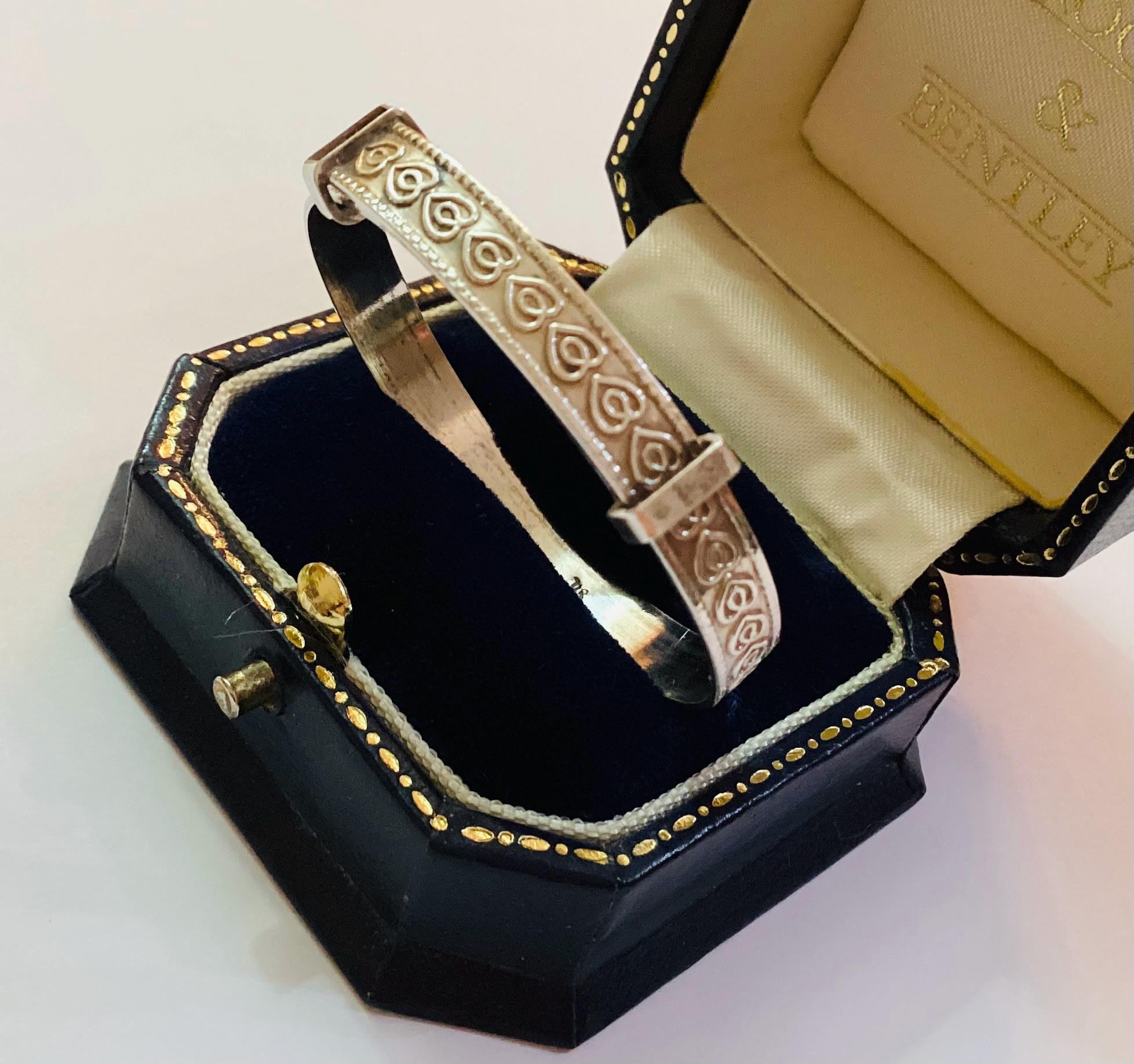 Delightful baby bangle etched with pretty hearts. A super Christening gift or baby shower present. This size should be suitable for 3-6 month baby.