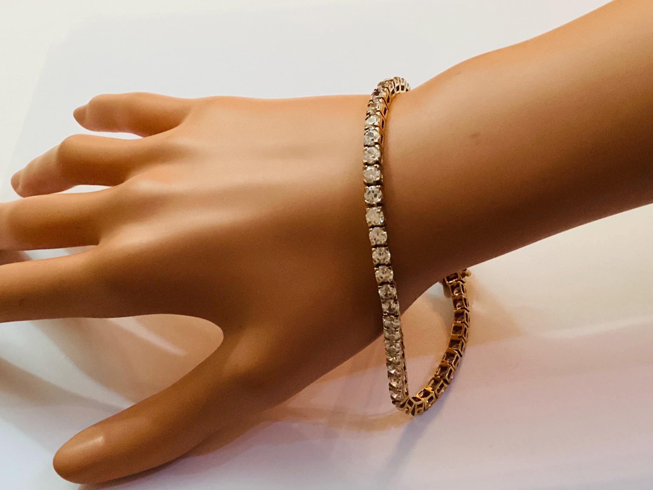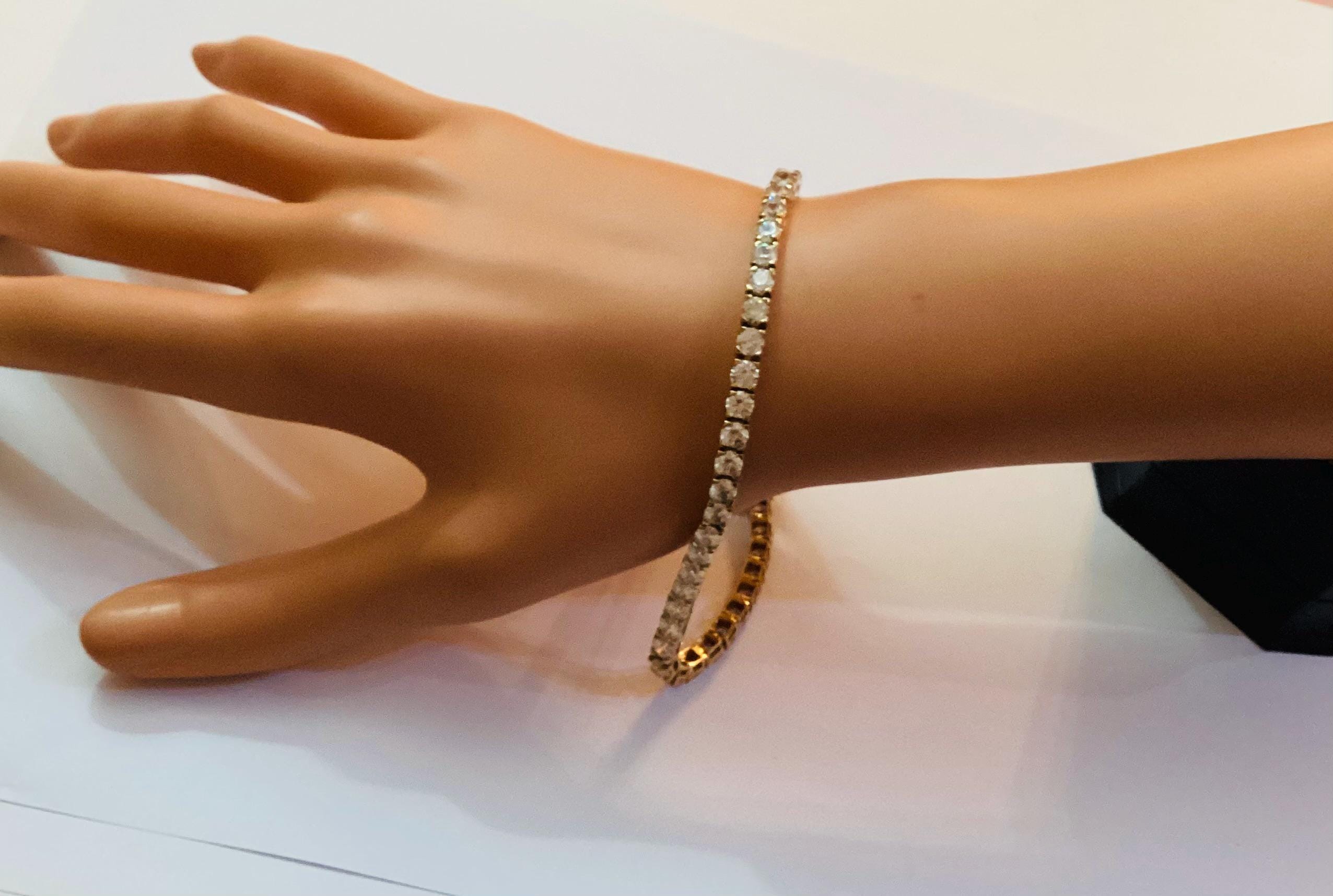 Super quality vermeil tennis bracelet set with 50 cubic zirconia in a 22ct gold on 925 solid silver chain. When worn this really does look "as good as gold" A fabulous bit of glamour from the ninties. Superb condition. This is 8 inches and longer than most bracelets please check that this will not slip off your hand.