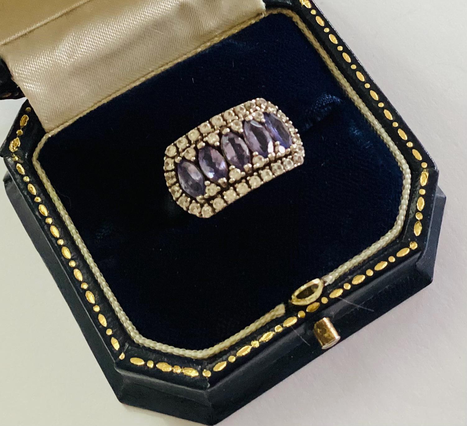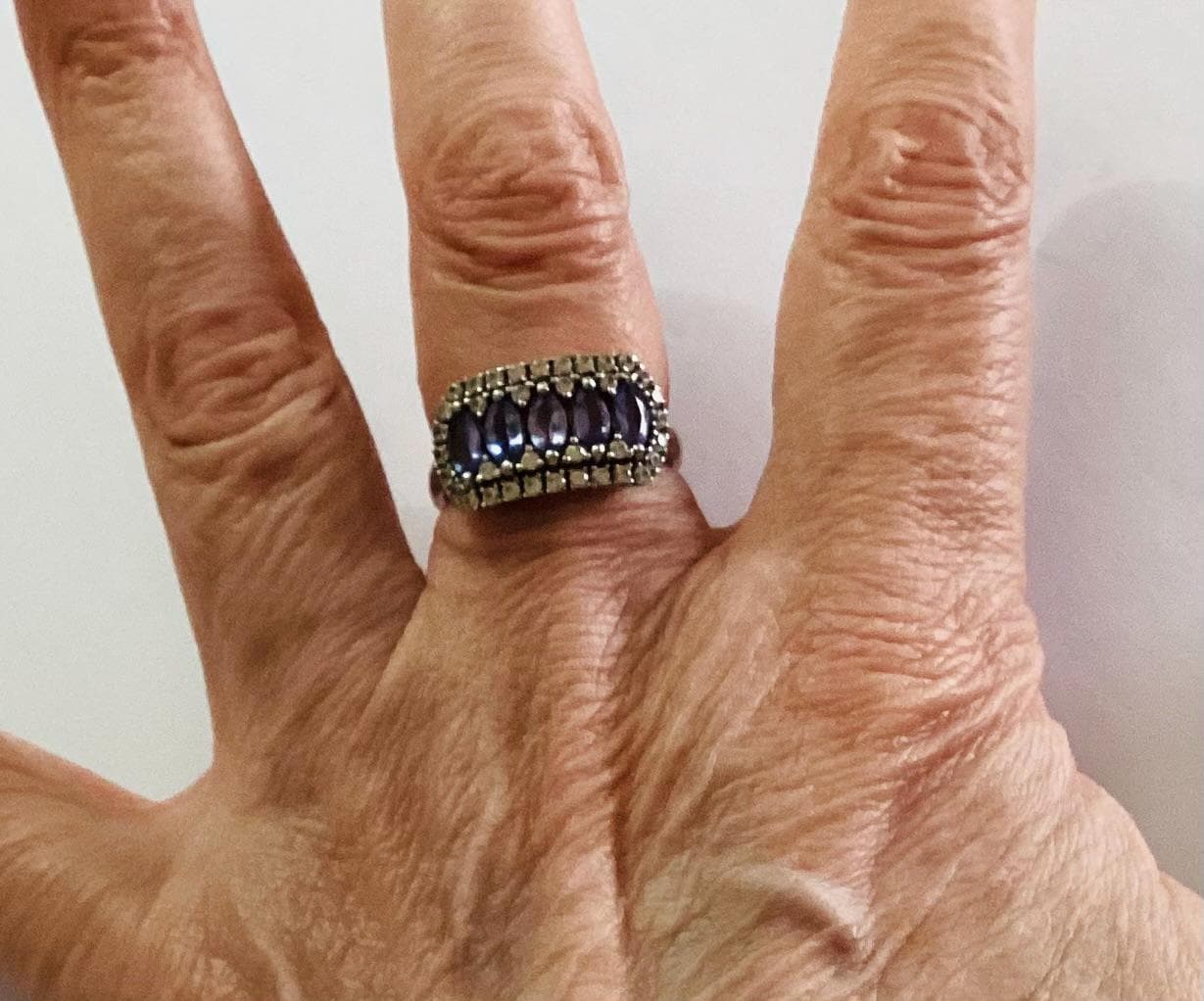 Beautiful marquise cut tanzanite set in a frame of sparkling white topaz. Fabulous eternity ring or engagement. Looks good worn alone or with other band styles.