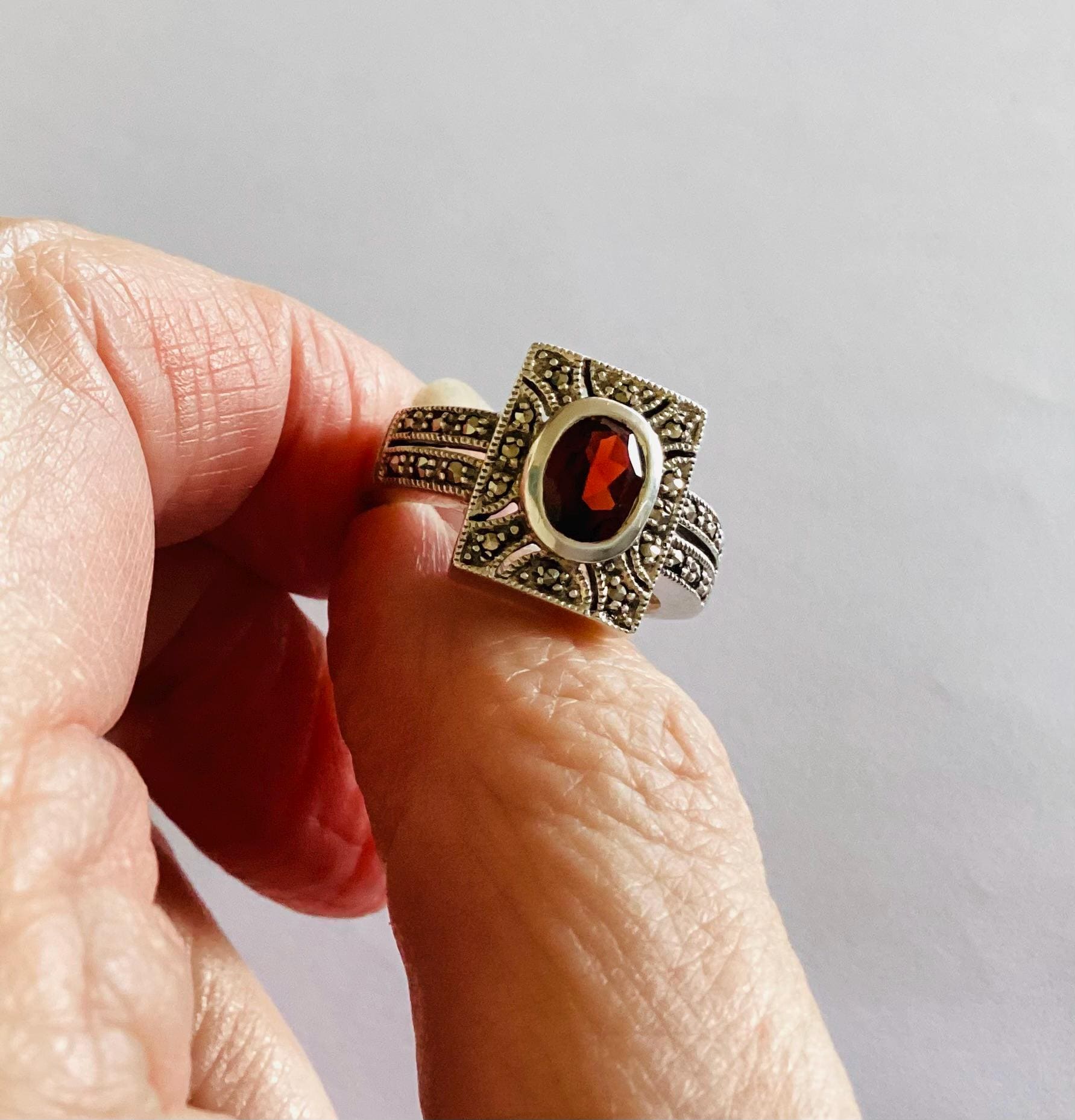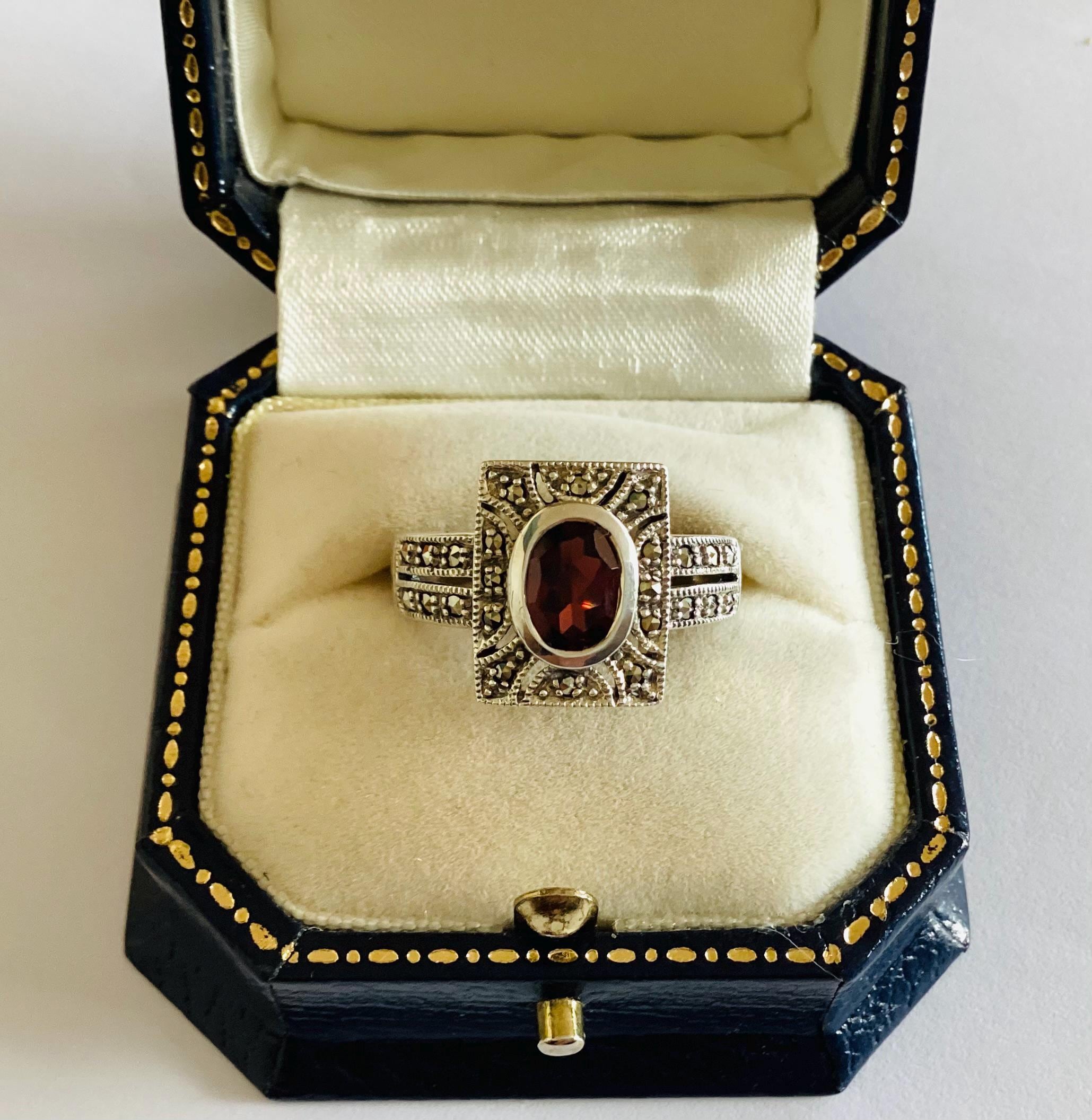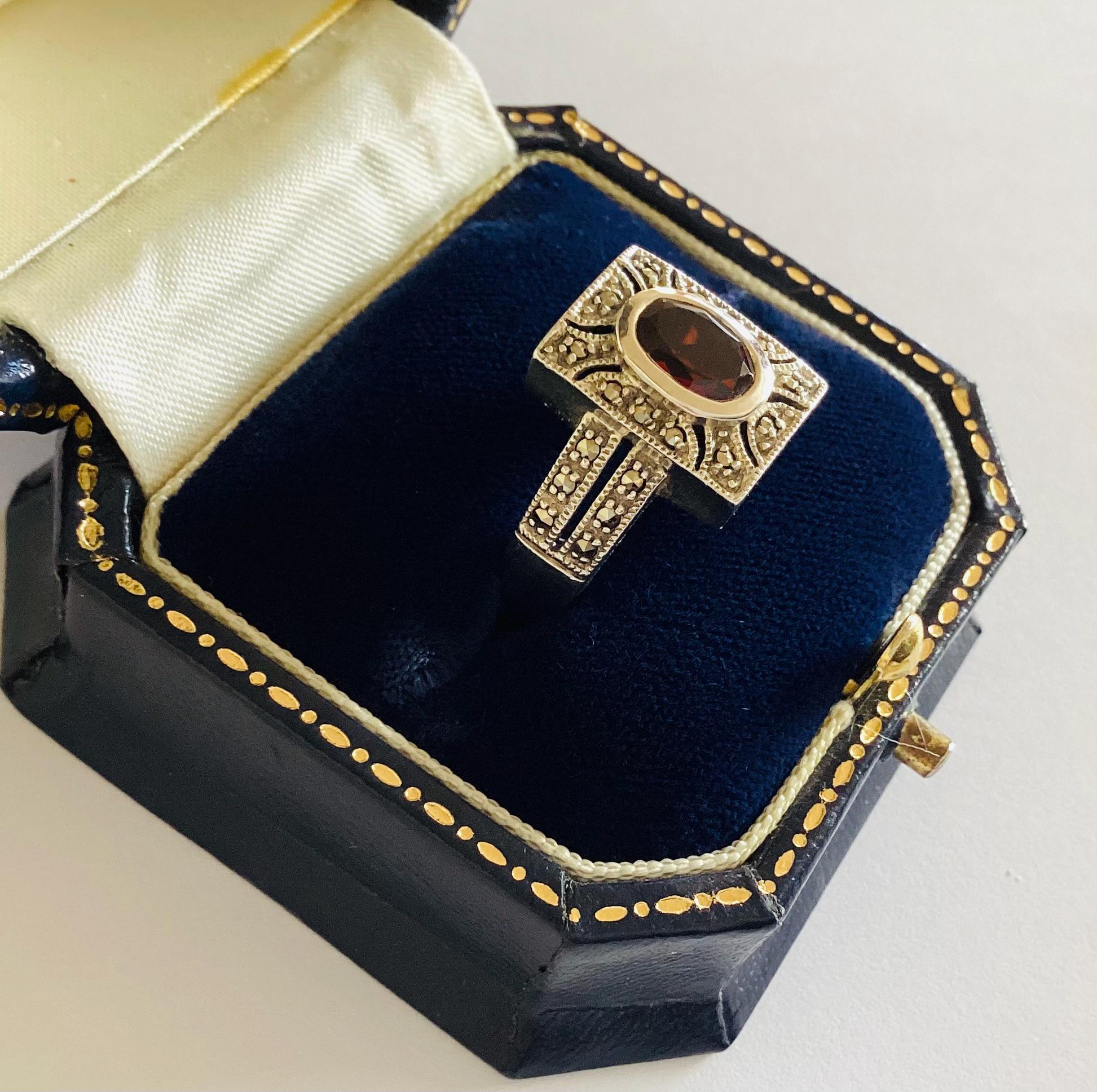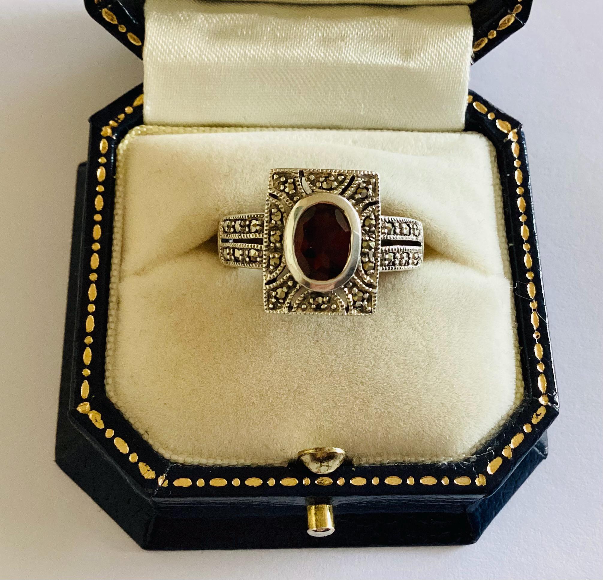 A fabulous true vintage Art Deco ring. Beautiful faceted garnet in rectangular marcasite set head with unusual gem set double shoulders.