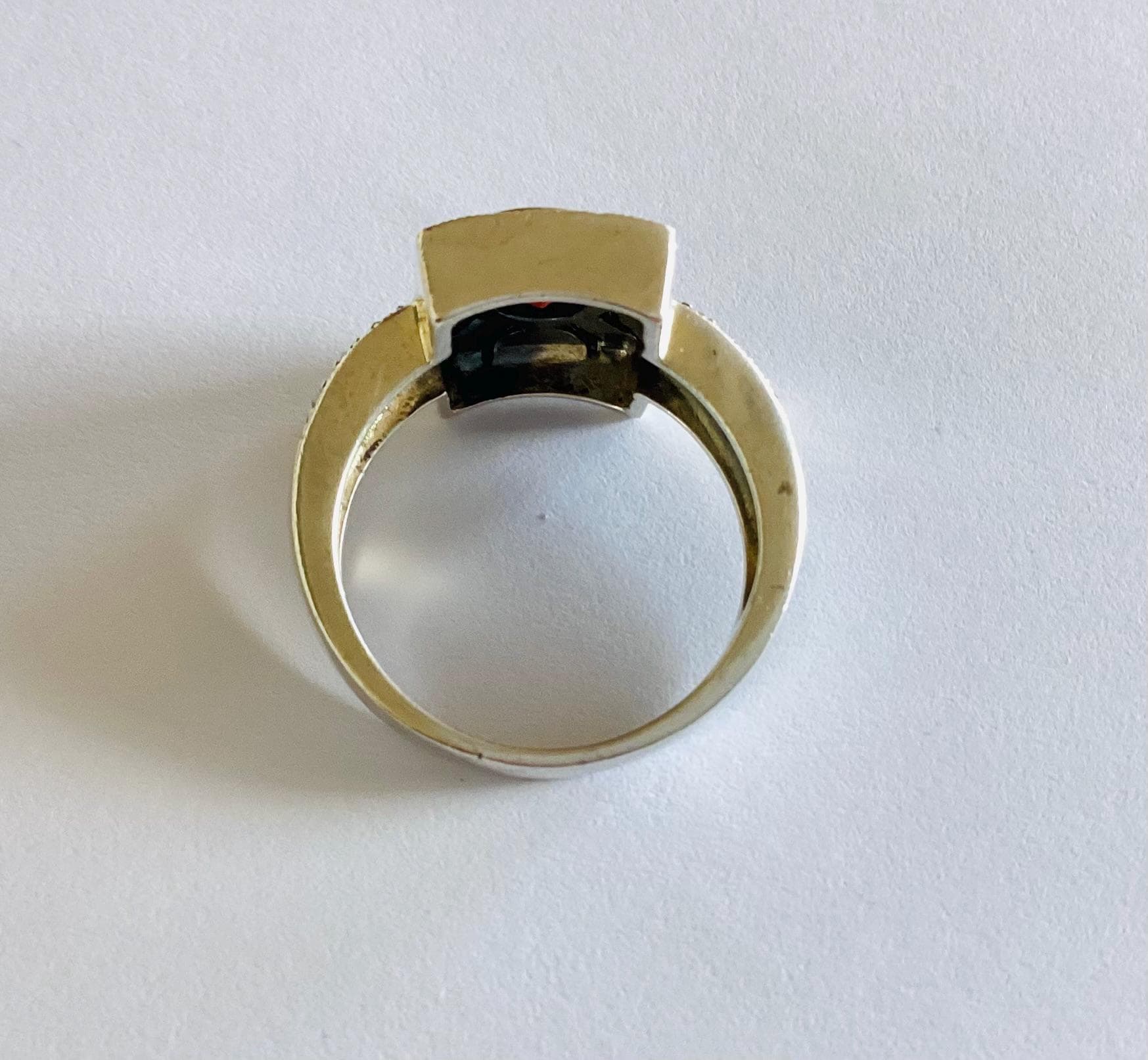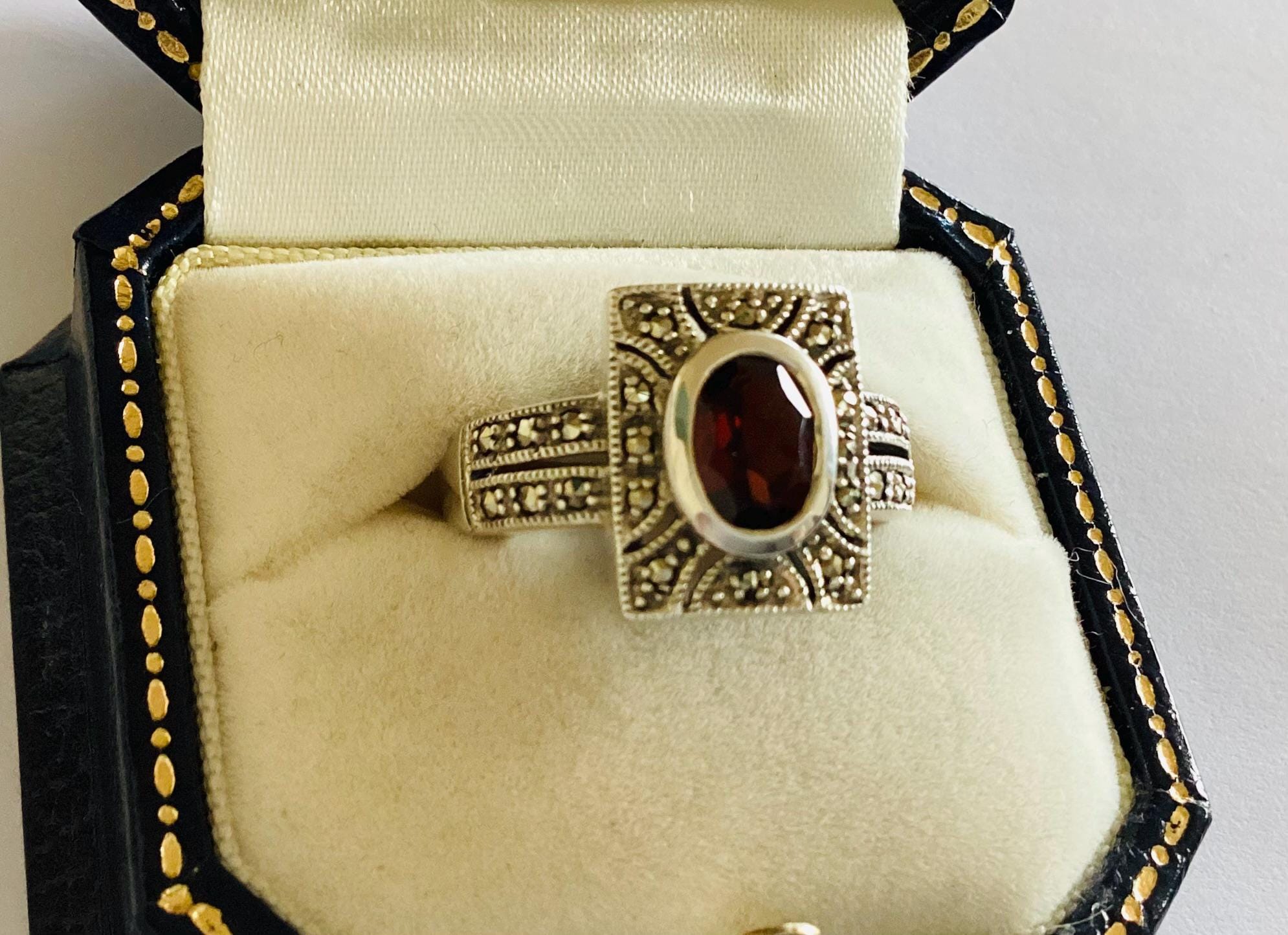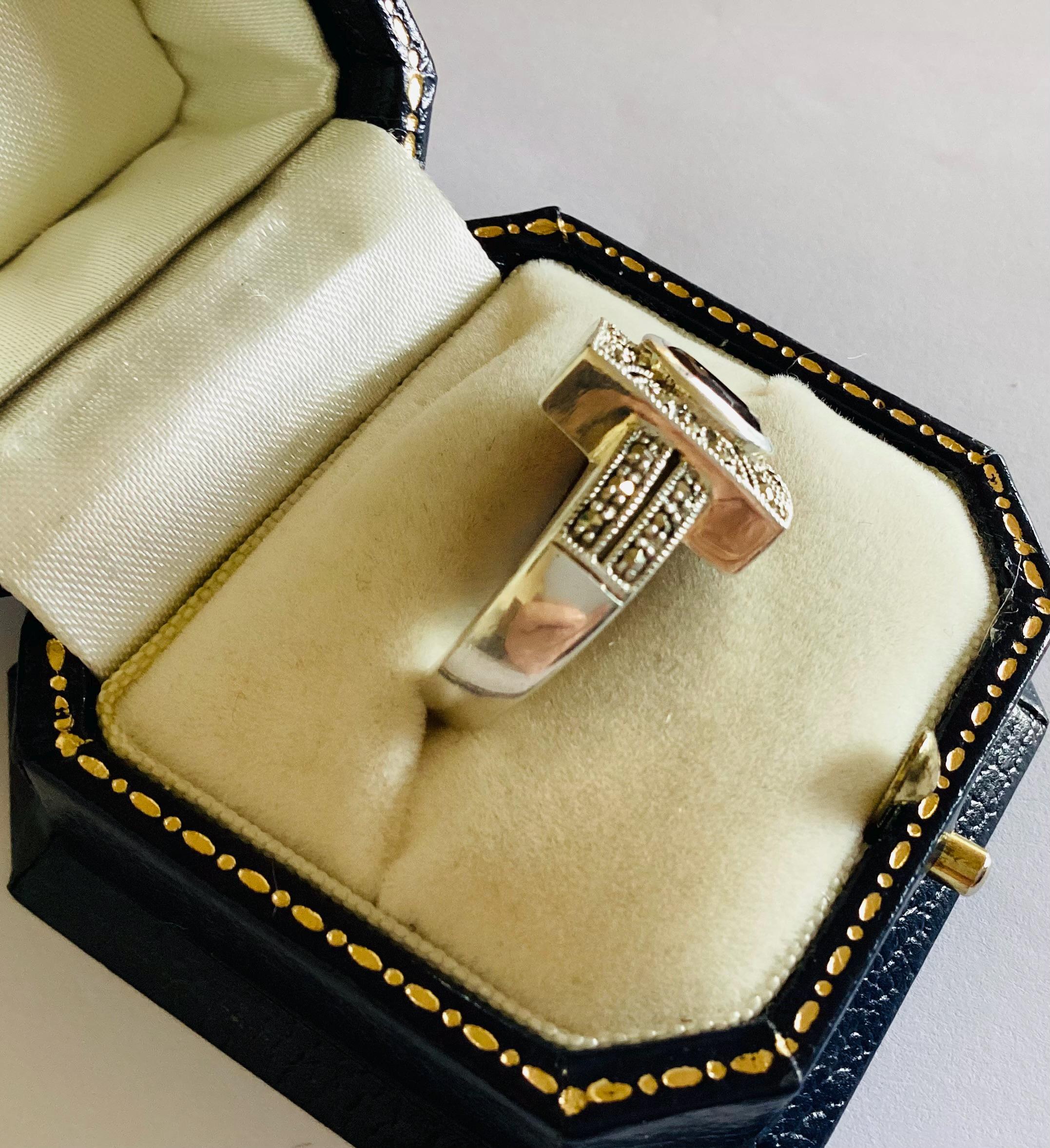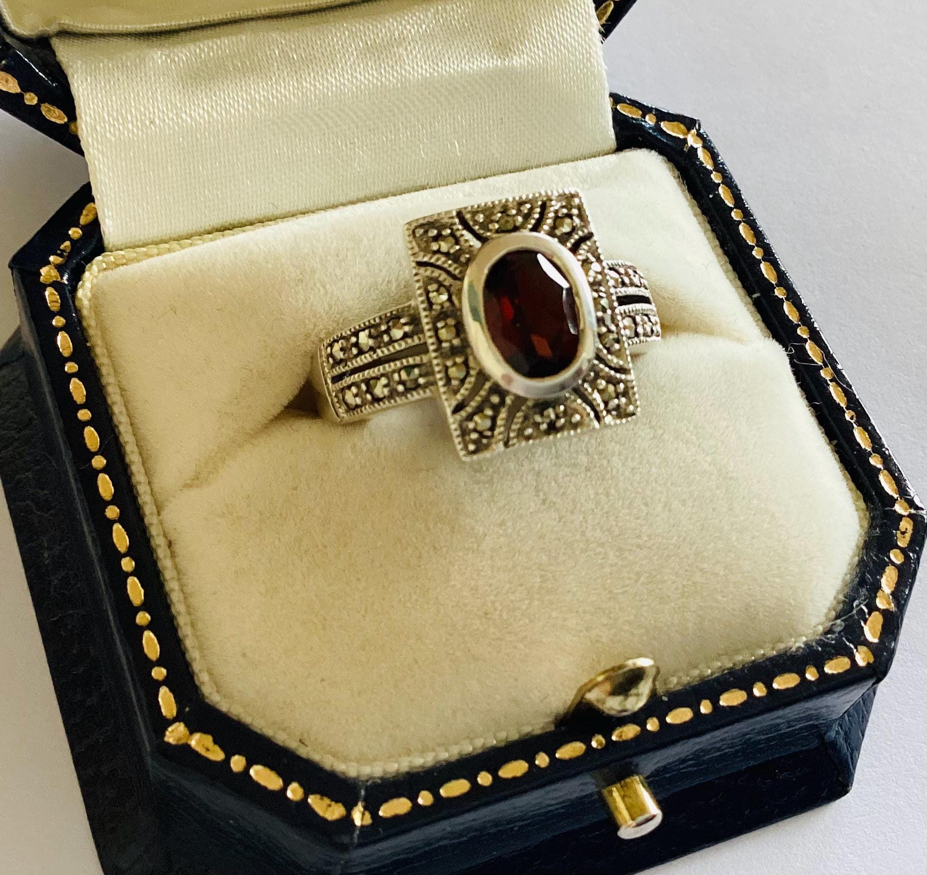 A fabulous true vintage Art Deco ring. Beautiful faceted garnet in rectangular marcasite set head with unusual gem set double shoulders.