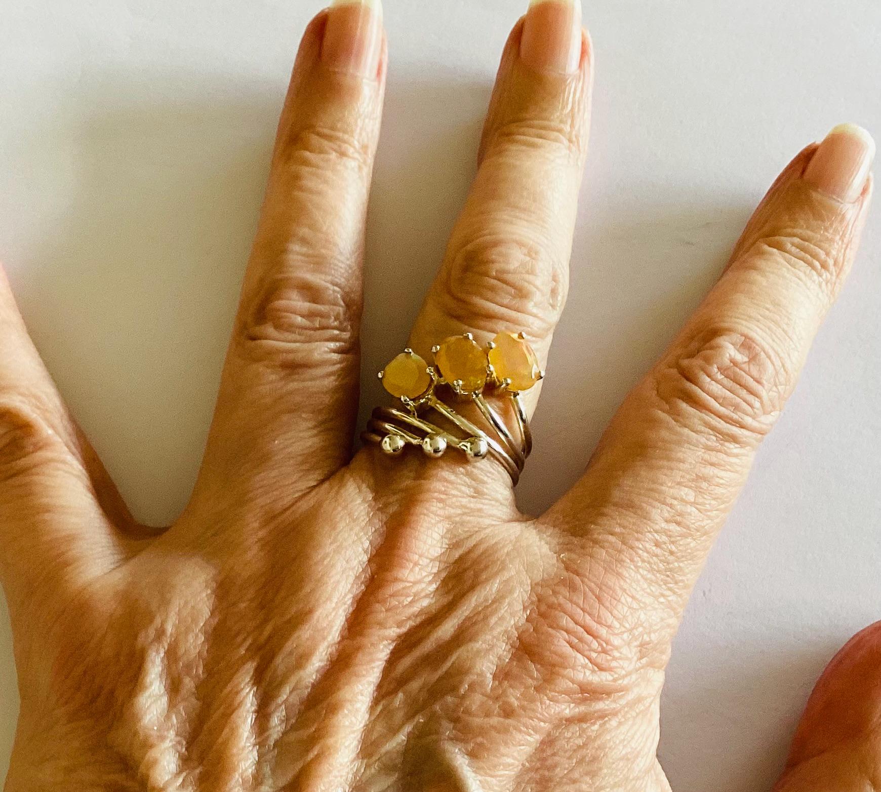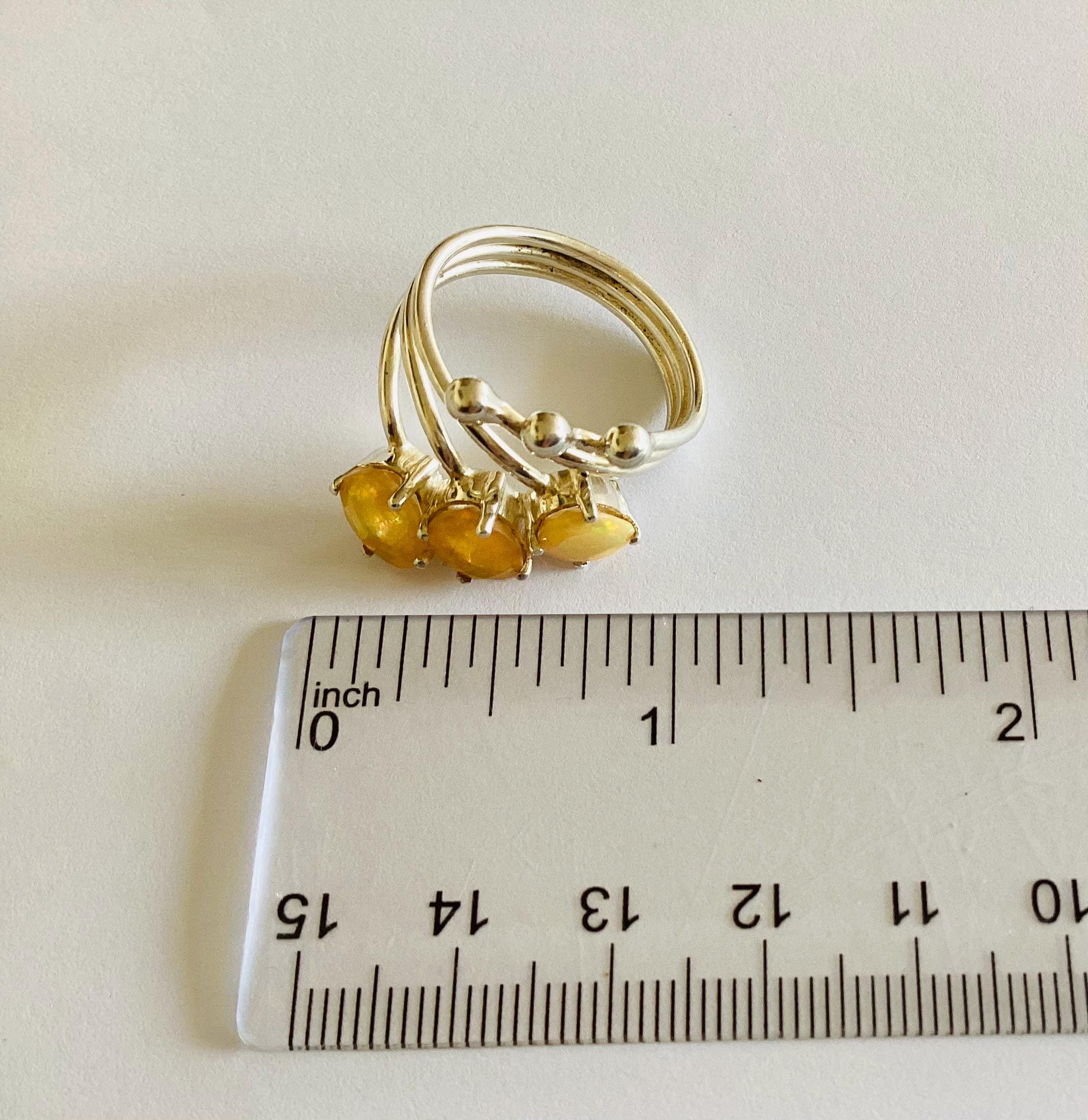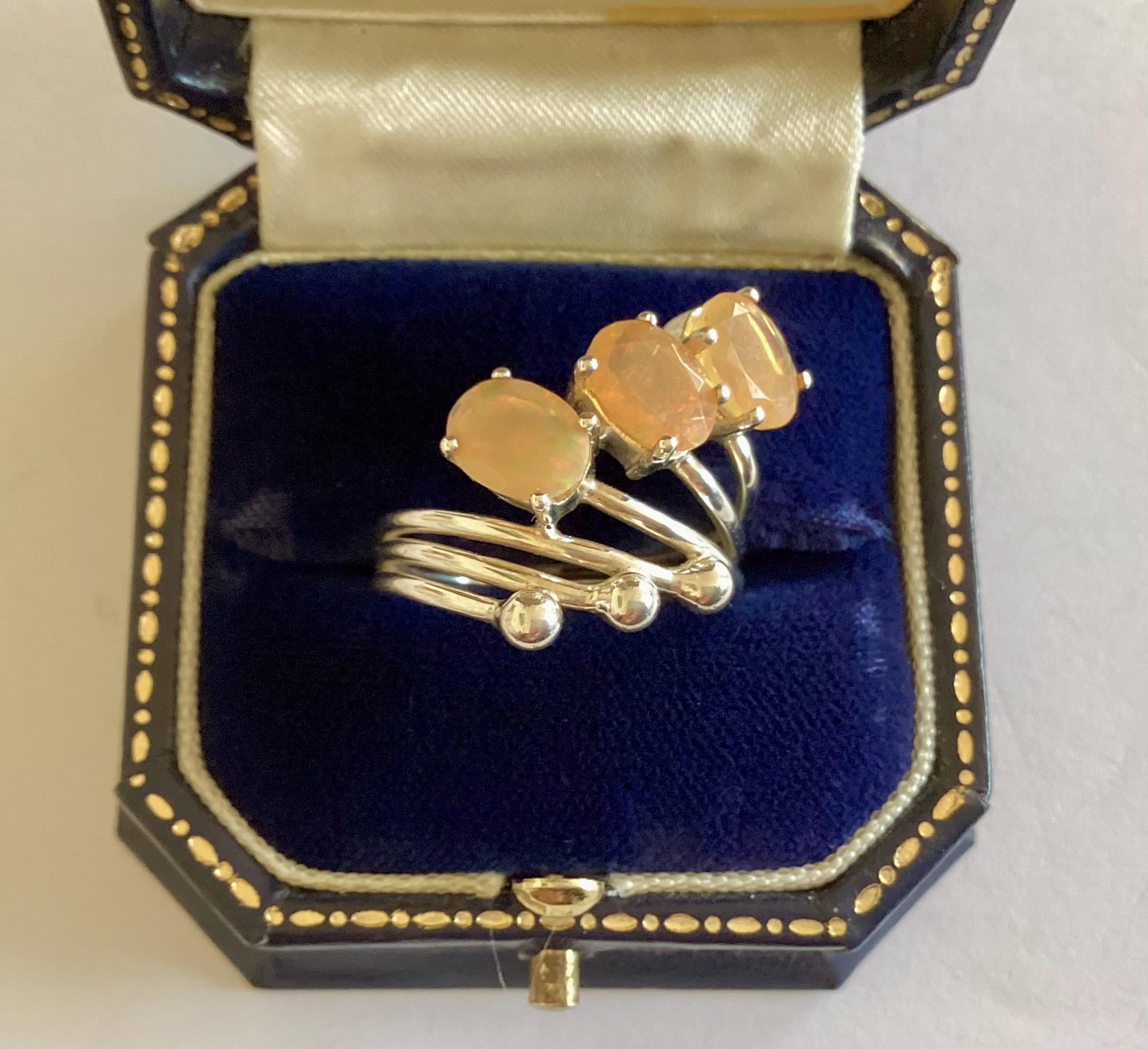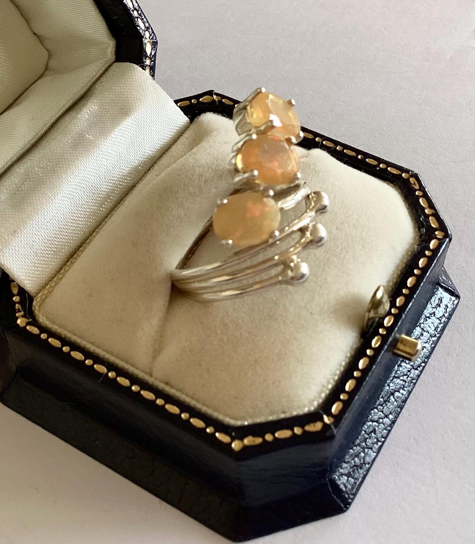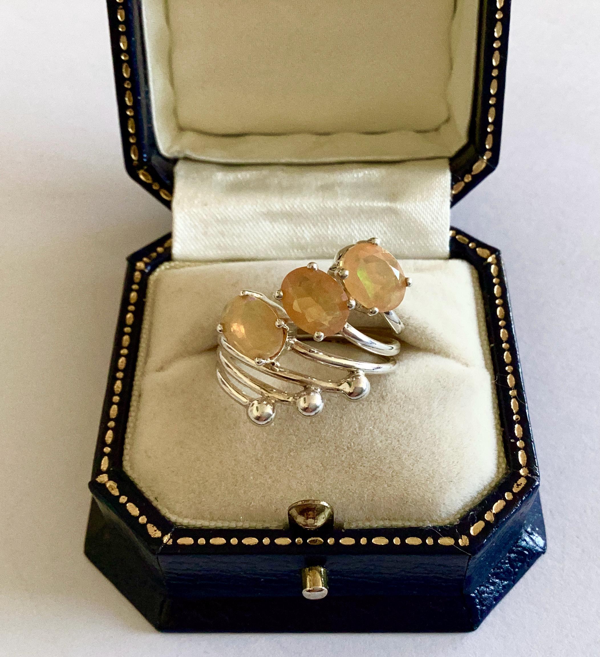A rare and unusual faceted fire opal ring. Modernist 925 solid silver trilogy split shank setting.