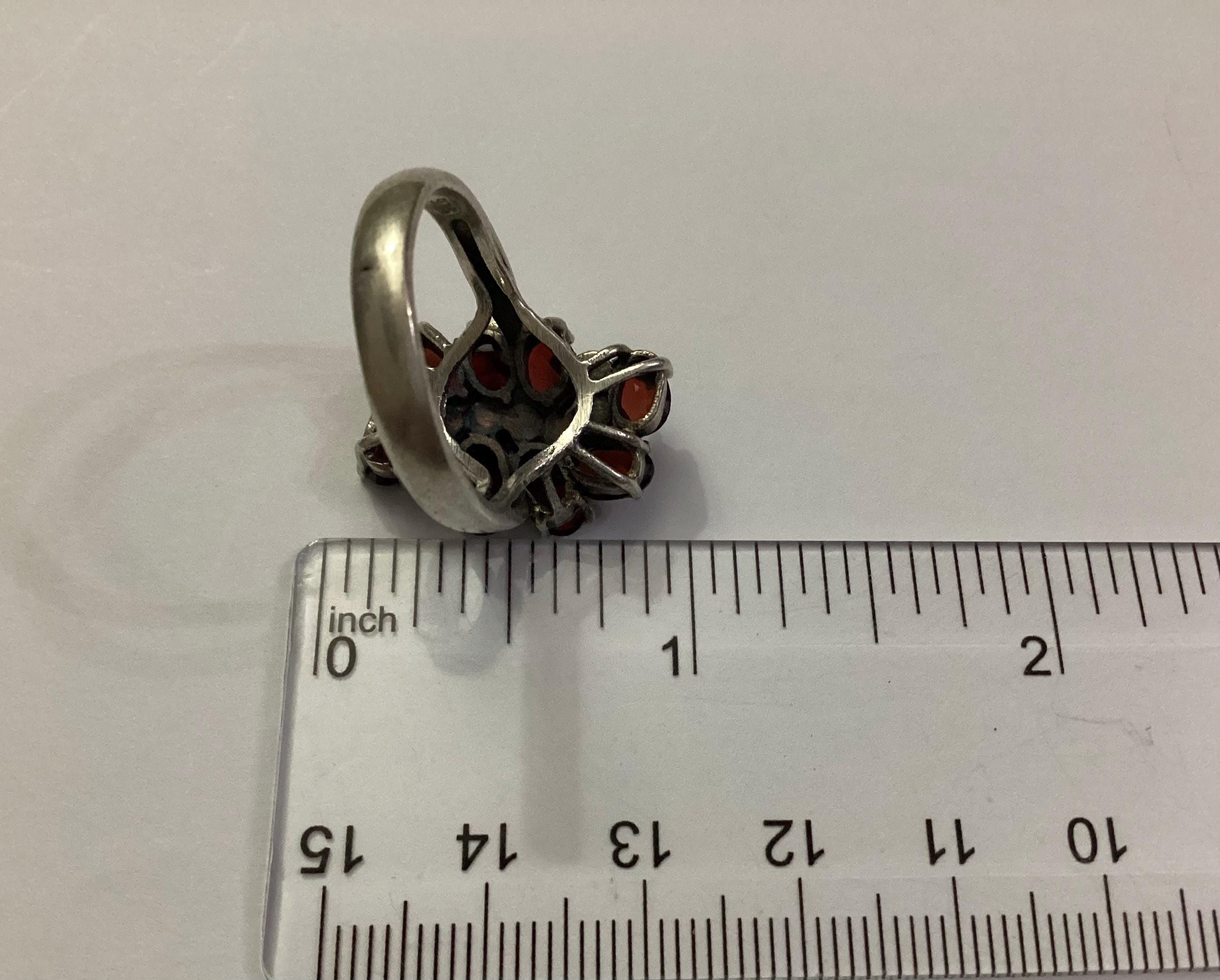 Delightful deep red garnets and marcasite in an unusual and striking asymmetrical setting. Beautiful deep ruby red garnets add to the quality look of this striking piece of vintage jewellery. There is re-sizing mark visible on the shank, this is sturdy and well finished.