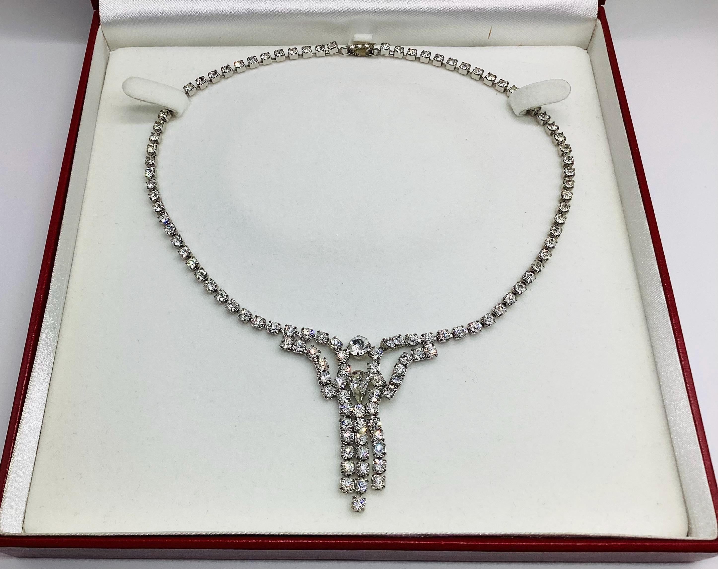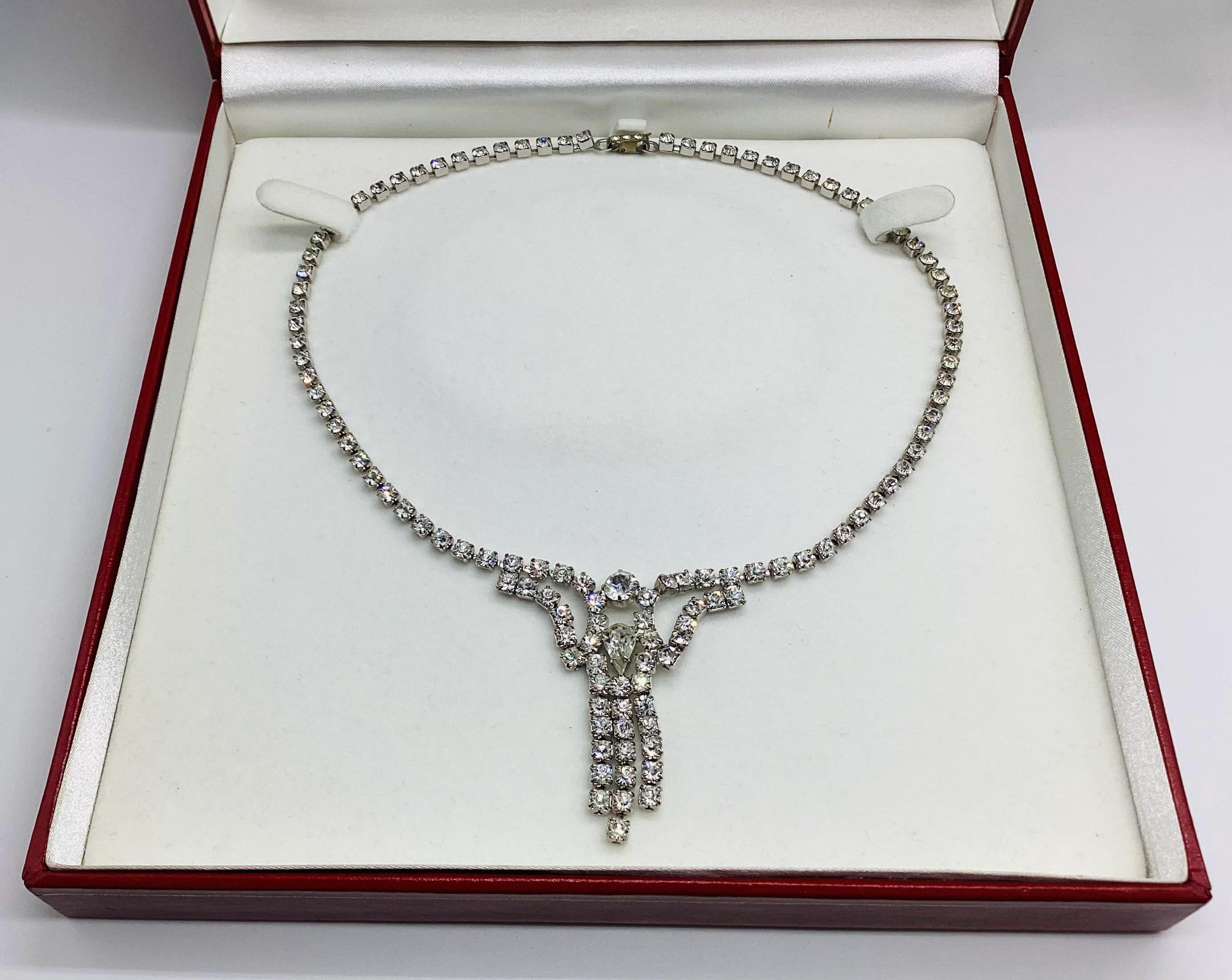 Art Deco 1940's rhinestone necklace. Pear drop and fringed diamente fall. Super sparkle on the most beautiful diamente necklace. Who needs diamonds. All ready for the party season. Lovely wedding necklace for bride or bridesmaid. Excellent condition stones all clear and sparkling no discolouration.