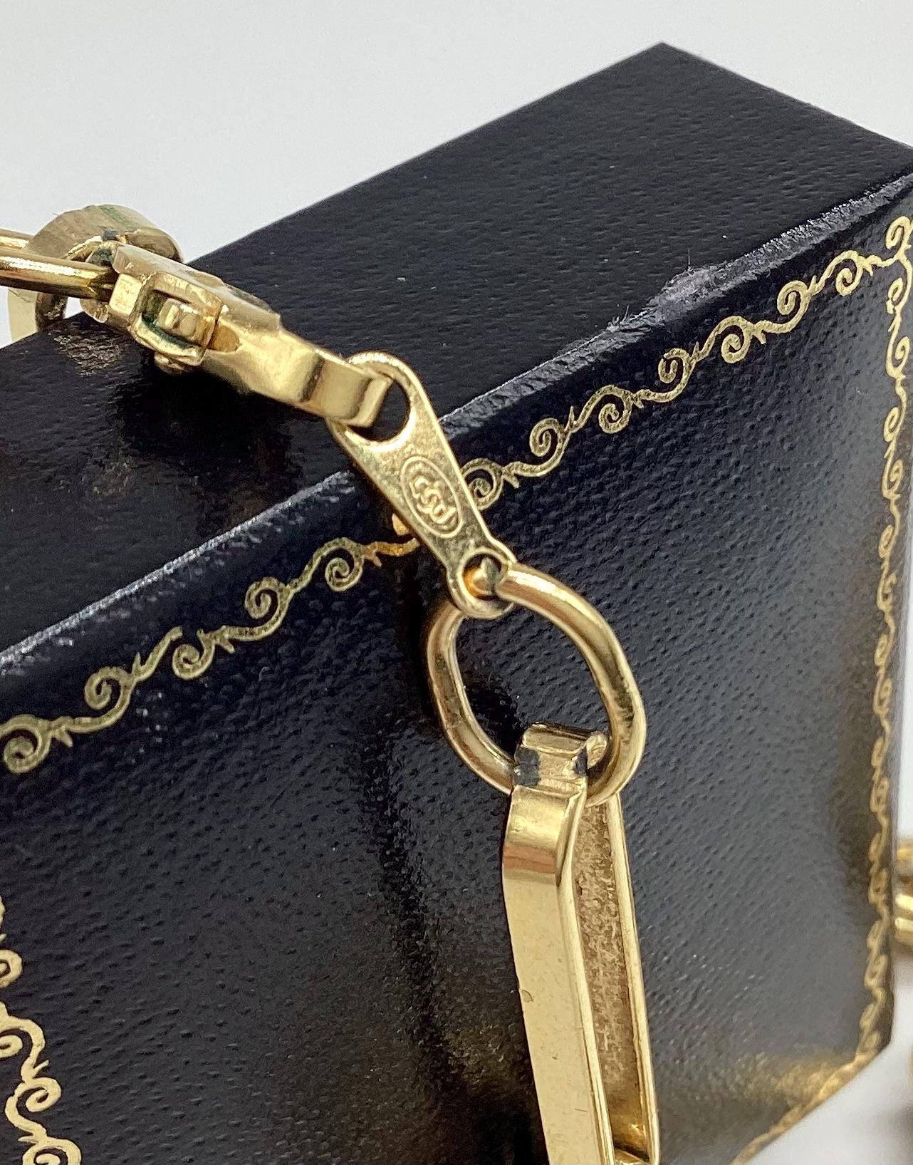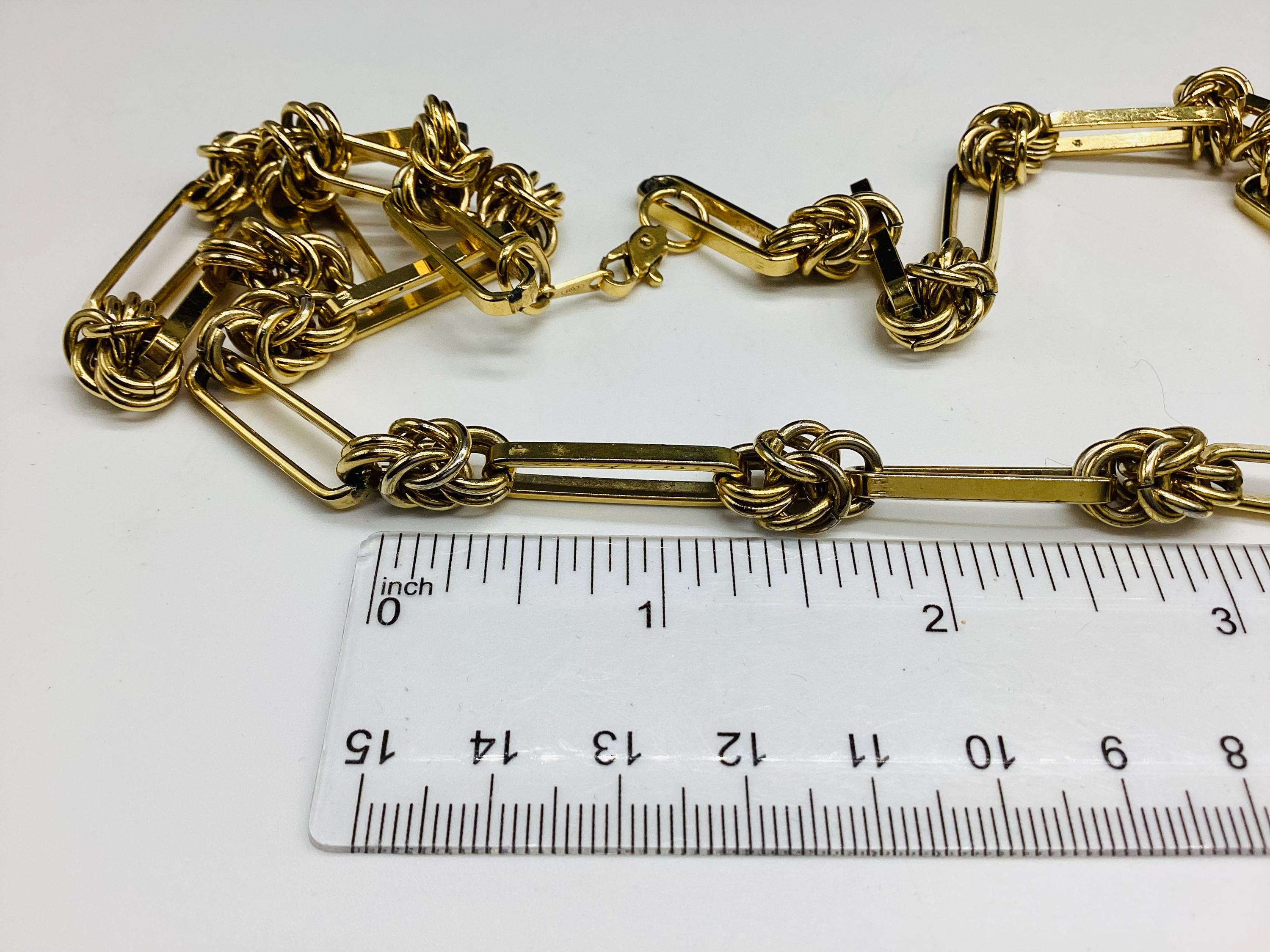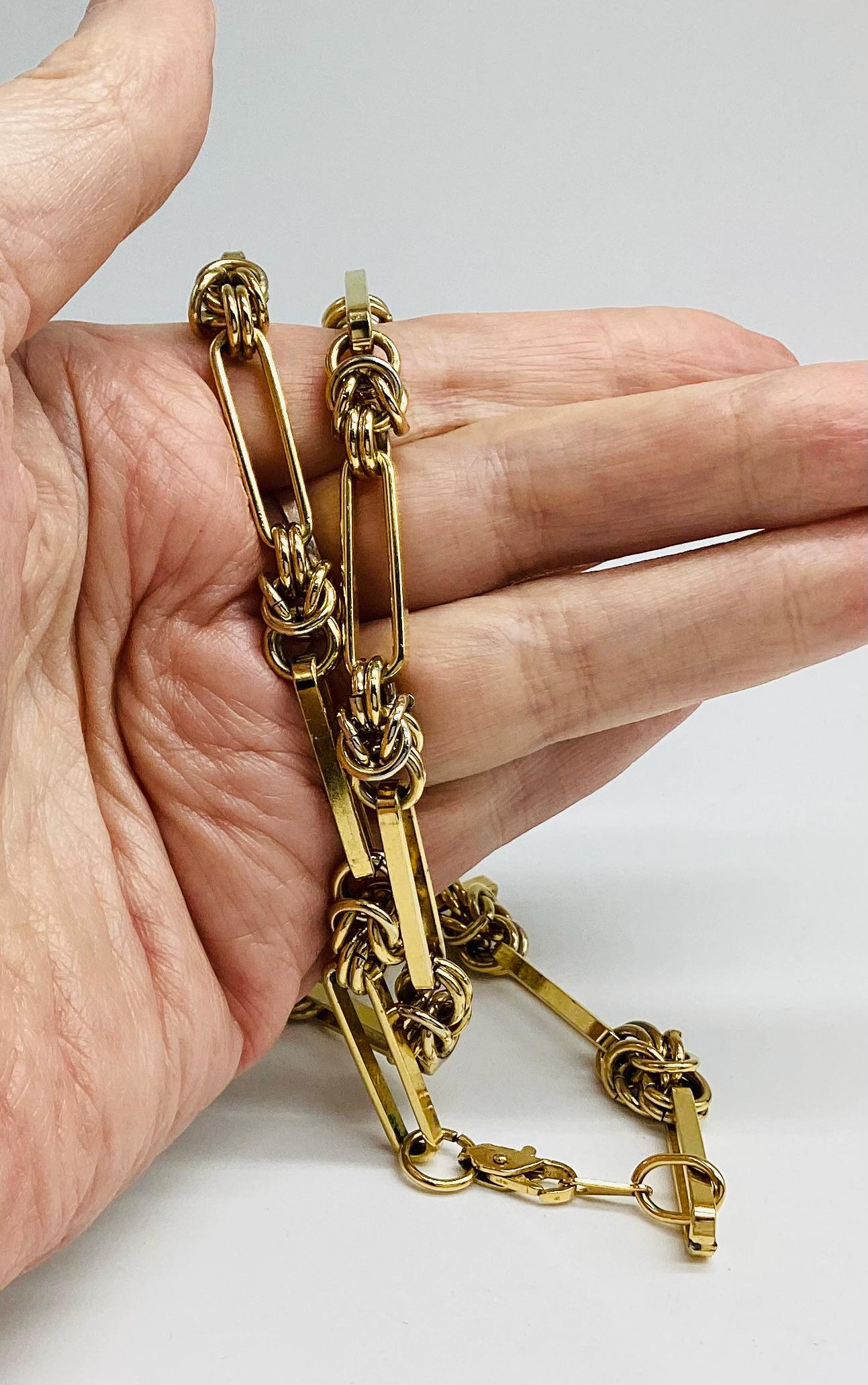 Super sophisticated Bergdorf Goodman chain open link gold plated and 24 inches long. Like many fashion houses of the 1980s, the company launched a collection of costume jewellery. These were runway necklaces, brooches and earrings made by hand using gold plating, enamel, rhinestones, and Swarovski crystals. The classic 1980s design featuring fantastic mix of gold with black enamel. Noteworthy, the markings of 1980s jewellery, along with the copyright mark, included intertwined capital letters – the initials BG inside oval. Traditionally, the designers who worked for BG company used jewellery alloy of silver or gold tone, gold plating, enamel, crystals and rhinestones.