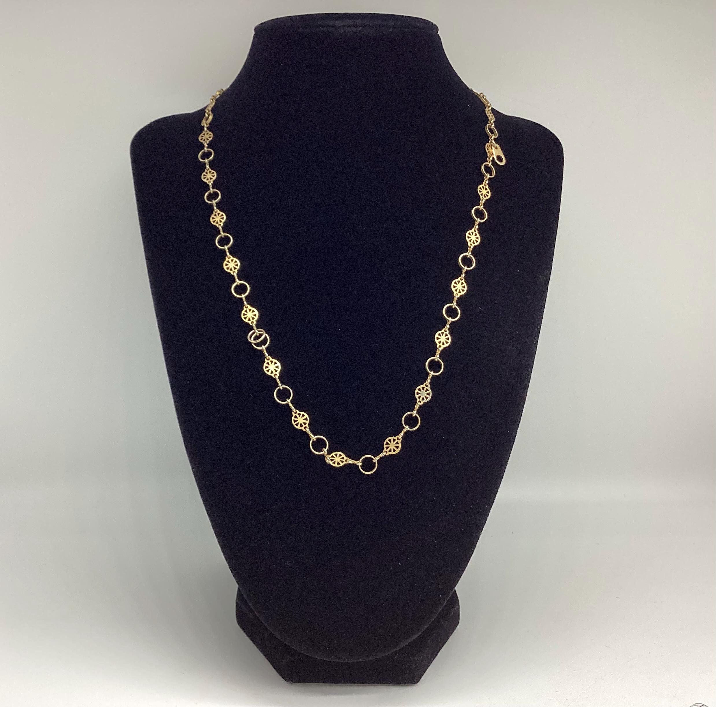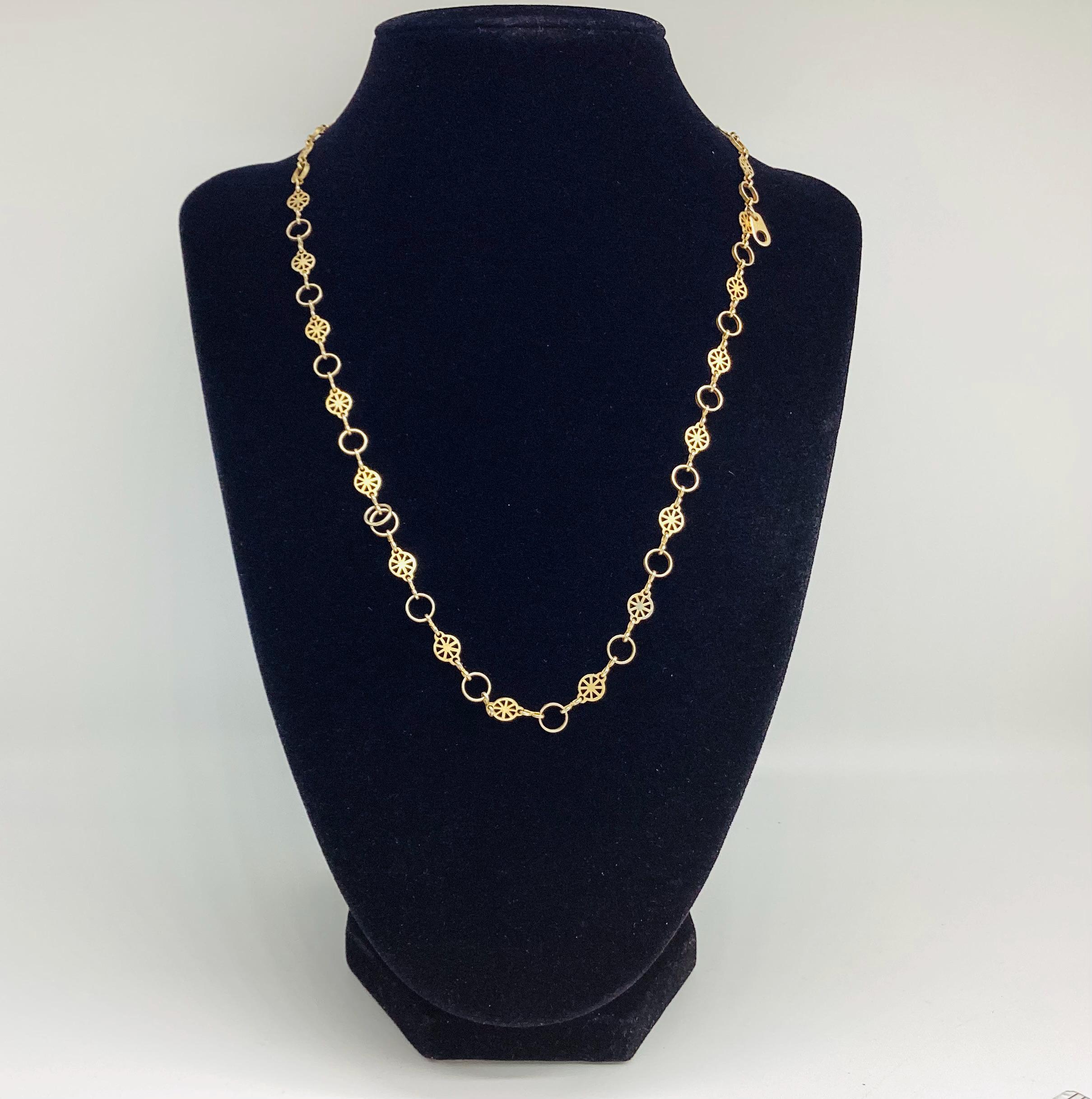My video shows two necklaces. You are only buying the one detailed below. A delightfully pretty vintage, signed Catherine Popesco chain. Filigree and rings linked make up a fine chain necklace that looks good worn alone or with other chains and beads.