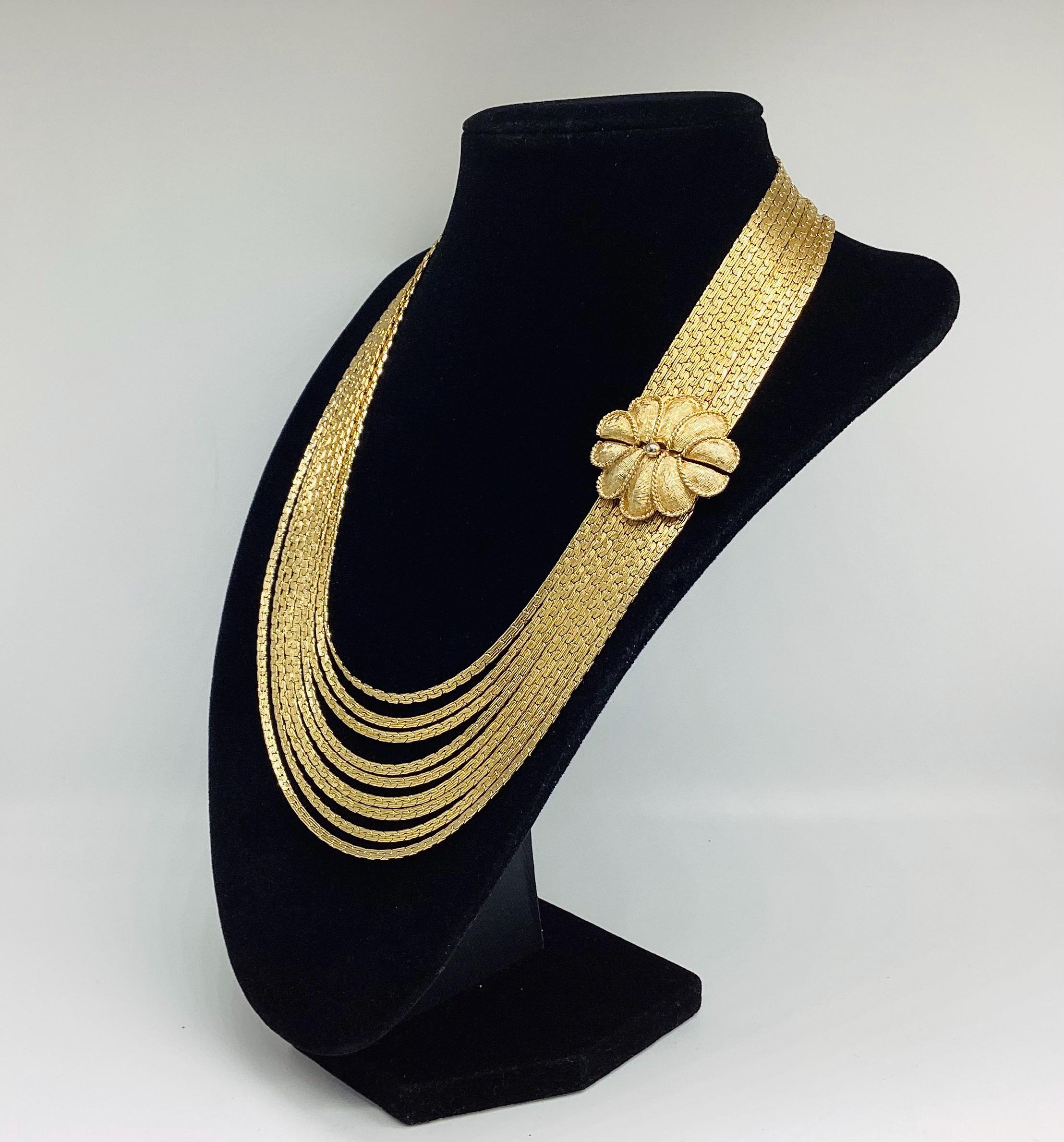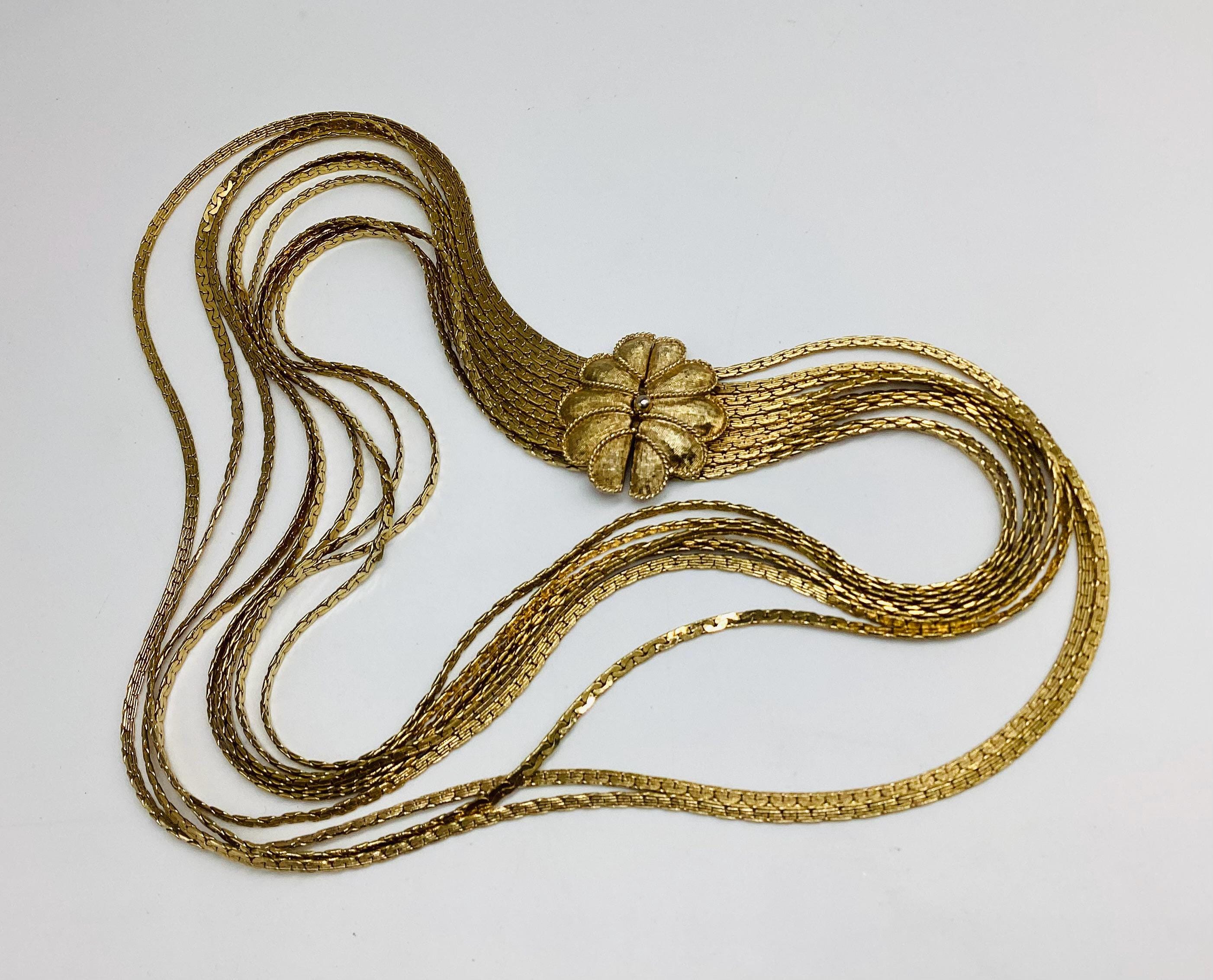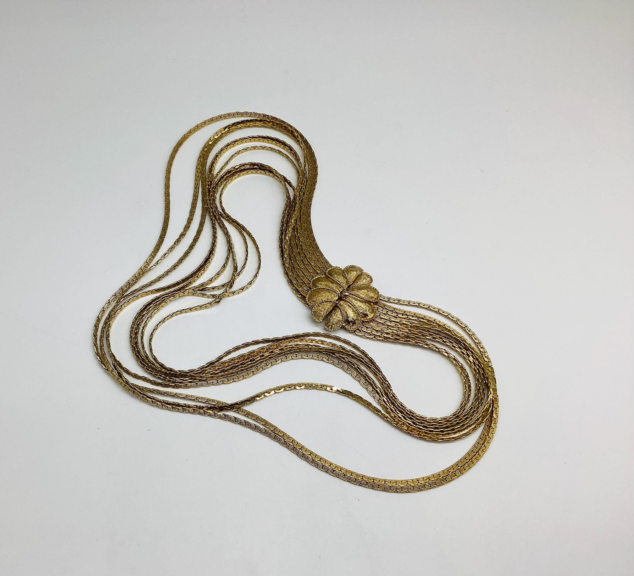 The necklace is constructed from multiple fine gold-tone chains, graduating gently and flowing across the neckline. At the centre sits a sculptural floral clasp, finely textured and softly domed, which acts as both a focal point and fastening. The quality and design are reminiscent of high-end European couture costume jewellery of the period.