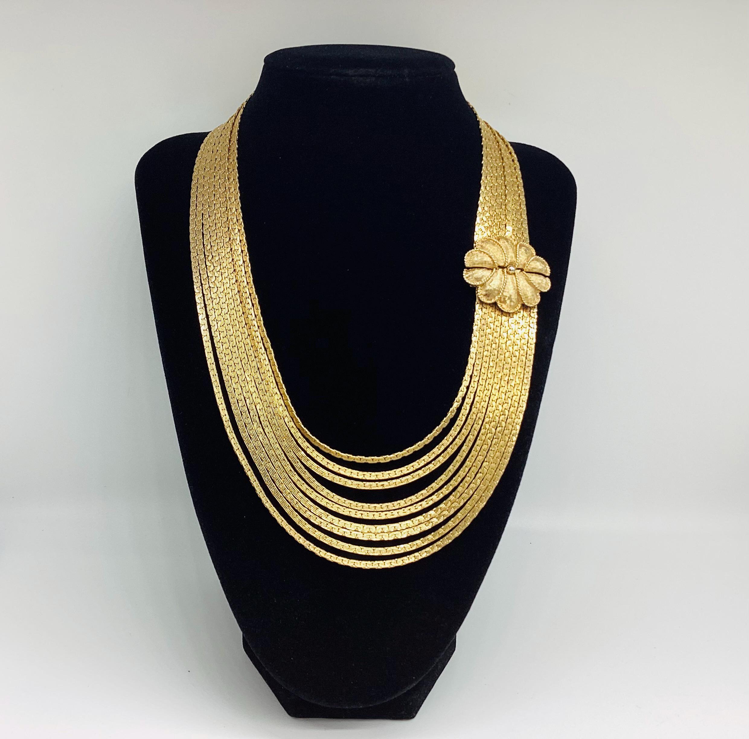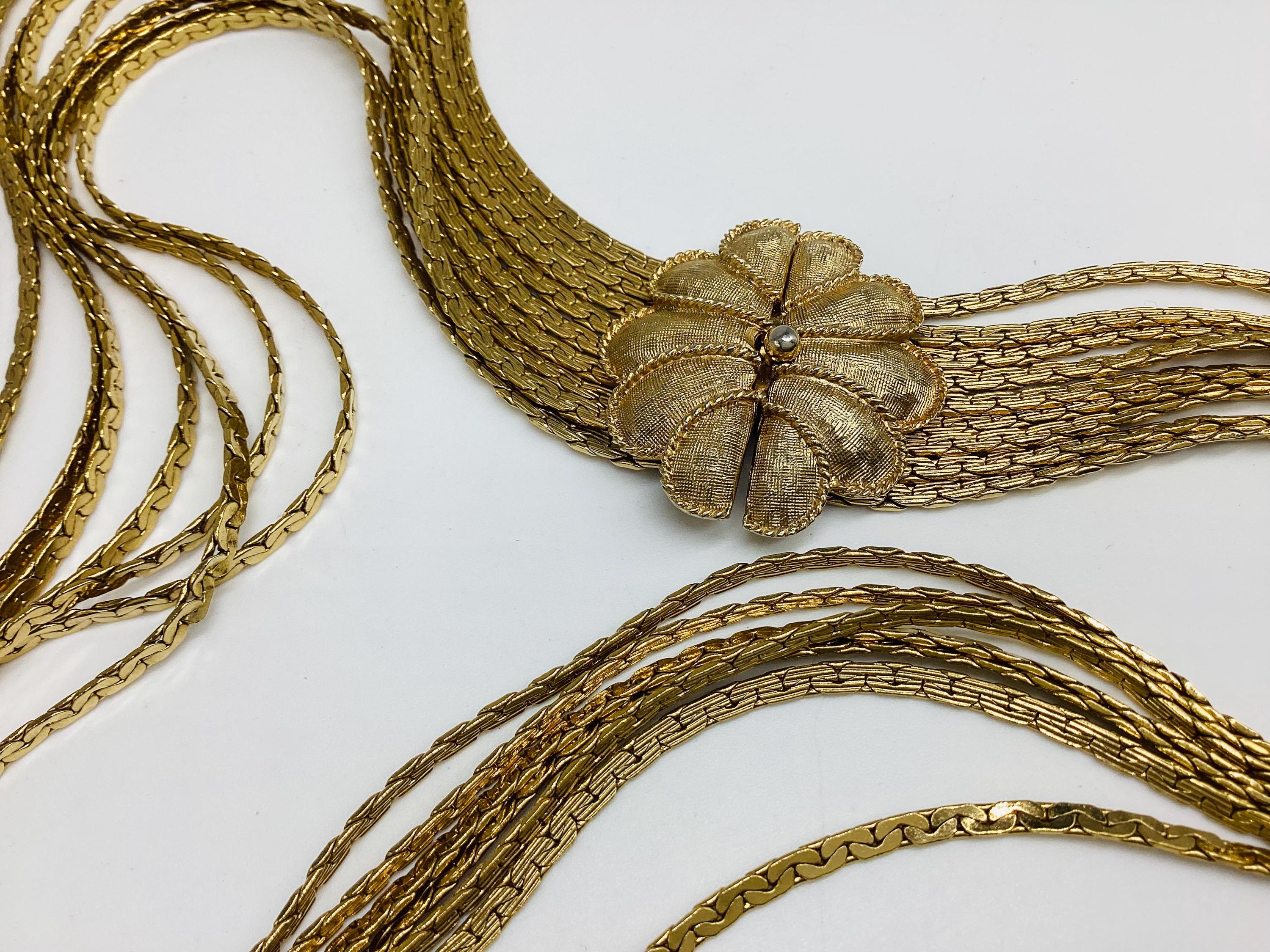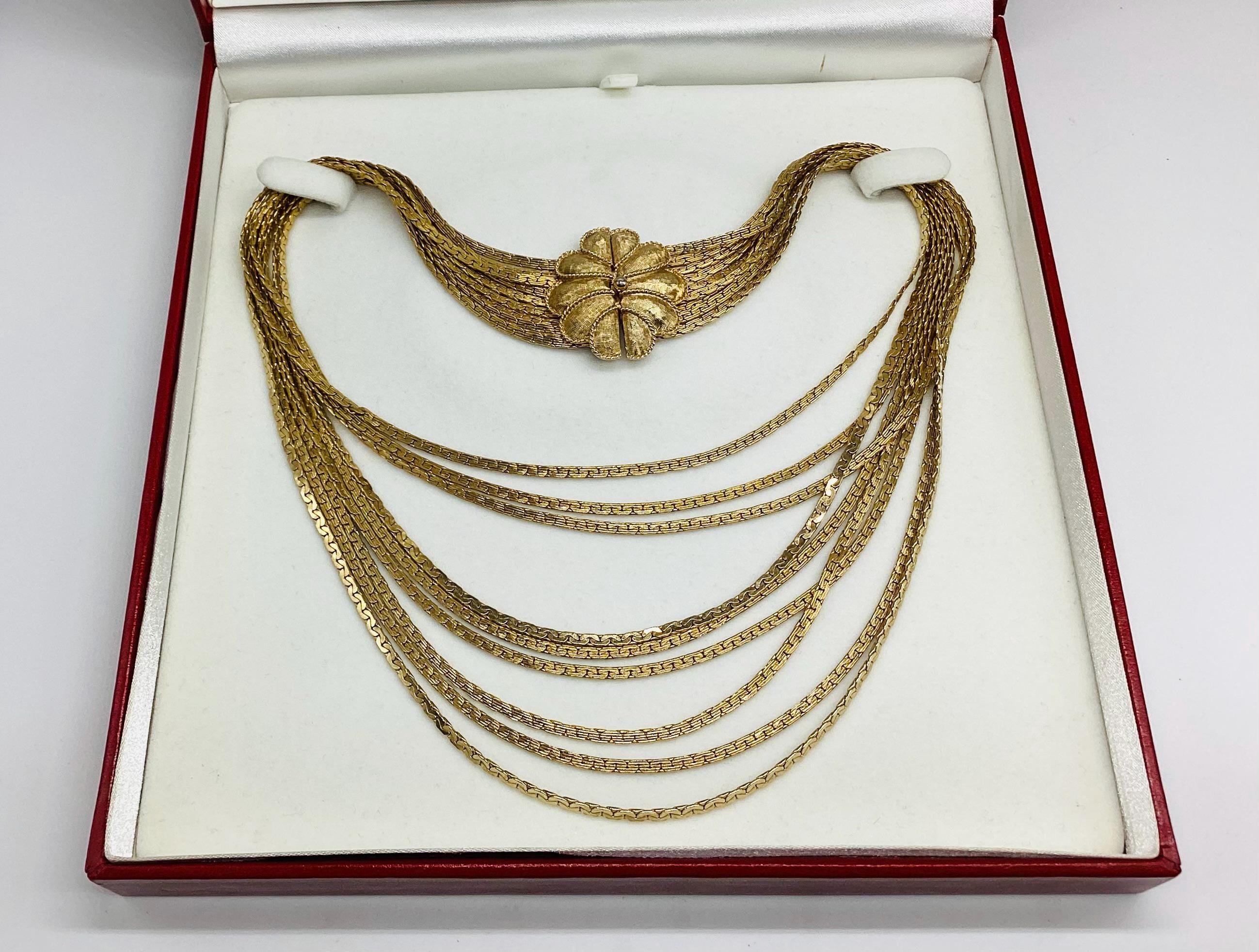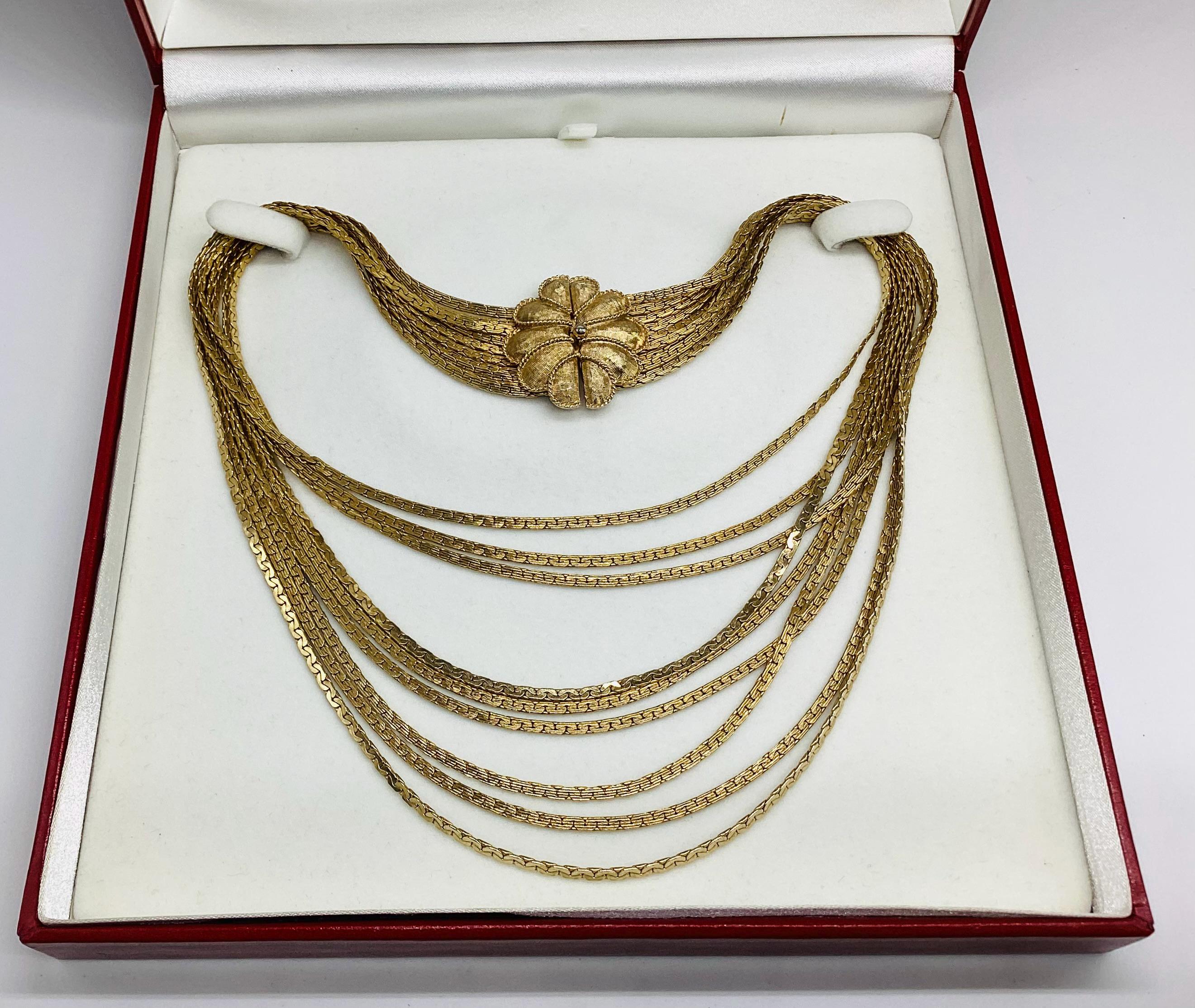 The necklace is constructed from multiple fine gold-tone chains, graduating gently and flowing across the neckline. At the centre sits a sculptural floral clasp, finely textured and softly domed, which acts as both a focal point and fastening. The quality and design are reminiscent of high-end European couture costume jewellery of the period.