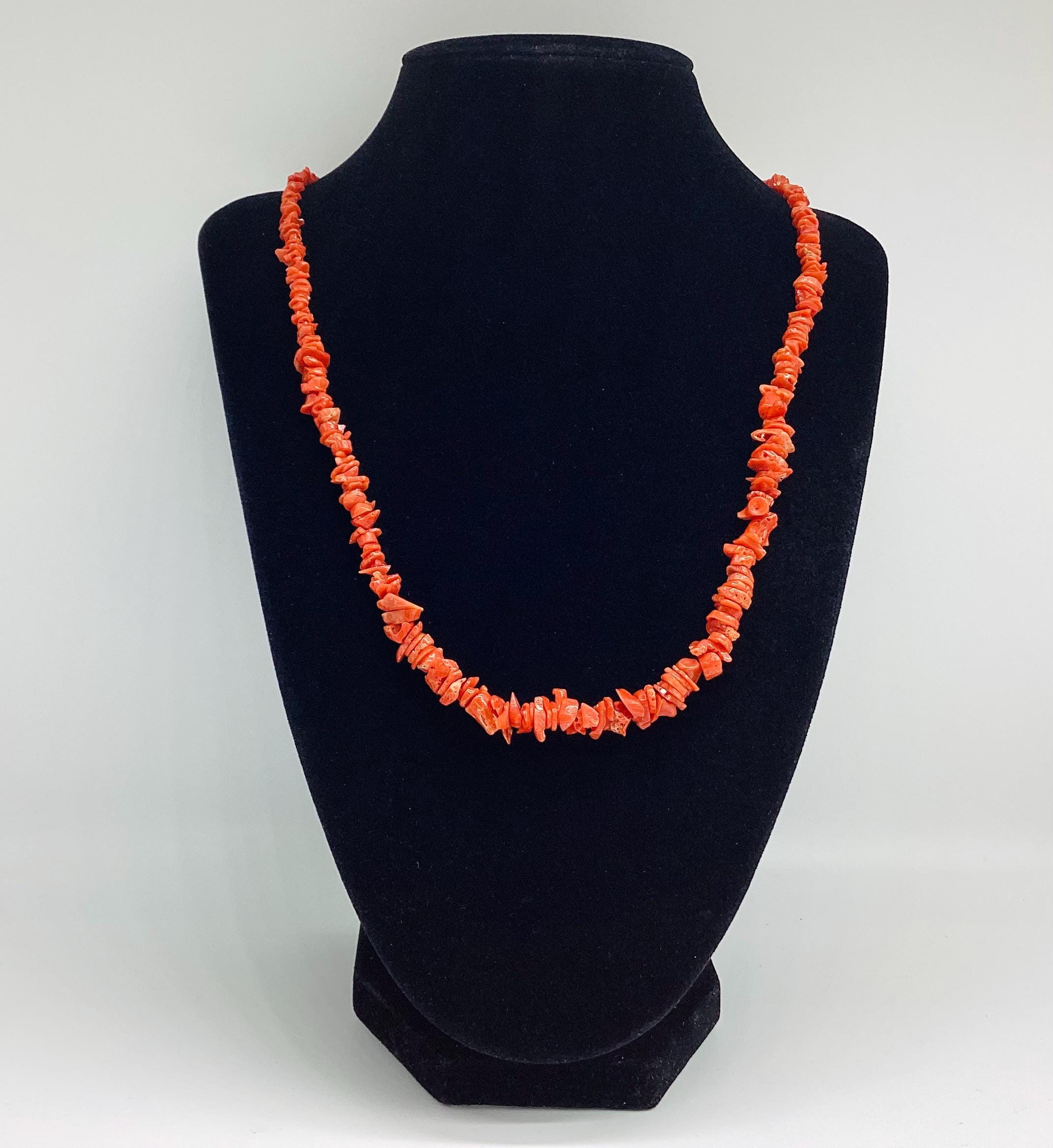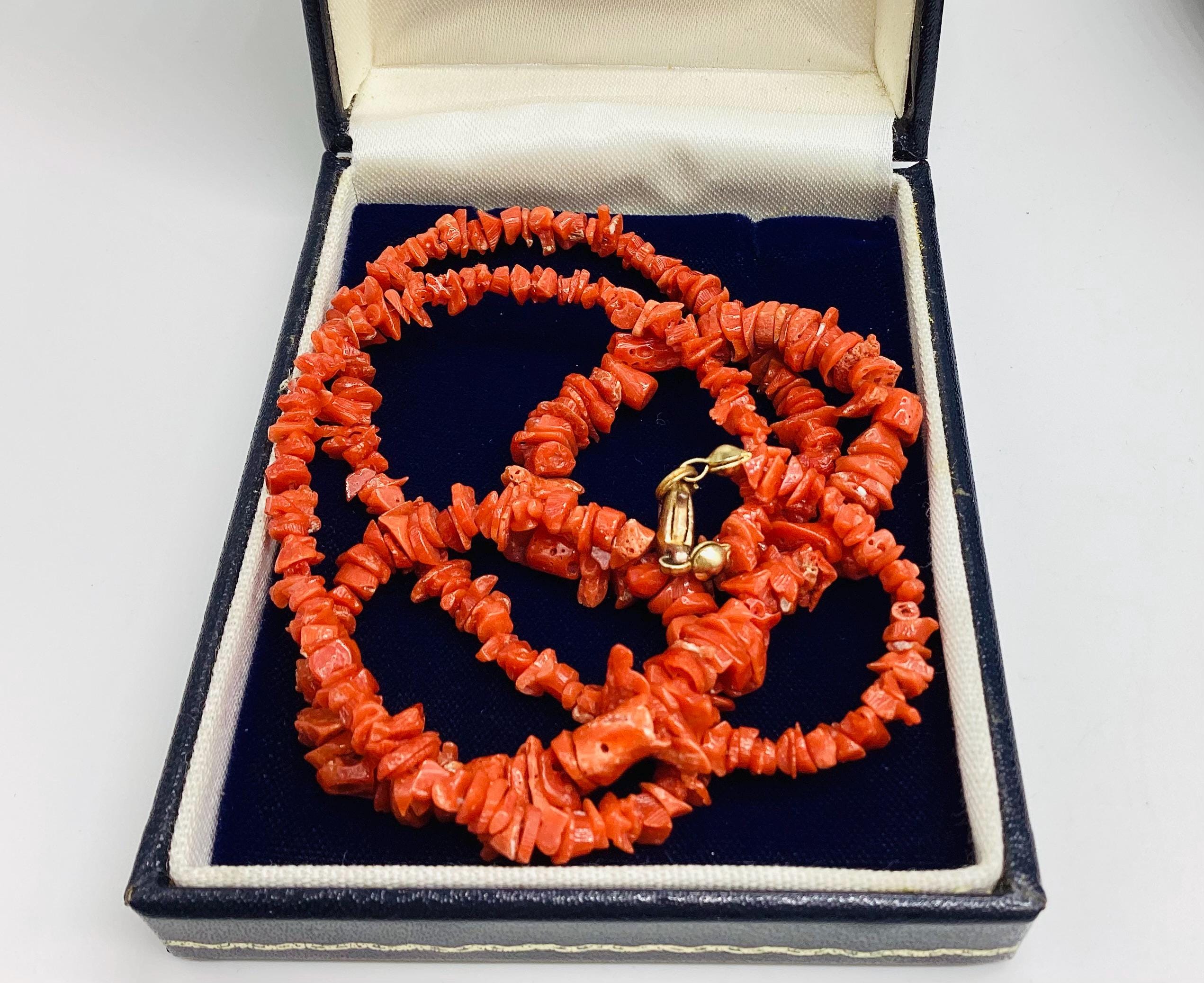 A very pretty rope necklace of graduated Mediterranean red coral. Natural and undyed. Matinee length. 35th Wedding Anniversary