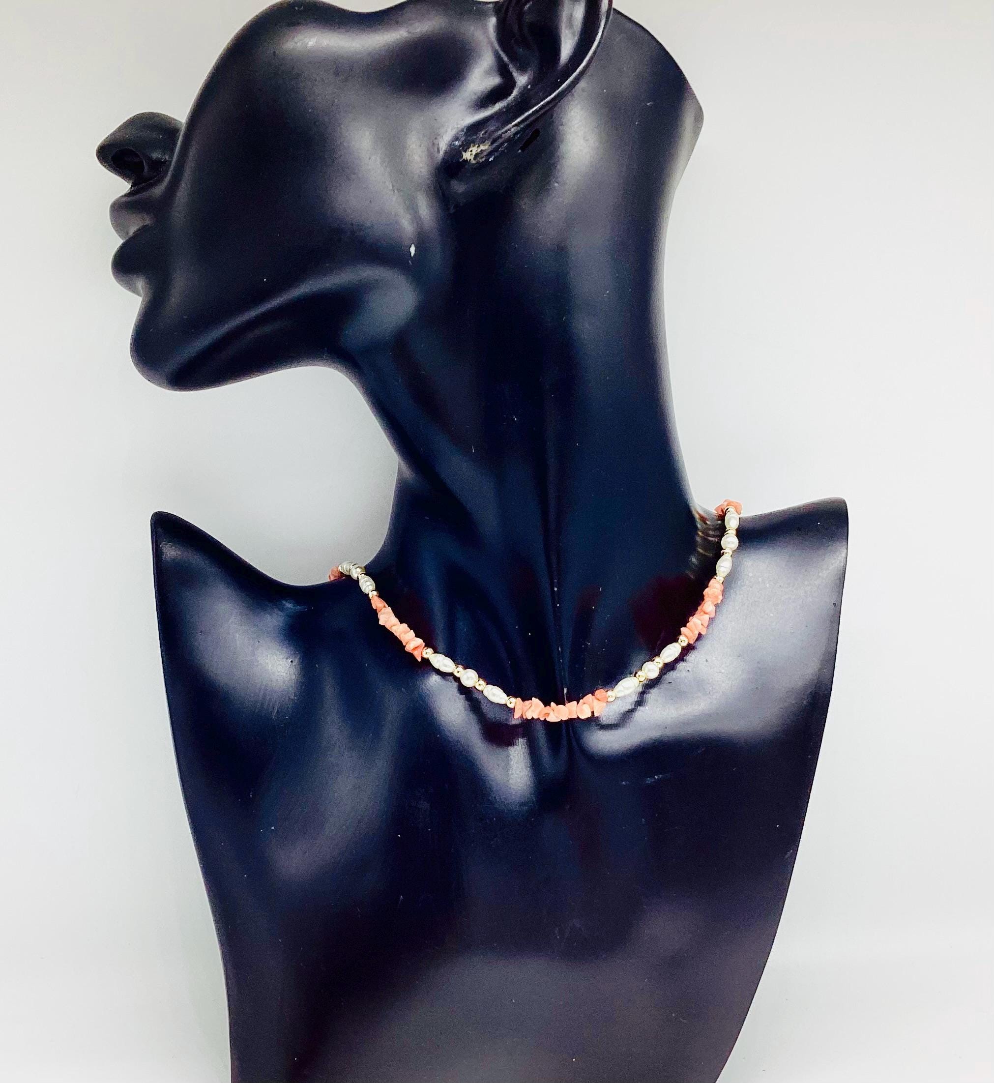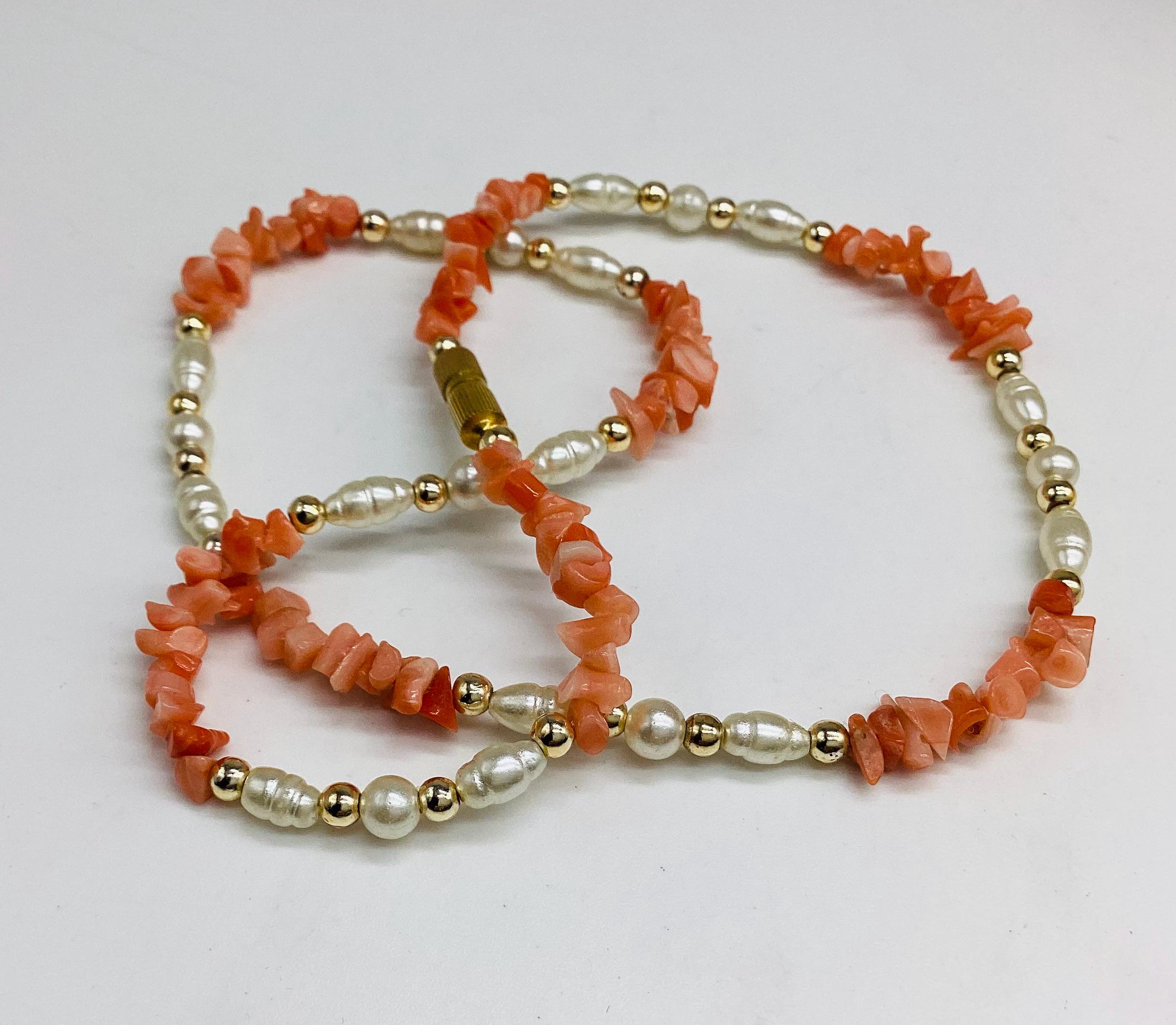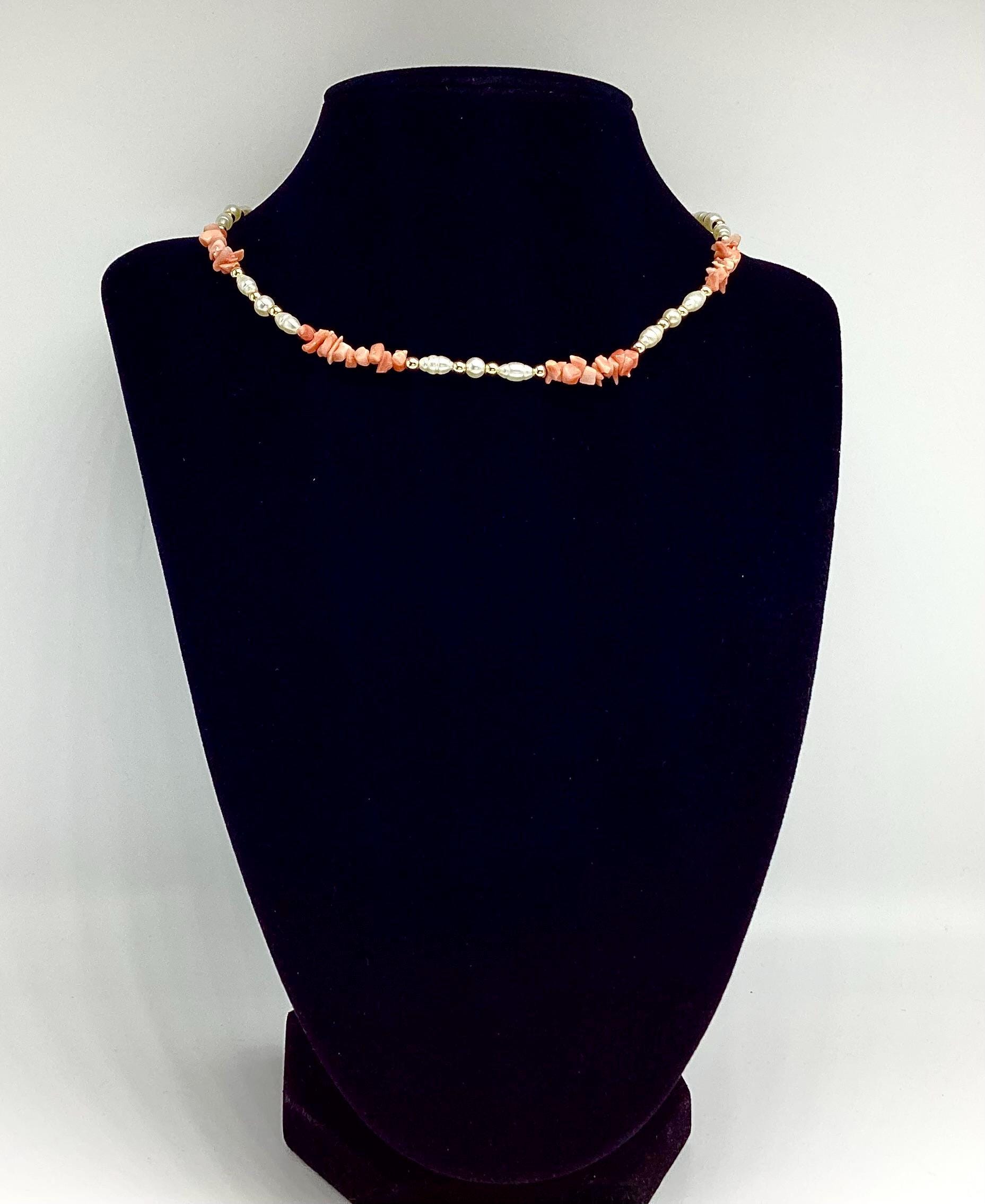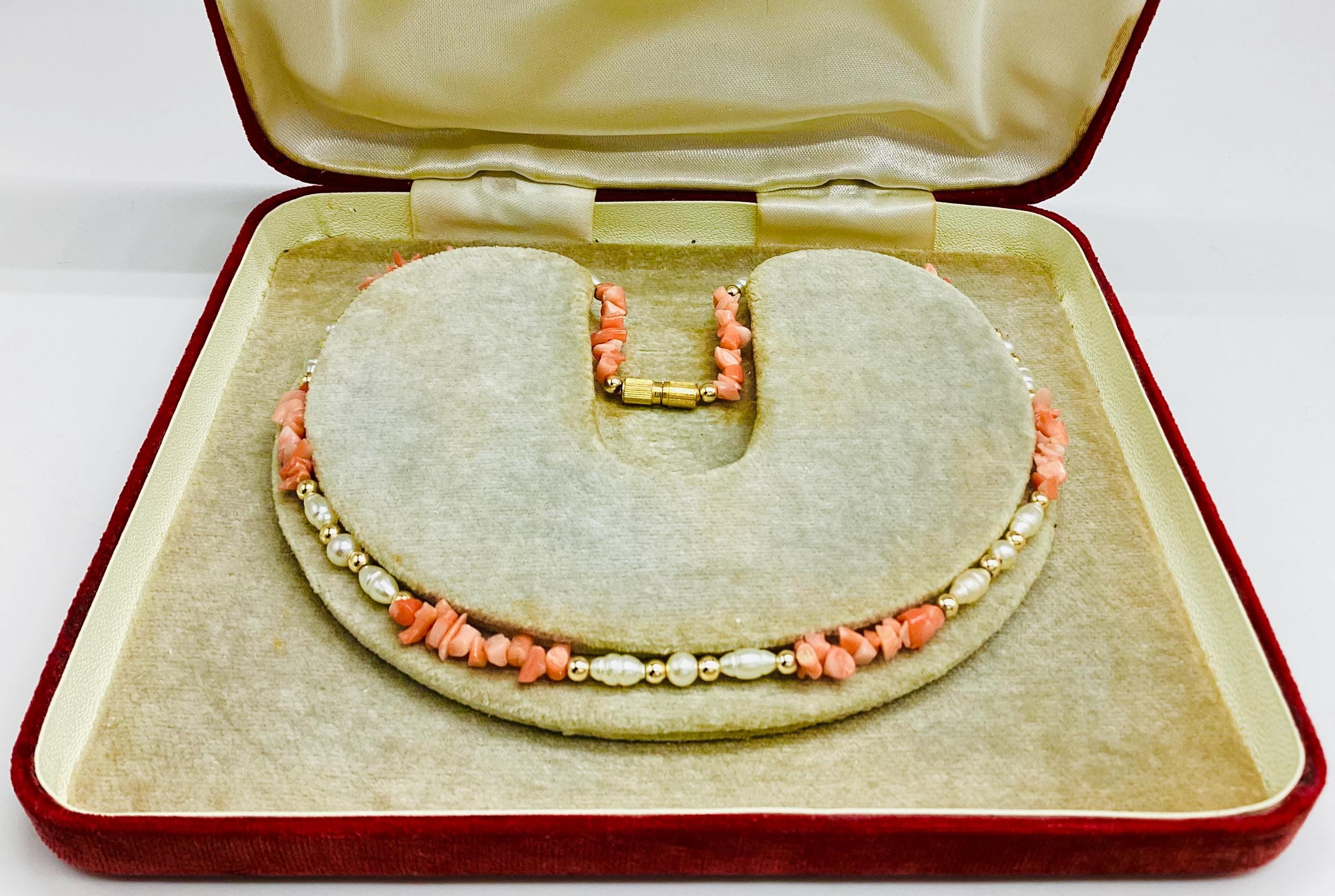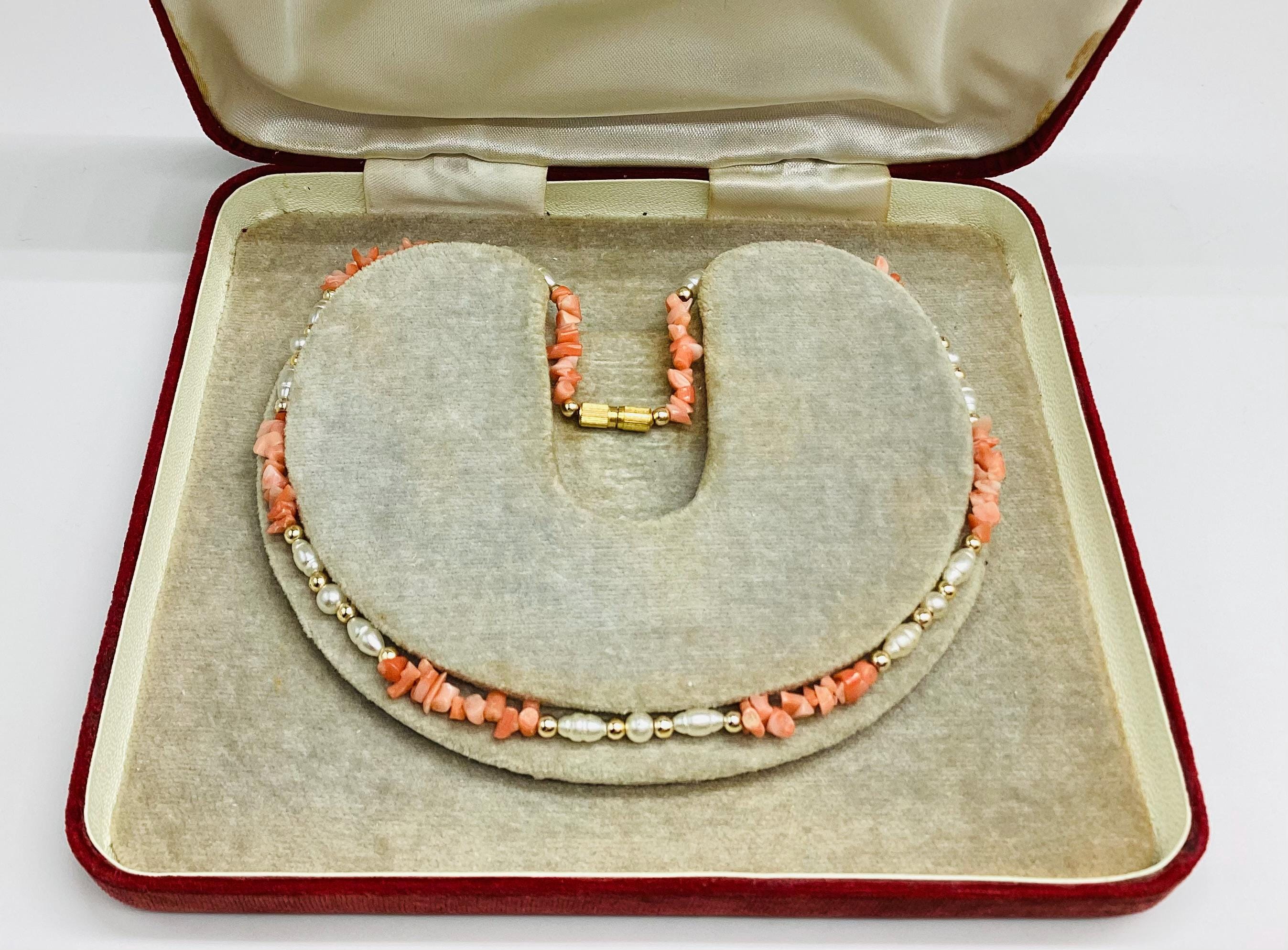 A delightfully pretty necklace. Pearl beads with gold and Angel skin coral. These super necklaces were very popular during the forties and fifties as the first piece of proper jewellery for girls or teenagers and I love this idea. Also perfect for wedding or bridesmaid jewellery.