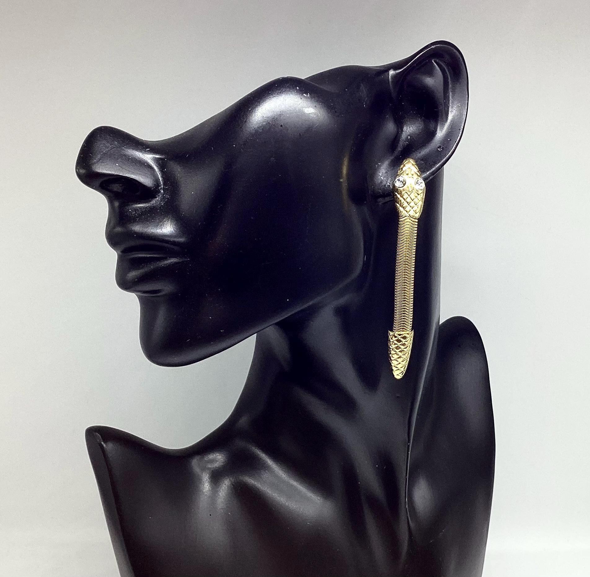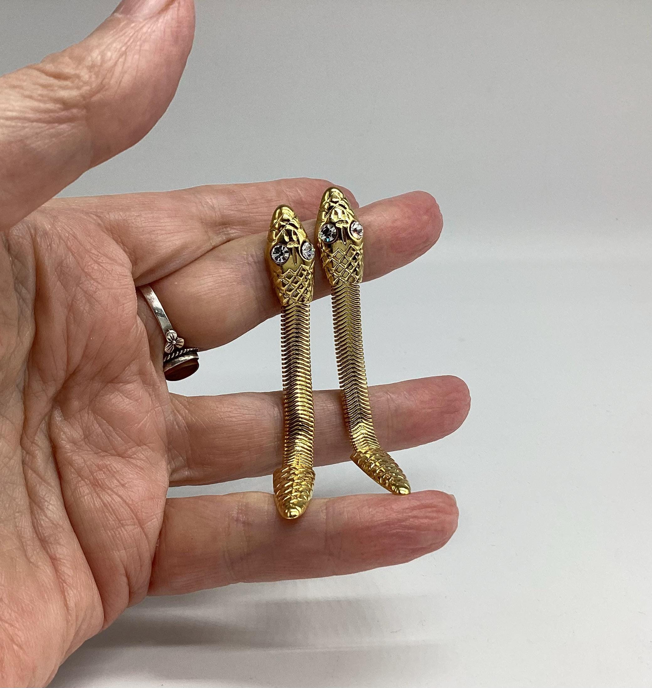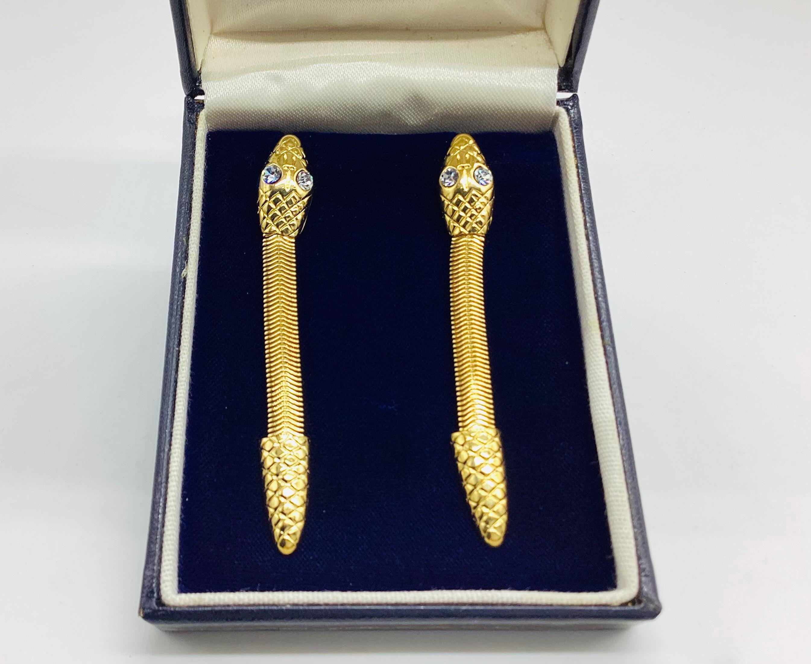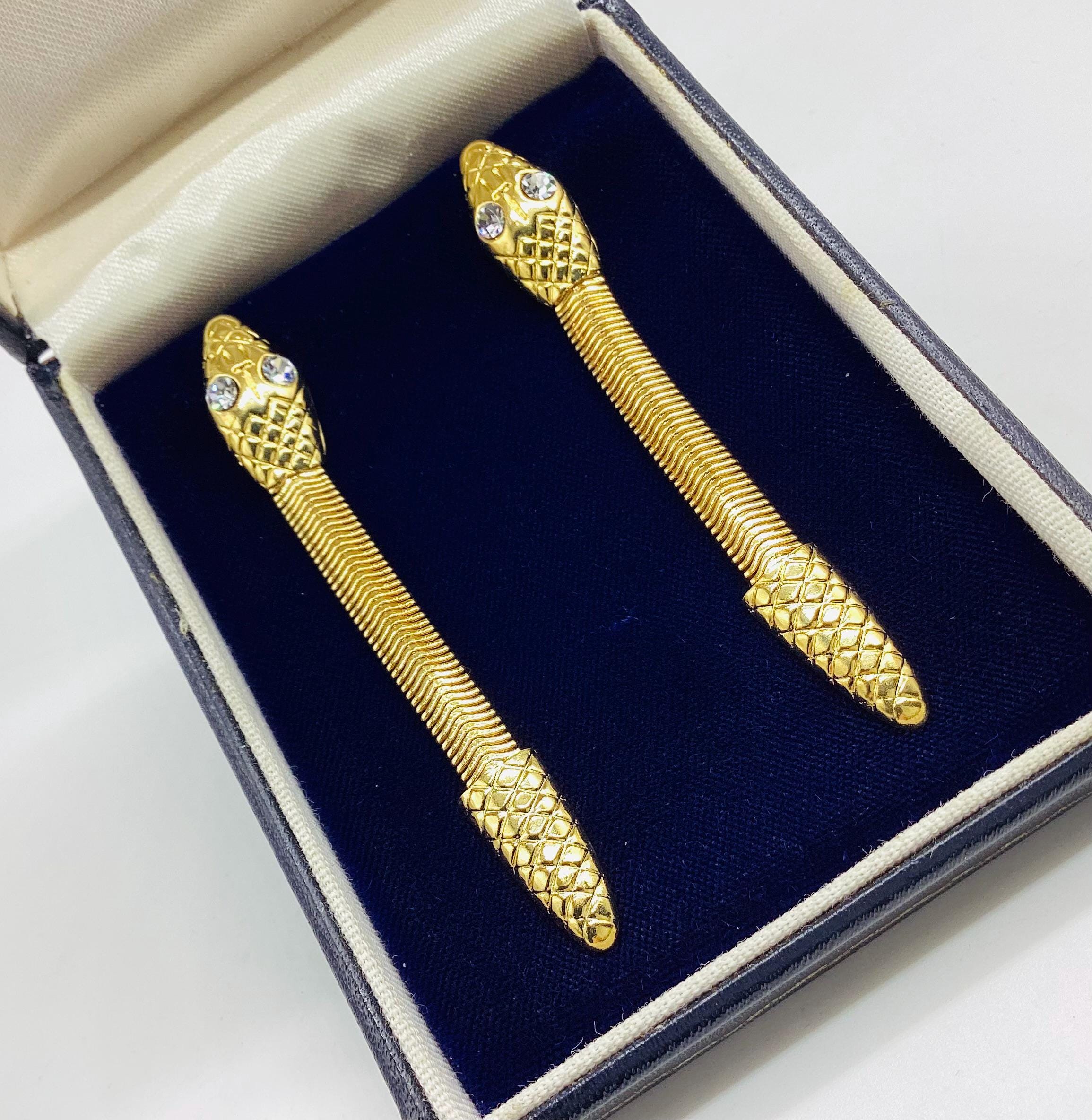 These long drop gold tone snake earrings with bright sparkling crystal eyes are a striking piece of retro jewellery. Fabulous articulated bodies wiggle and shimmer with the least movement. A really eye catching piece of 1980s Egyptian revival jewellery.