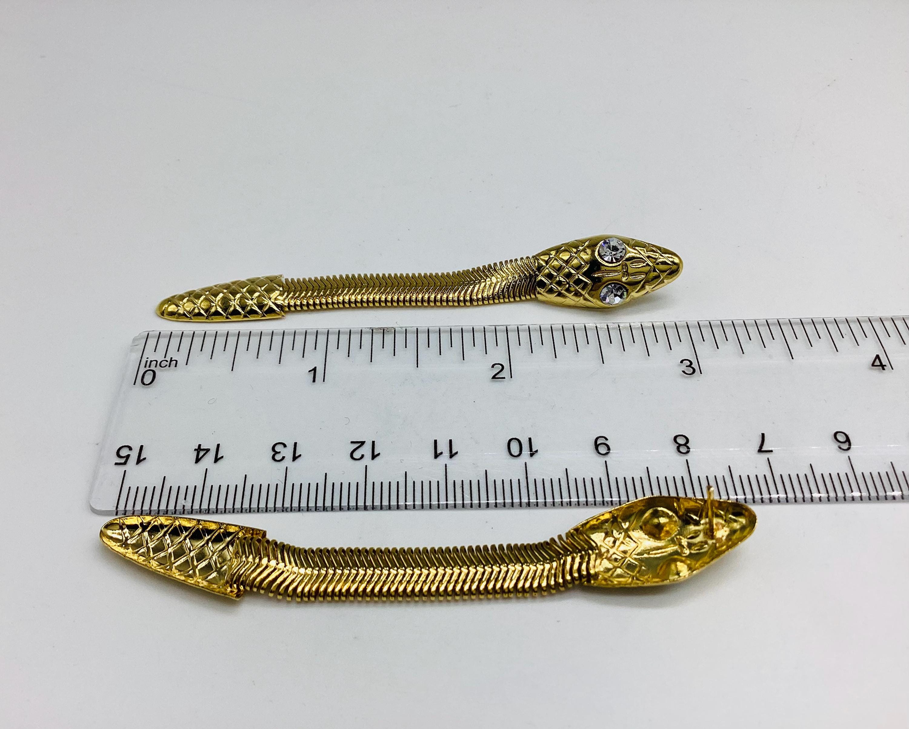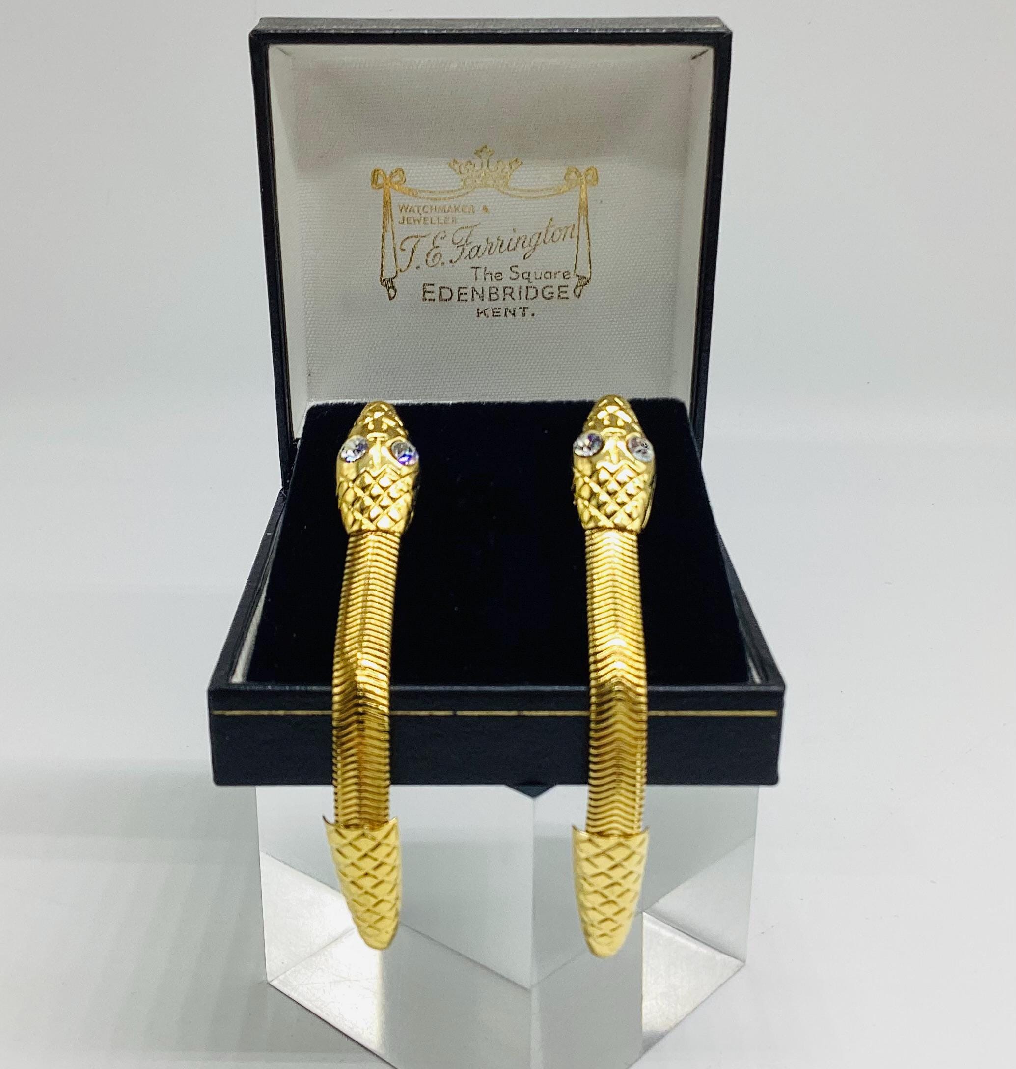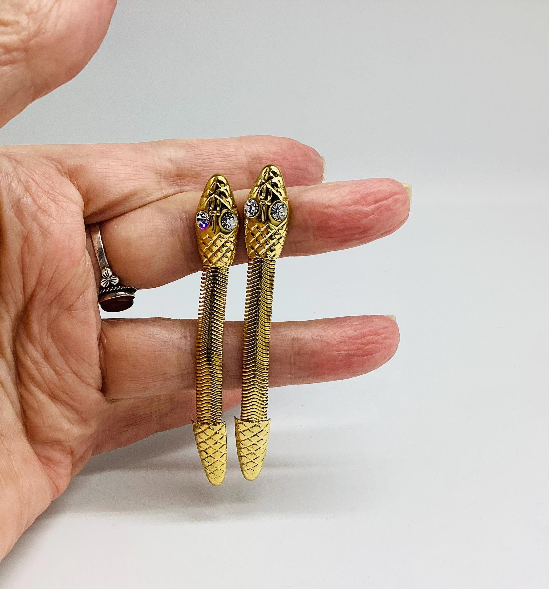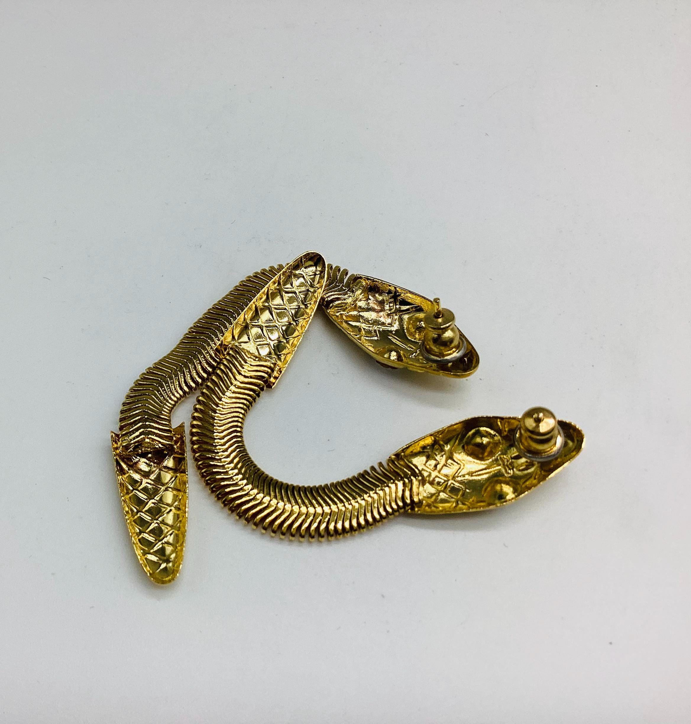 These long drop gold tone snake earrings with bright sparkling crystal eyes are a striking piece of retro jewellery. Fabulous articulated bodies wiggle and shimmer with the least movement. A really eye catching piece of 1980s Egyptian revival jewellery.