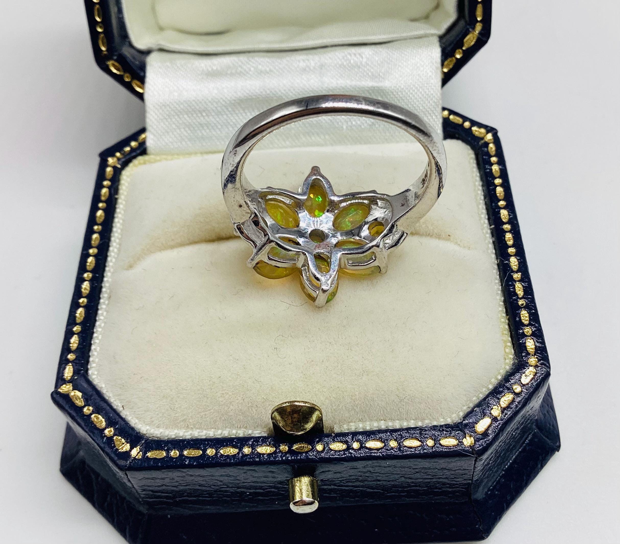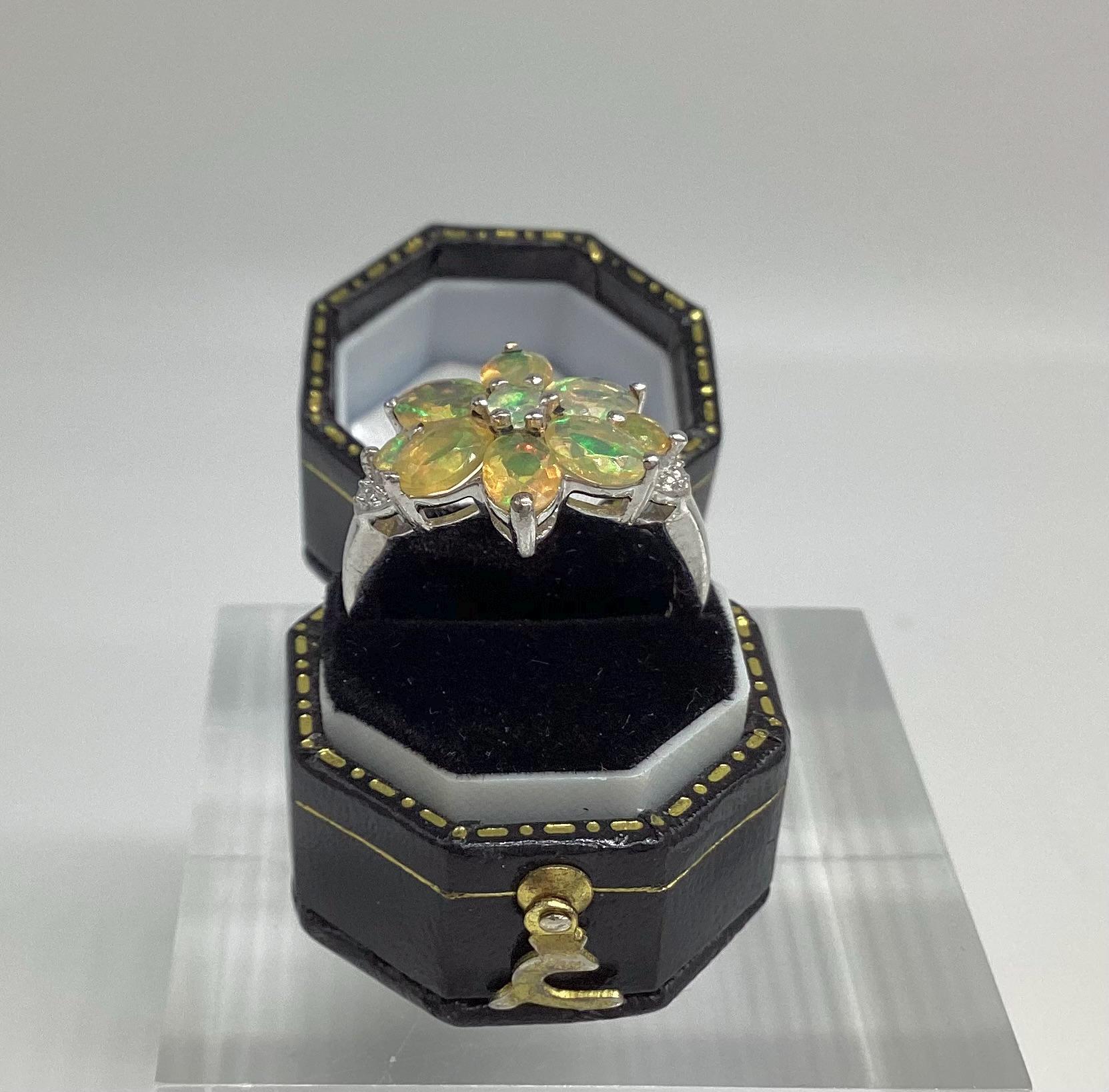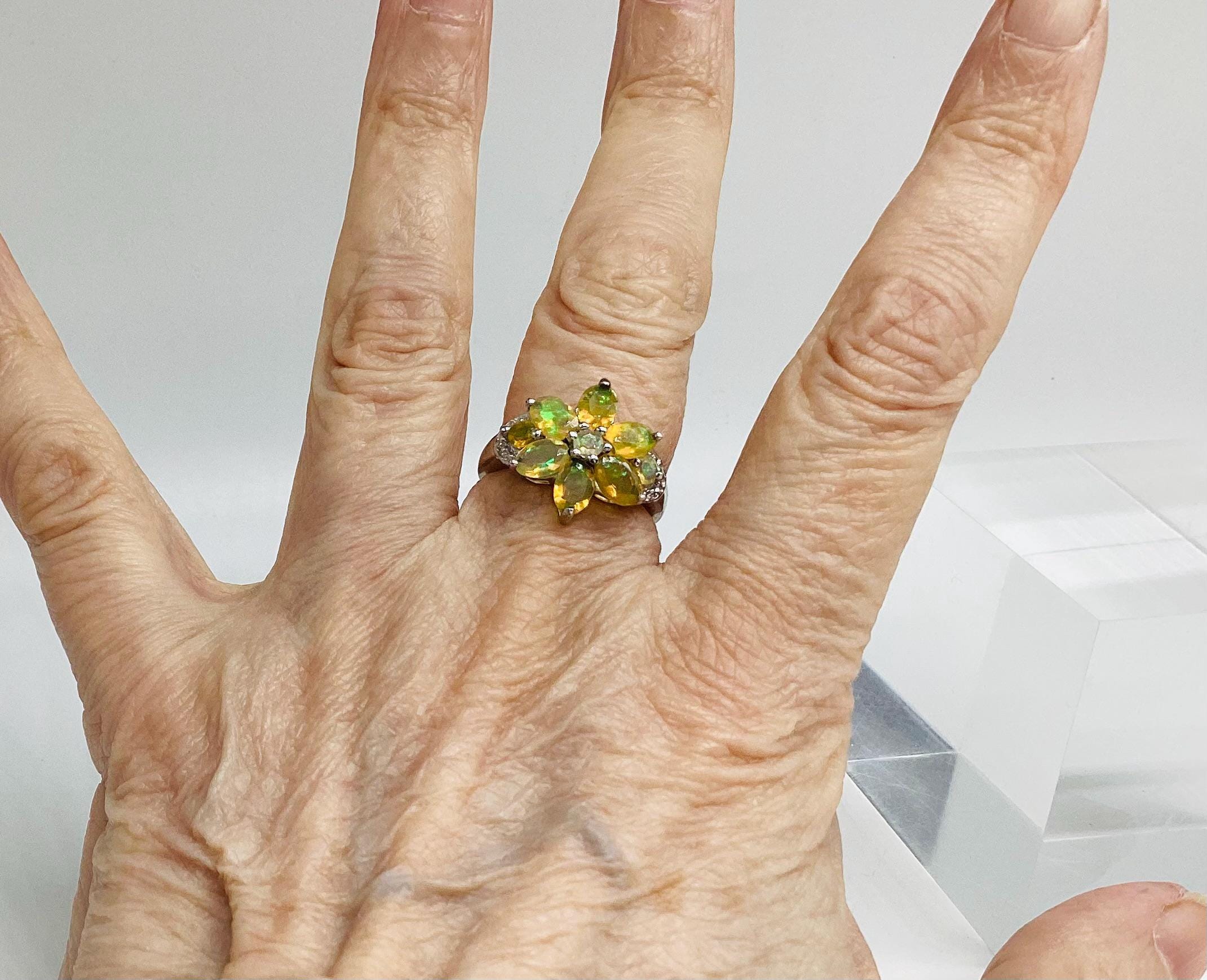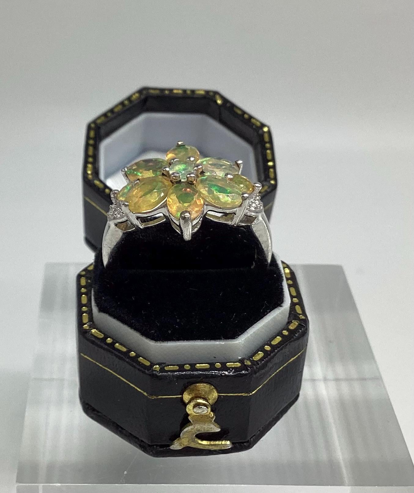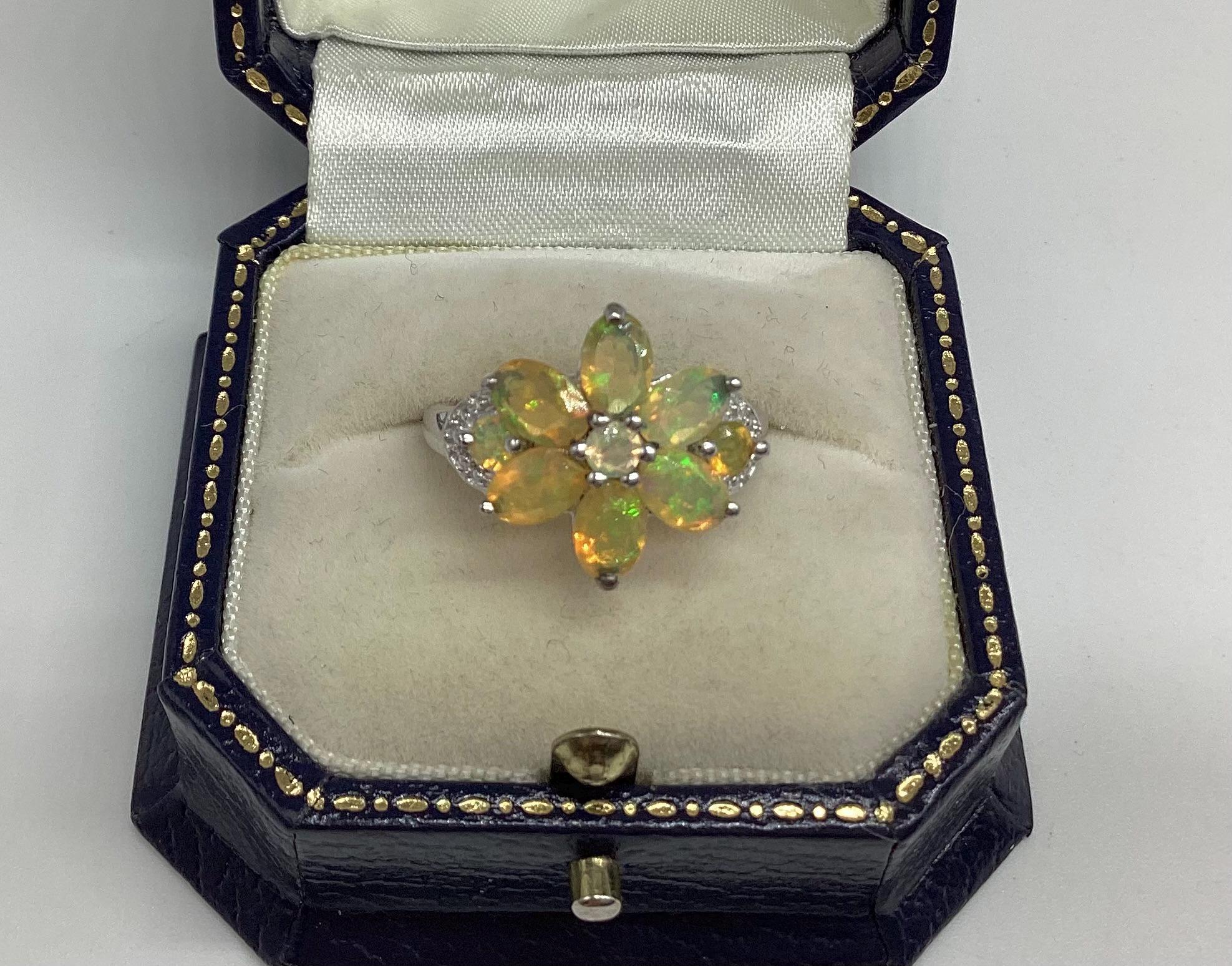 Solid silver setting and band set with super sparkling fire opals in a delightful daisy flower ring. The birthstone for October.
