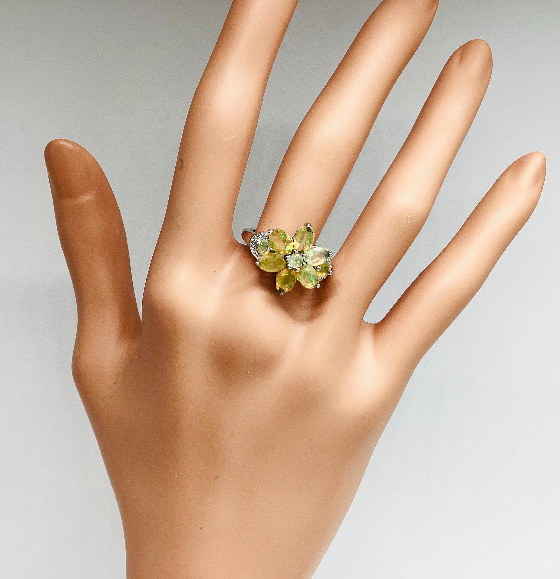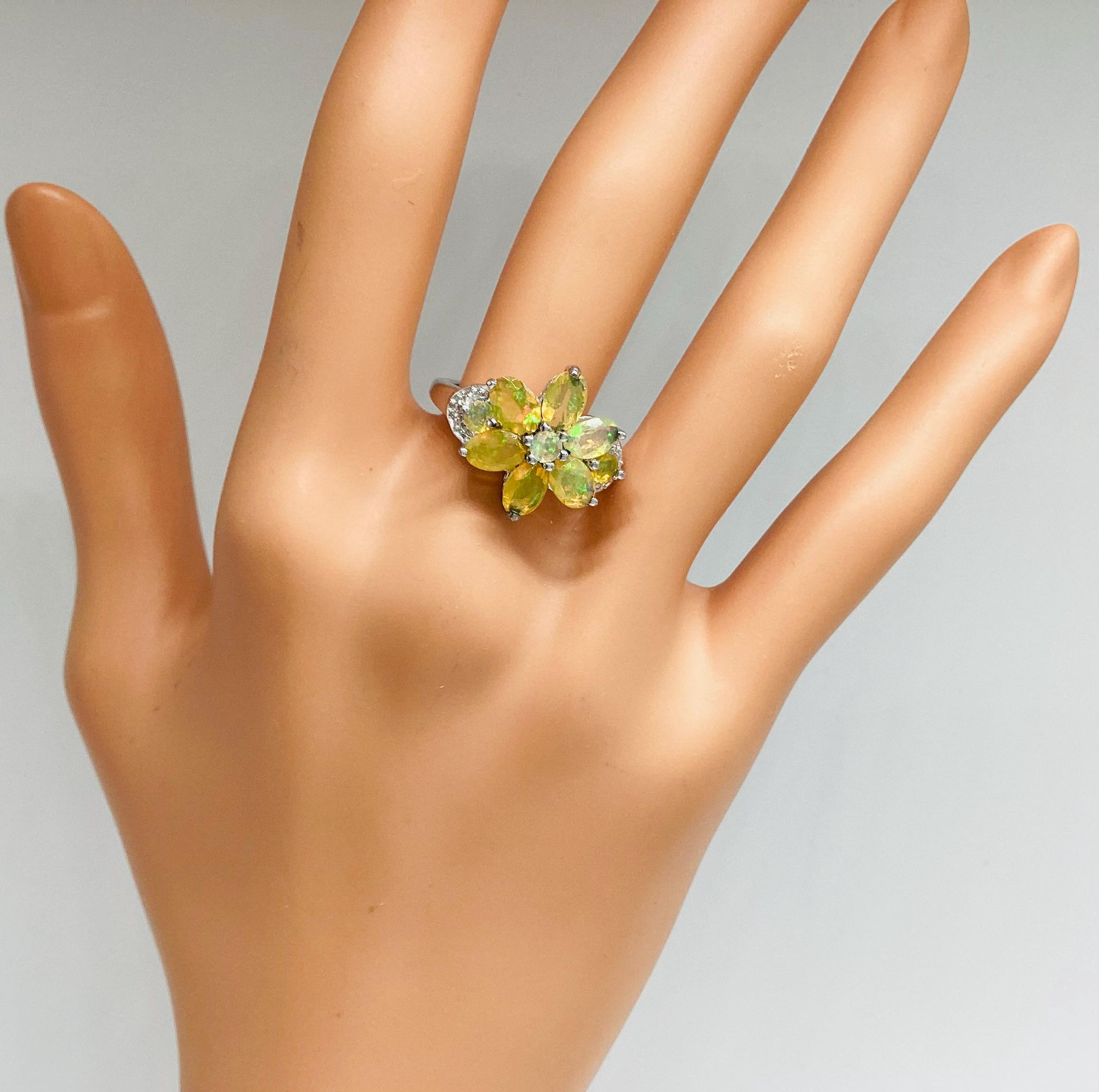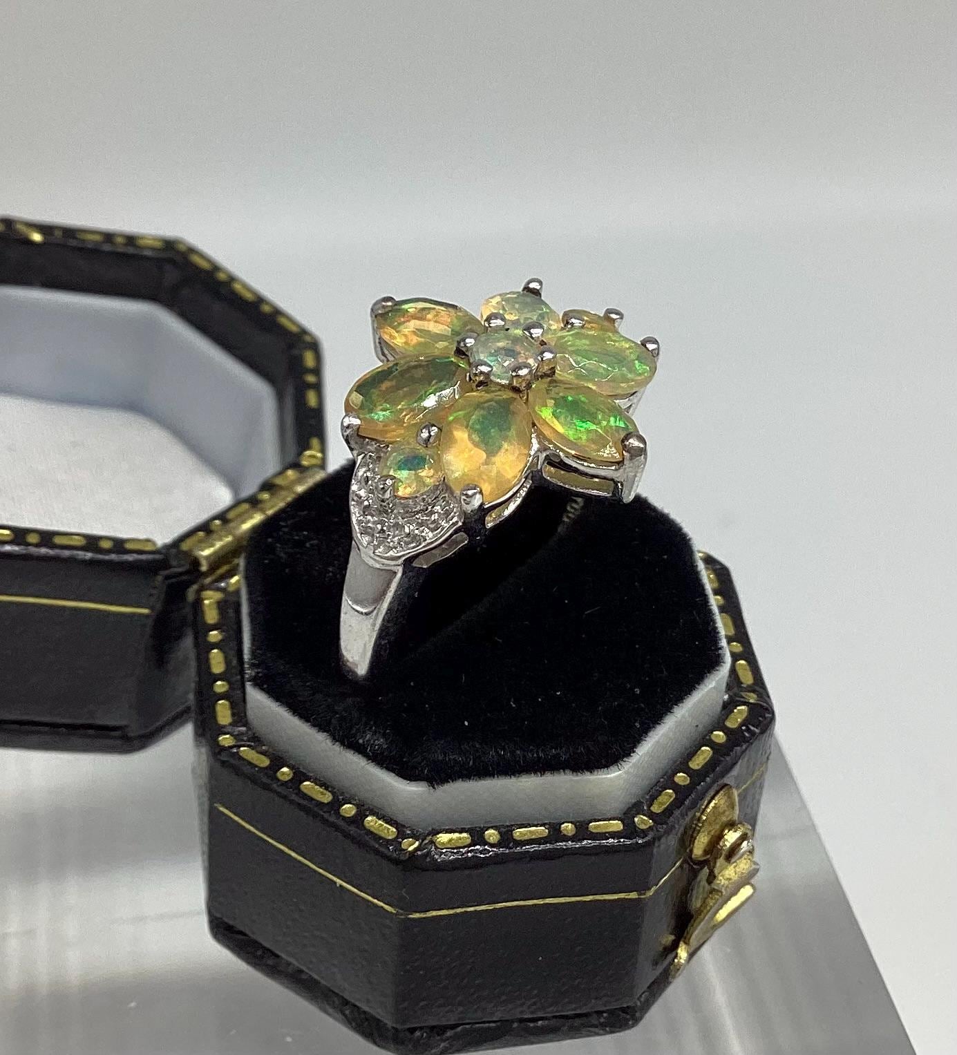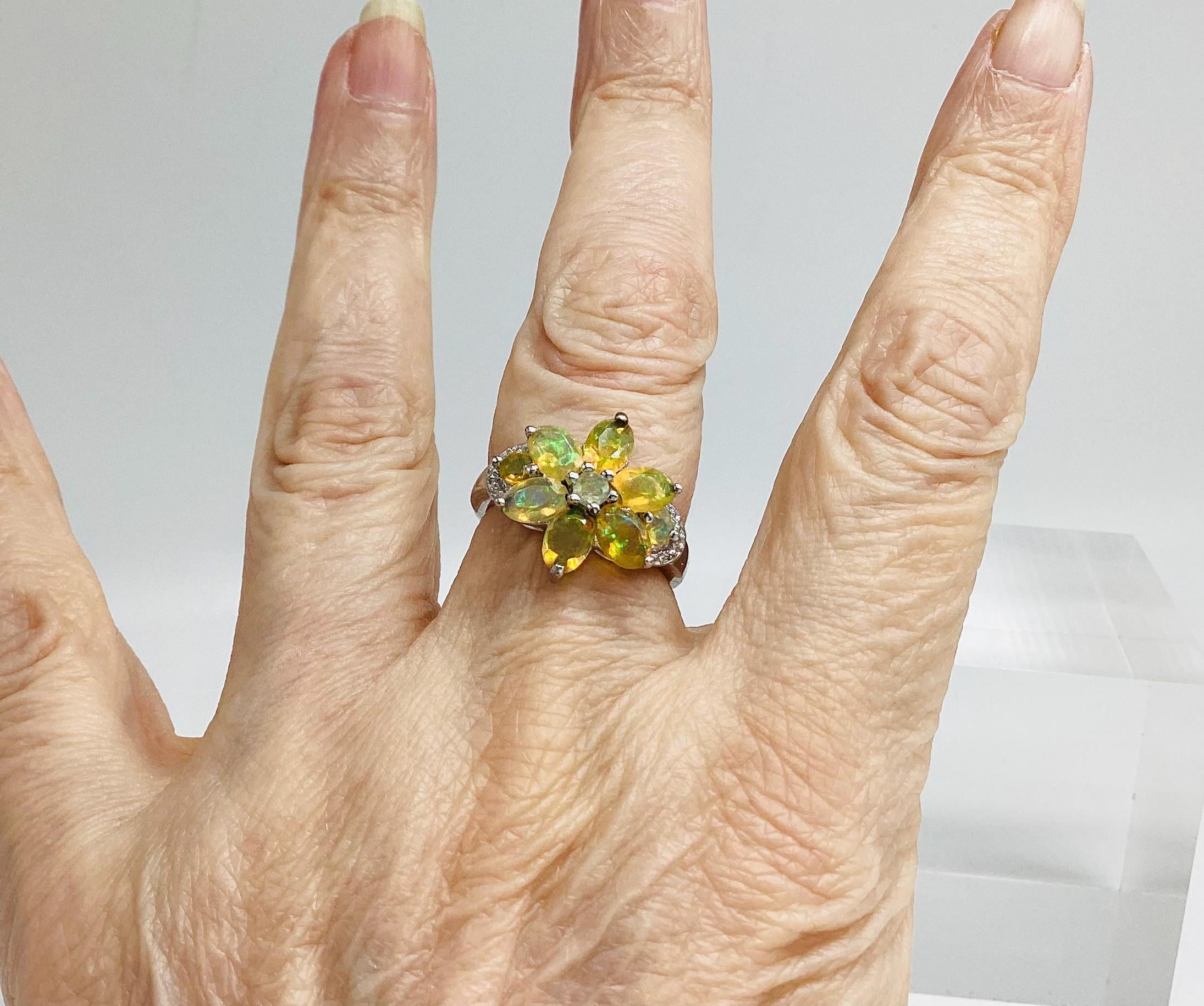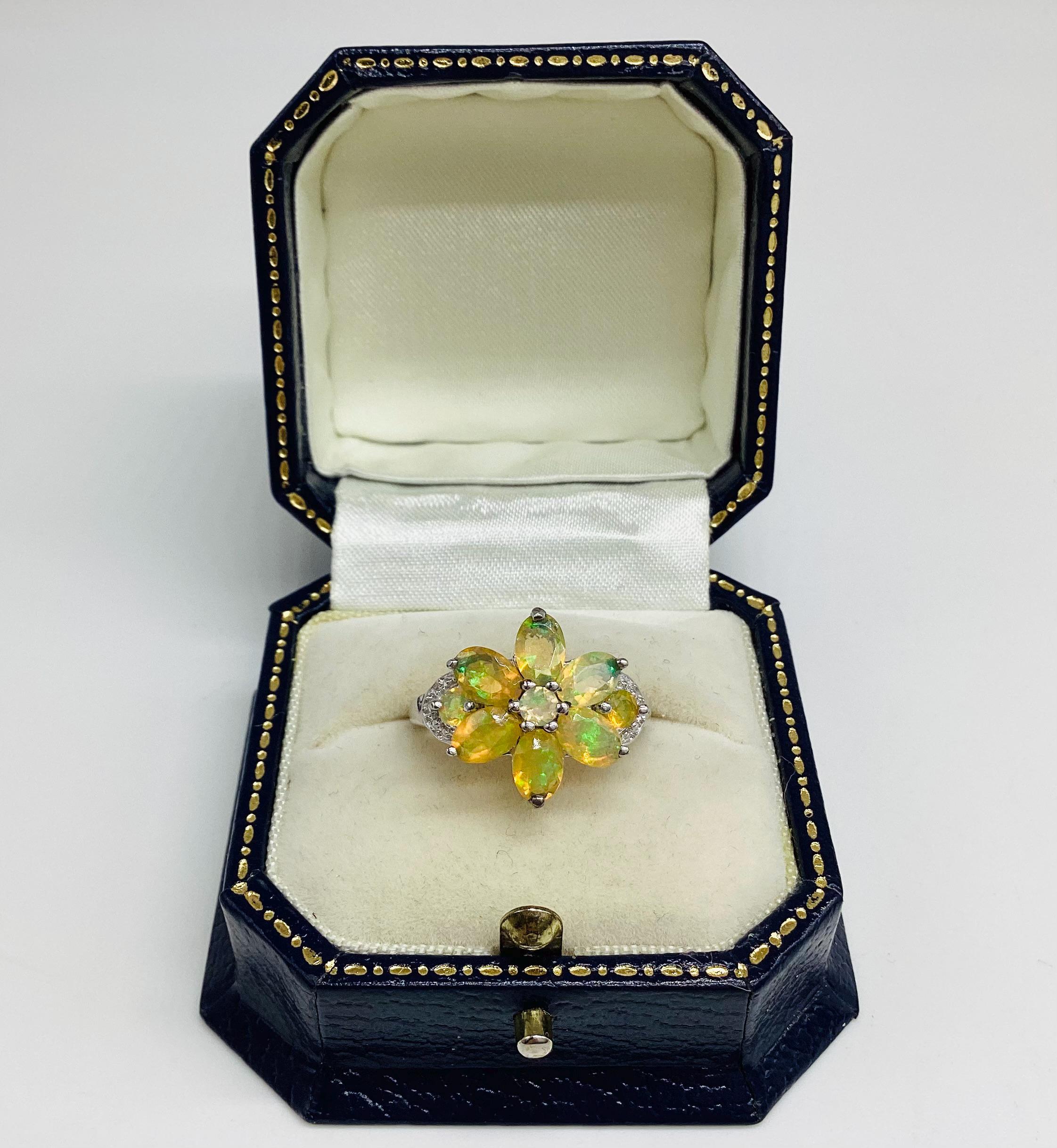 Solid silver setting and band set with super sparkling fire opals in a delightful daisy flower ring. The birthstone for October.