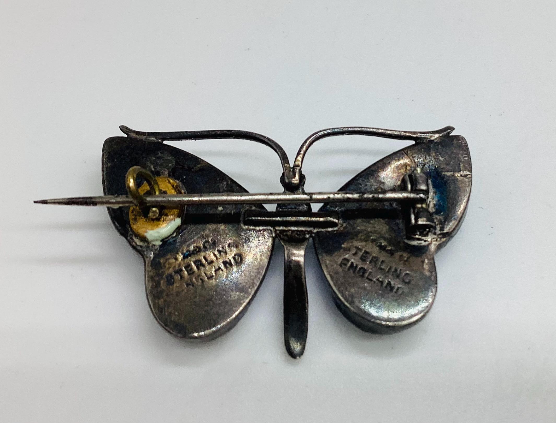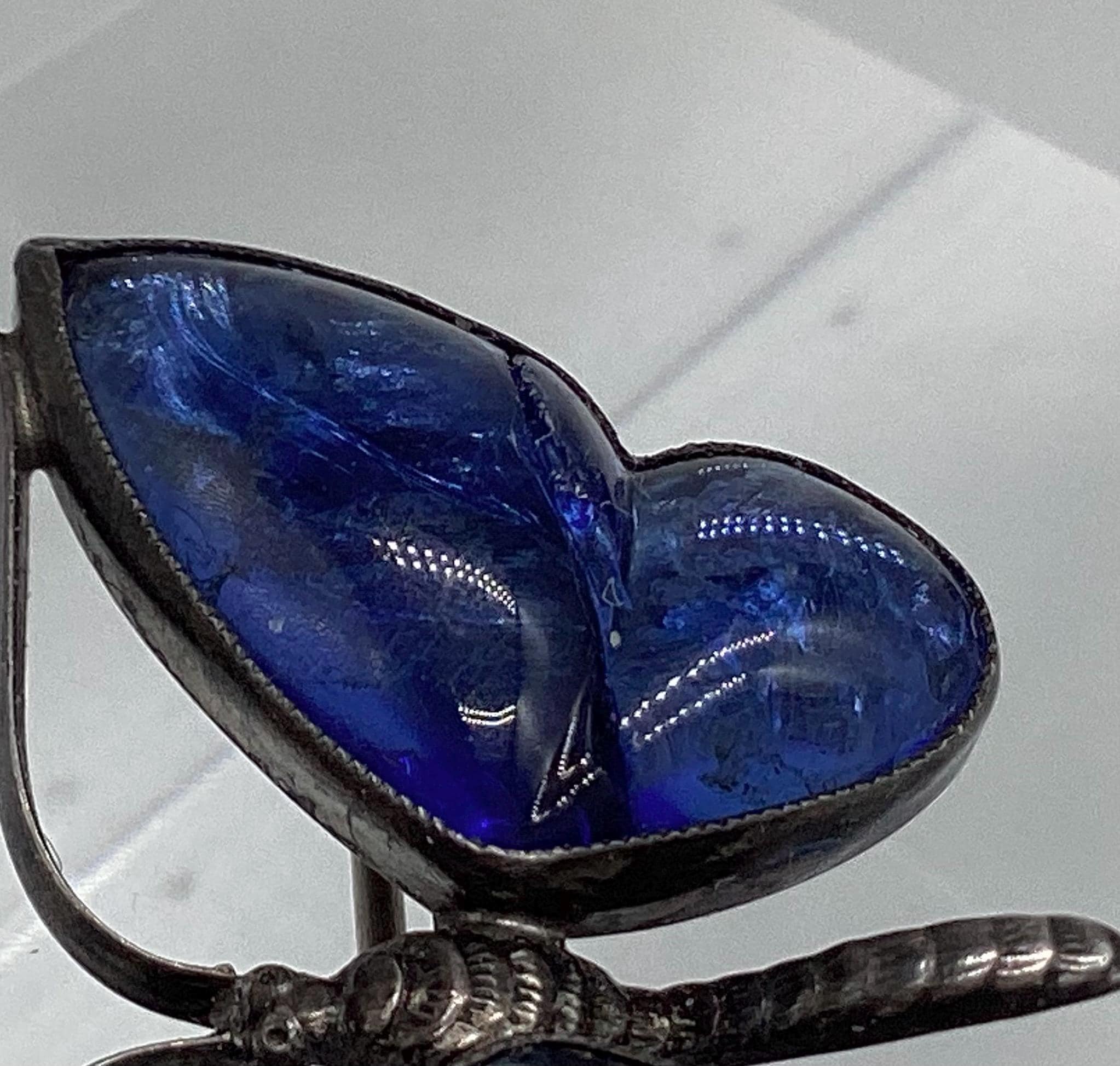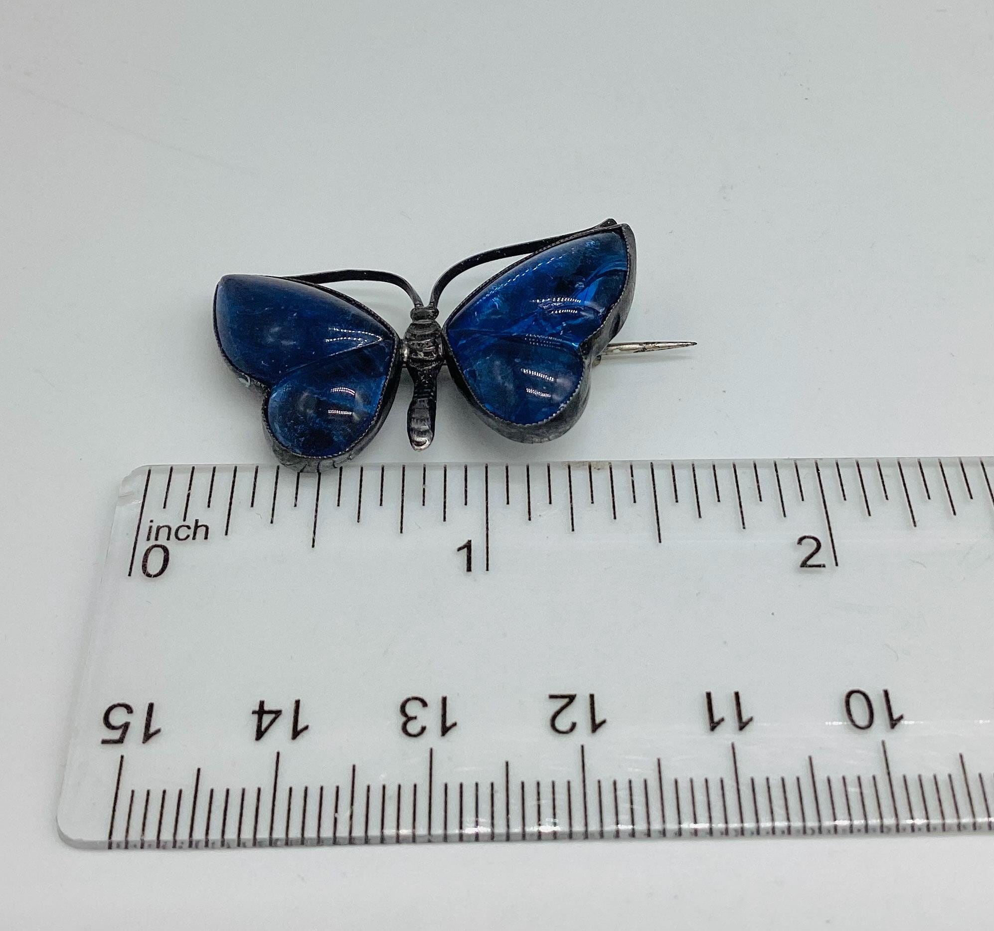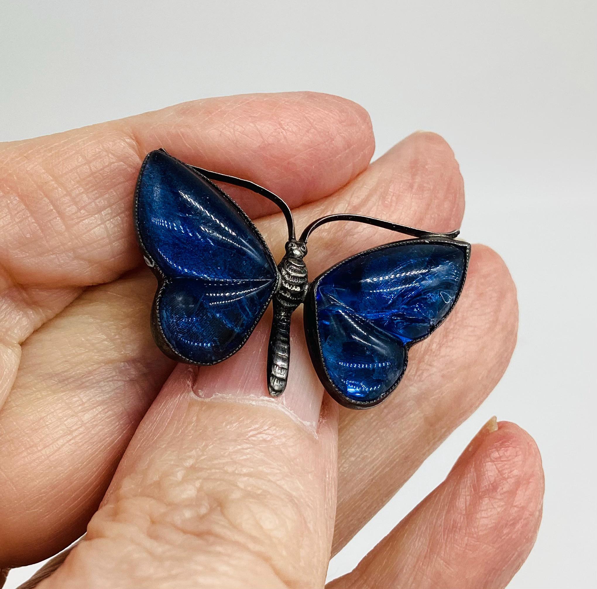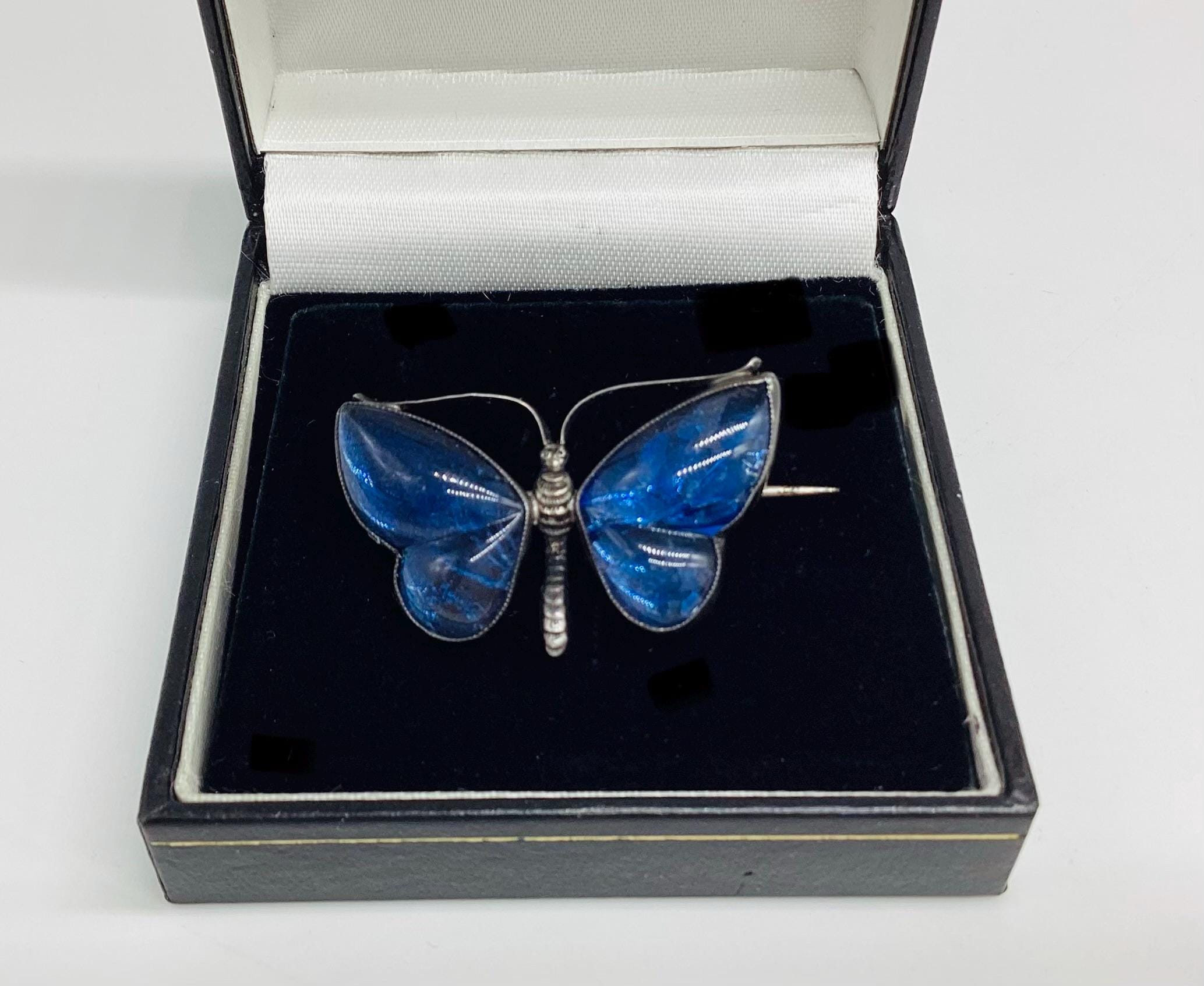 A delightful dainty deep blue butterfly. The real butterfly wings are set under crystal which gives them a real depth of colour and sparkle. There is a crack across the right hand wing/crystal. Does not spoil the brooch when it's worn and is reflected in the price