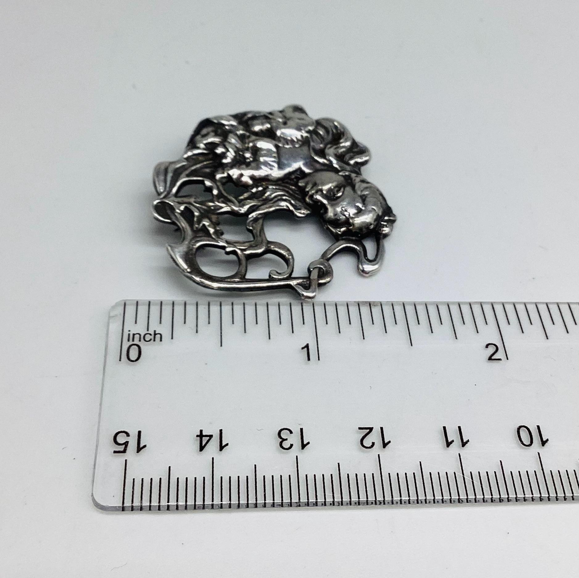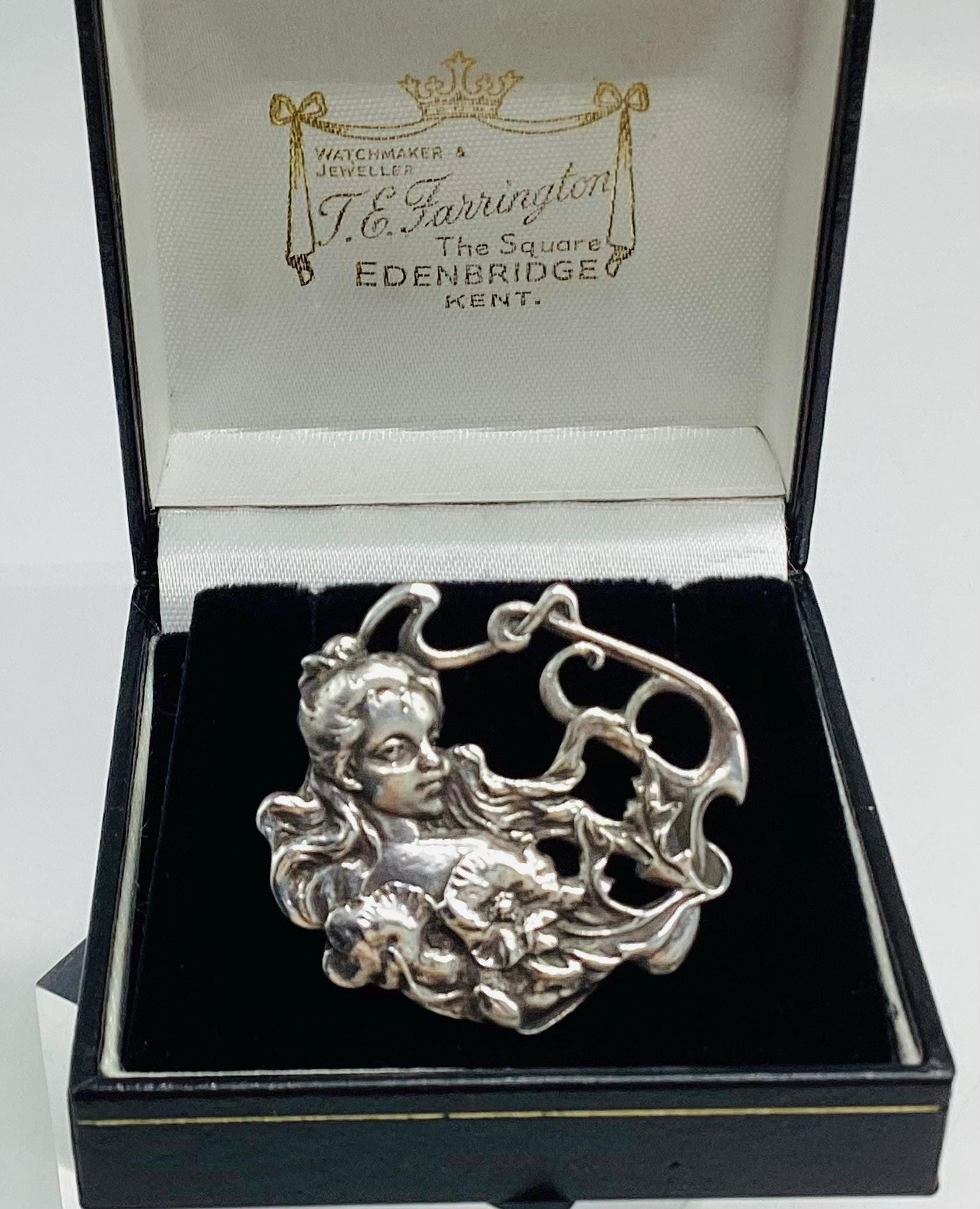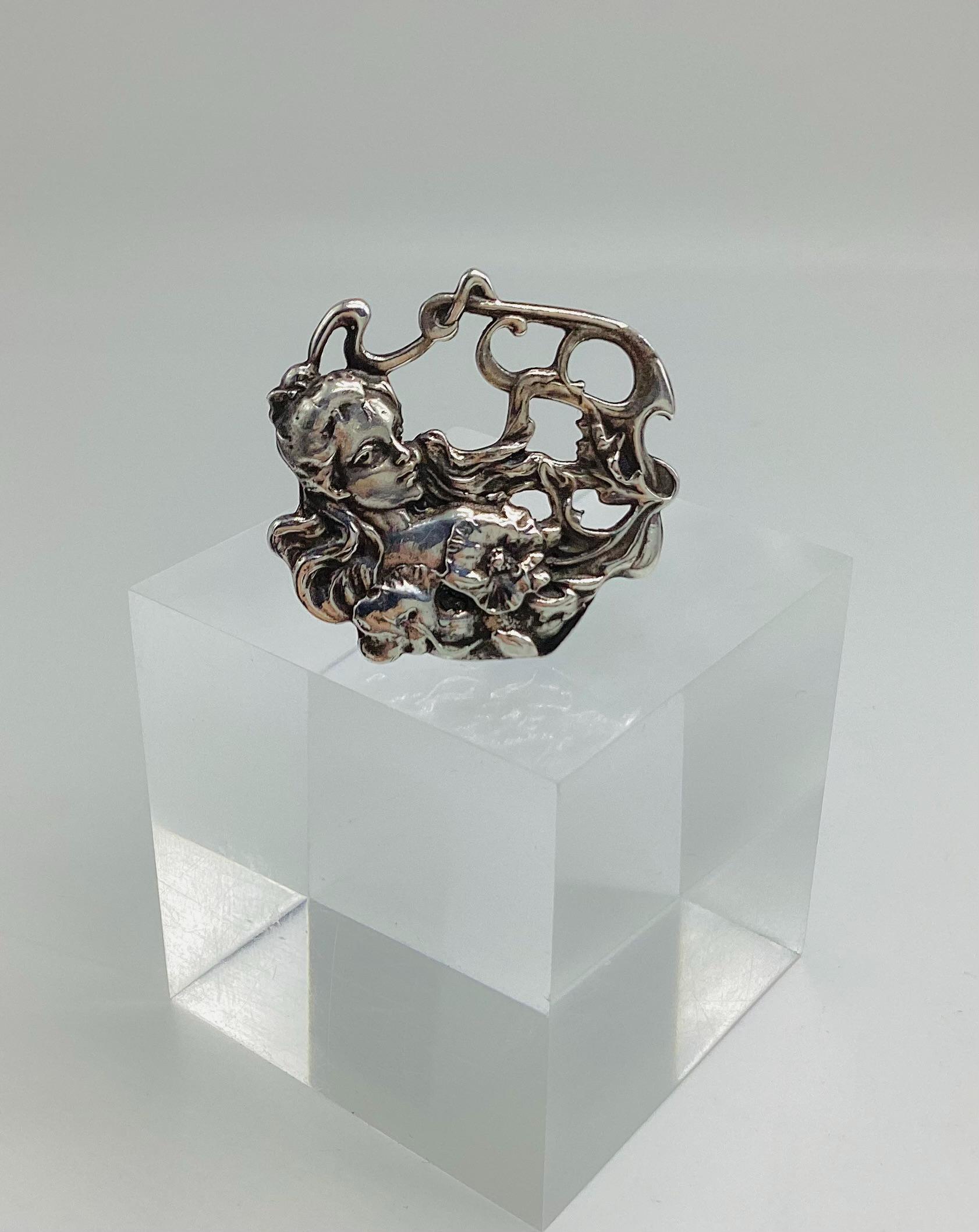 Stunning and quality solid silver hallmarked brooch. Classic Art Nouveau revival. A beautiful lady with garlands of flowers and leaves.