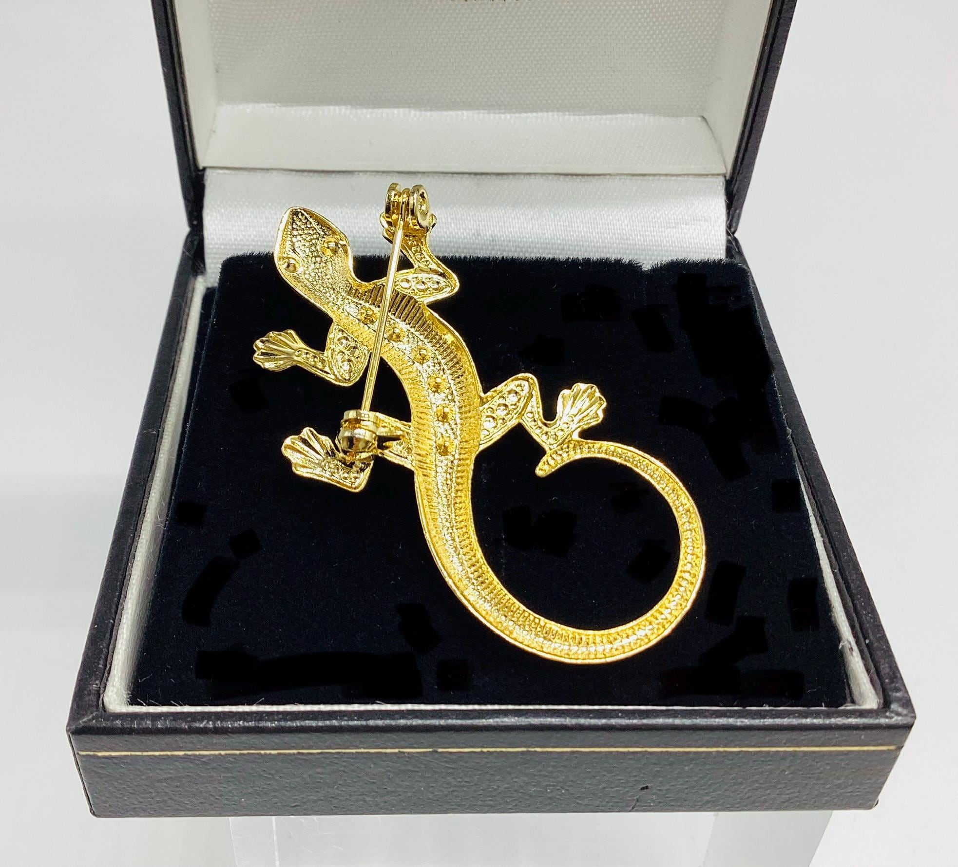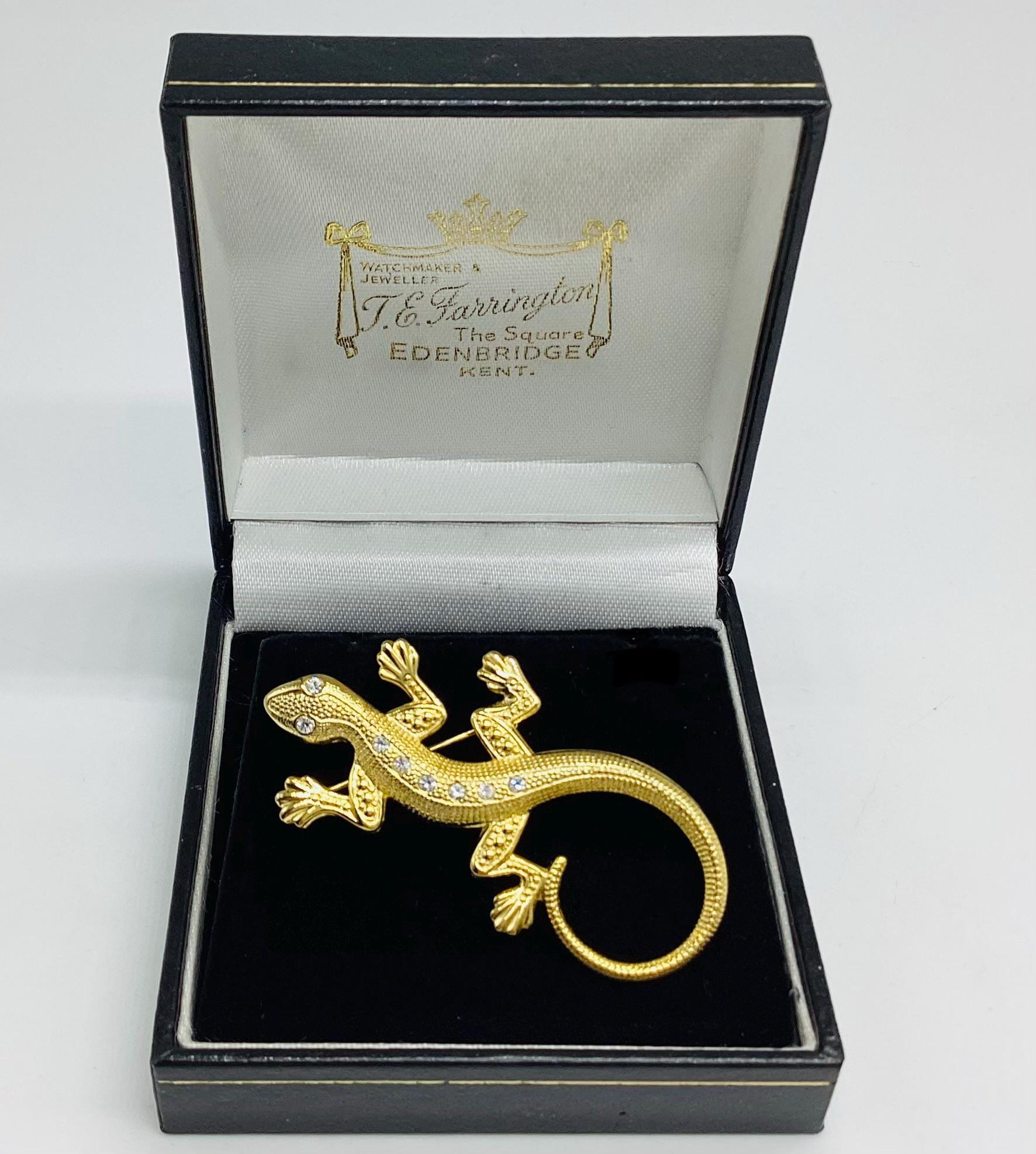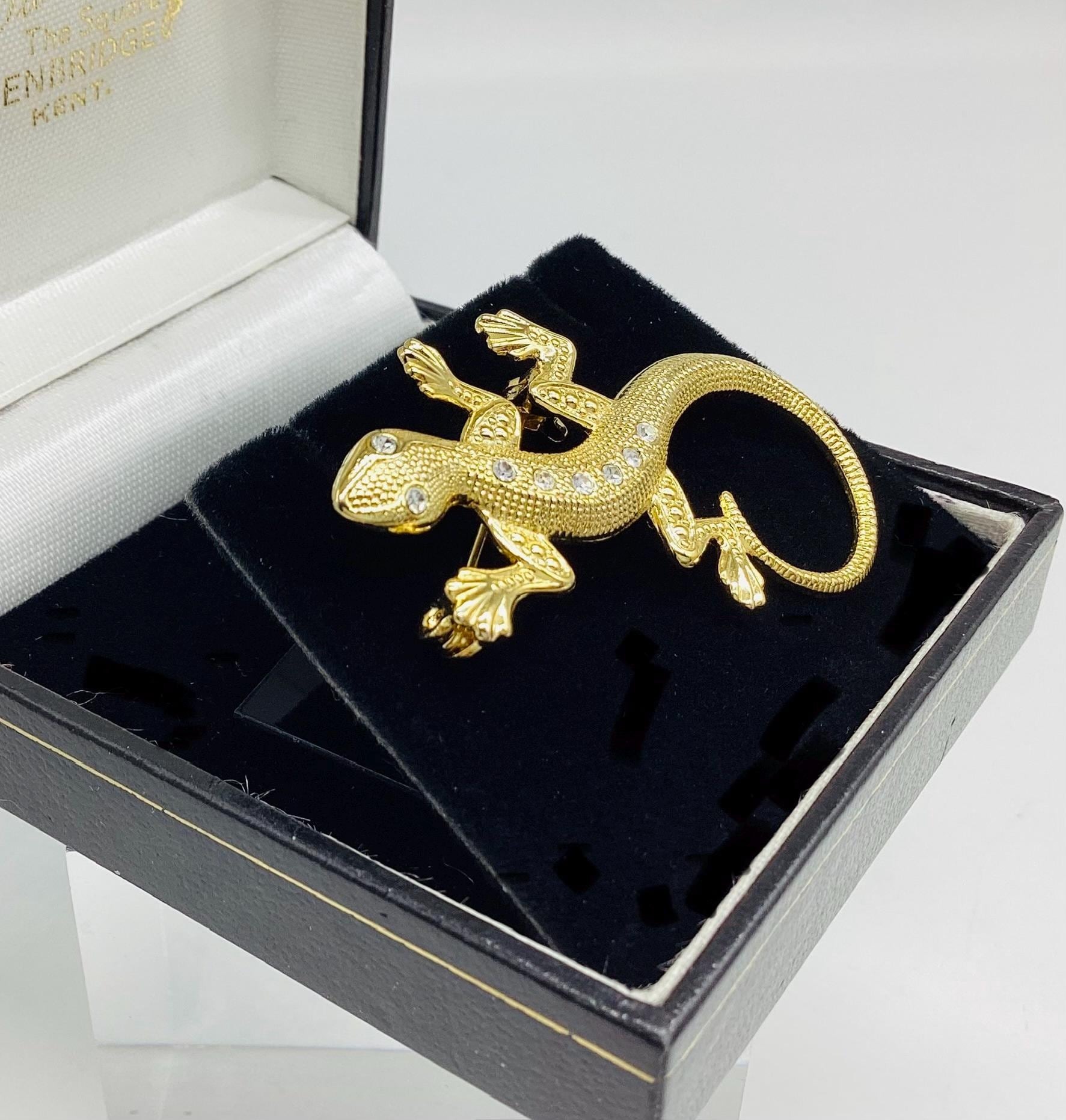 A delightful salamander/lizard in super shiny gold tone metal with rhinestone eyes and decorating his body.