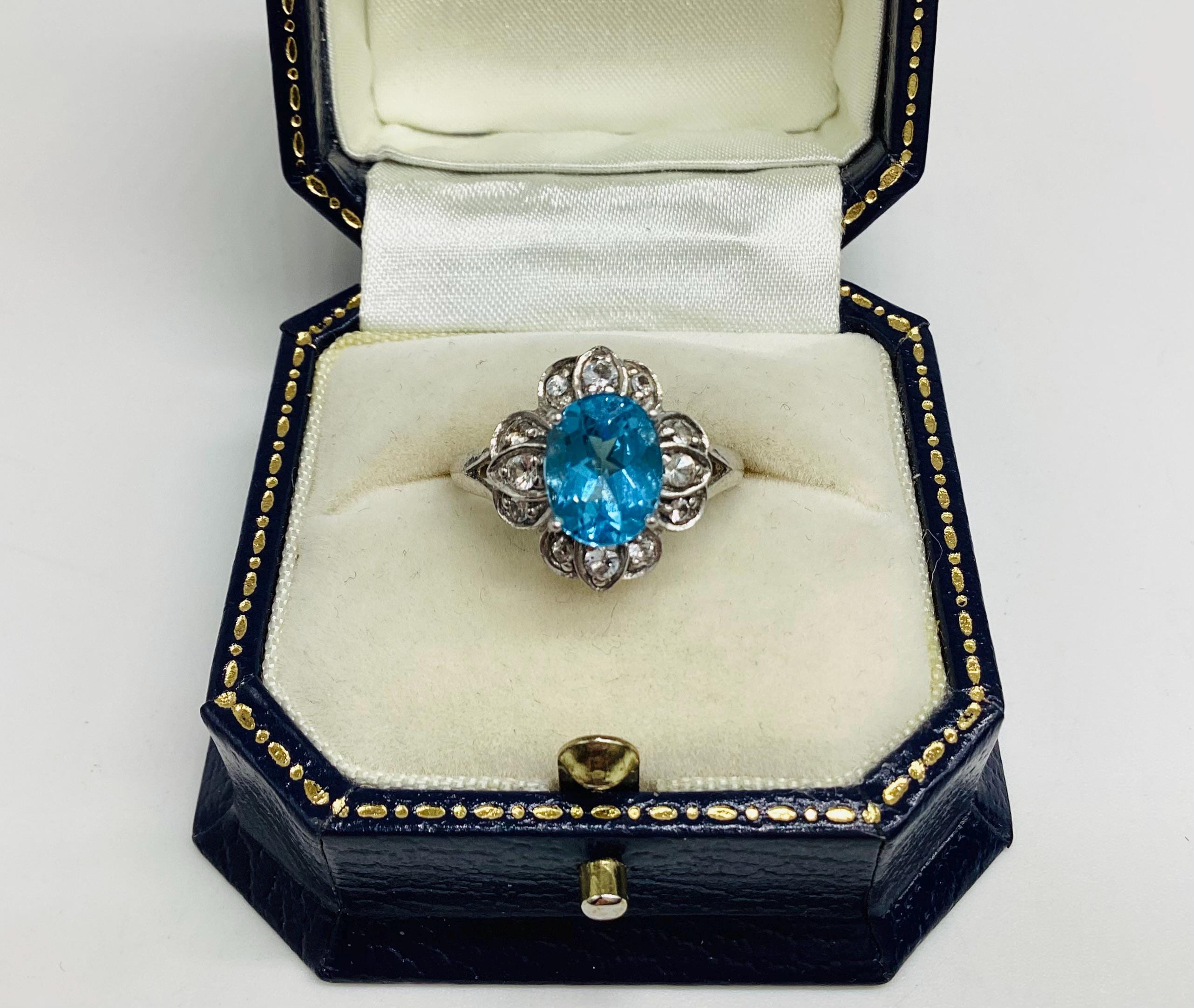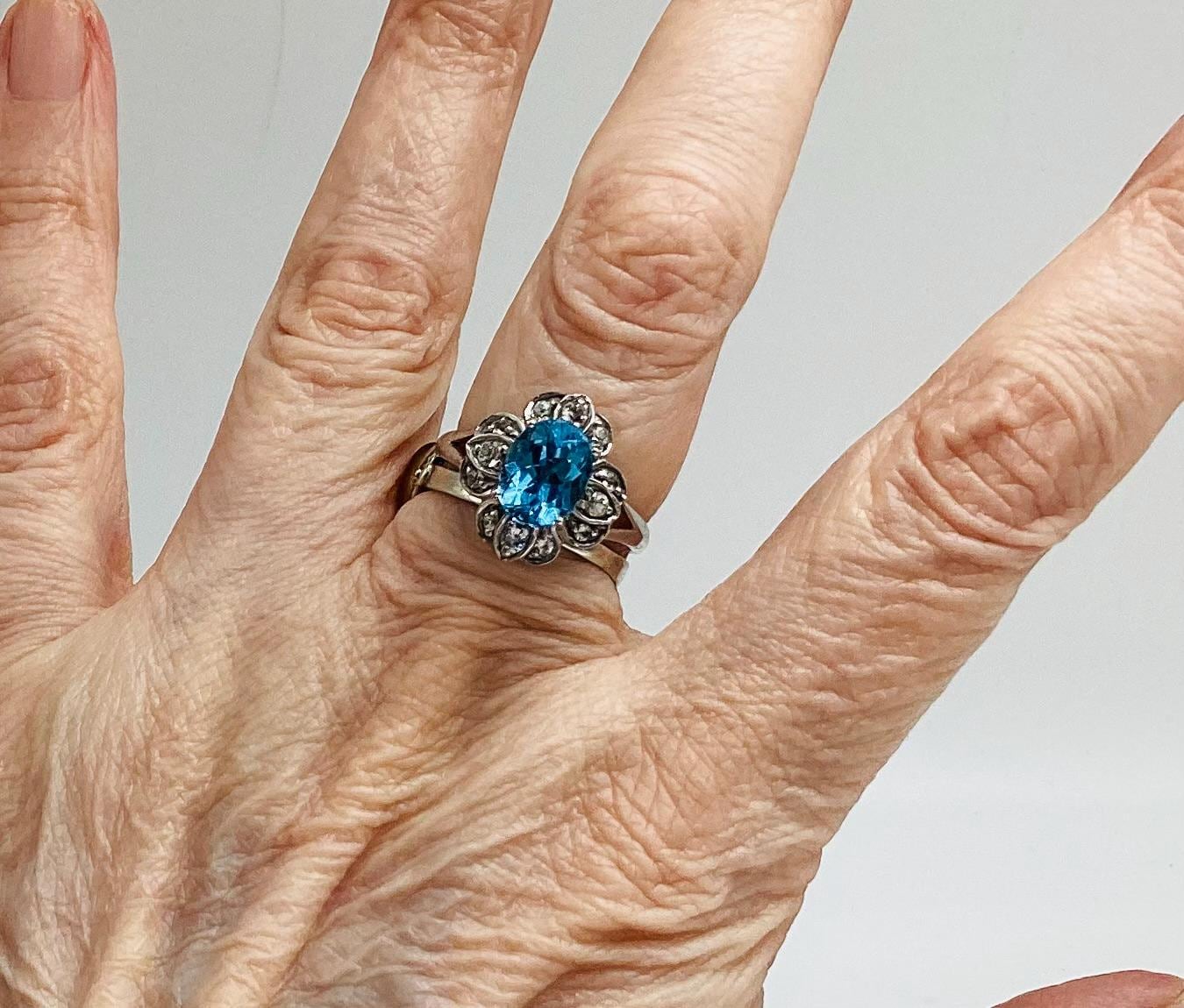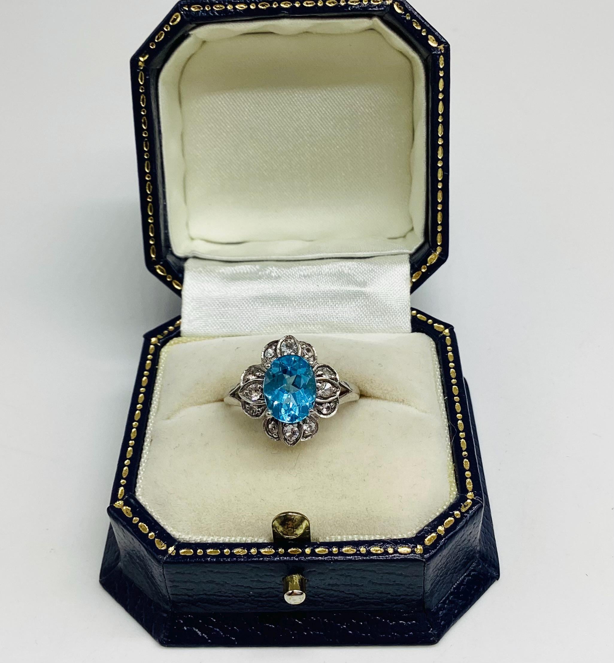 A very pretty brilliant cut blue topaz with faceted quartz crystals in a daisy setting.